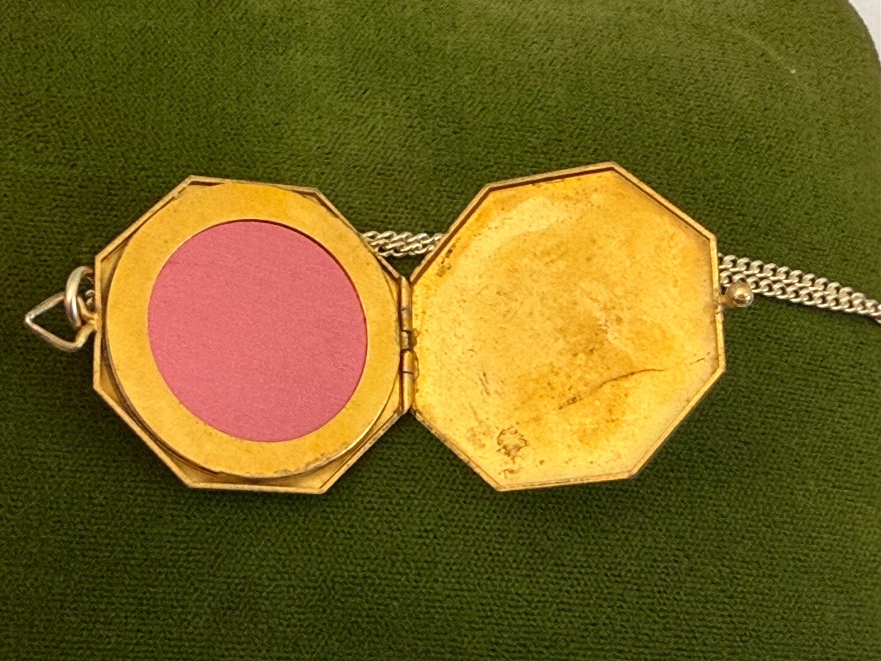 The locket necklace is in nice vintage condition with patina and wear / scratching commensurate with antique age (circa 1920s). See photos for details. Chain is new and in good condition.