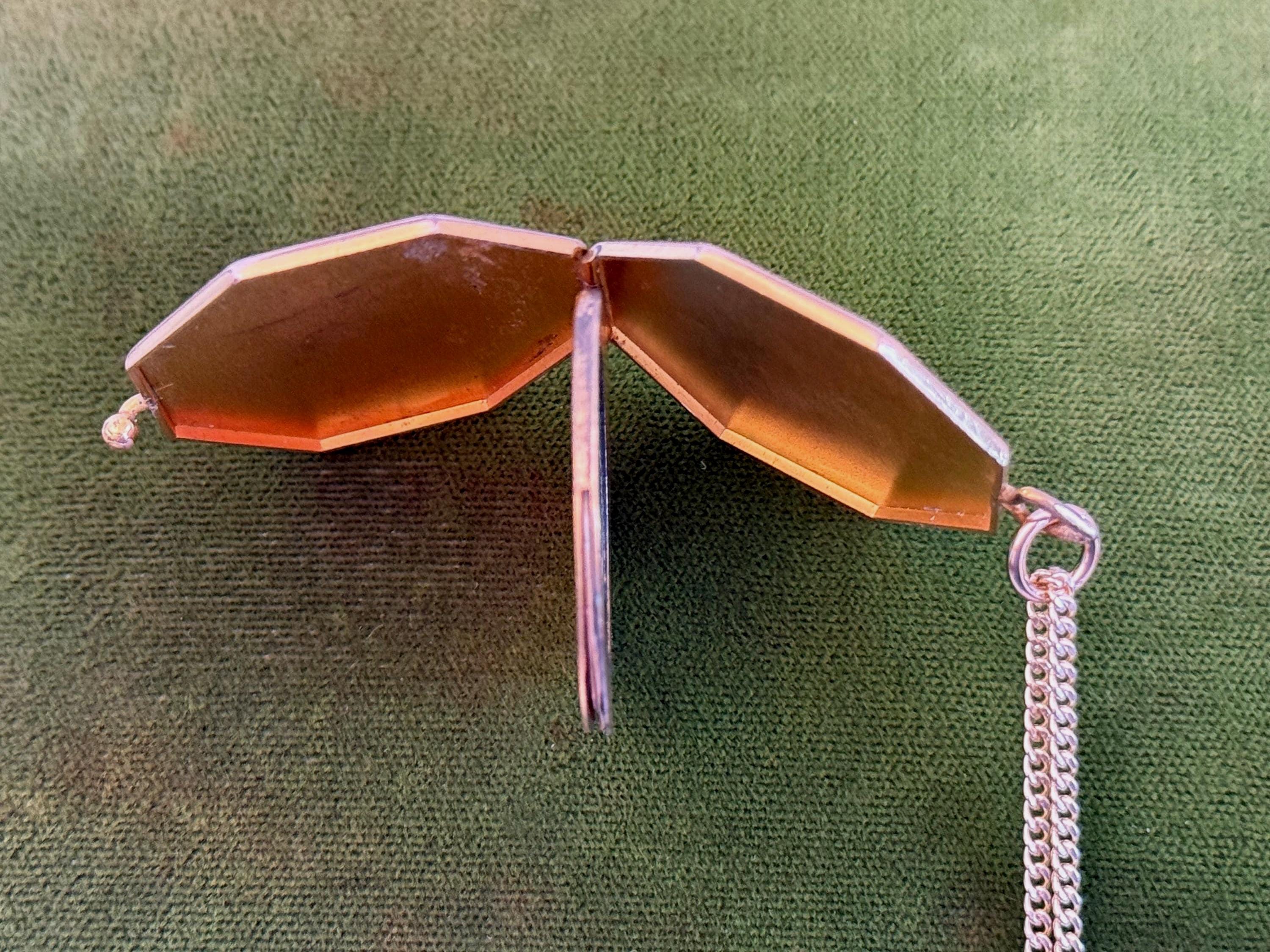 The locket has room for 4 photos using the front, back and the round center frames on a hinge. The antique 8-sided locket opens and closes using a tiny rounded end fold over clasp with an open triangular bale - it reminds one of a purse closure. It closes securely.