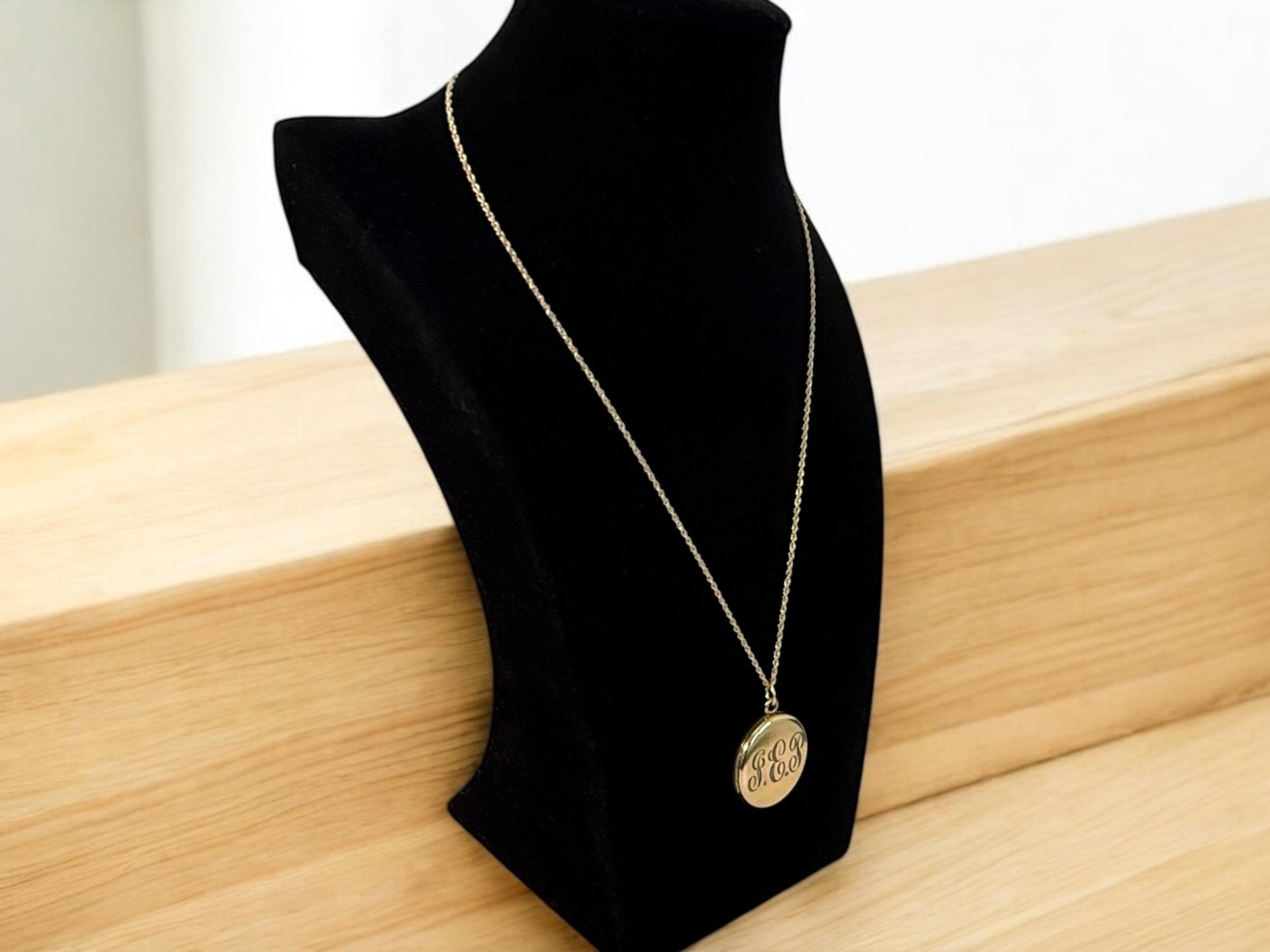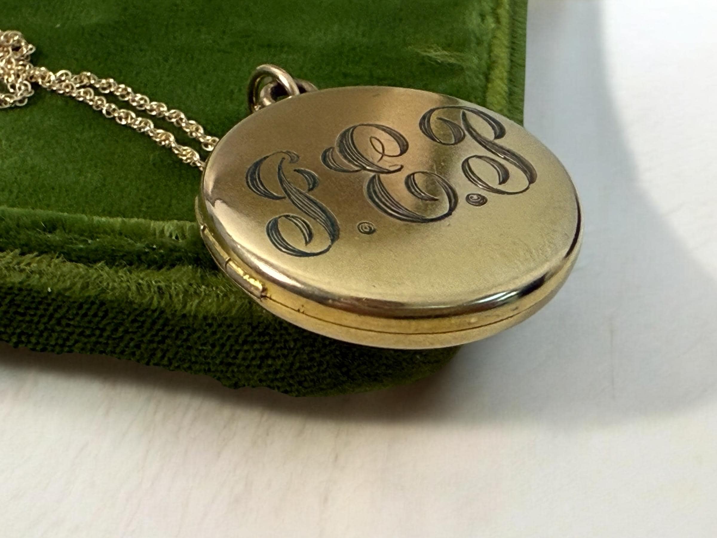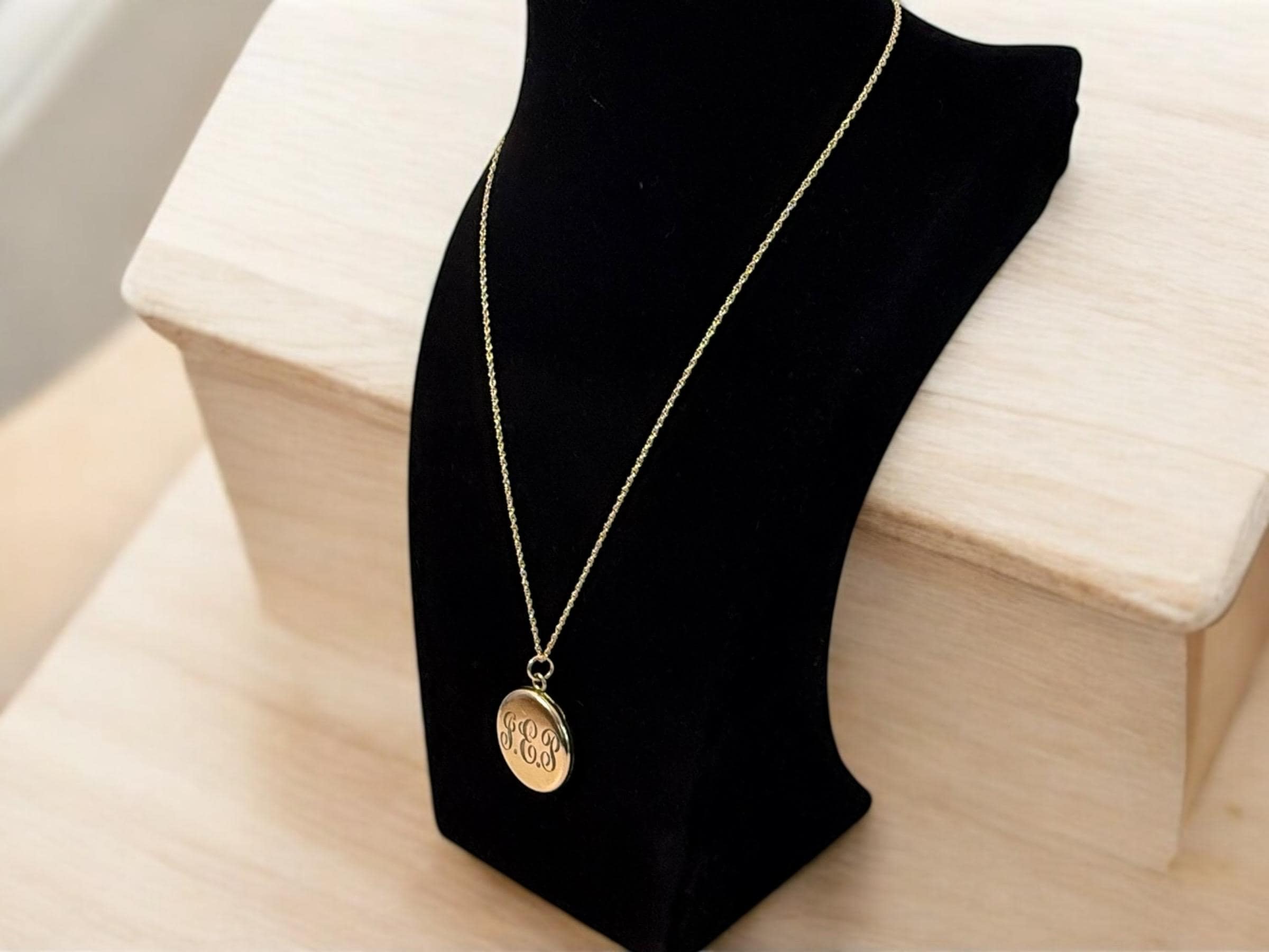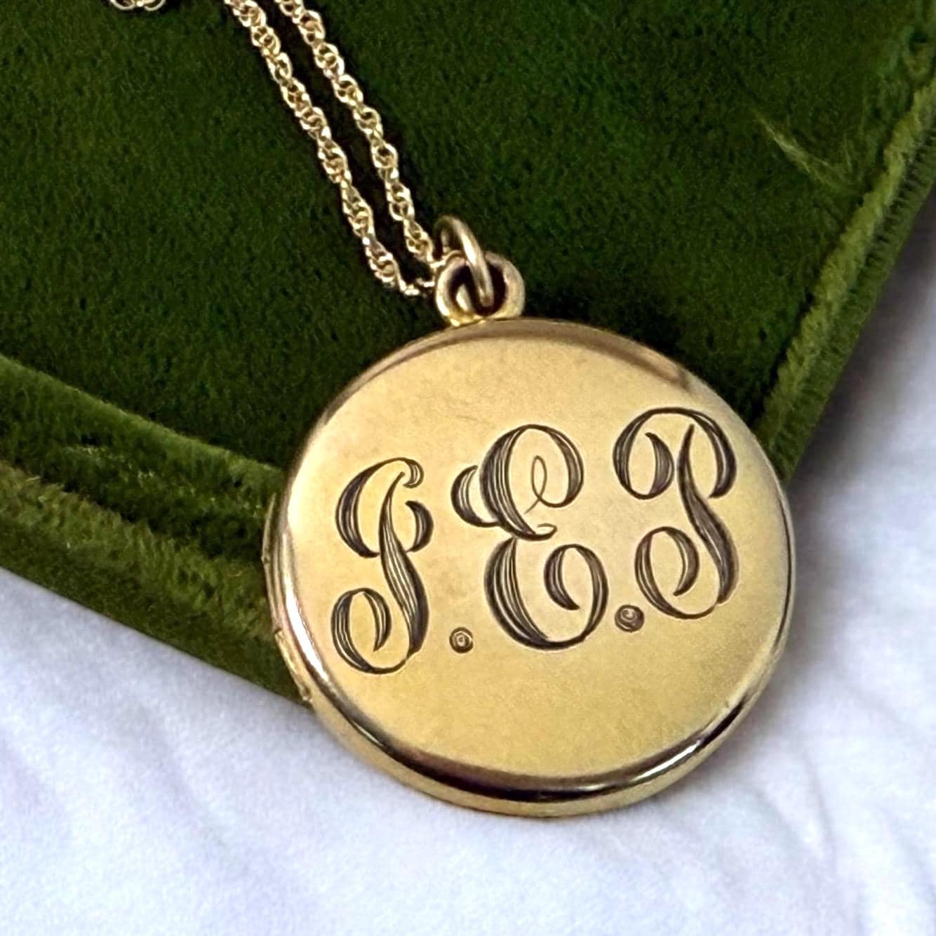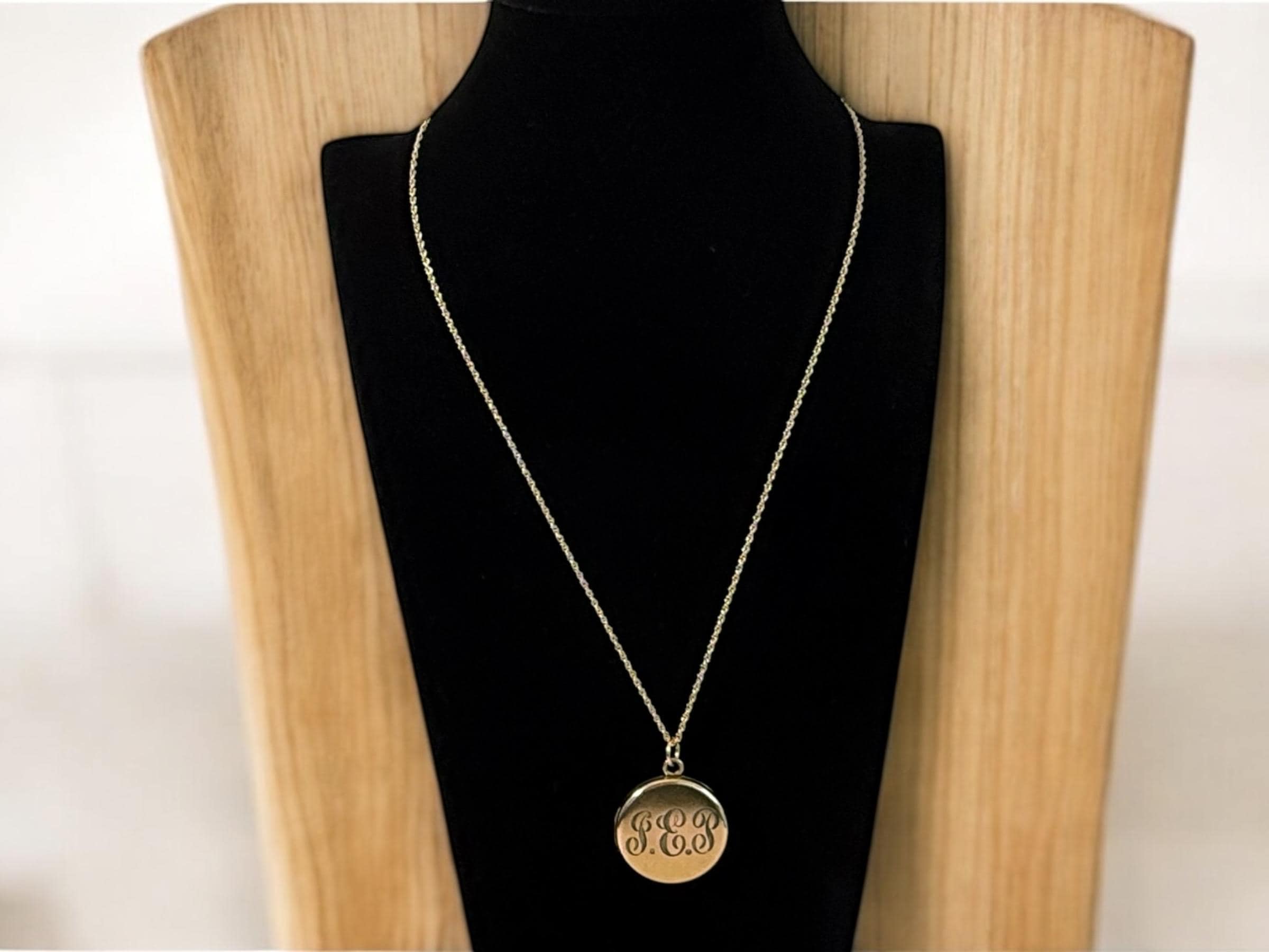 Beautiful shiny gold filled round antique locket on a new 14K gold filled rope chain. This locket was made by the Foster & Bailey company circa the early 1900s. The front features the cursive monogrammed letters "GEP". The back is plain with a shiny finish with no design.