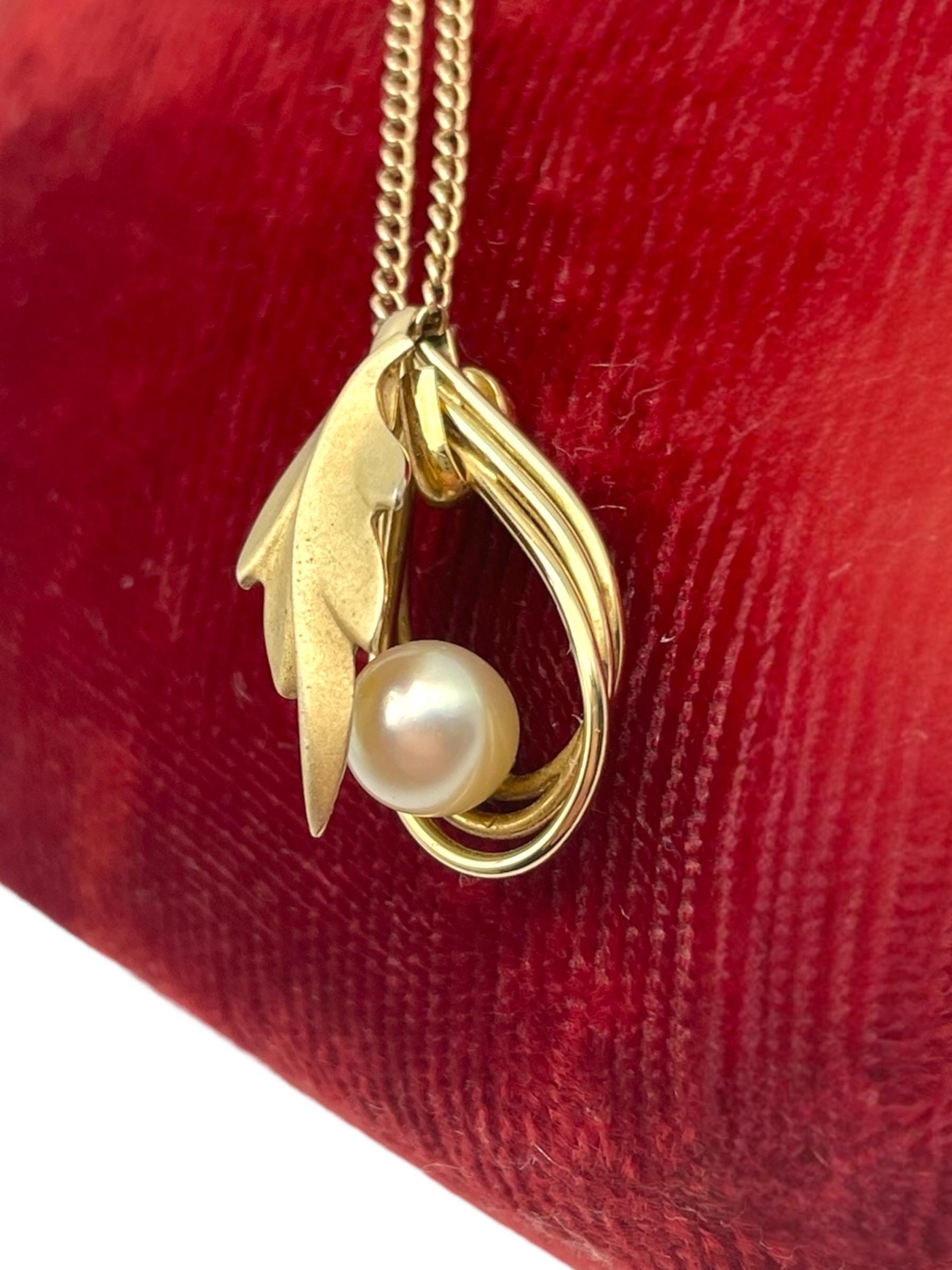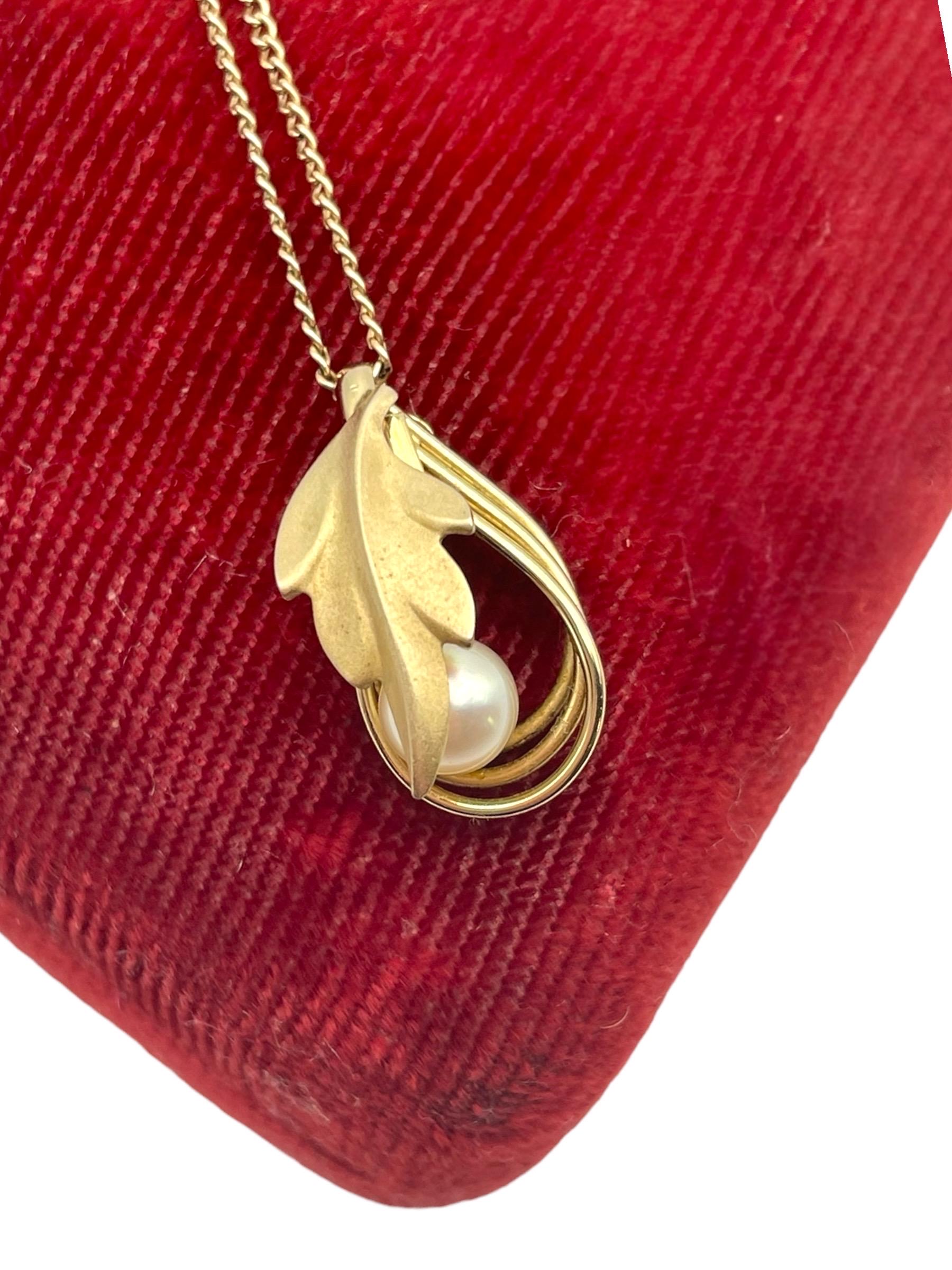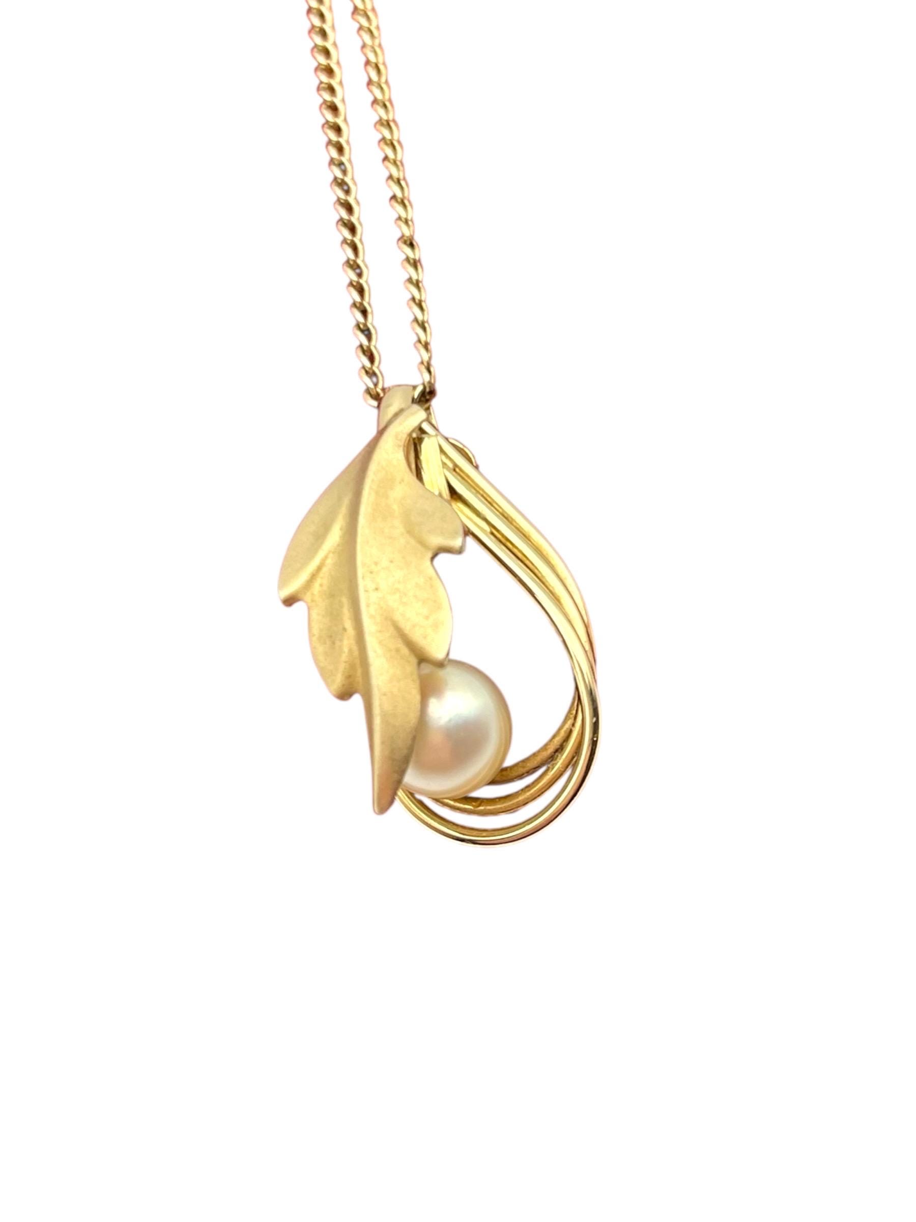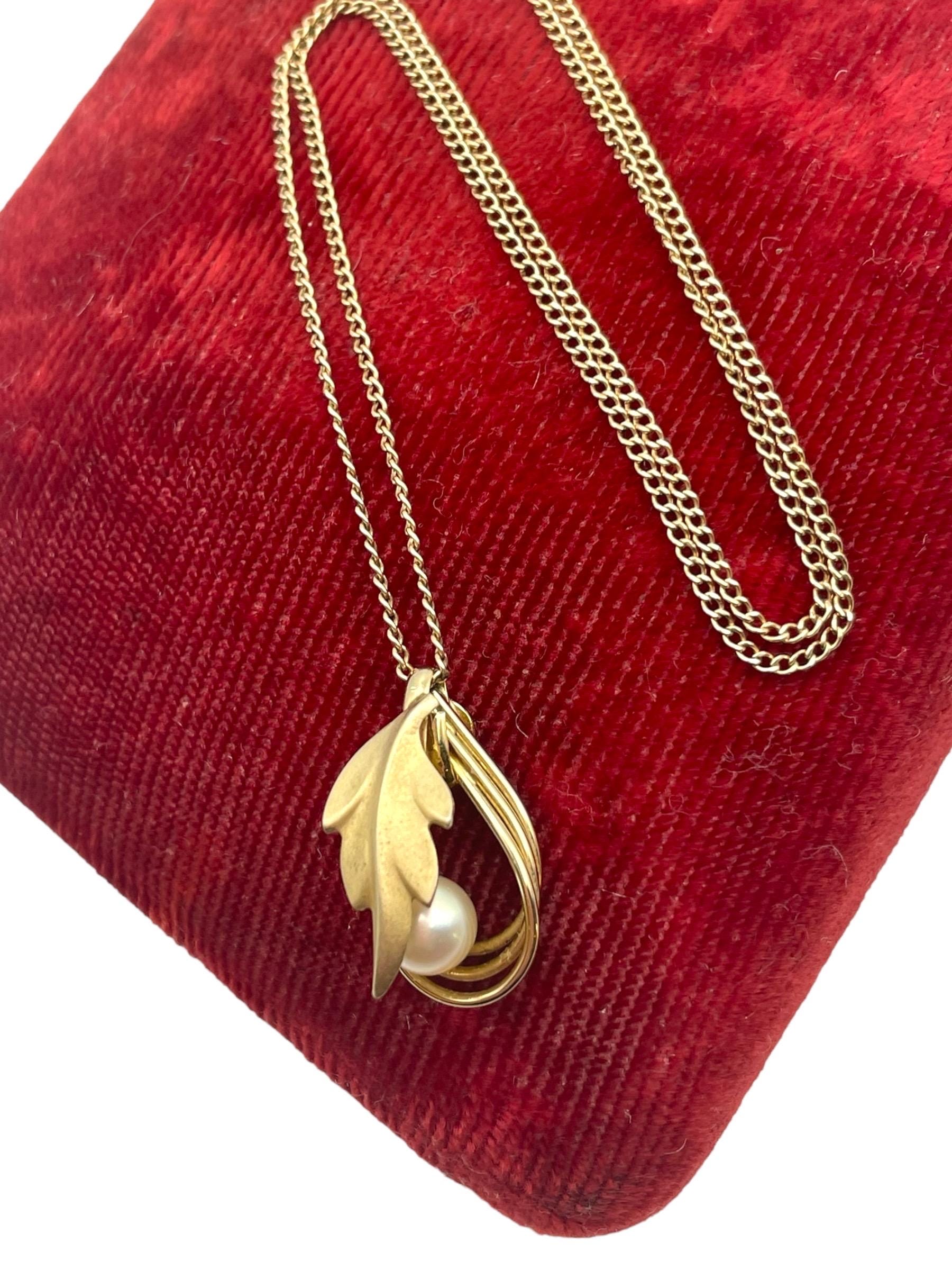 A beautiful and unique pearl and gold filled leaf necklace. This pendant necklace is on an 18'' chain that is 12K gold filled. It has a fold-over filigree clasp which was typical of vintage chains.