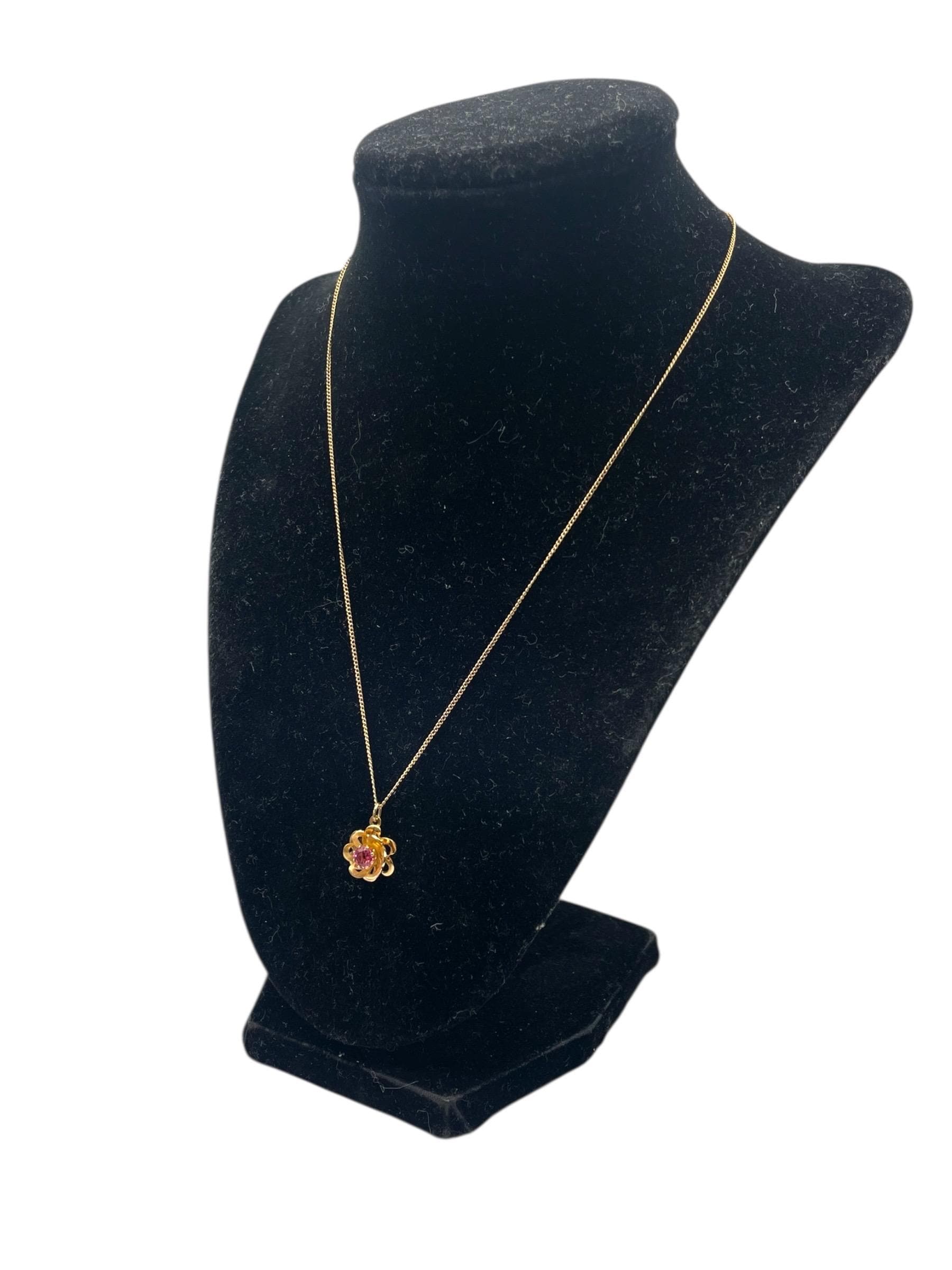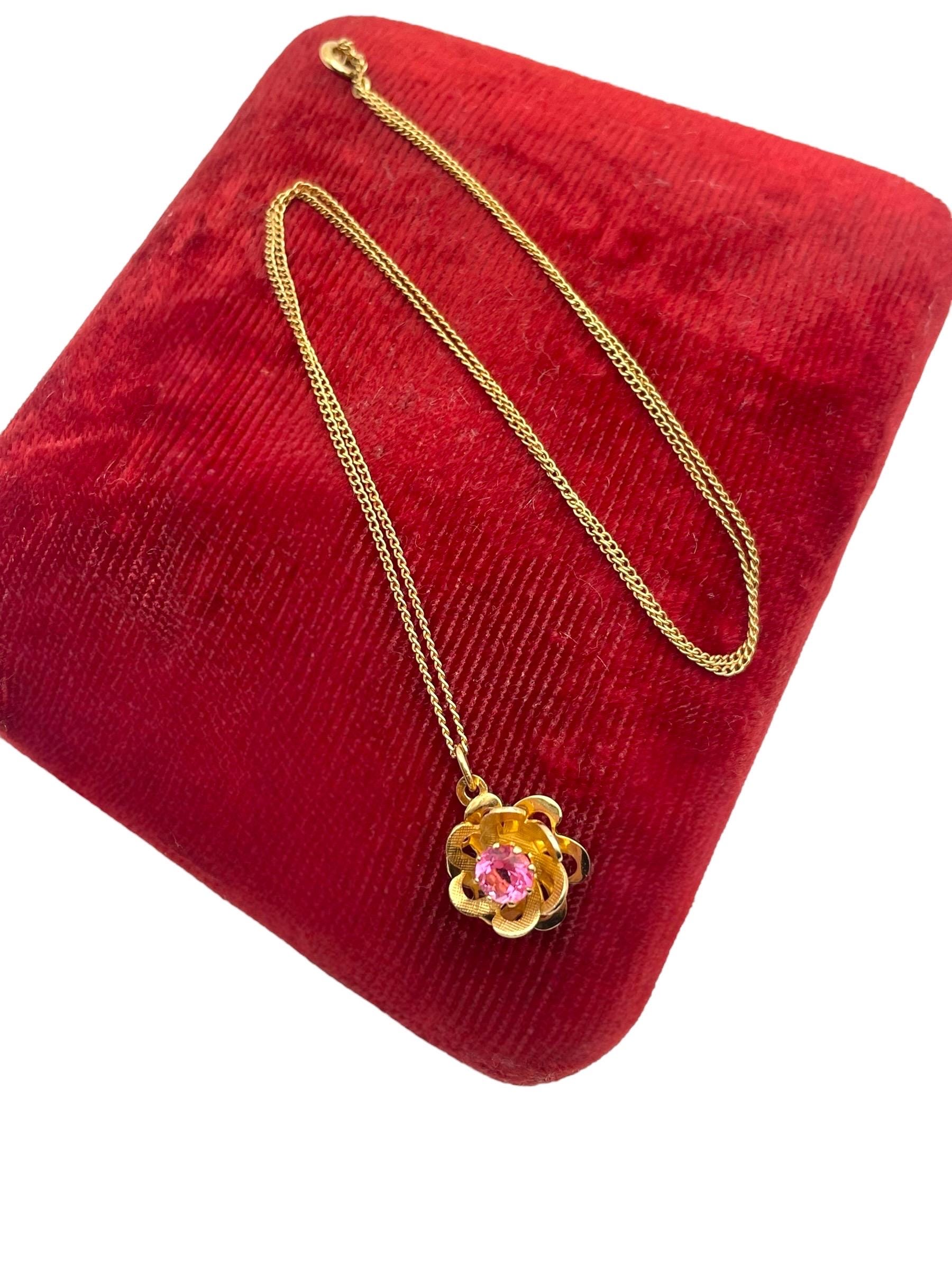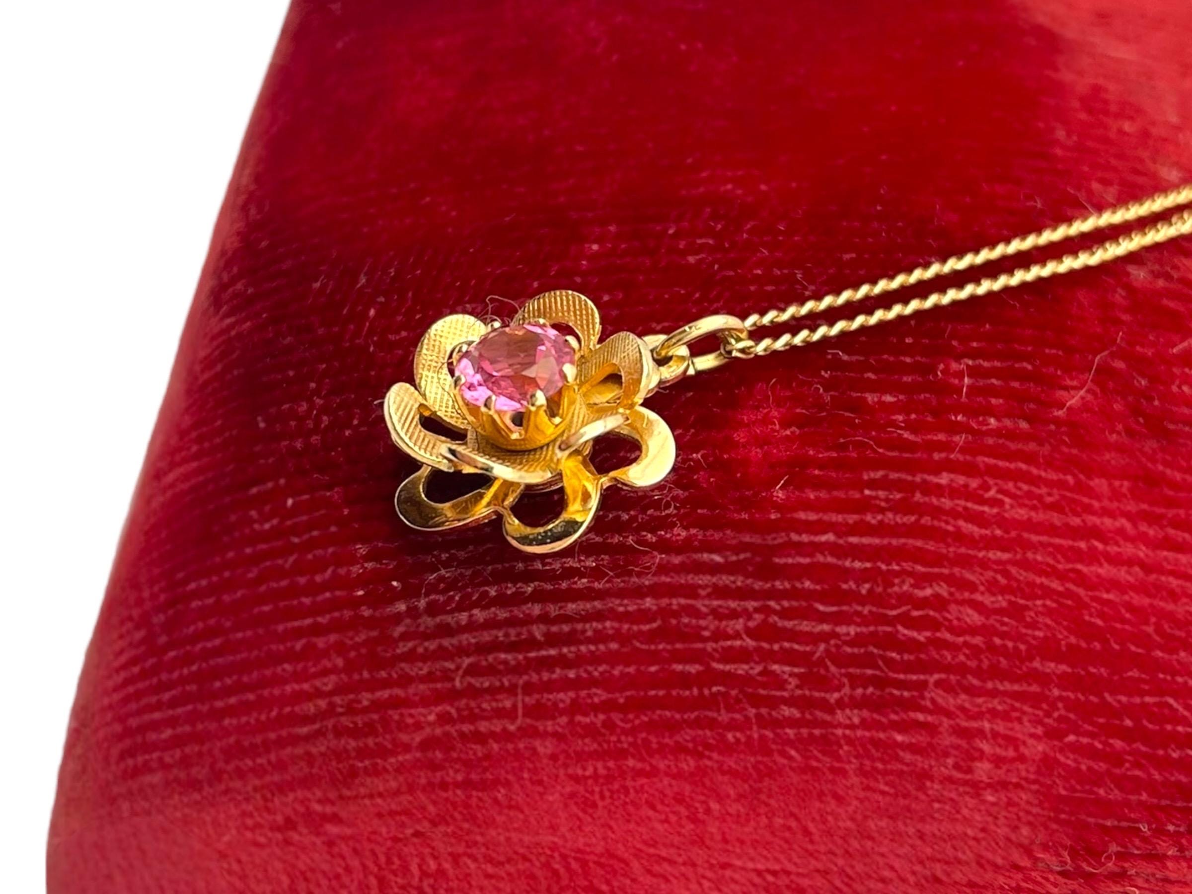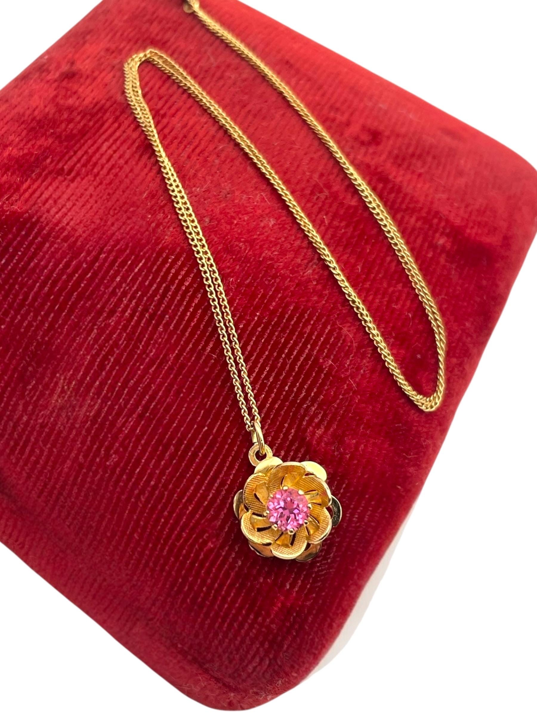 A sweet little 14K gold filled flower pendant with a pink rhinestone center. The pendant is shown on an 18'' vintage 12K gold filled chain by Speidel. Can be purchased with or without the chain.