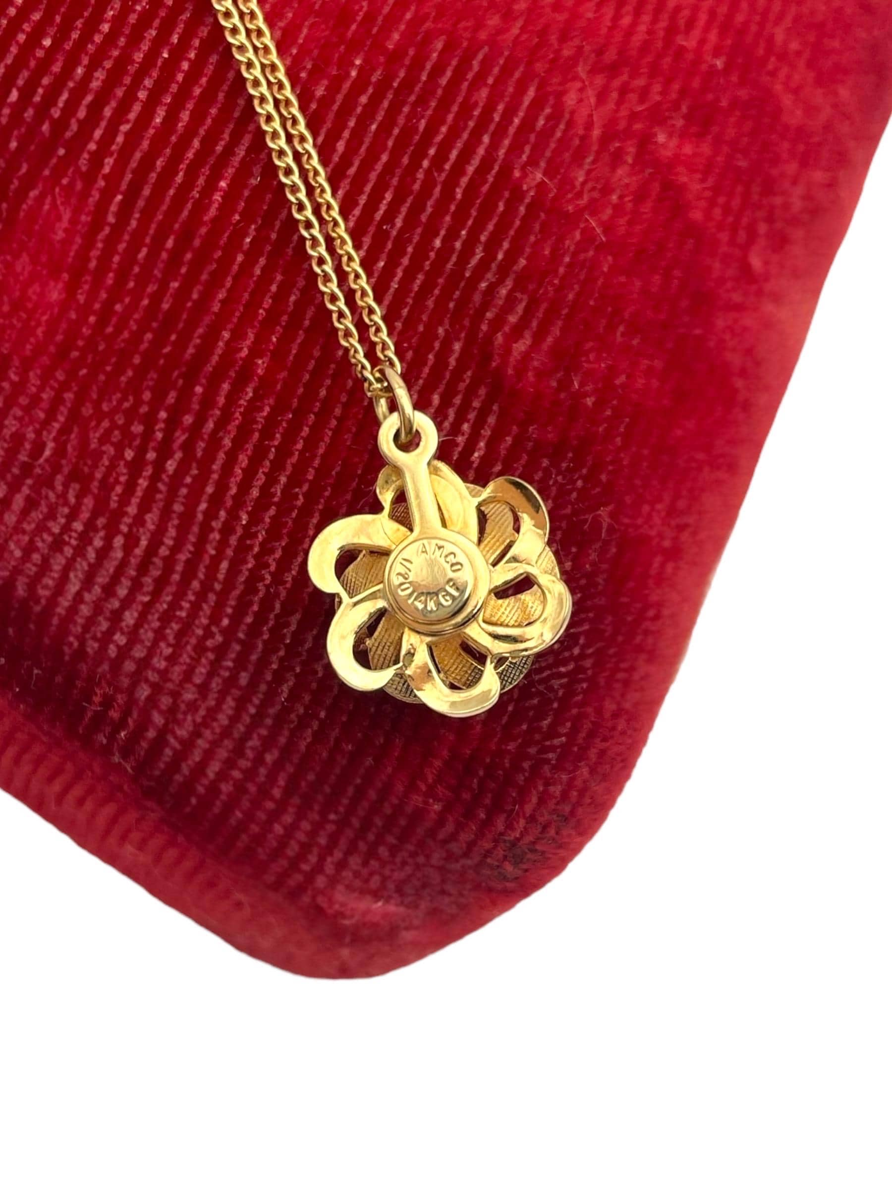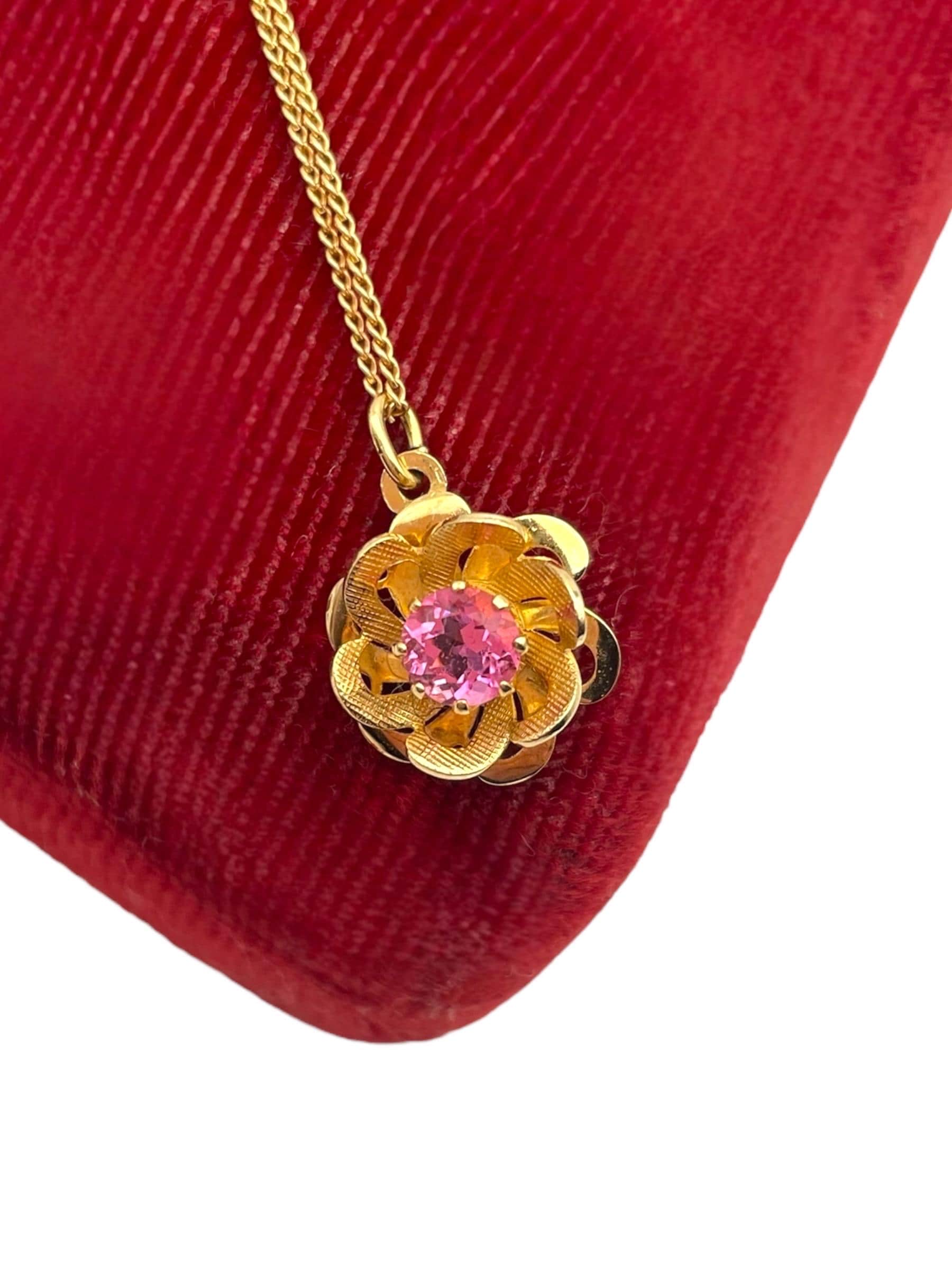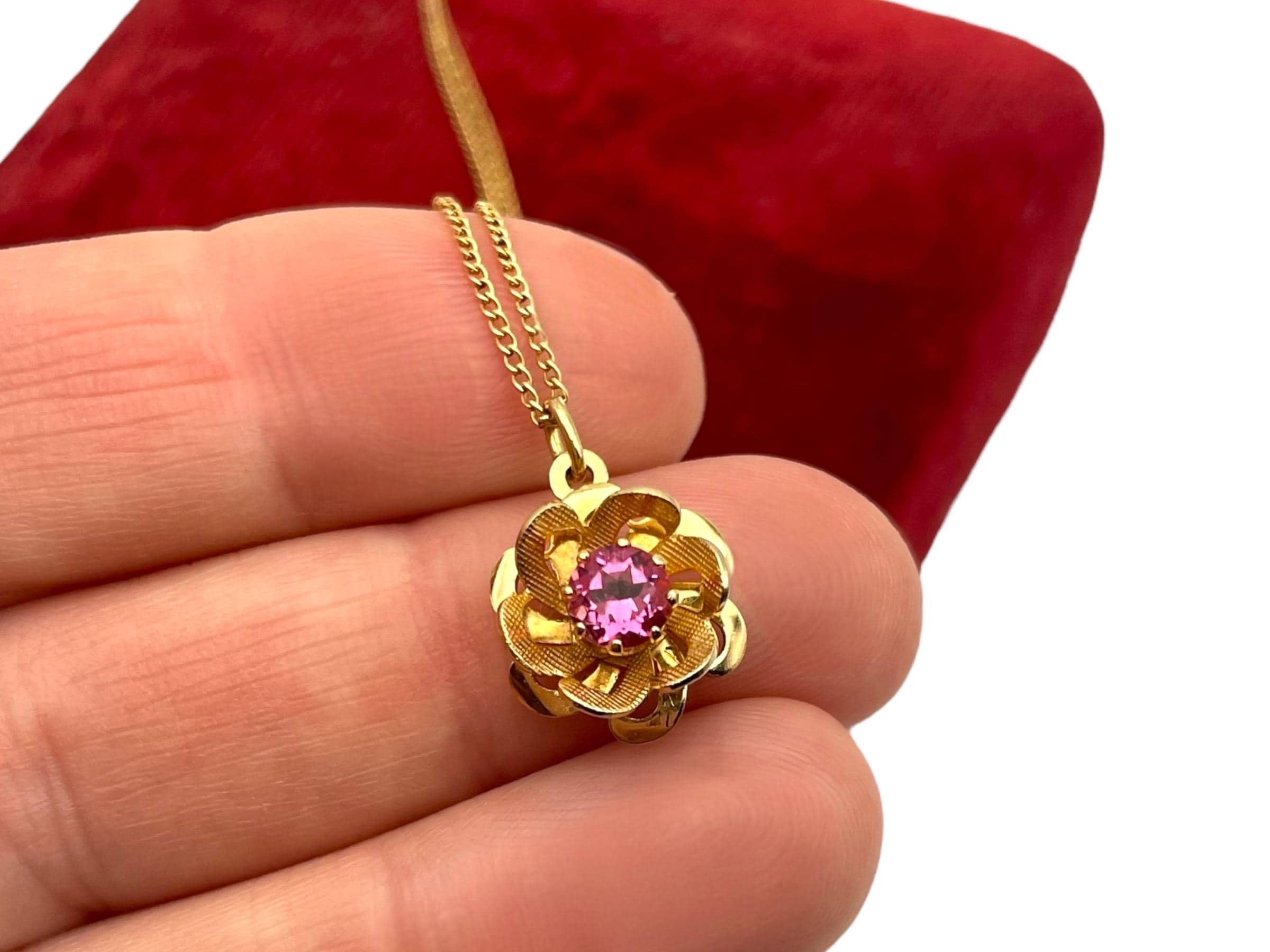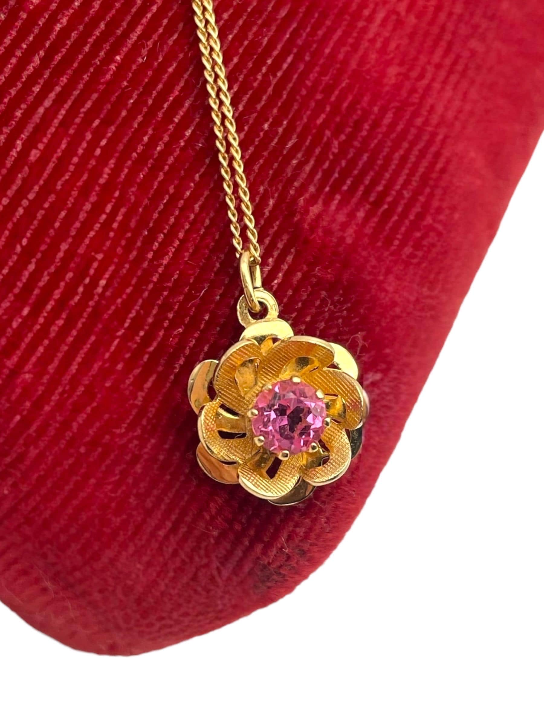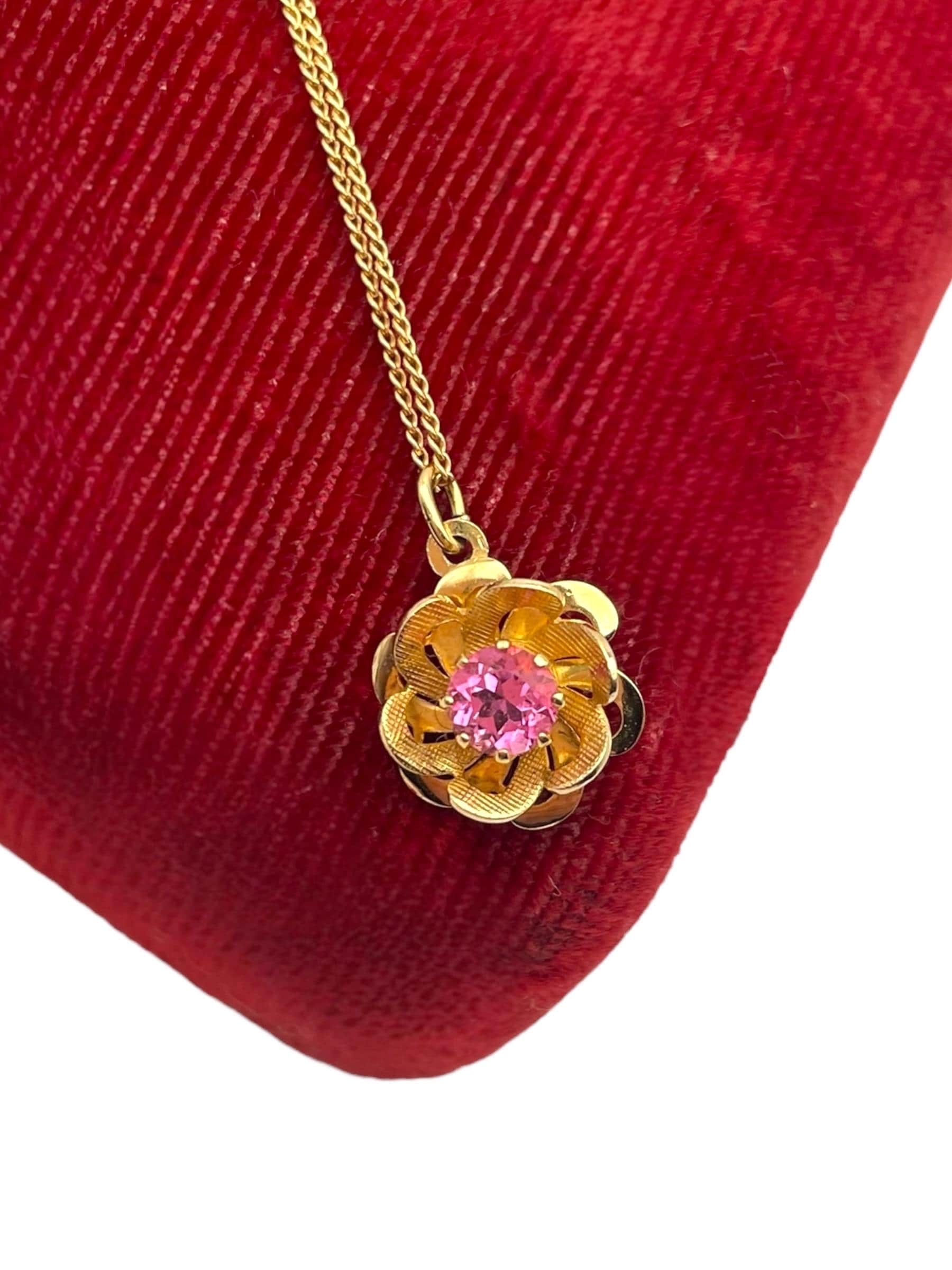 A sweet little 14K gold filled flower pendant with a pink rhinestone center. The pendant is shown on an 18'' vintage 12K gold filled chain by Speidel. Can be purchased with or without the chain.