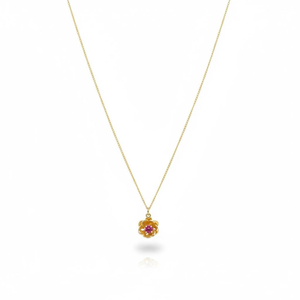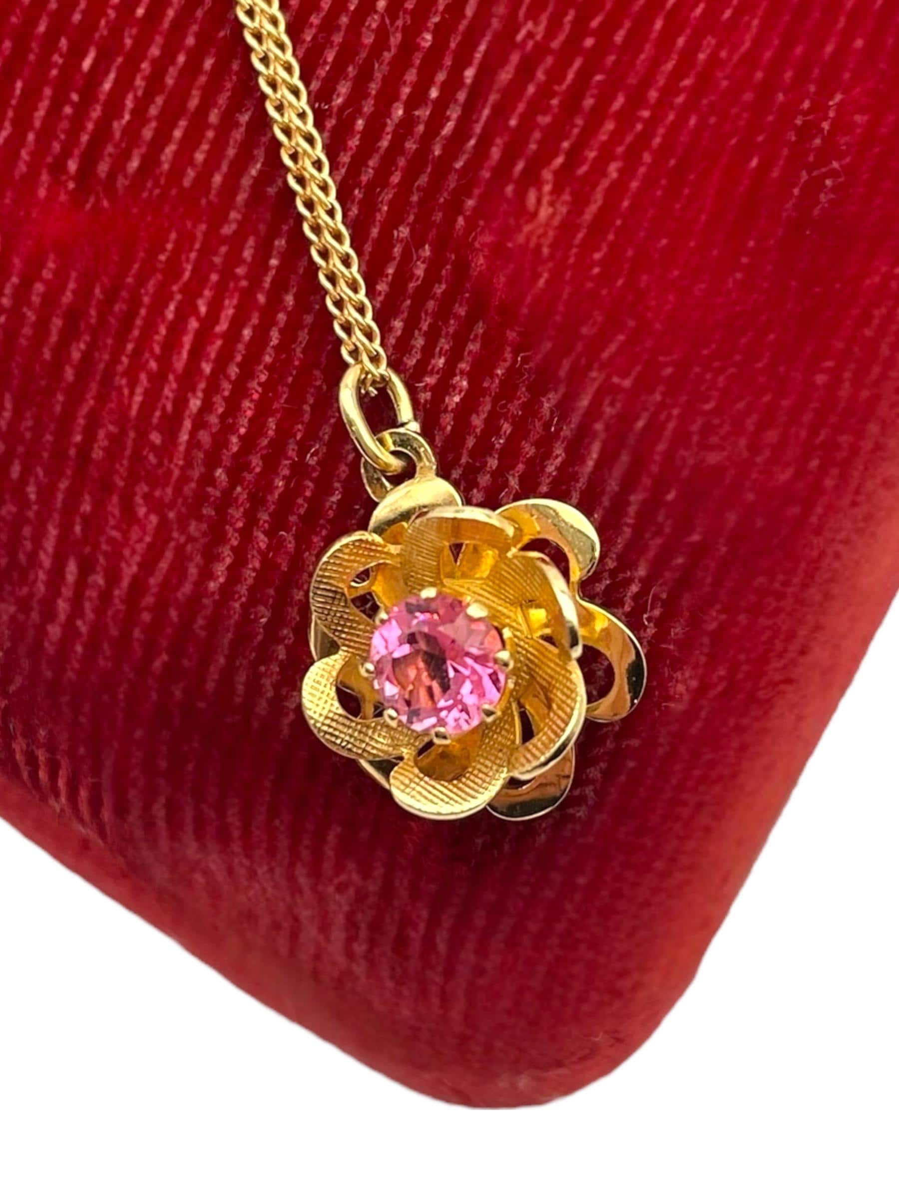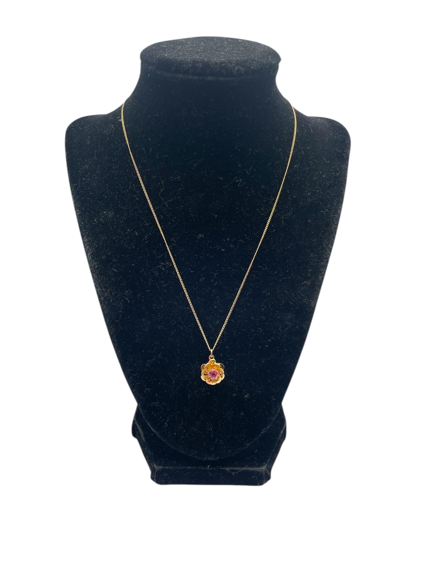Vintage Gold Rose Flower Necklace - 14K Gold Filled with Pink Rhinestone Center by AMCO on 12K GF Chain - Gift Her Retro Floral Pendant