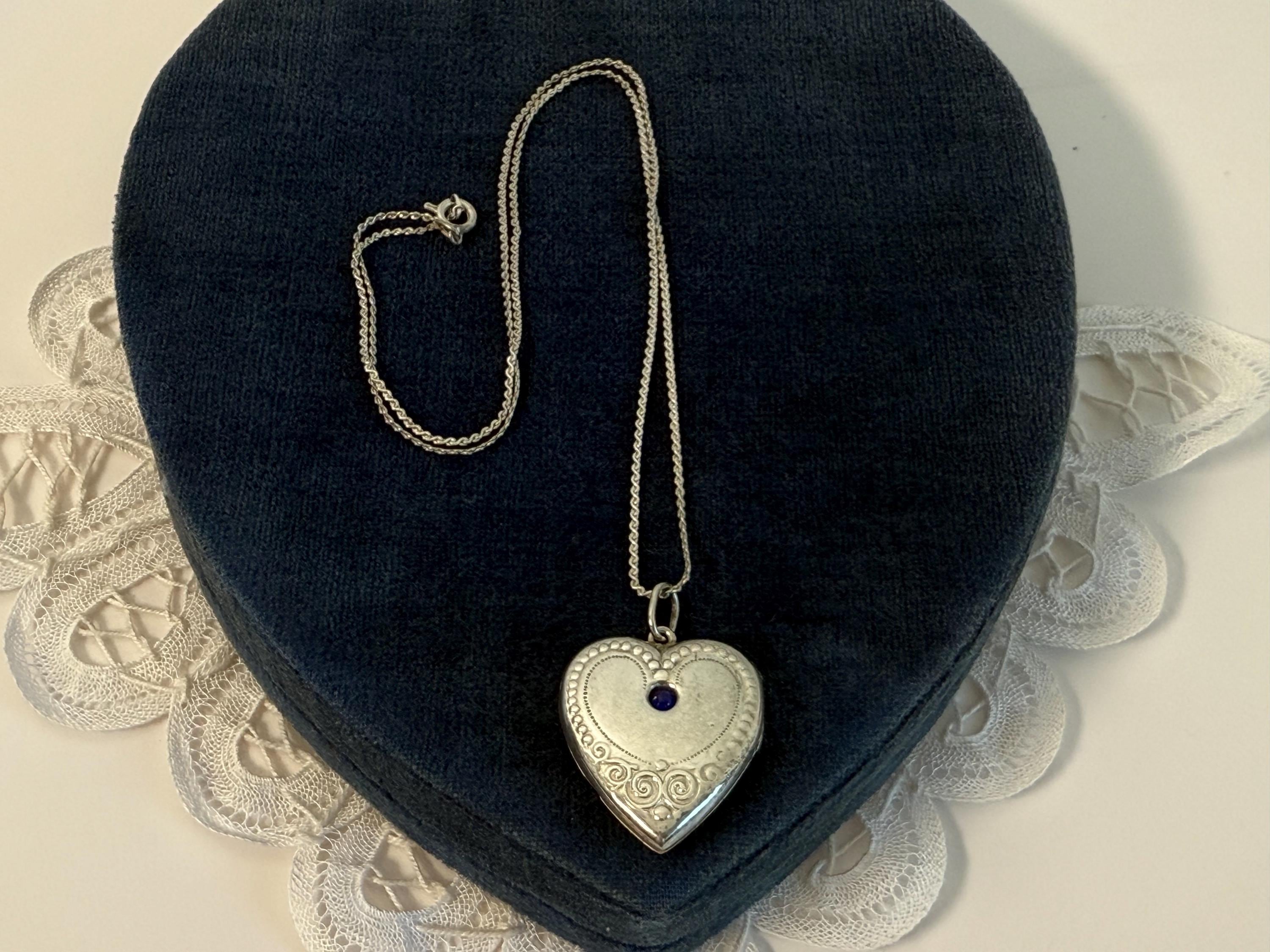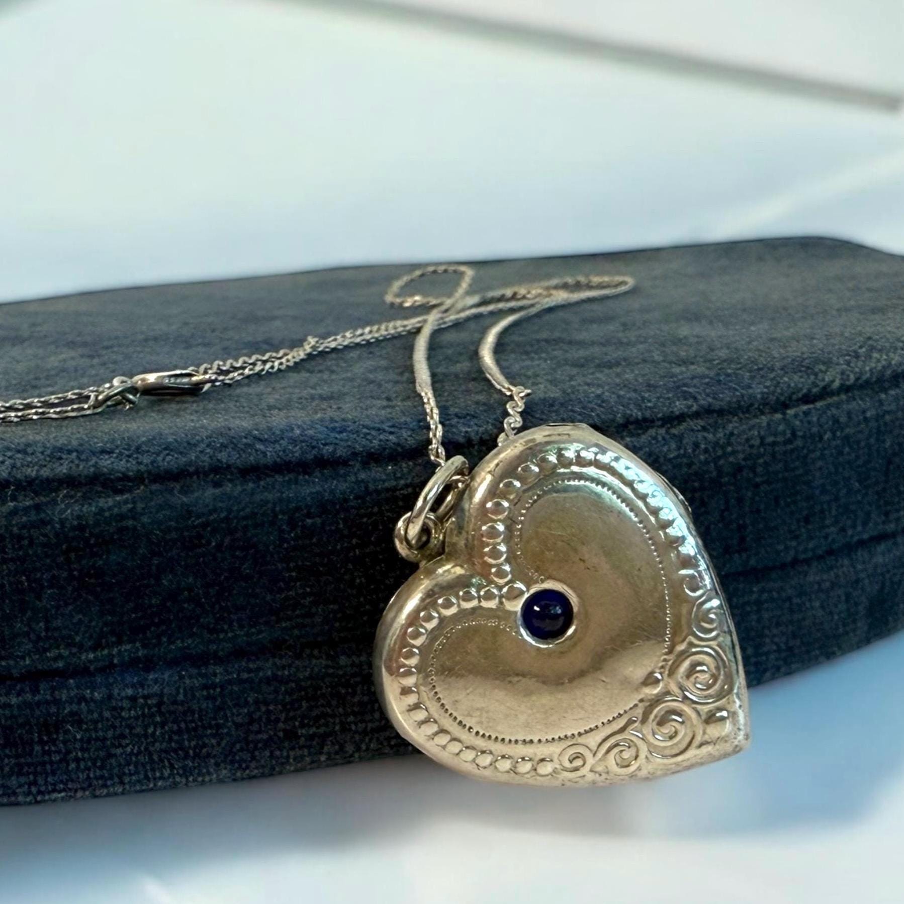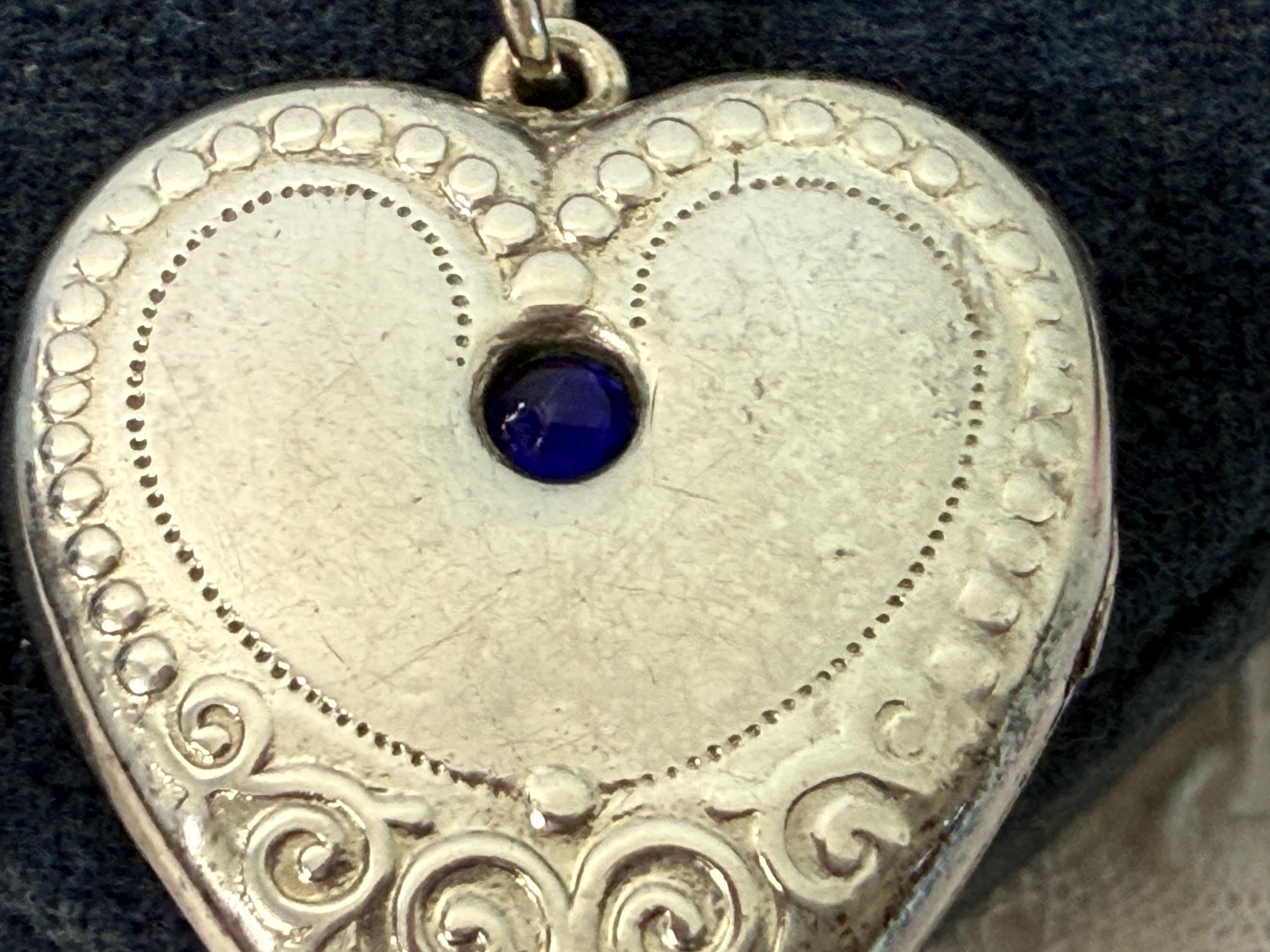 Lovely antique heart shaped 875 Silver photo locket on a sterling silver S link chain. The locket front has a blue cabochon paste gem (glass) in the center top section. On the outer bottom edges there are raised decorative flourishes. The outer edge has a chased dotted line all around it. The back of this locket is plain with no design but has a hallmark in the center.