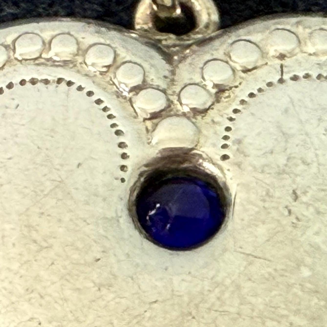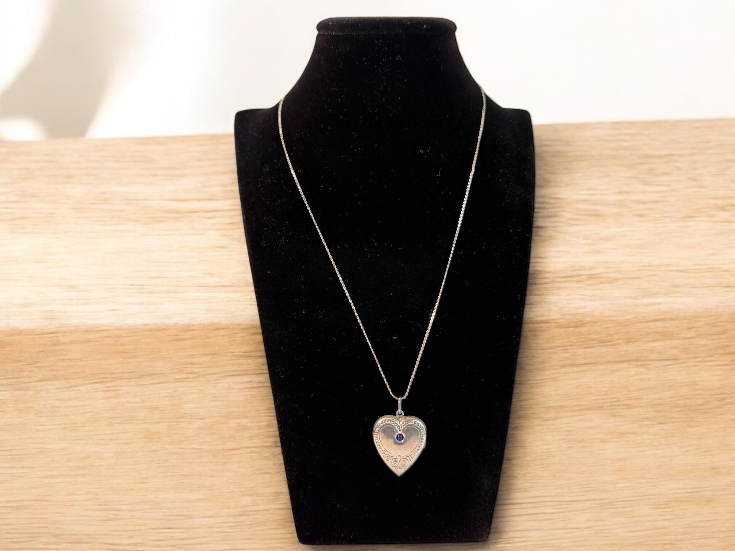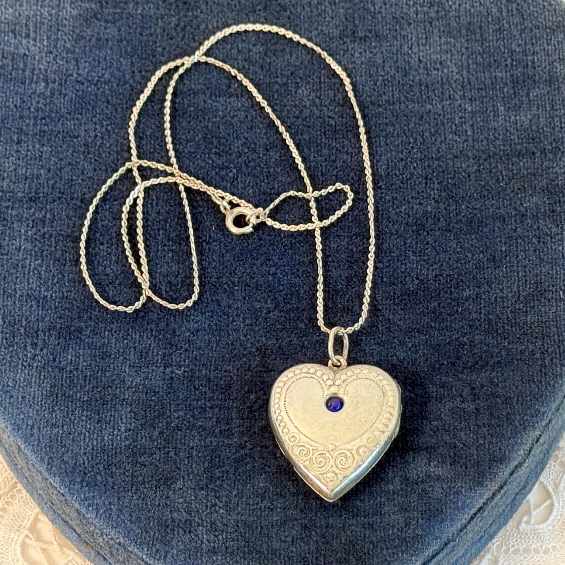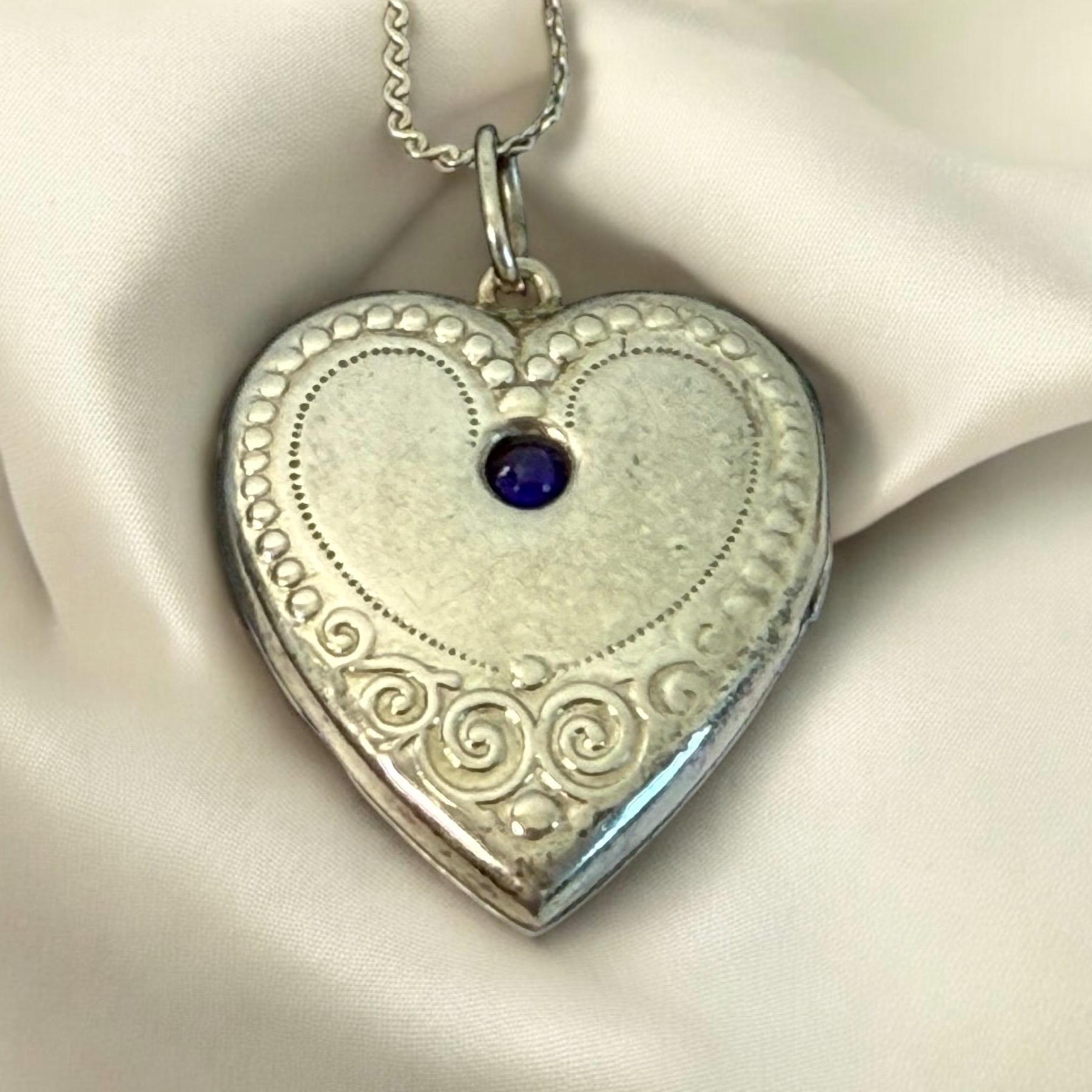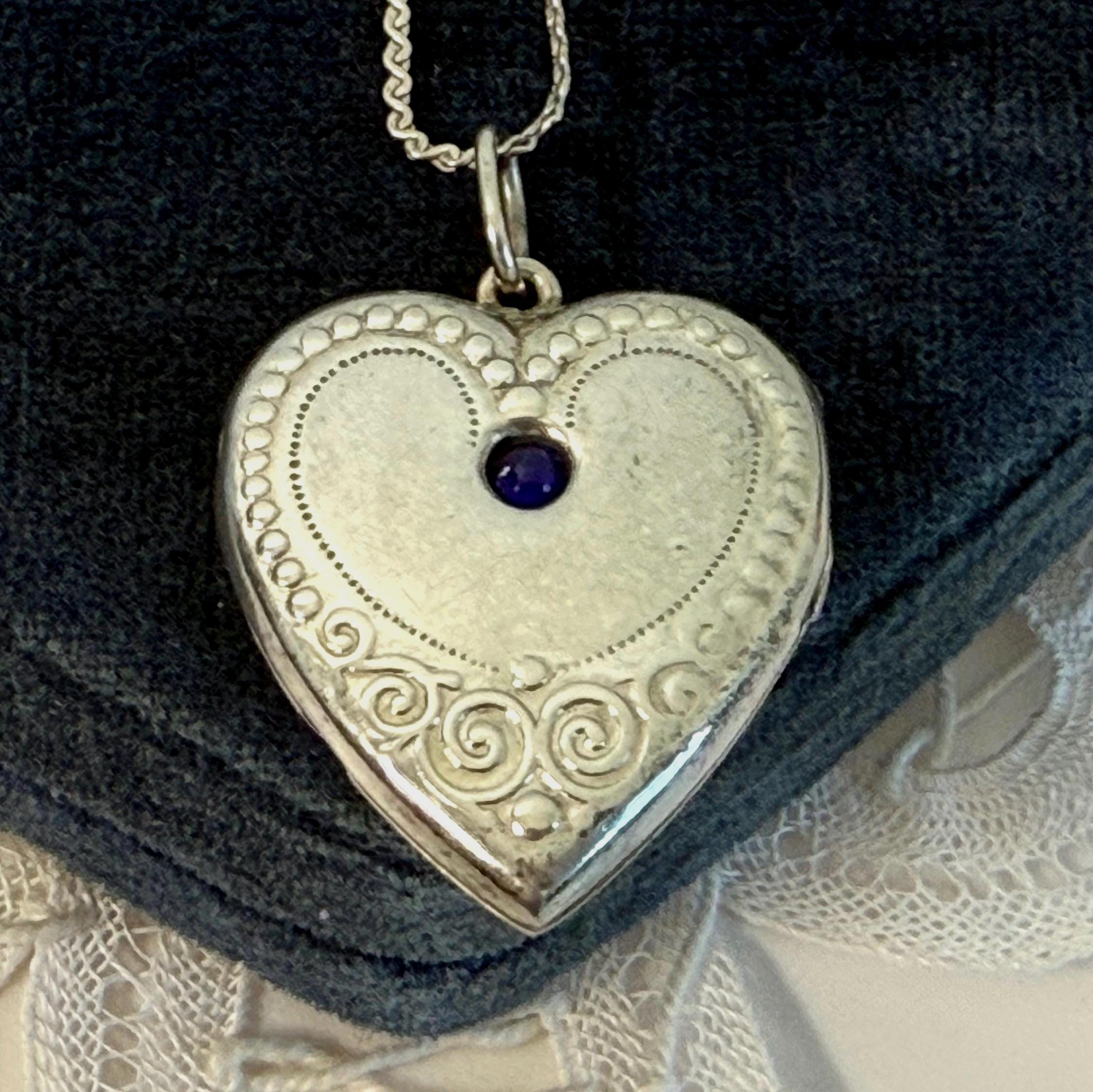 Antique 875 Silver Heart Locket Necklace w/ Raised Design & Blue Paste Gem - ca Early 1900s