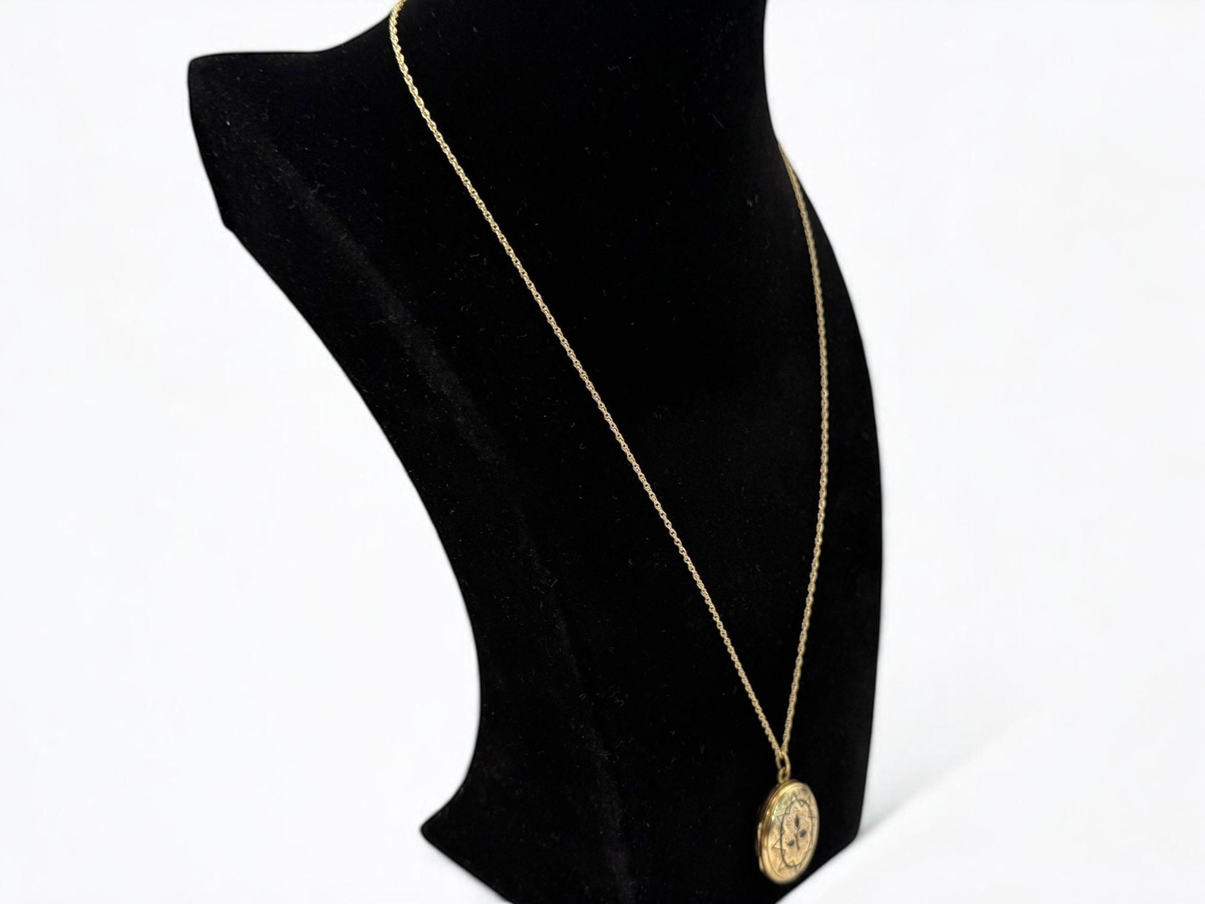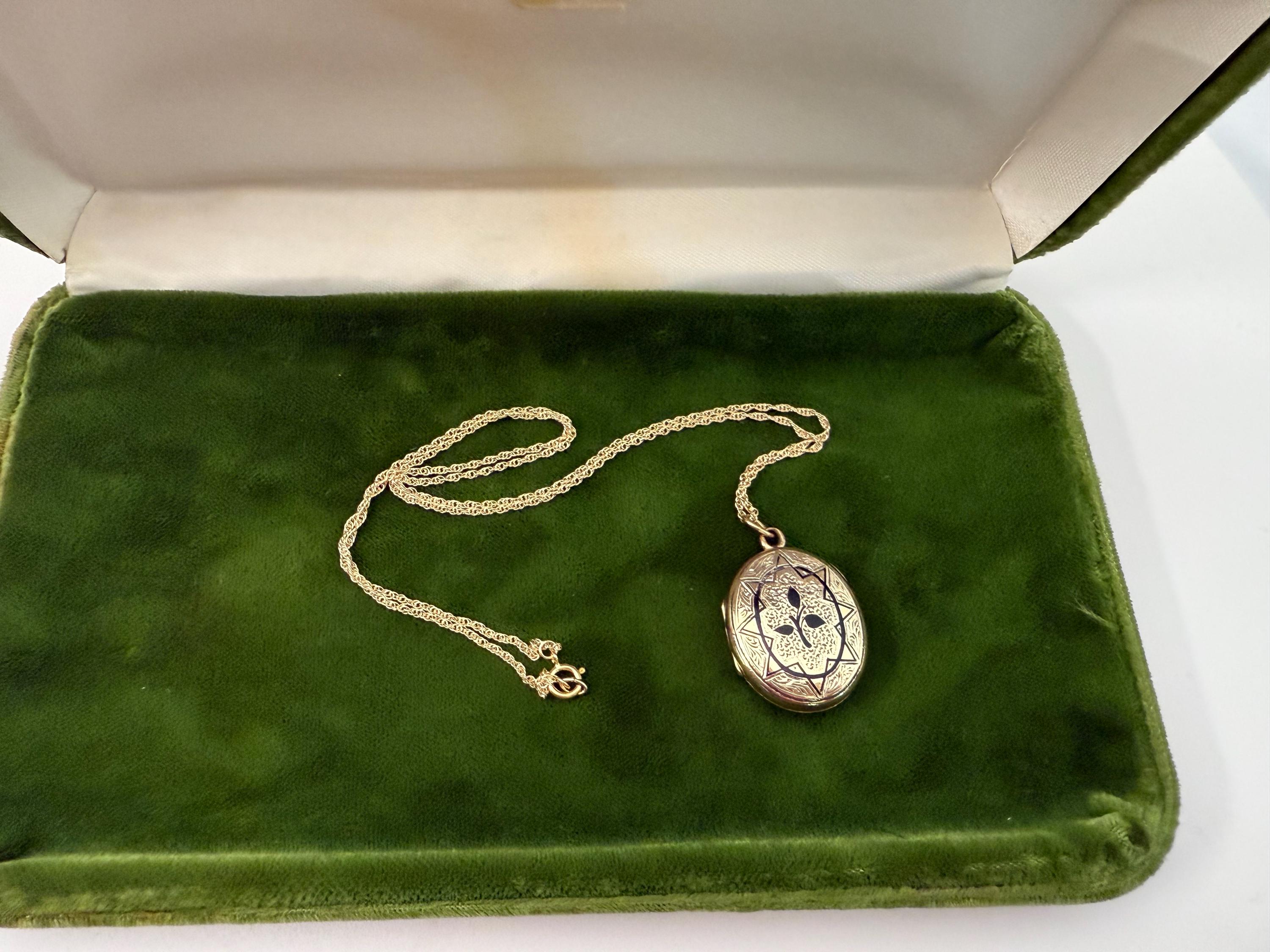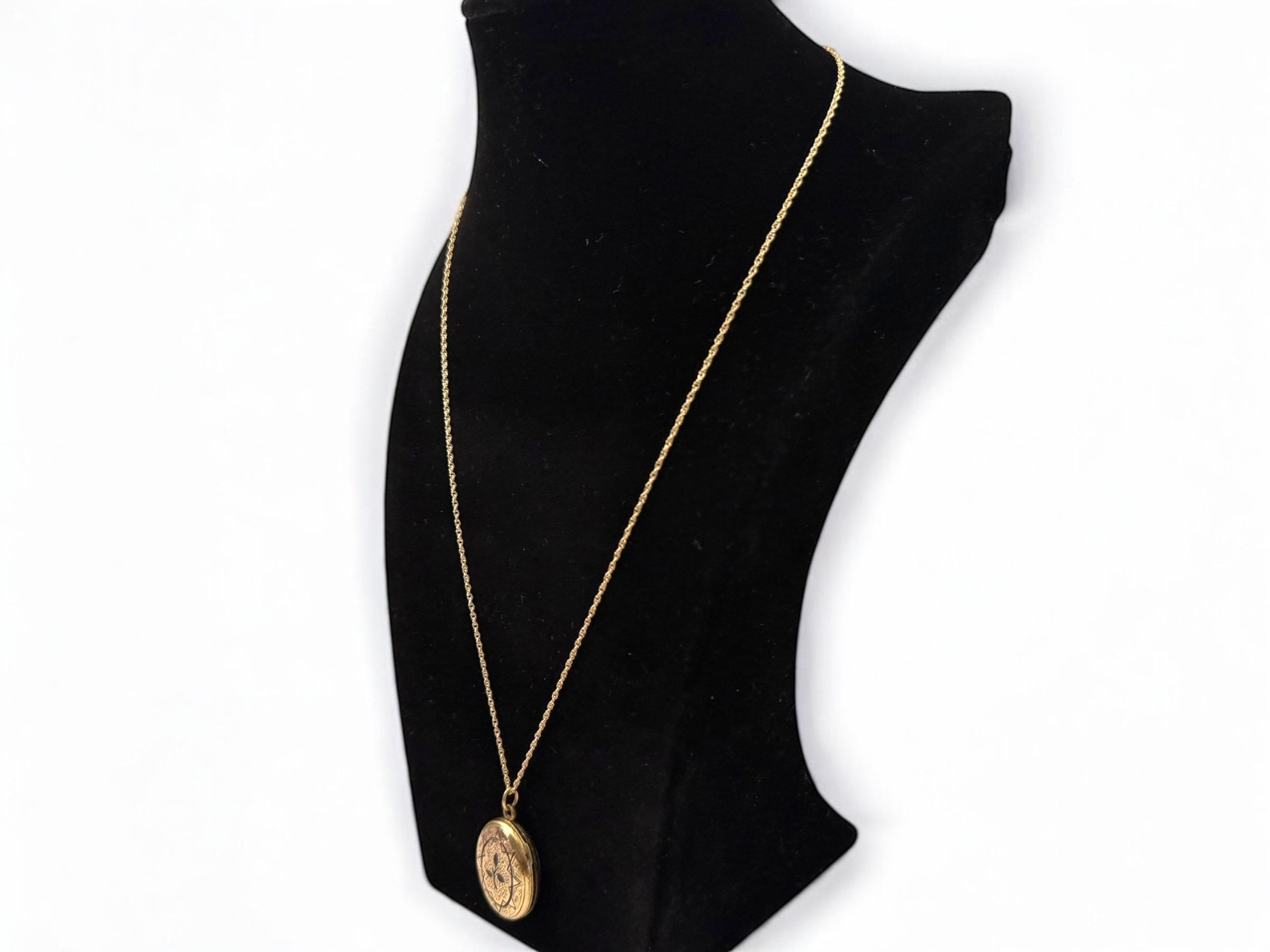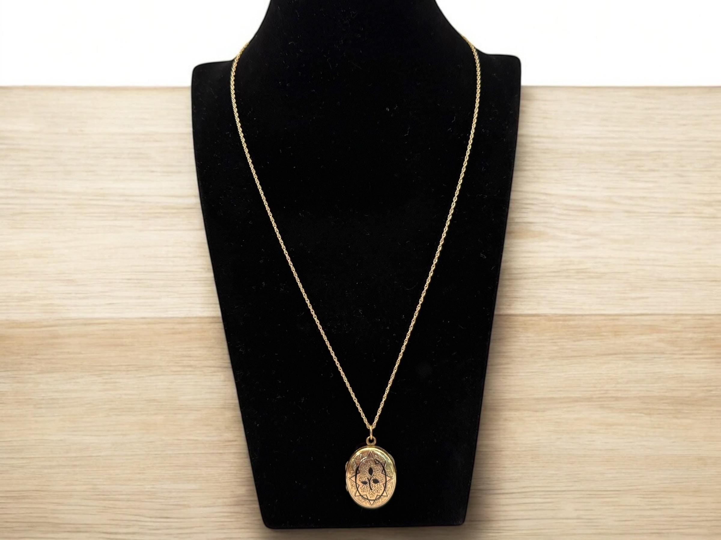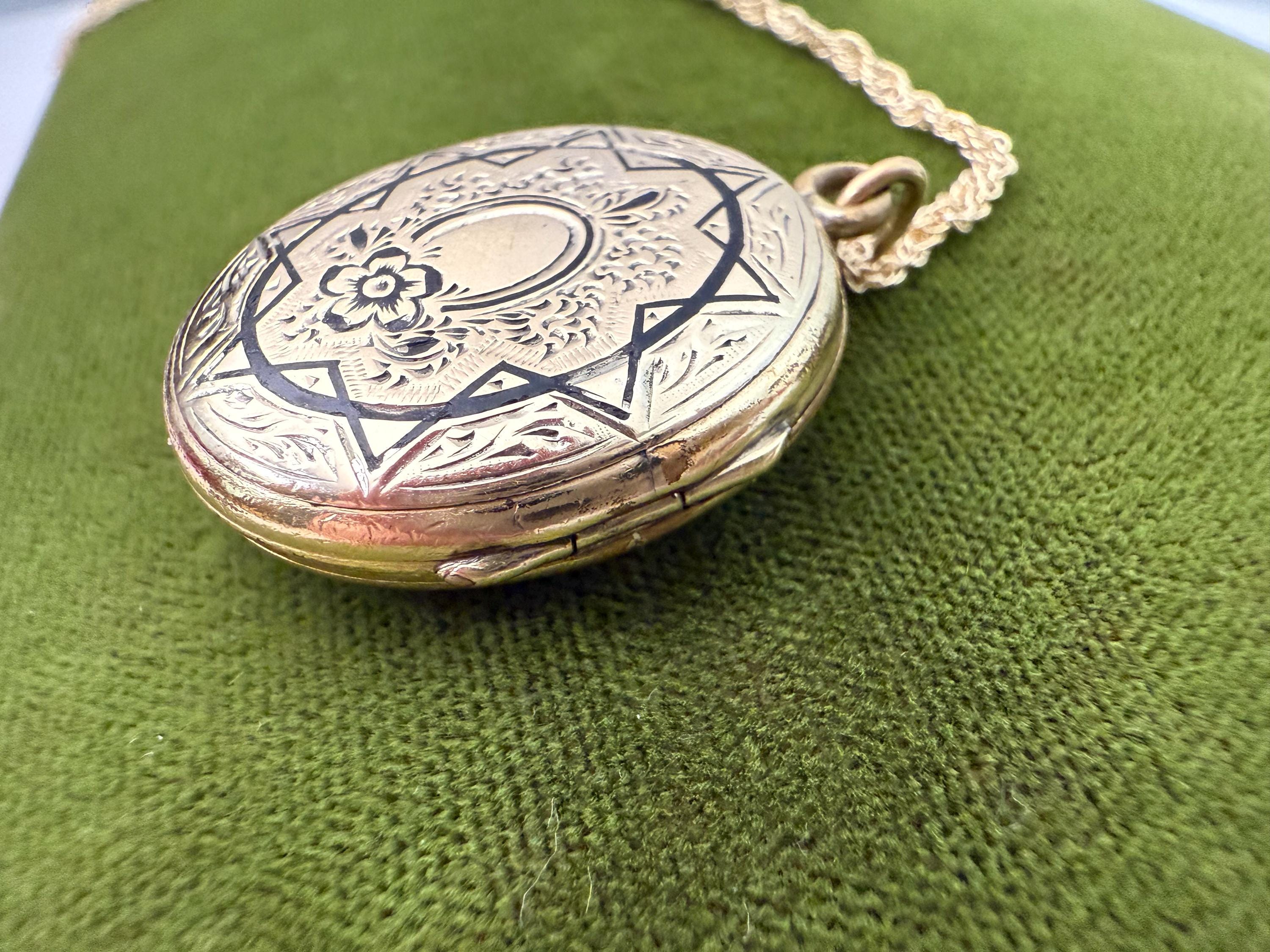 Victorian Oval Mourning Locket w/ Black Enamel: 14K Gold Filled Chain Antique Estate Jewelry