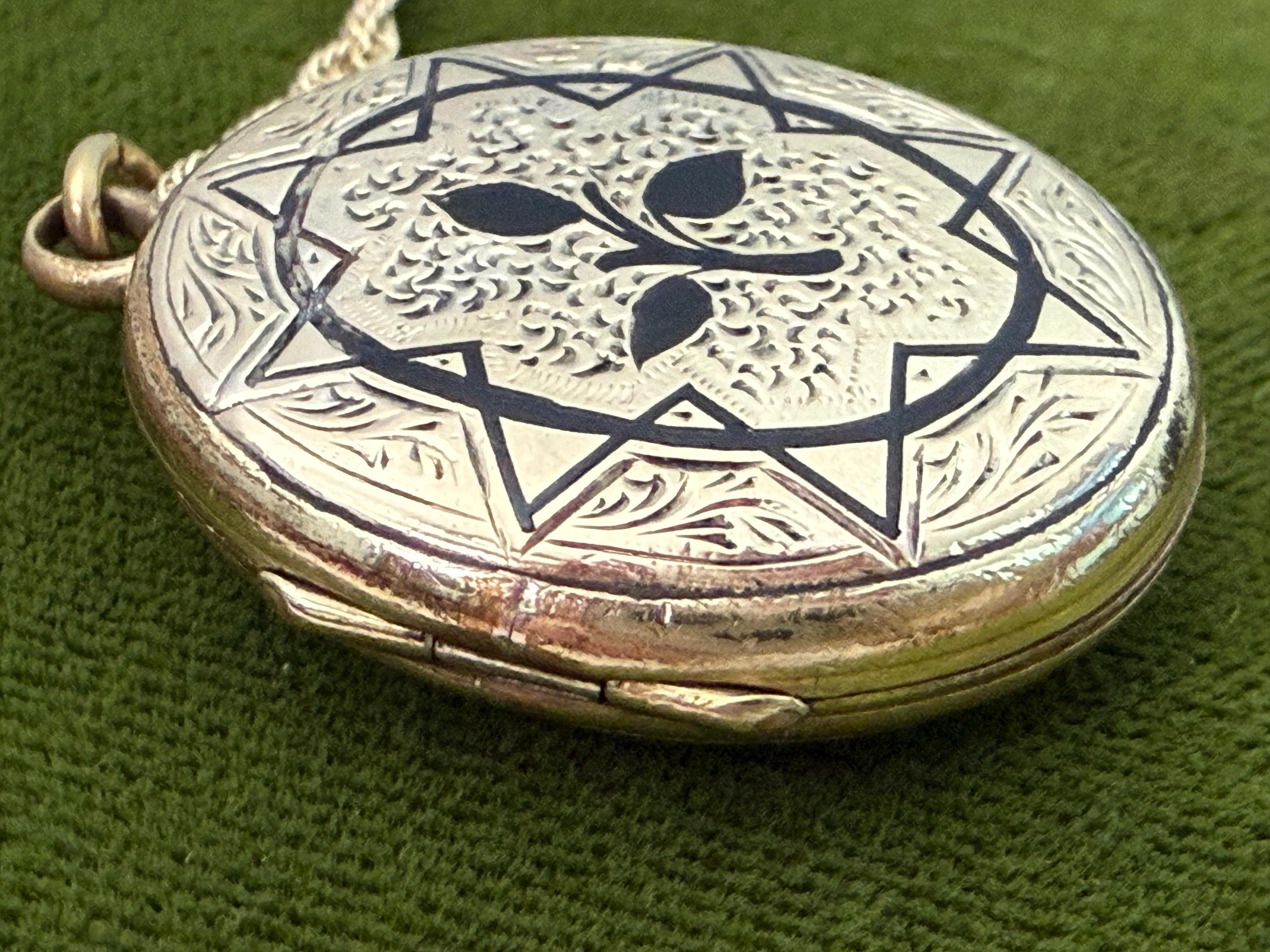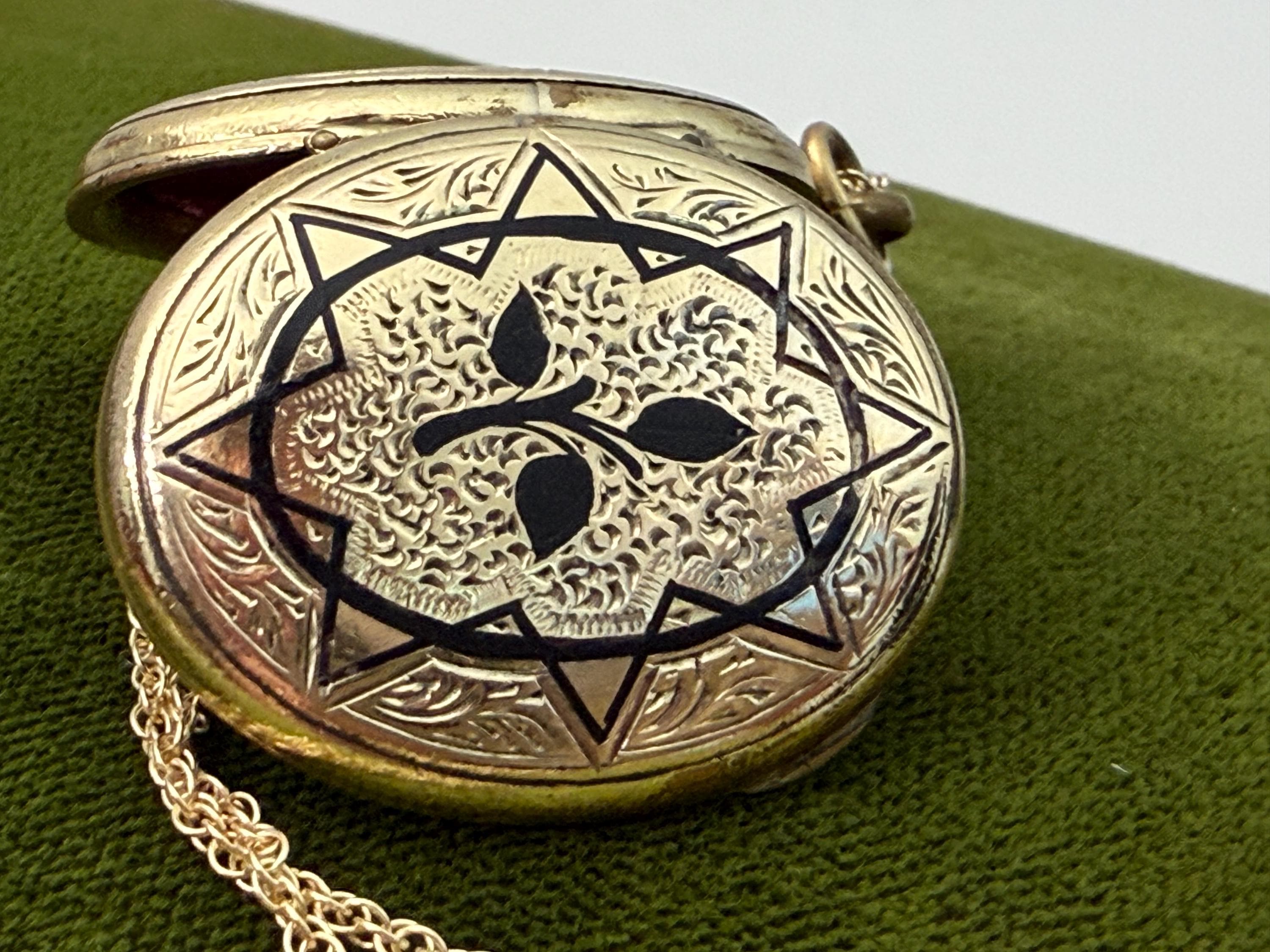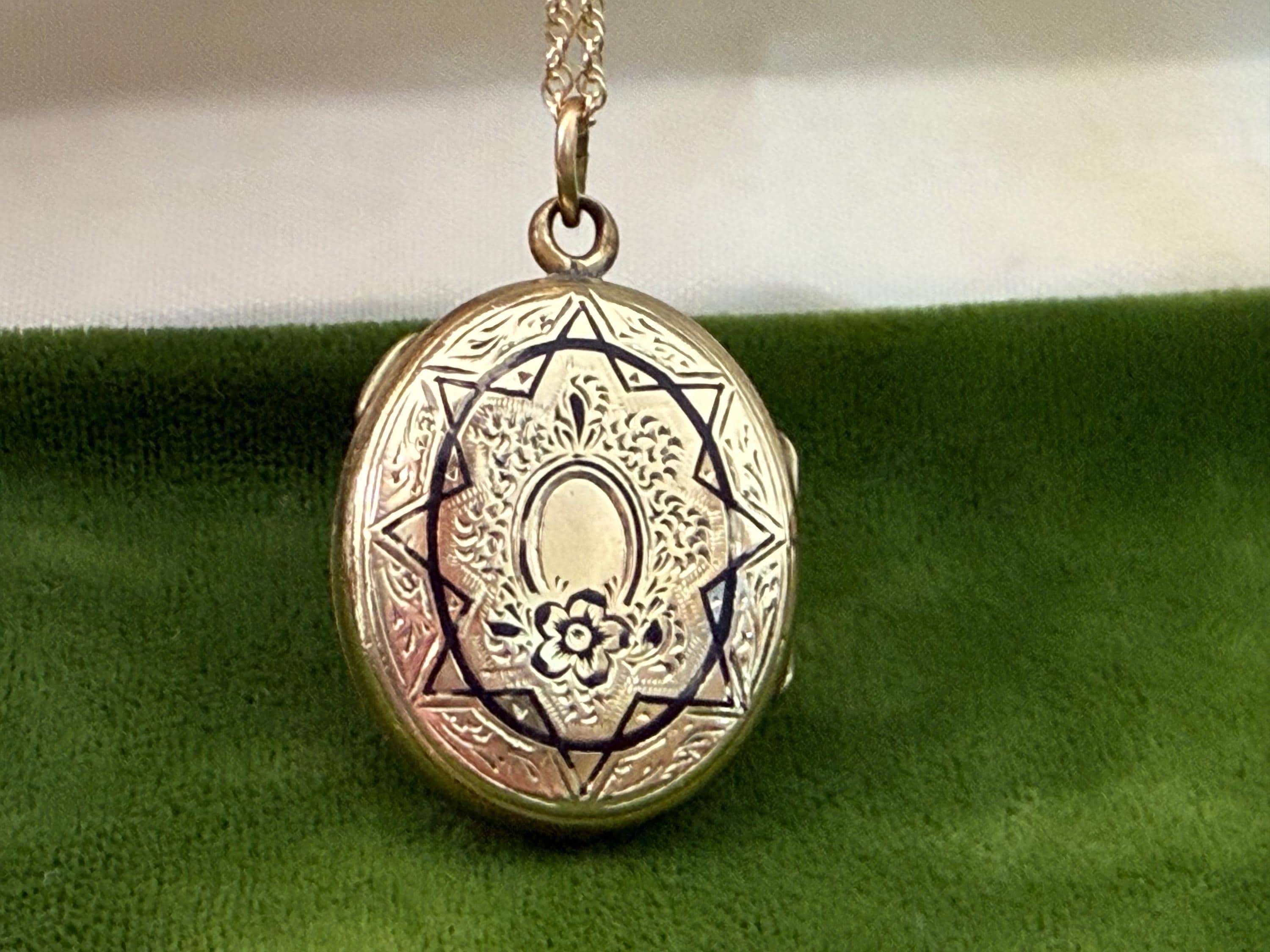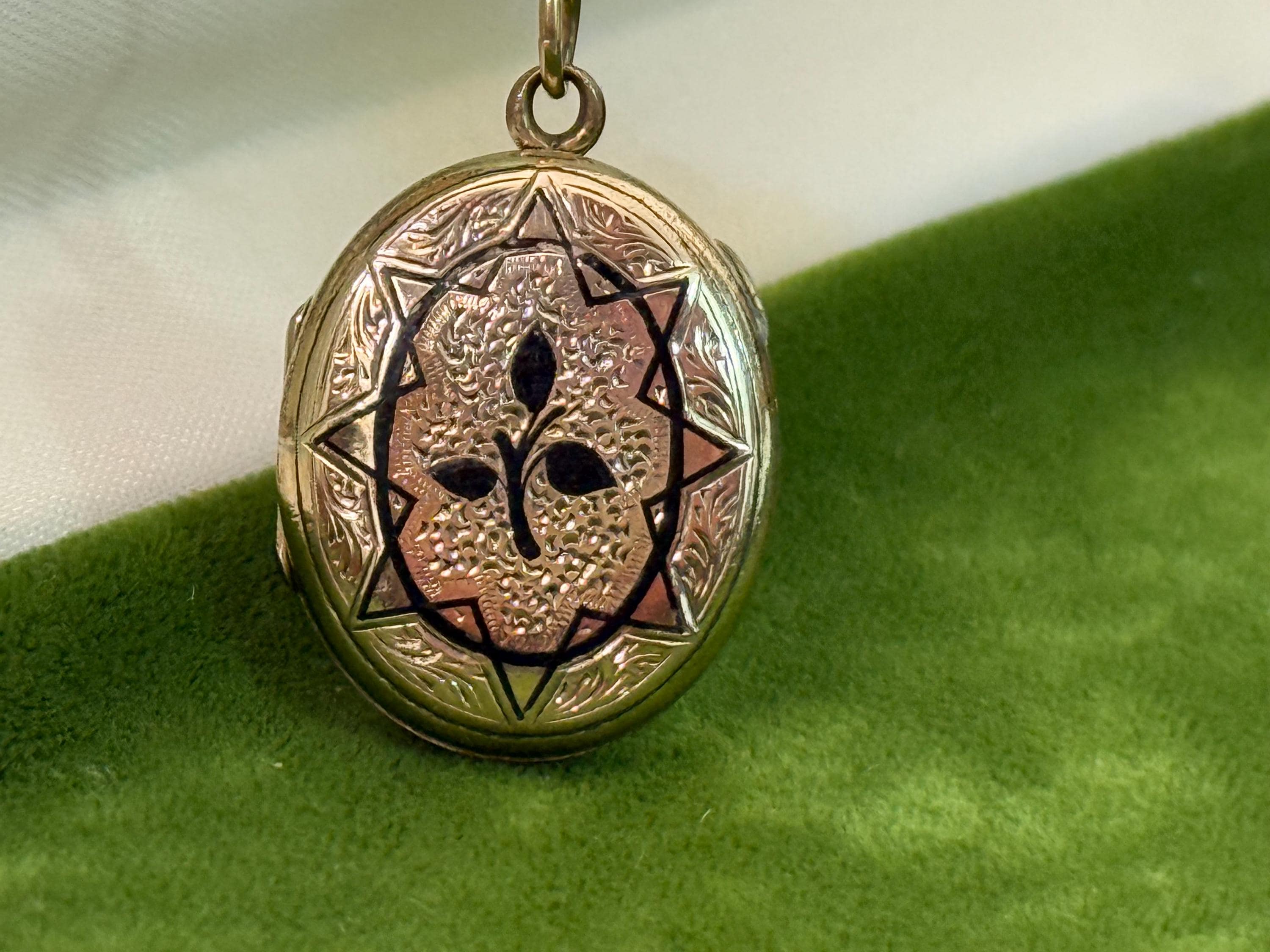 The front of this antique oval / domed shaped gold plated locket pendant features a tiny little floral three leafed design in the center. Some of the designs on the edges are filled with black enamel. There is a black enamel oval ring with a starburst shape around the outer edge. The enamel is in nice condition. The back has a tiny flower and the same oval ring with the same star shape around the outer edge.
