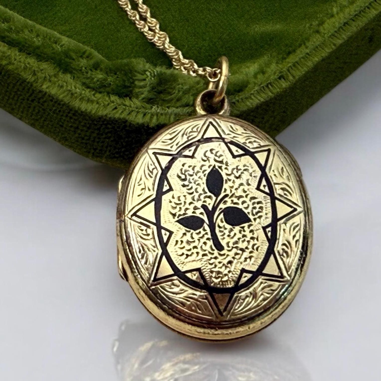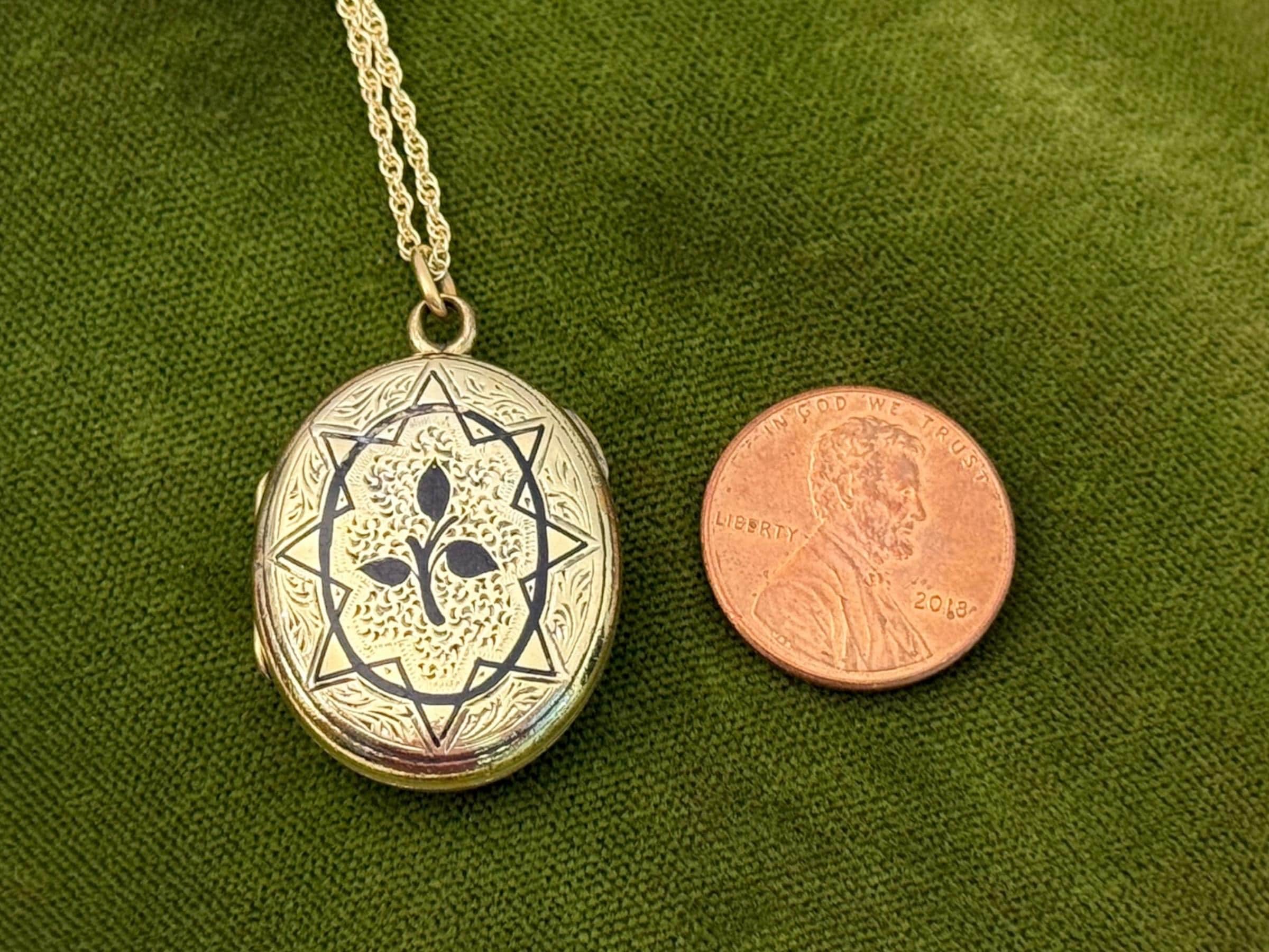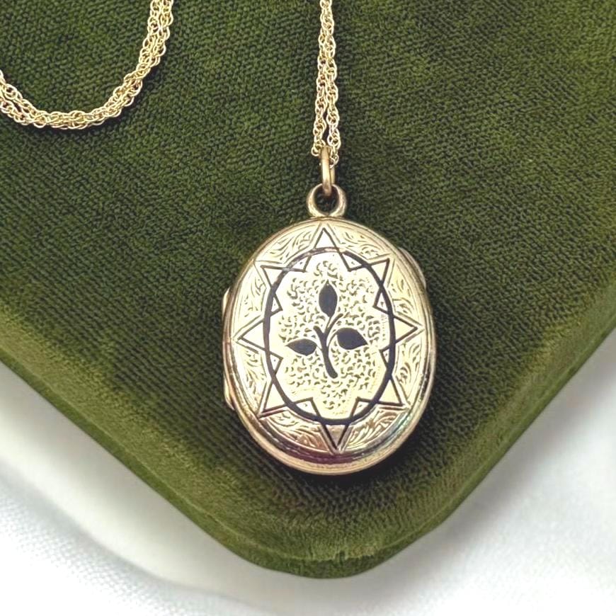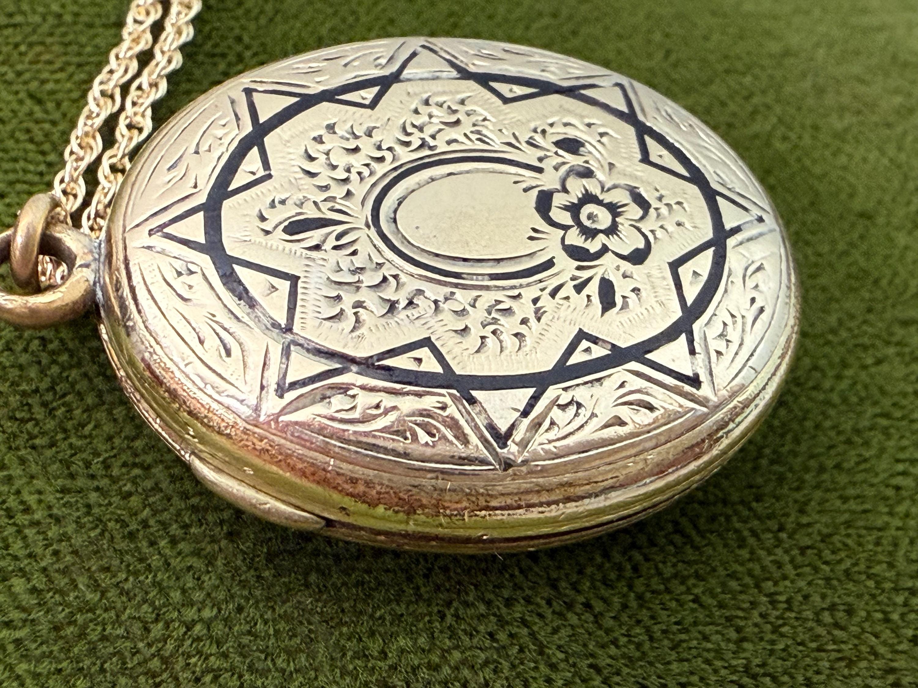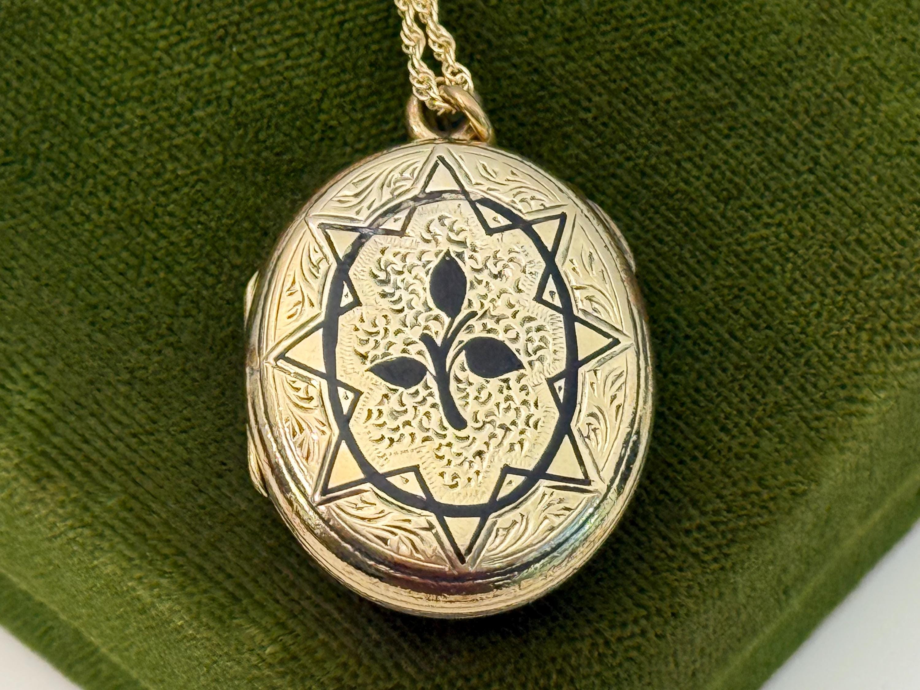The front of this antique oval / domed shaped gold plated locket pendant features a tiny little floral three leafed design in the center. Some of the designs on the edges are filled with black enamel. There is a black enamel oval ring with a starburst shape around the outer edge. The enamel is in nice condition. The back has a tiny flower and the same oval ring with the same star shape around the outer edge.