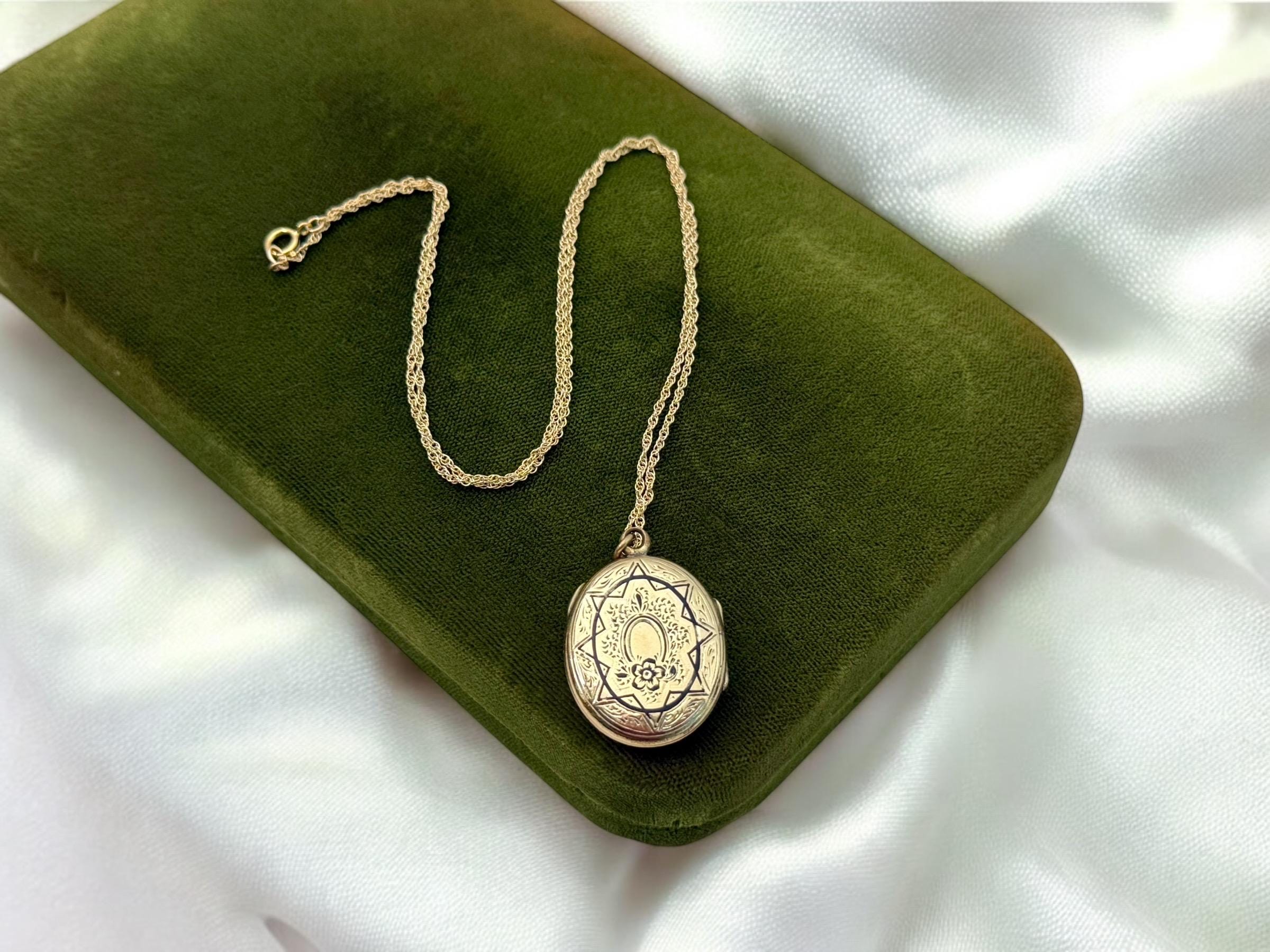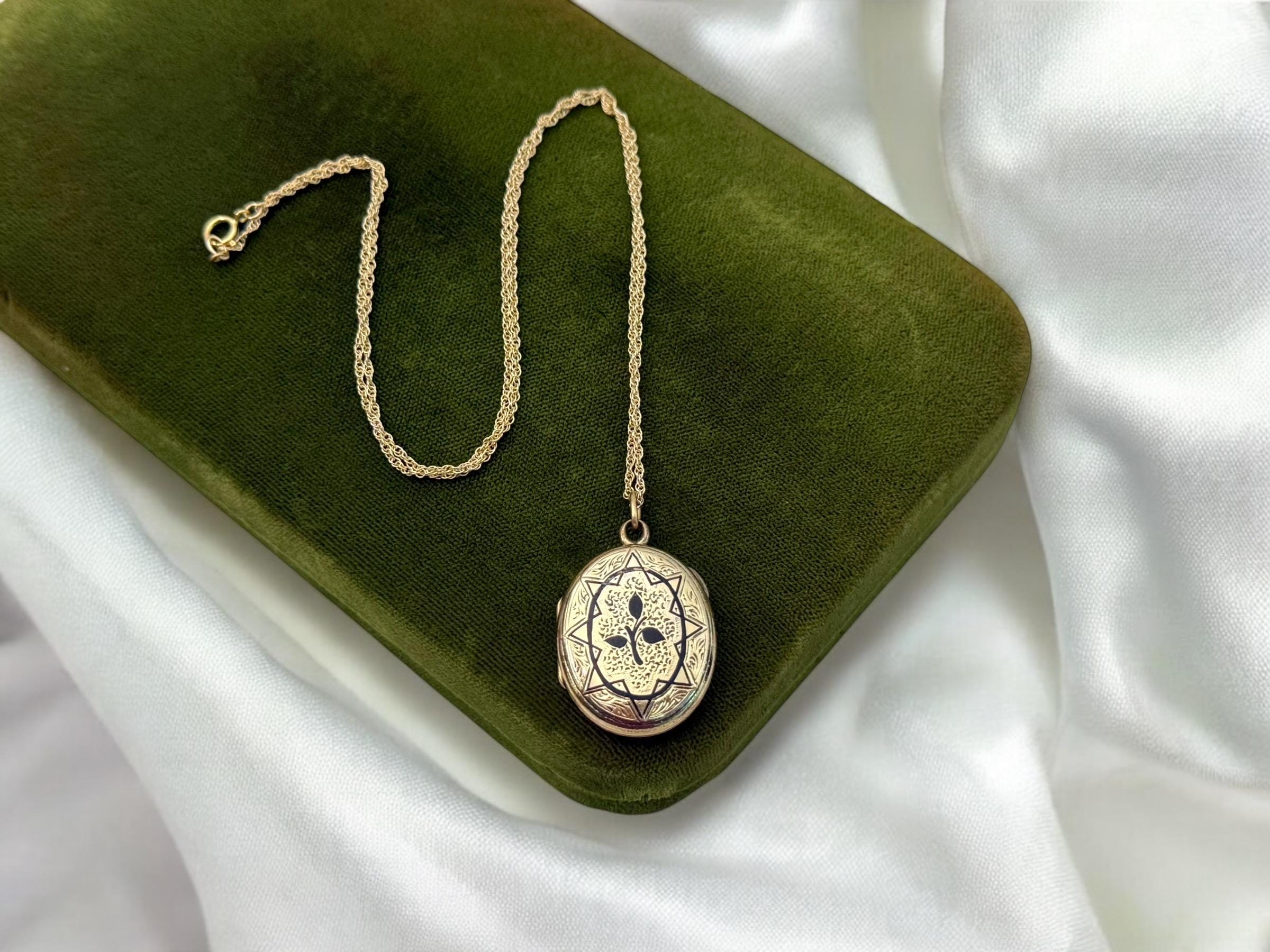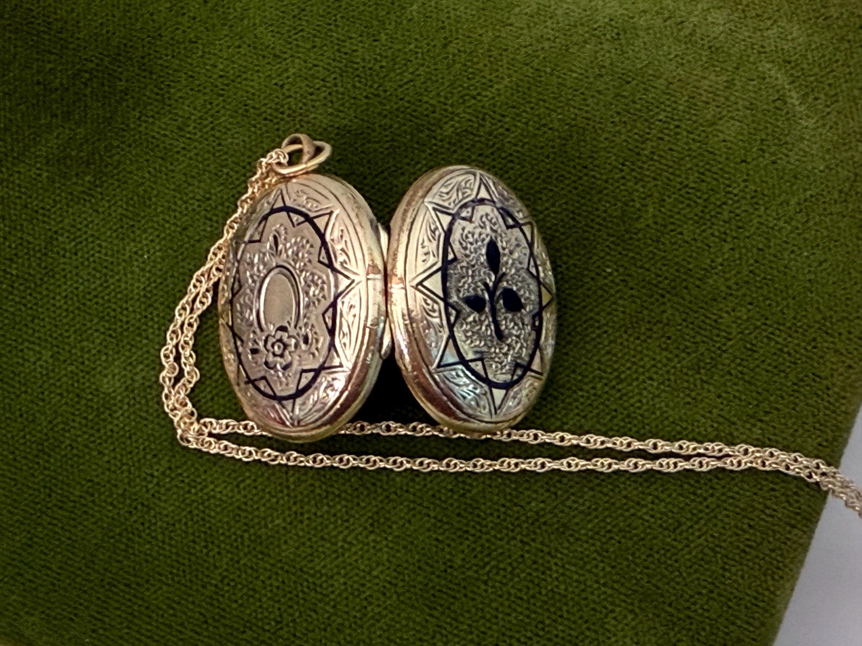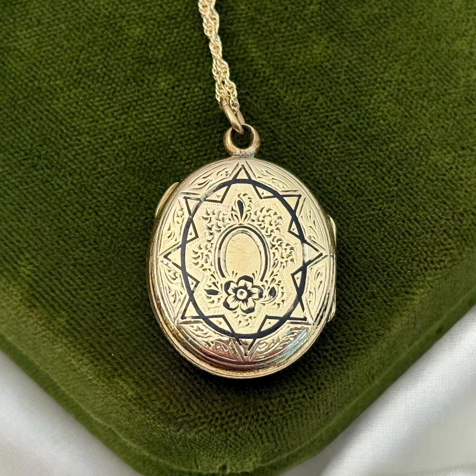 The front of this antique oval / domed shaped gold plated locket pendant features a tiny little floral three leafed design in the center. Some of the designs on the edges are filled with black enamel. There is a black enamel oval ring with a starburst shape around the outer edge. The enamel is in nice condition. The back has a tiny flower and the same oval ring with the same star shape around the outer edge.