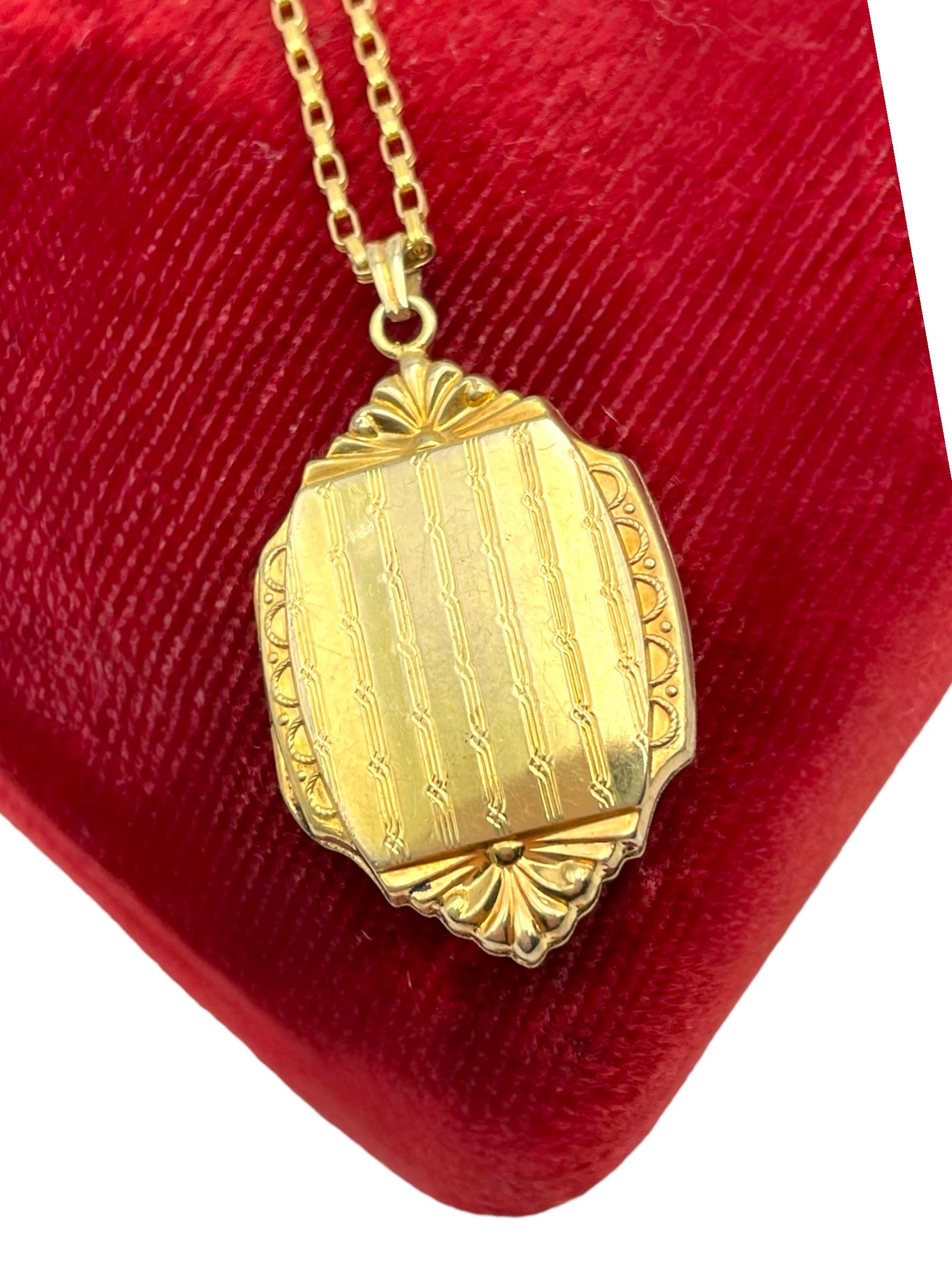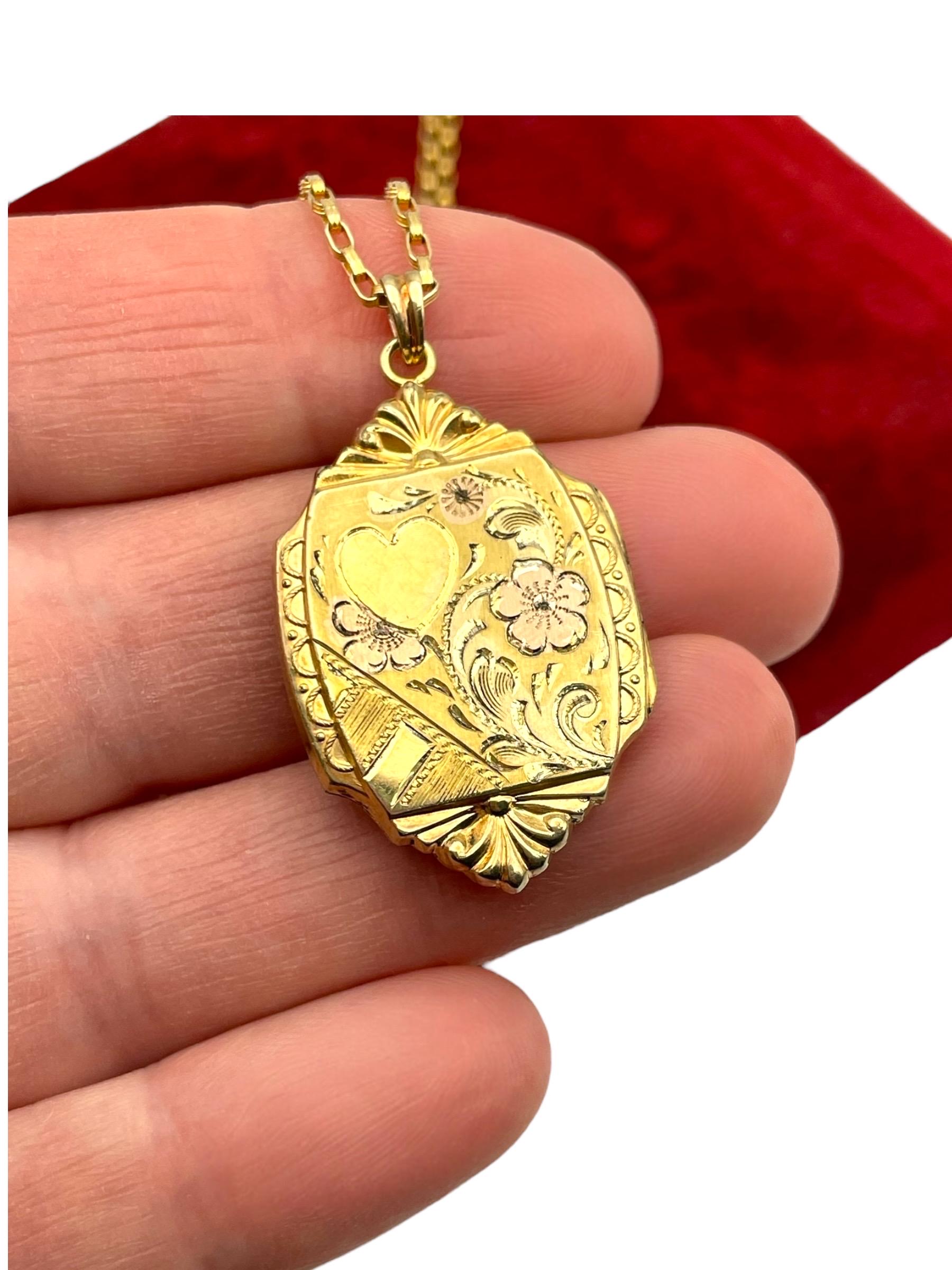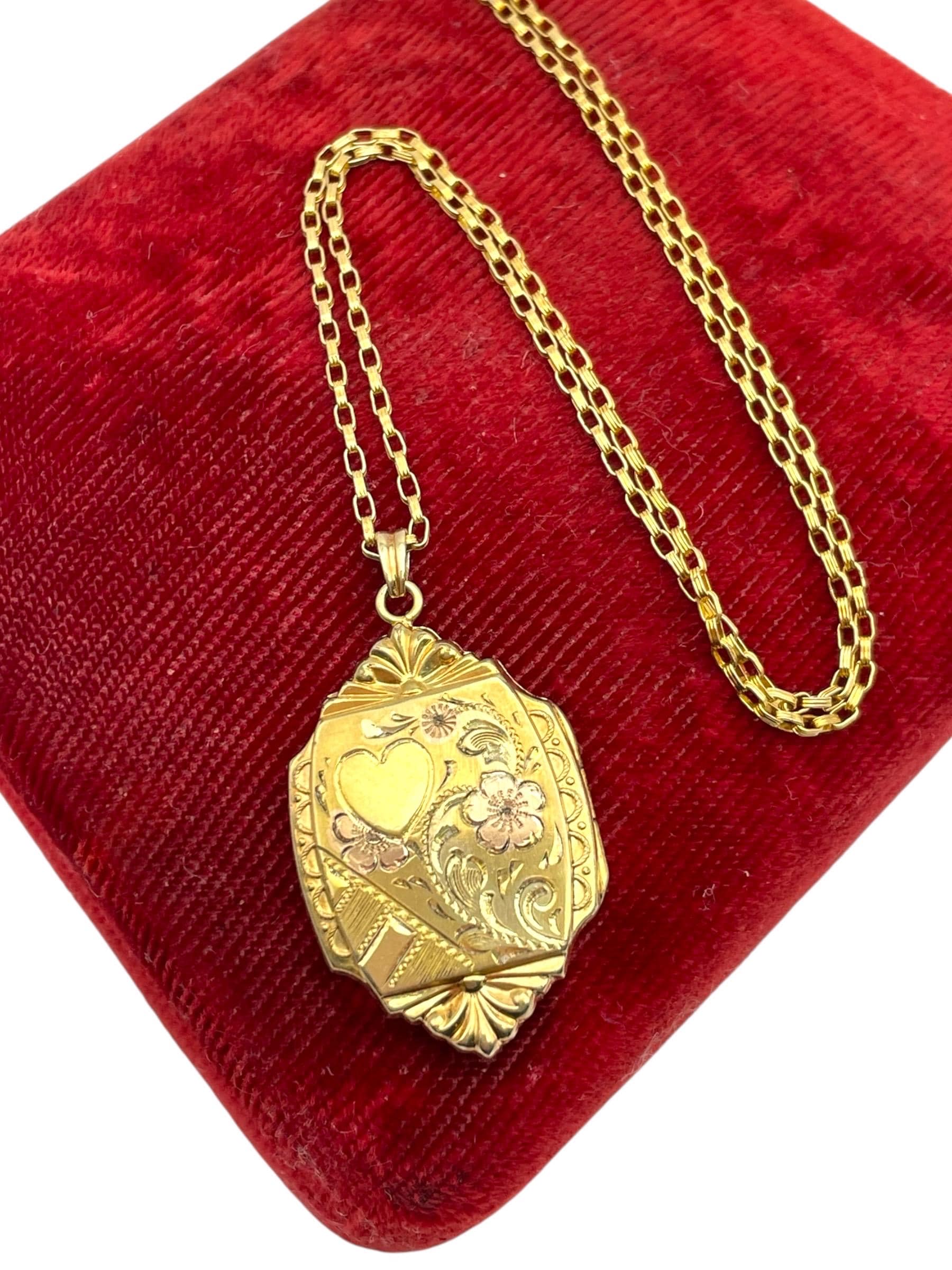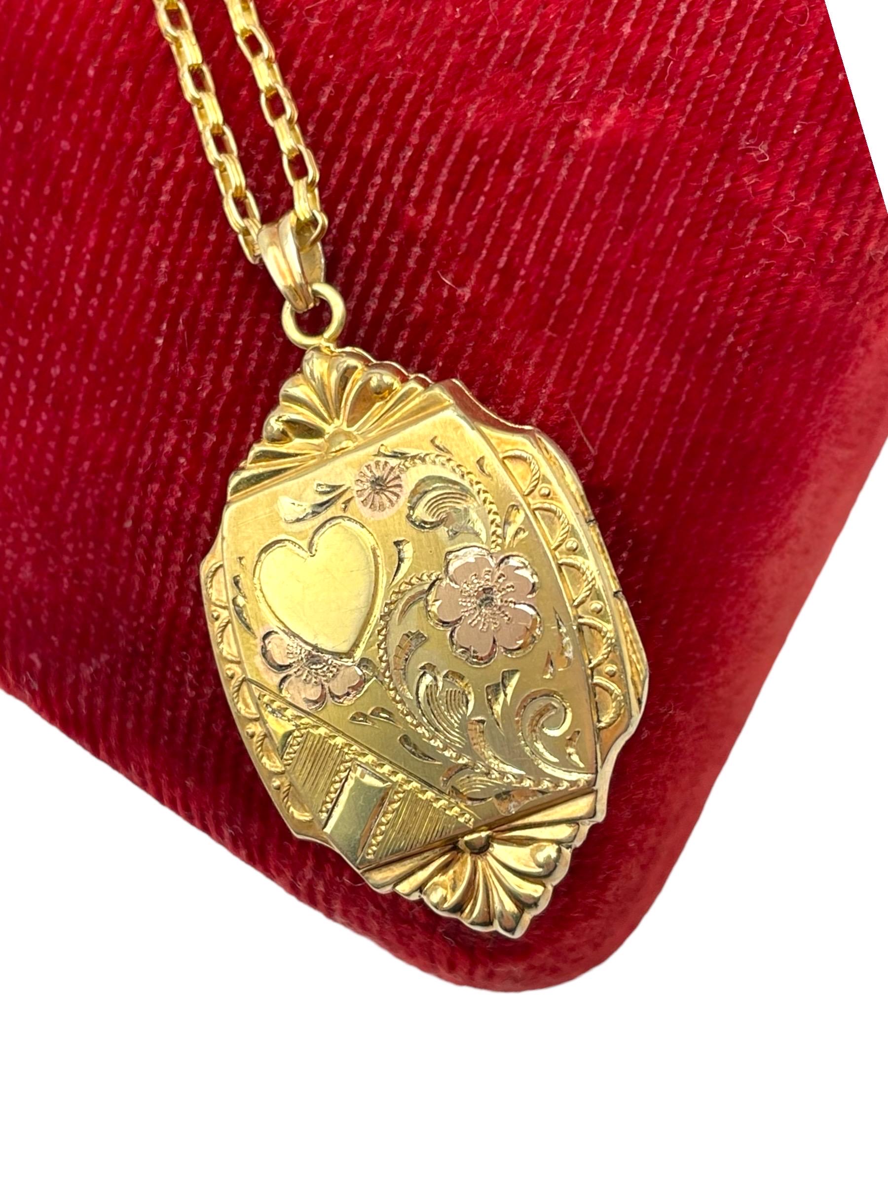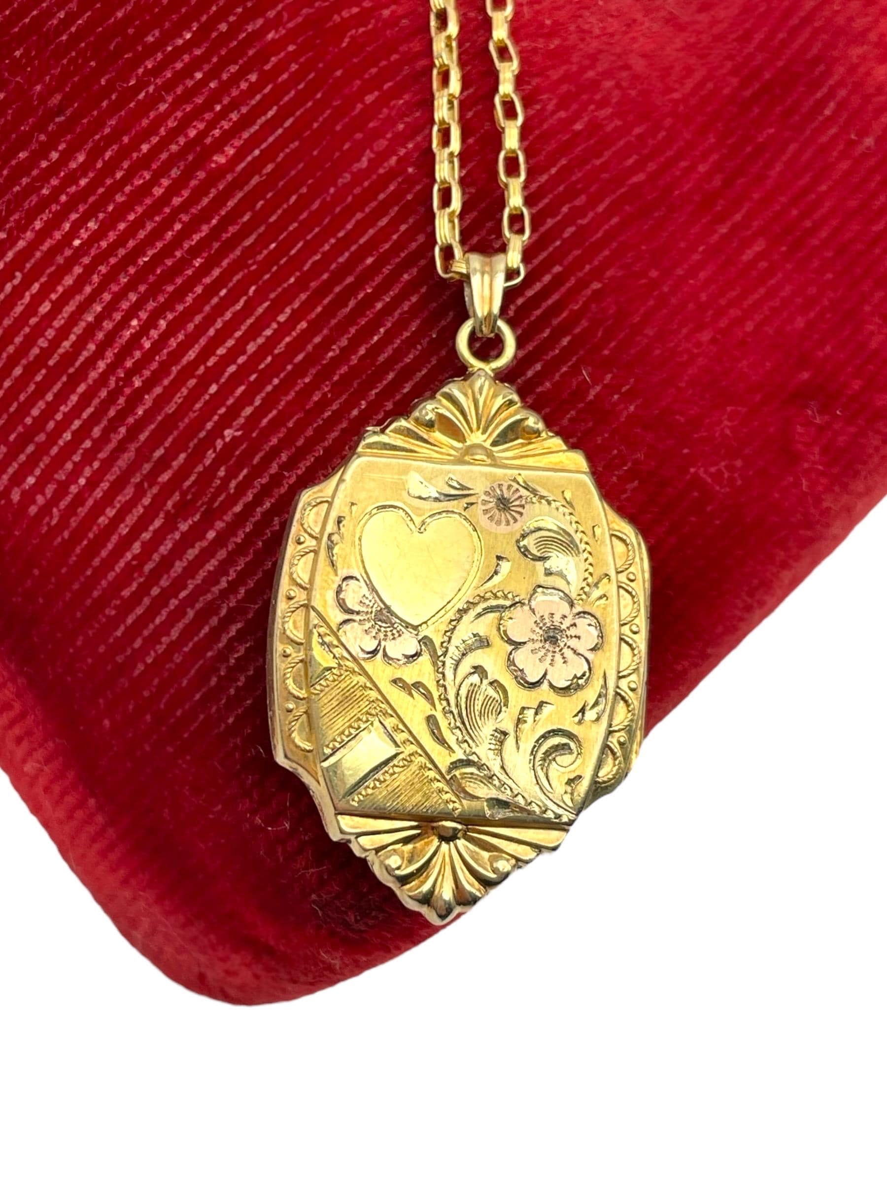 Vintage 12K Gold Filled locket made by the Walter E. HAYWARD Company. Locket has a rectangular shield shape with a tricolor floral and heart etched front. The back has the pinstripe design characteristic of Hayward.