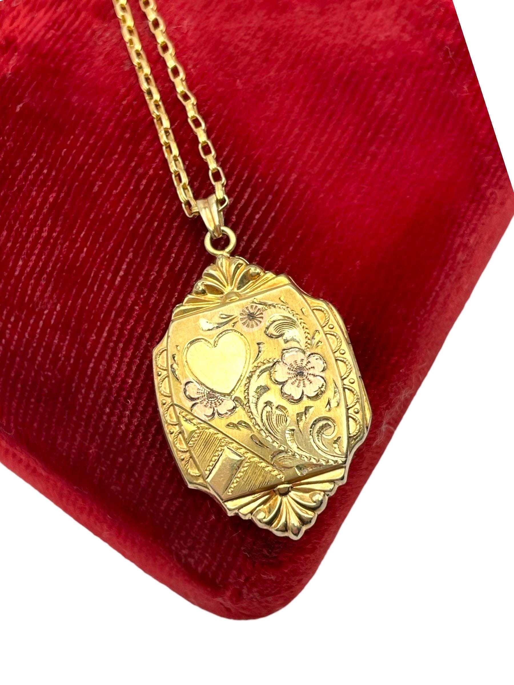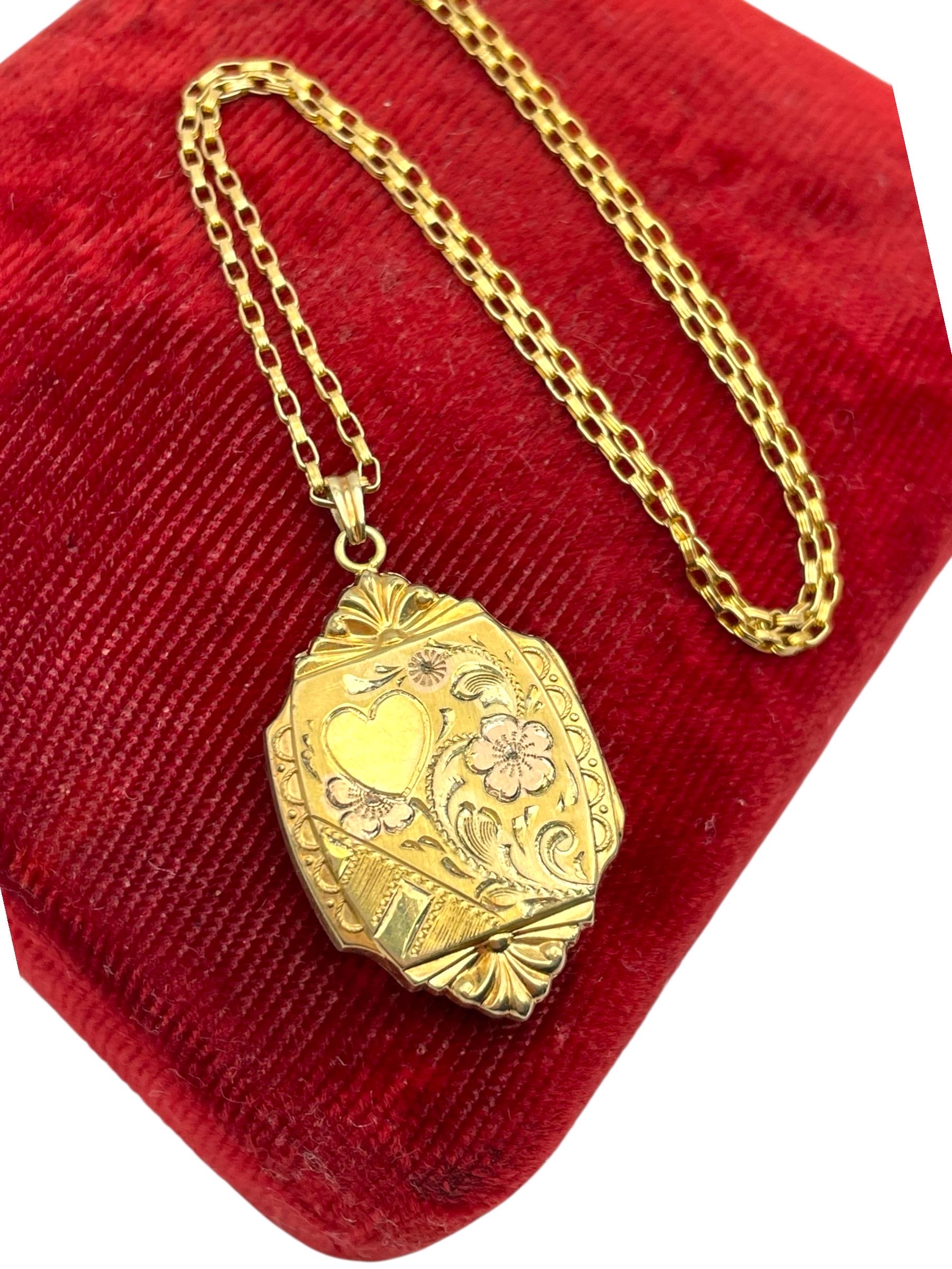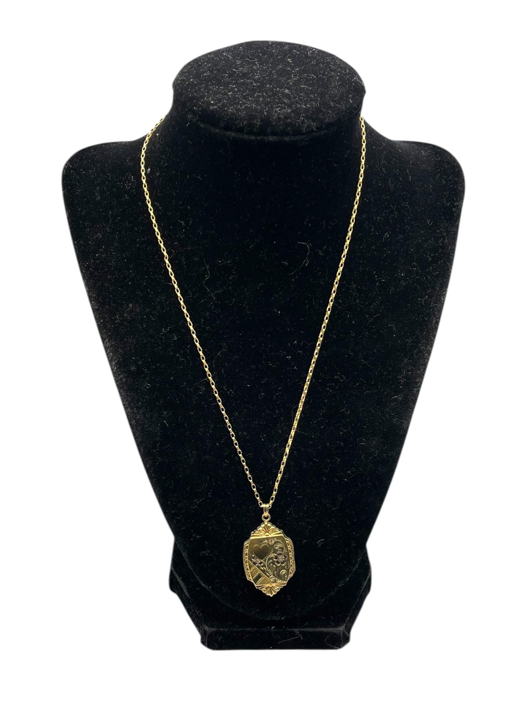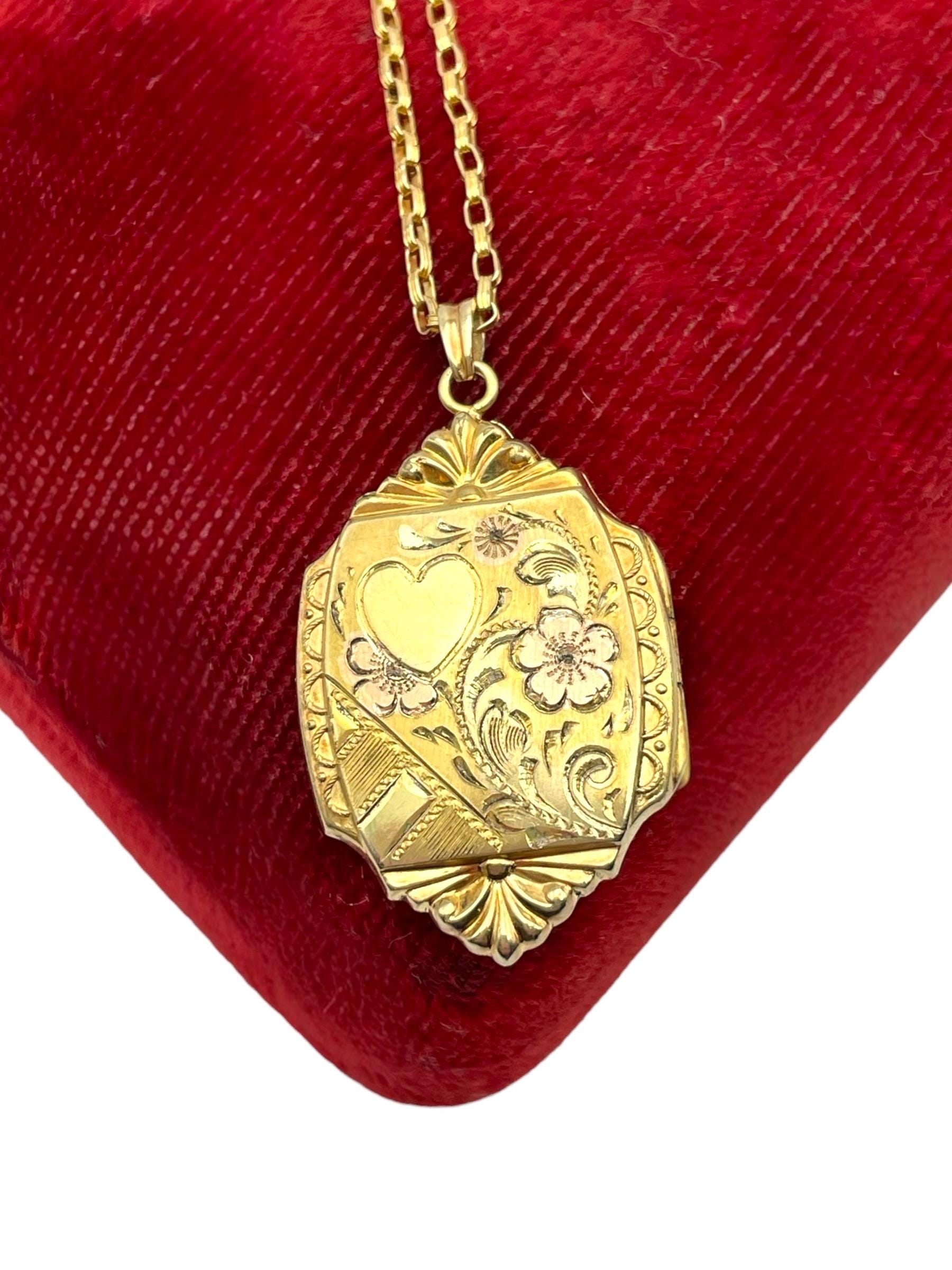 Vintage 12K Gold Filled Locket: Shield Shape, Floral Etched Pendant by Hayward WEH 1930s Jewelry