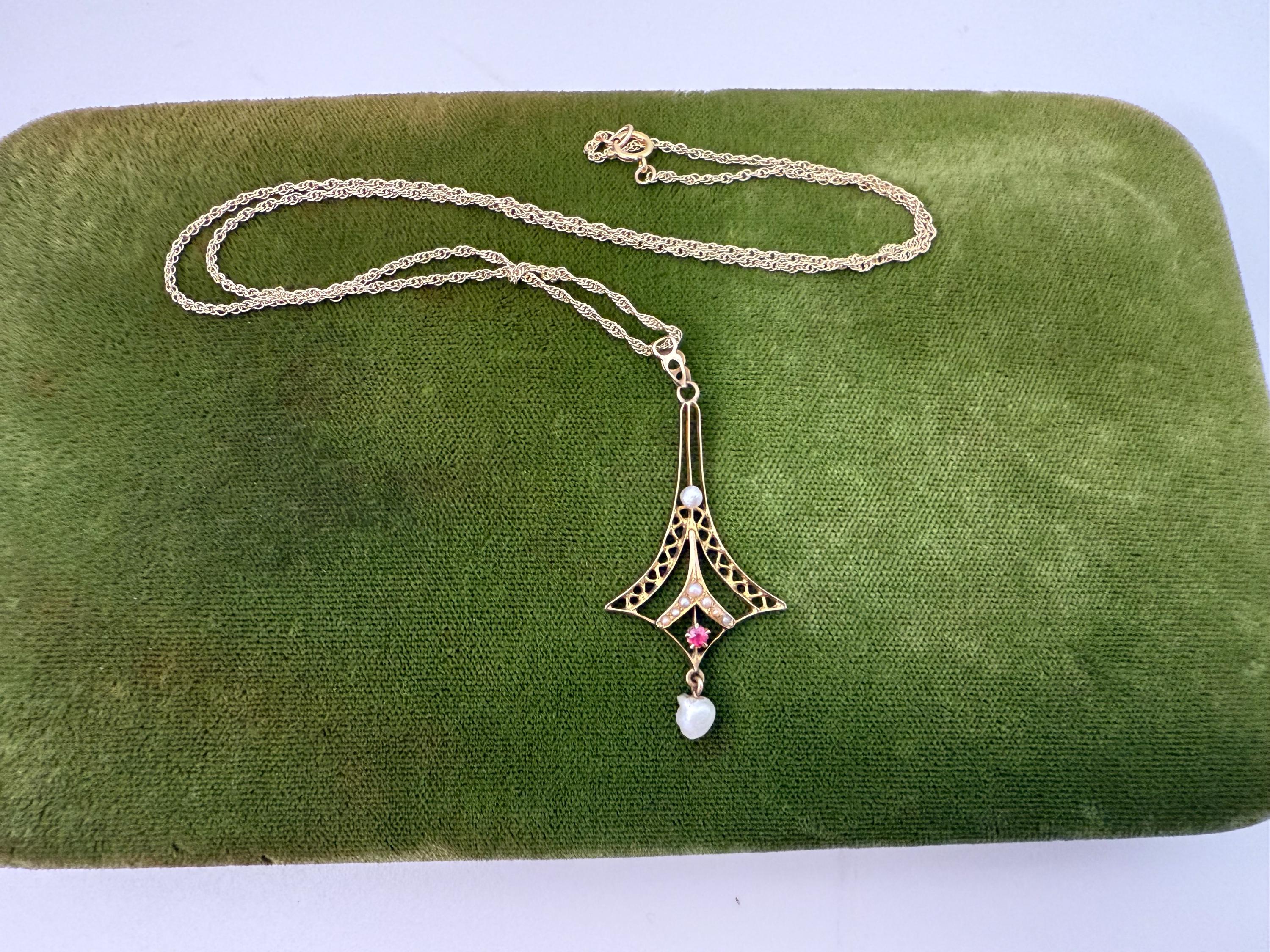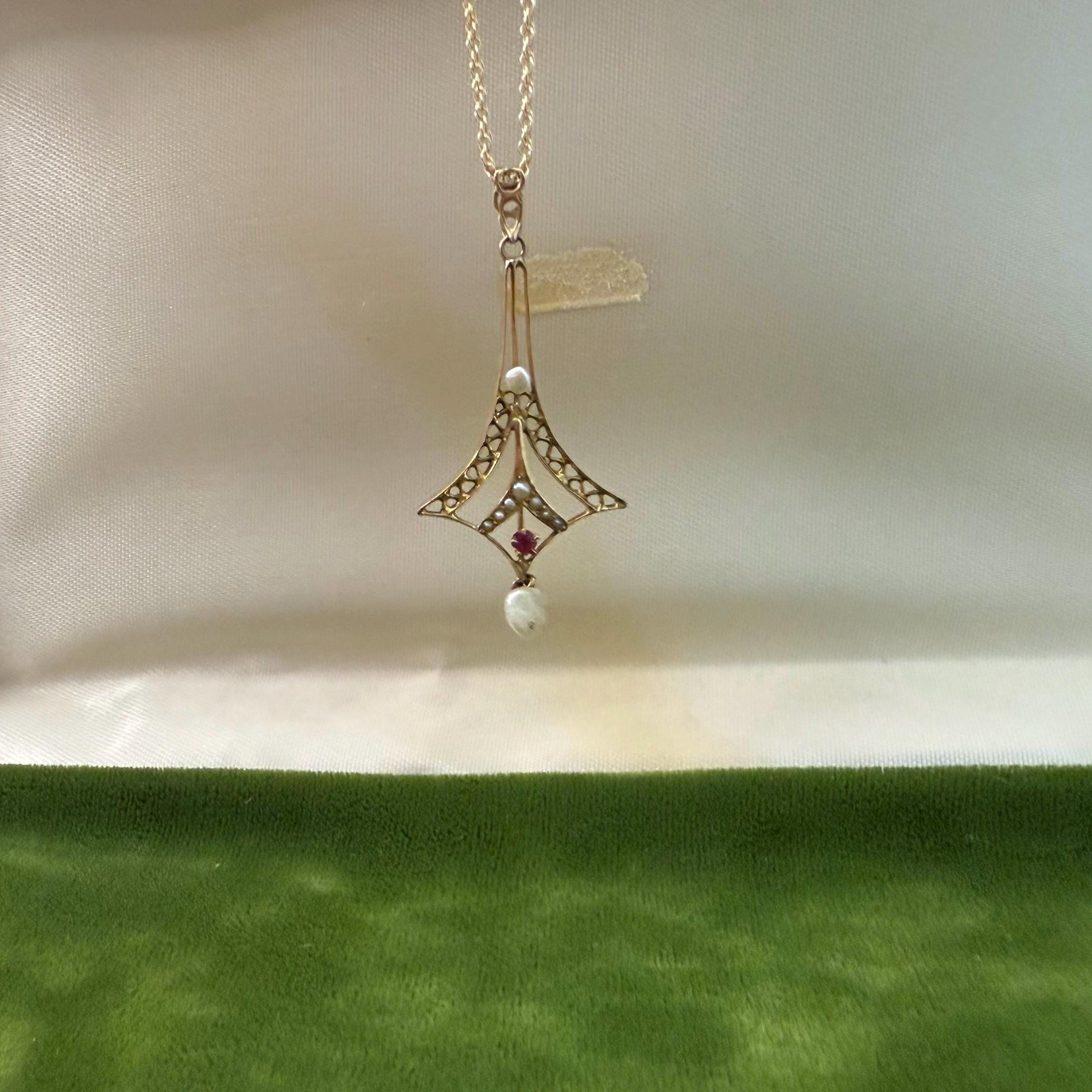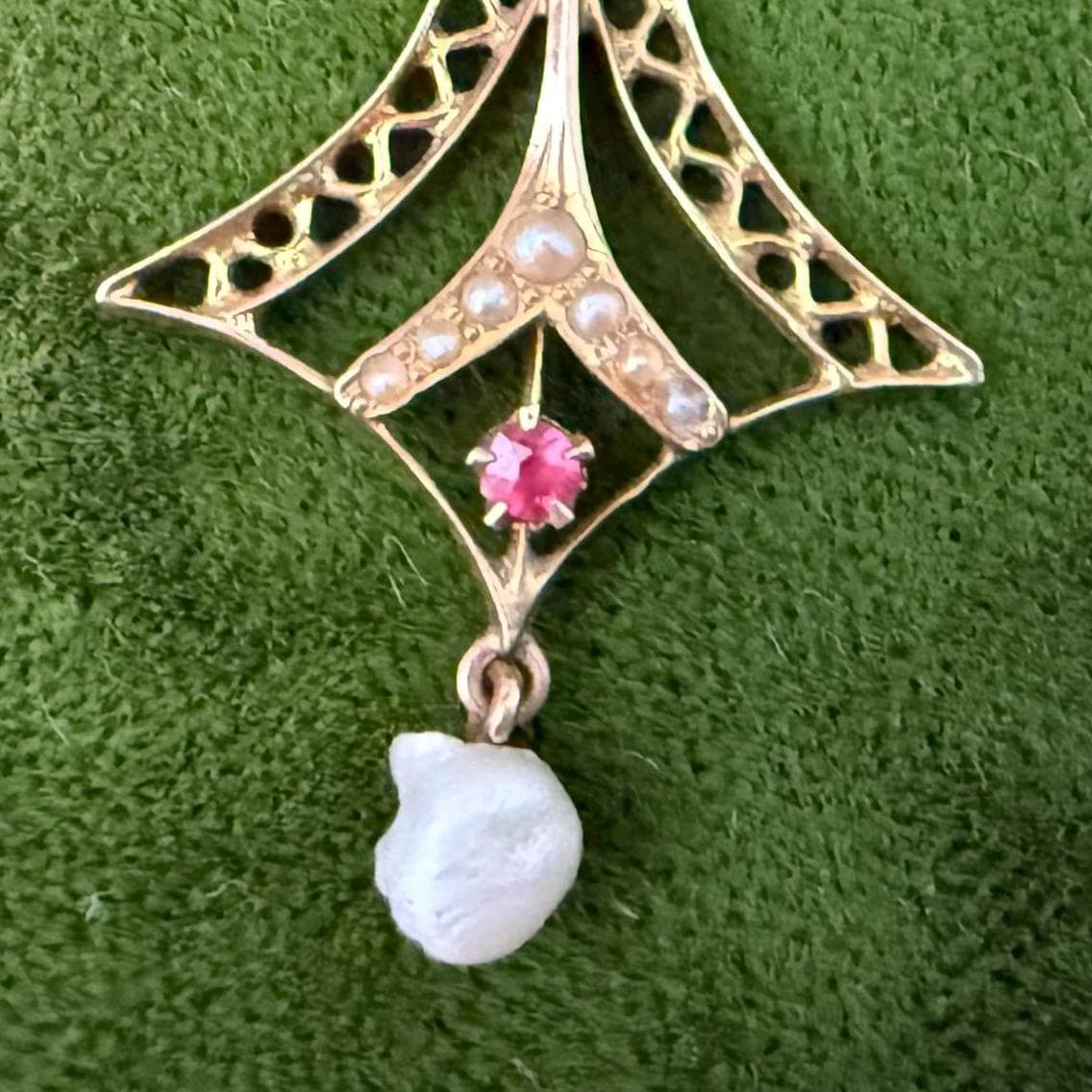 This feminine pendant features a round faceted dark pink gemstone prong sett in its center. There is a V shaped piece above the stone that is set with 7 small seed pearls. There is also a pearl set above it and one dangling baroque pearl at the bottom. The lovely design surrounded by an intricate openwork frame. This Edwardian Era piece is very fine and lightweight - very feminine.