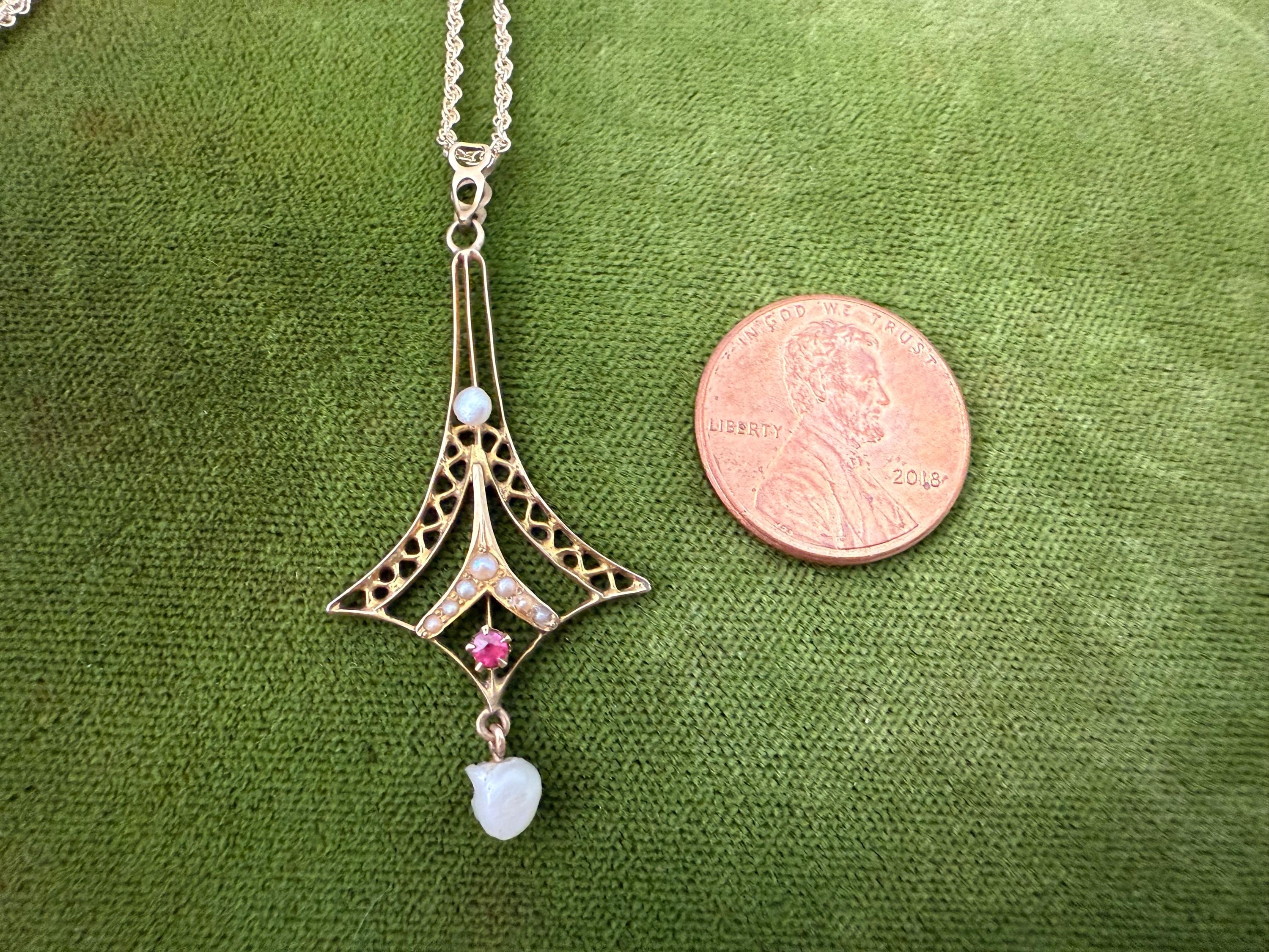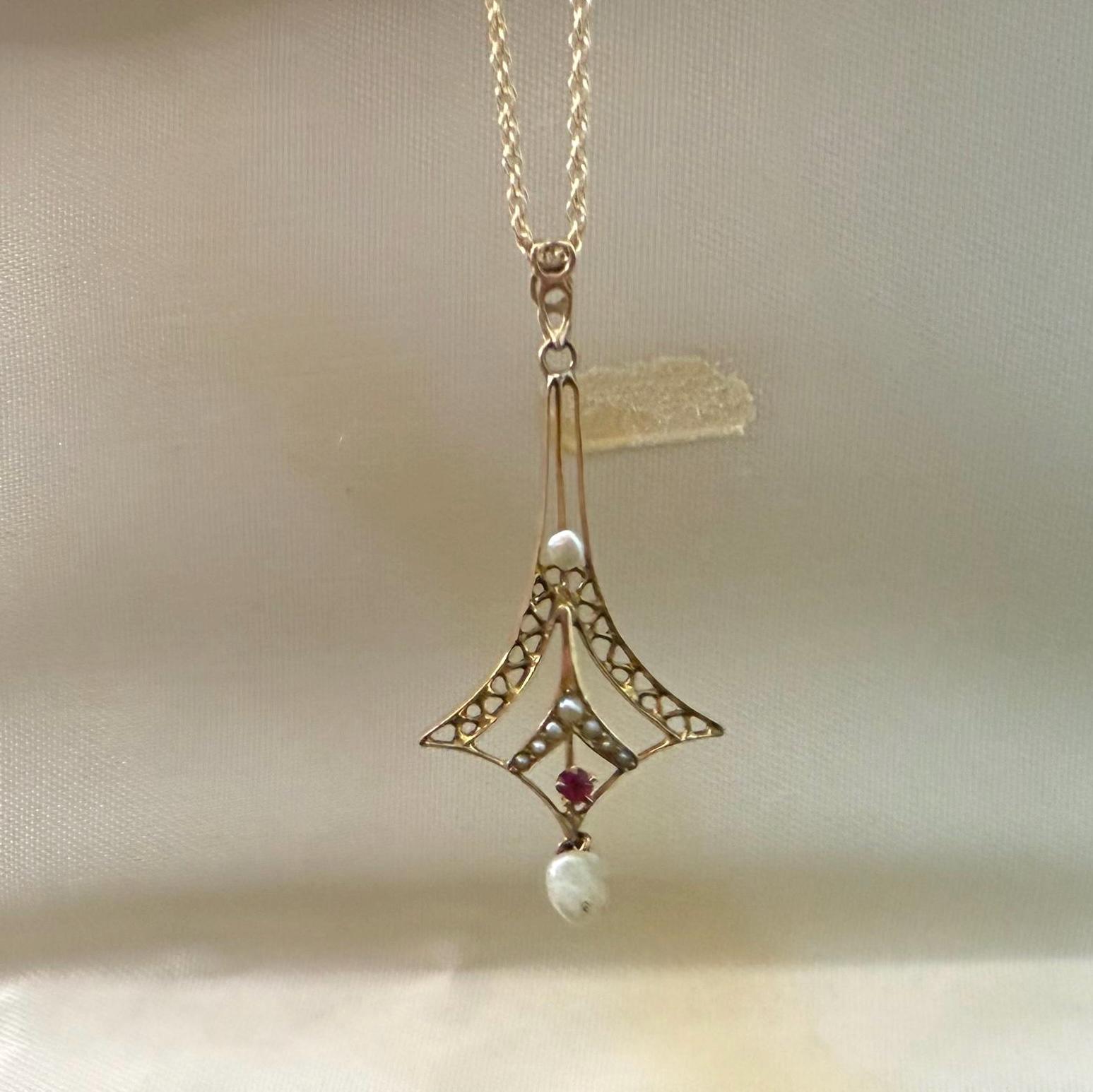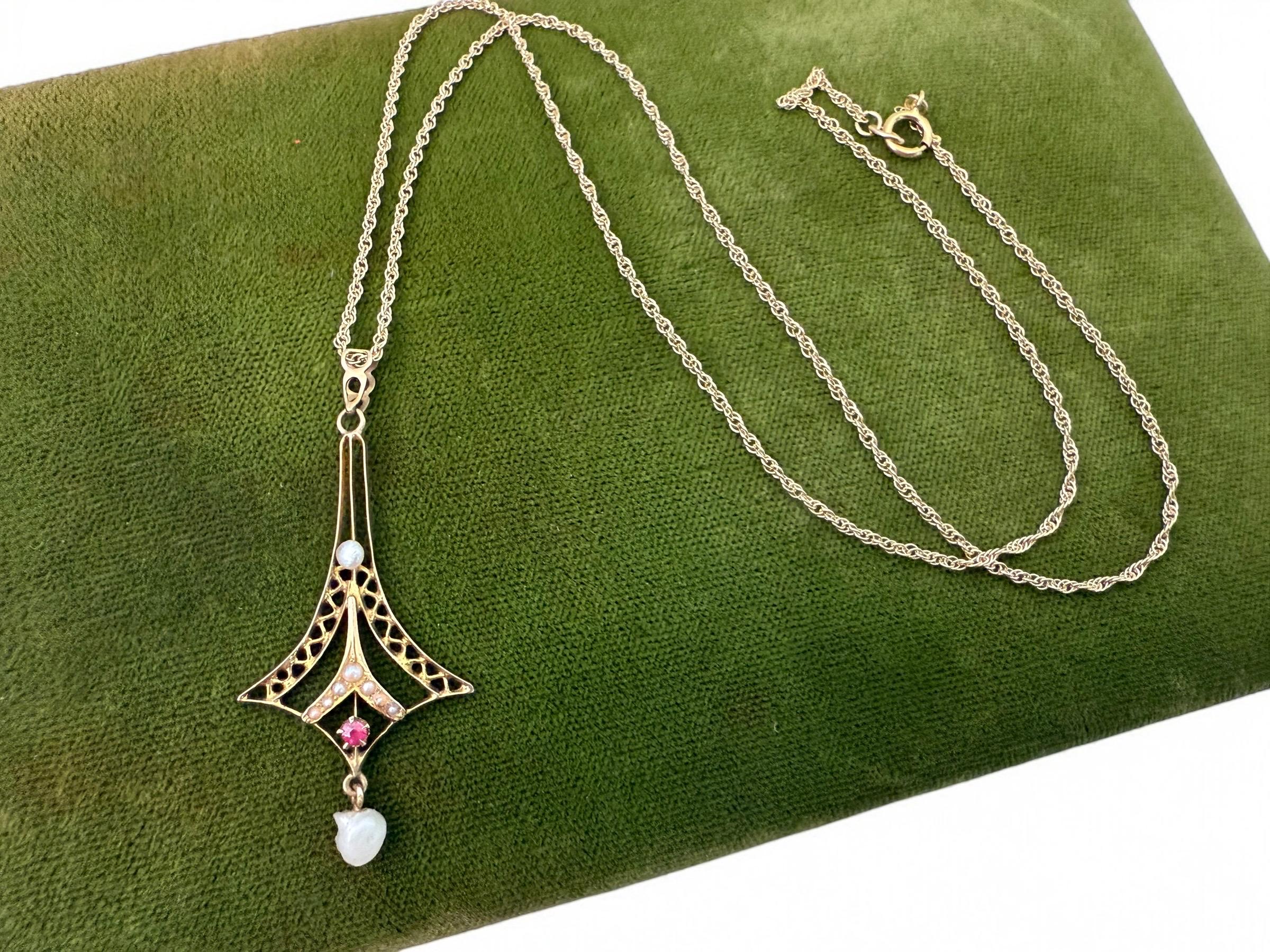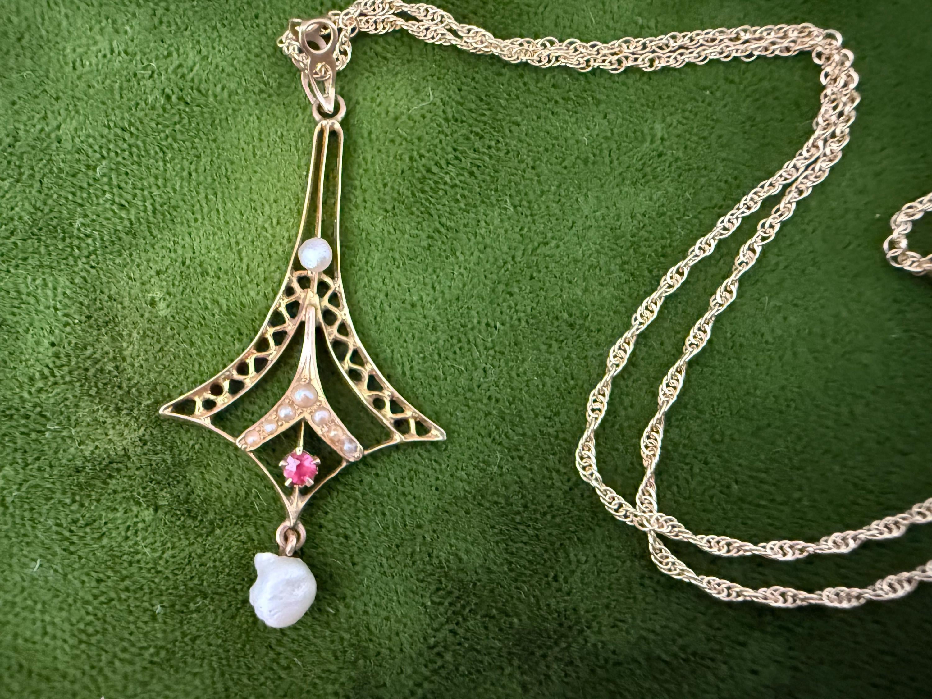 Edwardian 10K Gold Pink Gemstone Lavaliere Pendant - Pearl Drop, 14K Gold Filled Chain