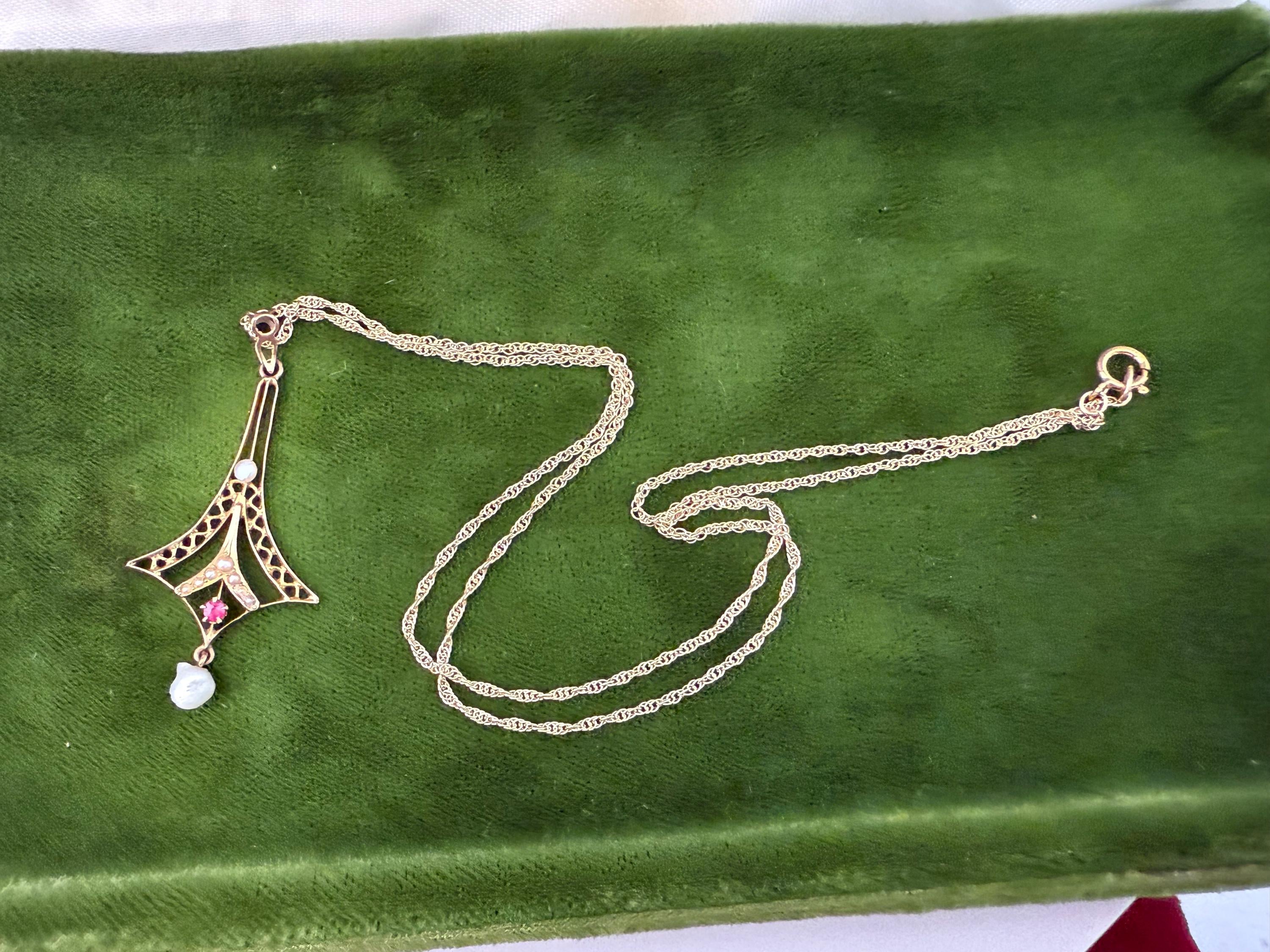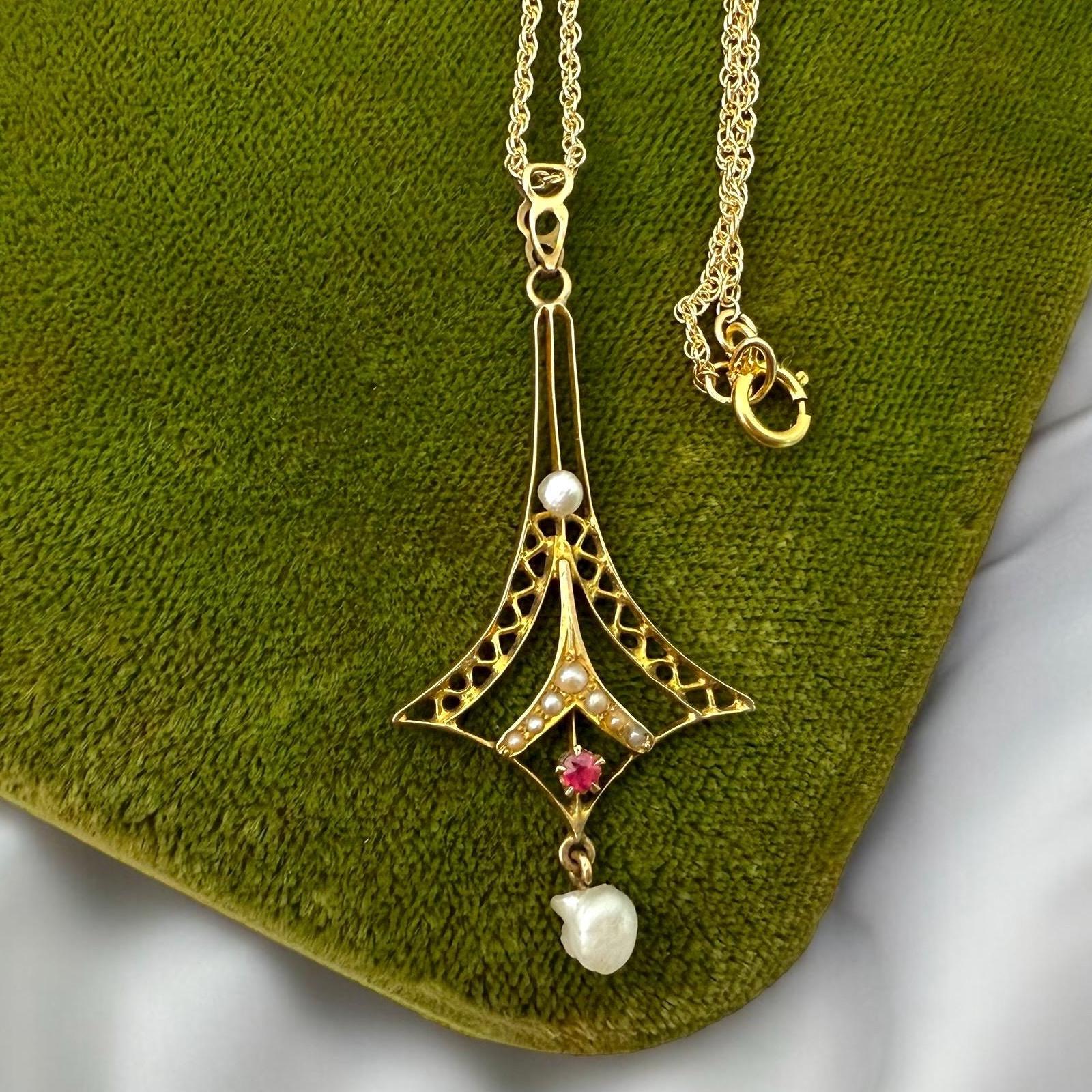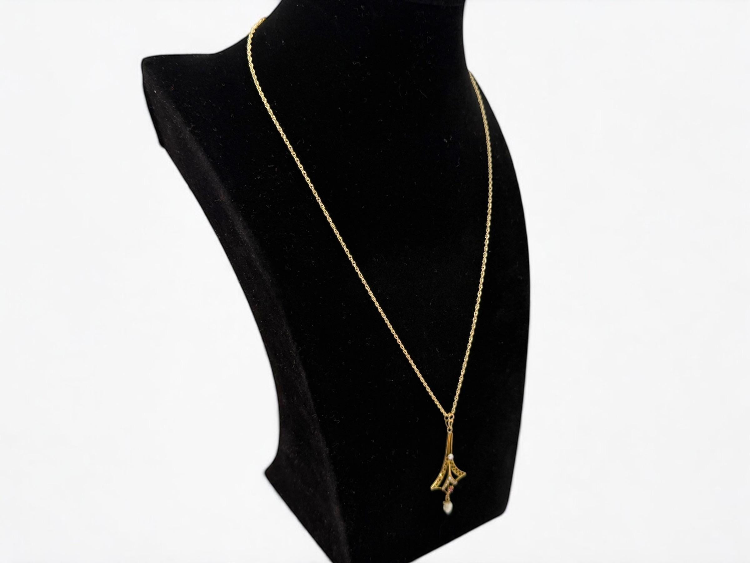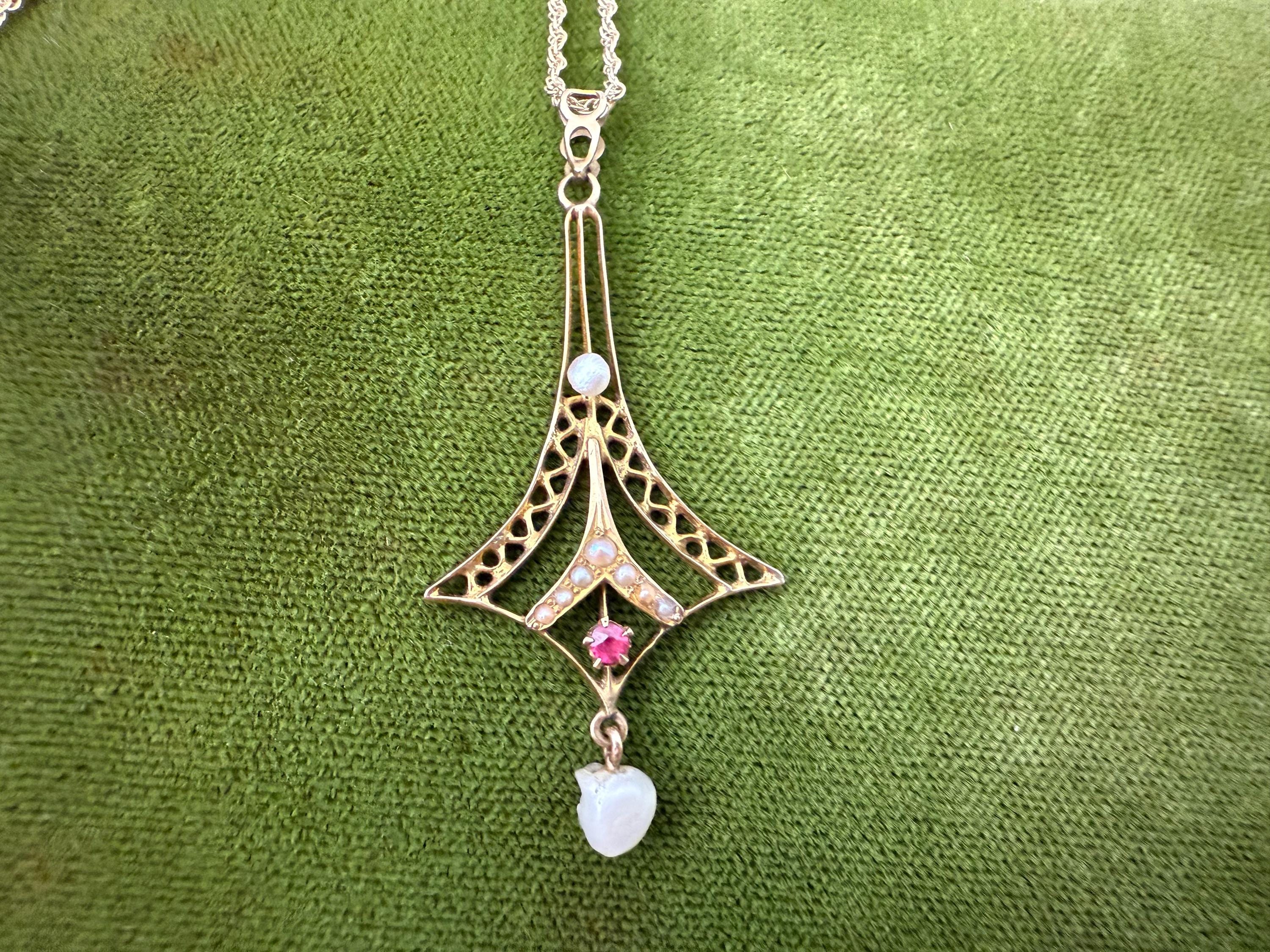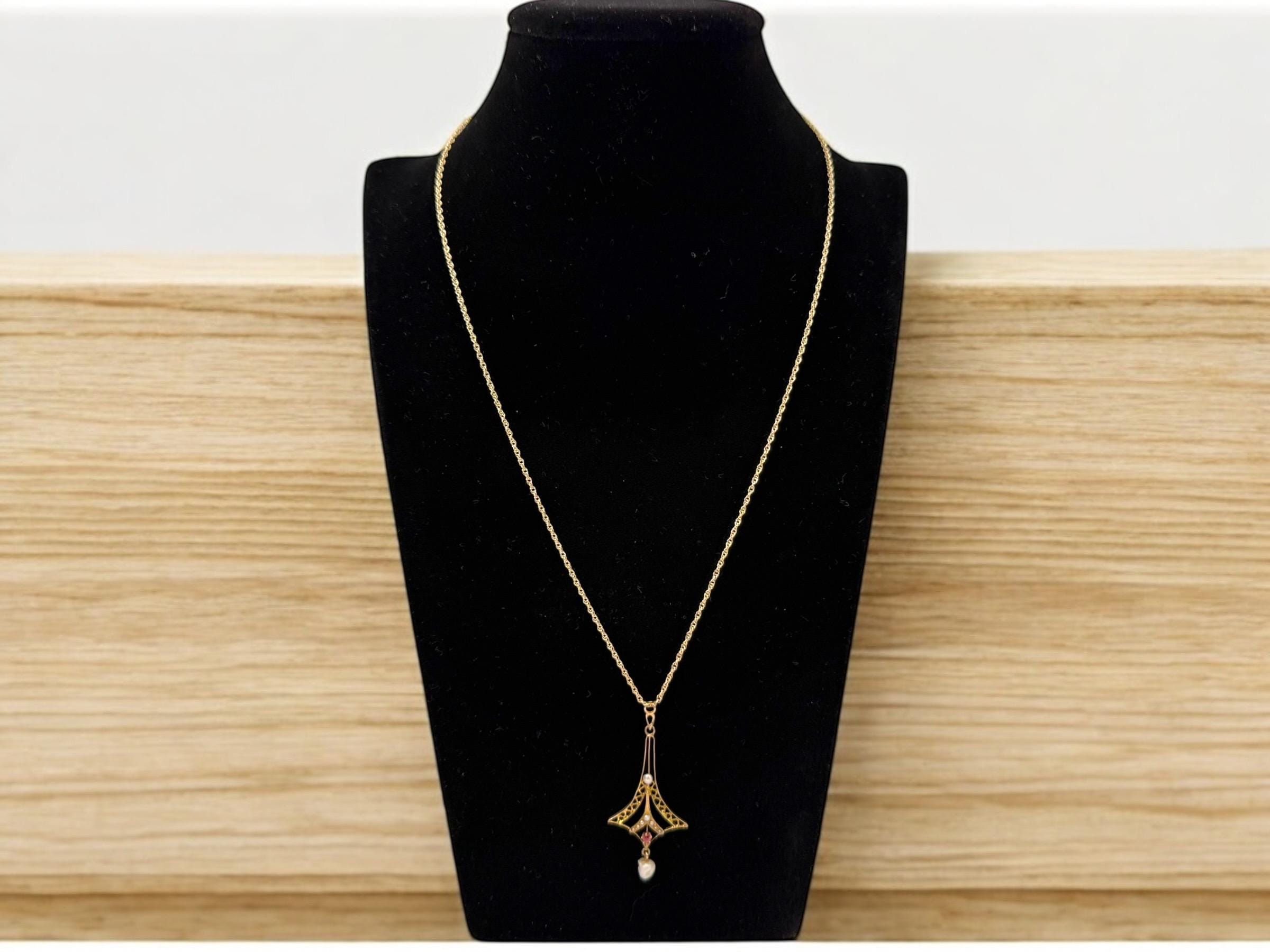 Edwardian 10K Gold Pink Gemstone Lavaliere Pendant - Pearl Drop, 14K Gold Filled Chain