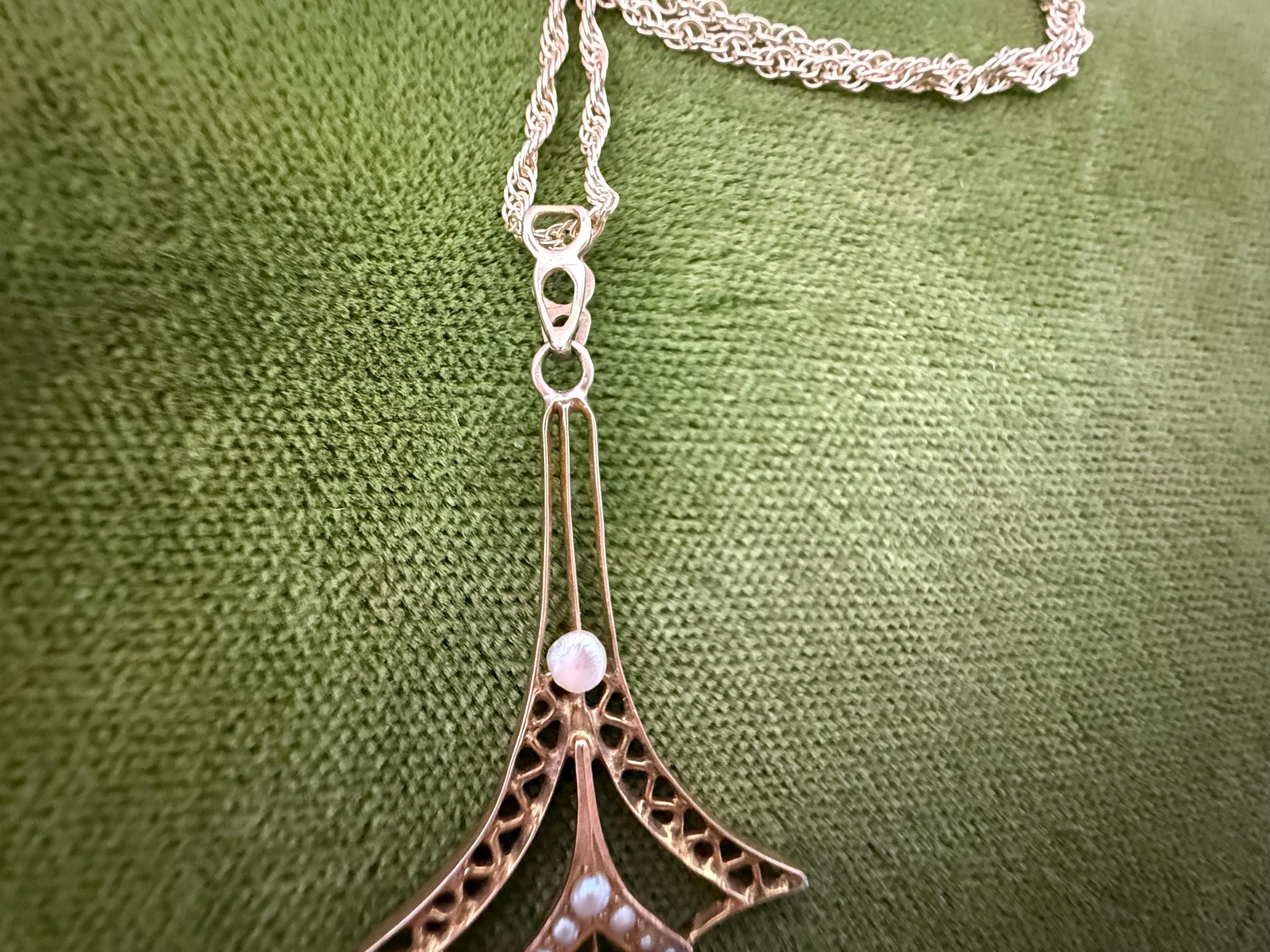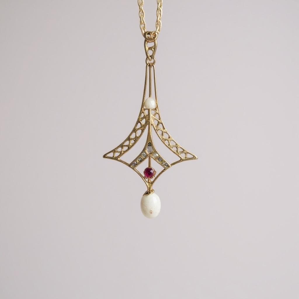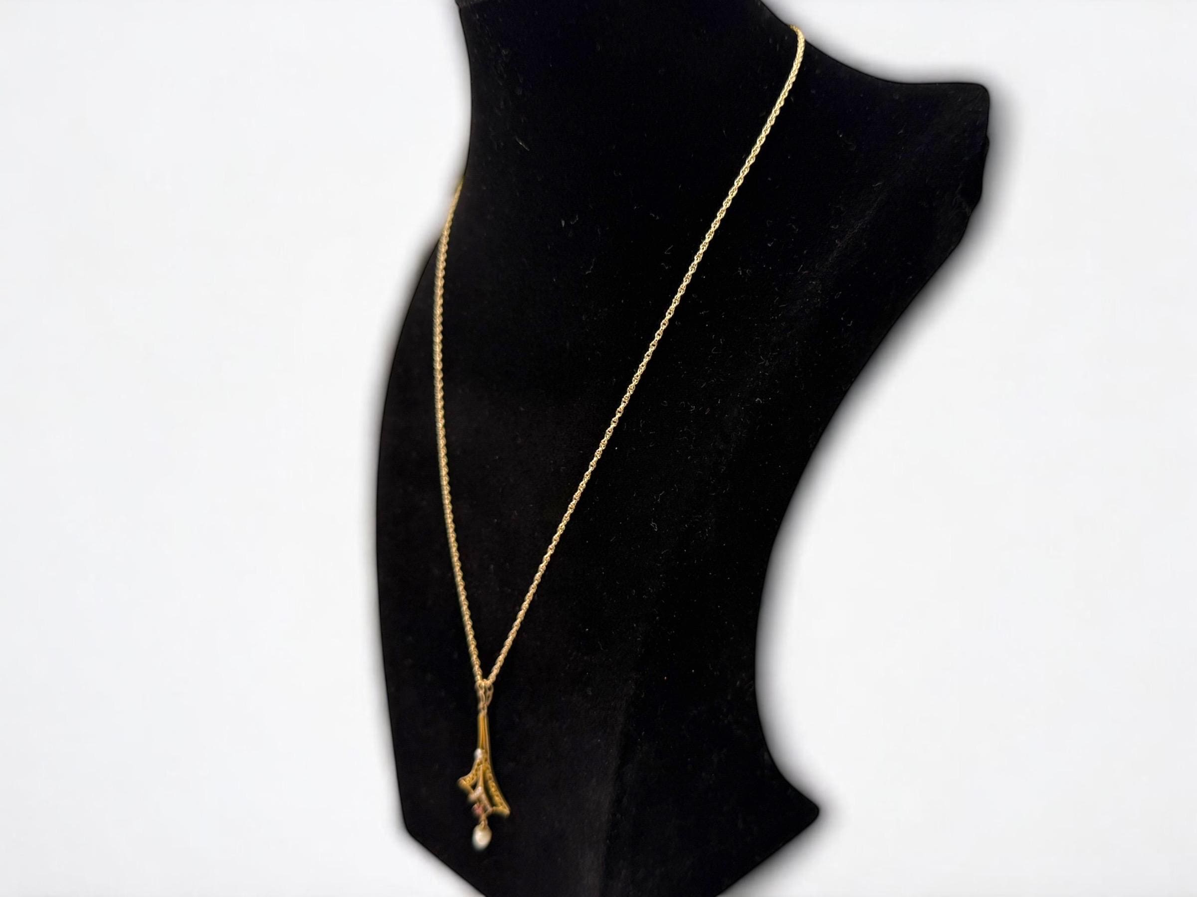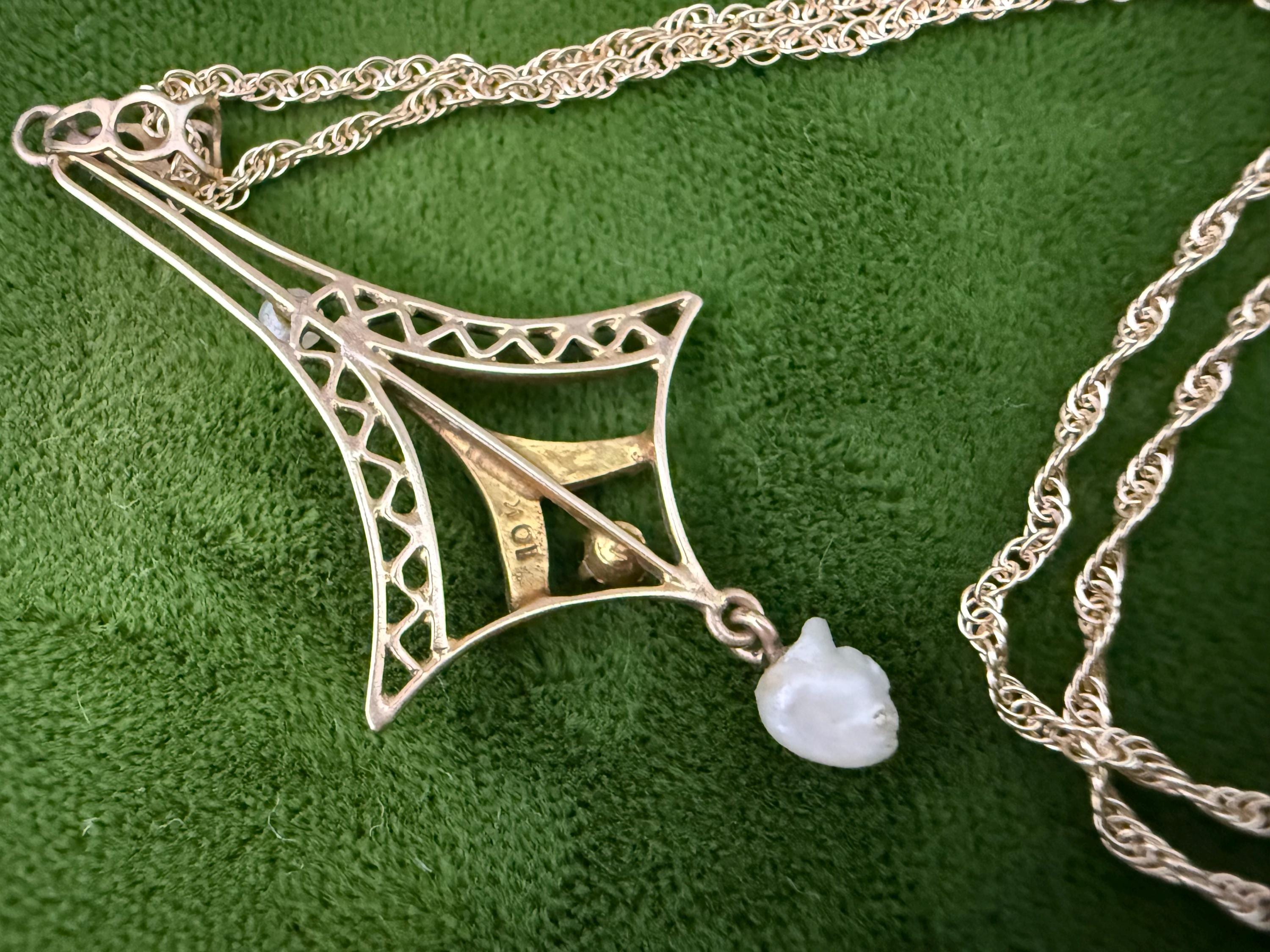 Edwardian 10K Gold Pink Gemstone Lavaliere Pendant - Pearl Drop, 14K Gold Filled Chain
