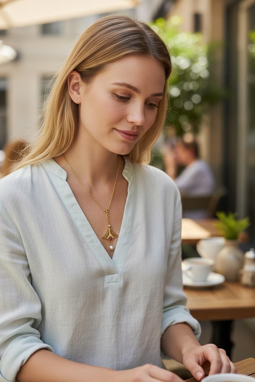 The open bale is a wonderful complement to the openwork and lightweight gemstone and pearl lavaliere pendant.
