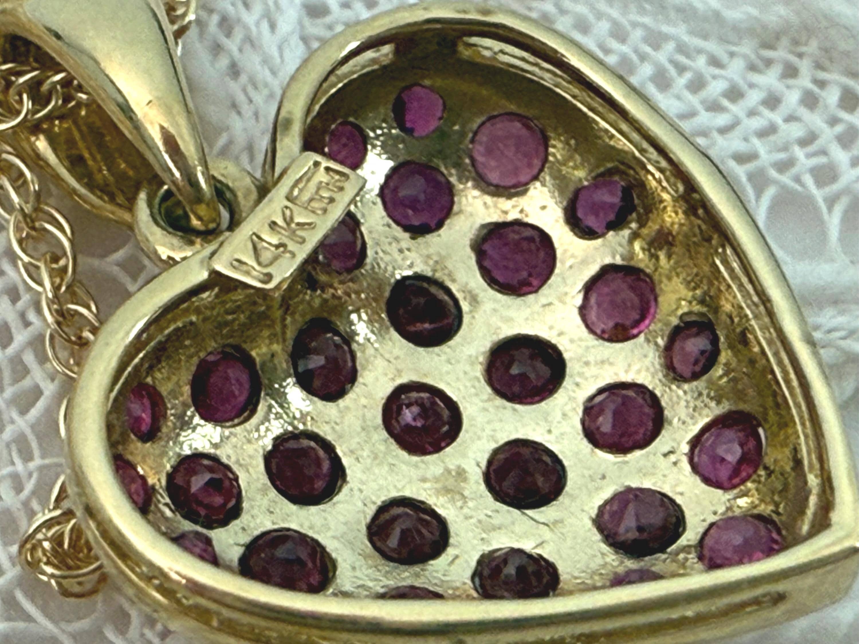 This feminine pendant features 31 round faceted dark pink/red spinel gemstones set all over the front. The background on the pendant’s front is textured. This circa 1990s piece is hallmarked on the back.