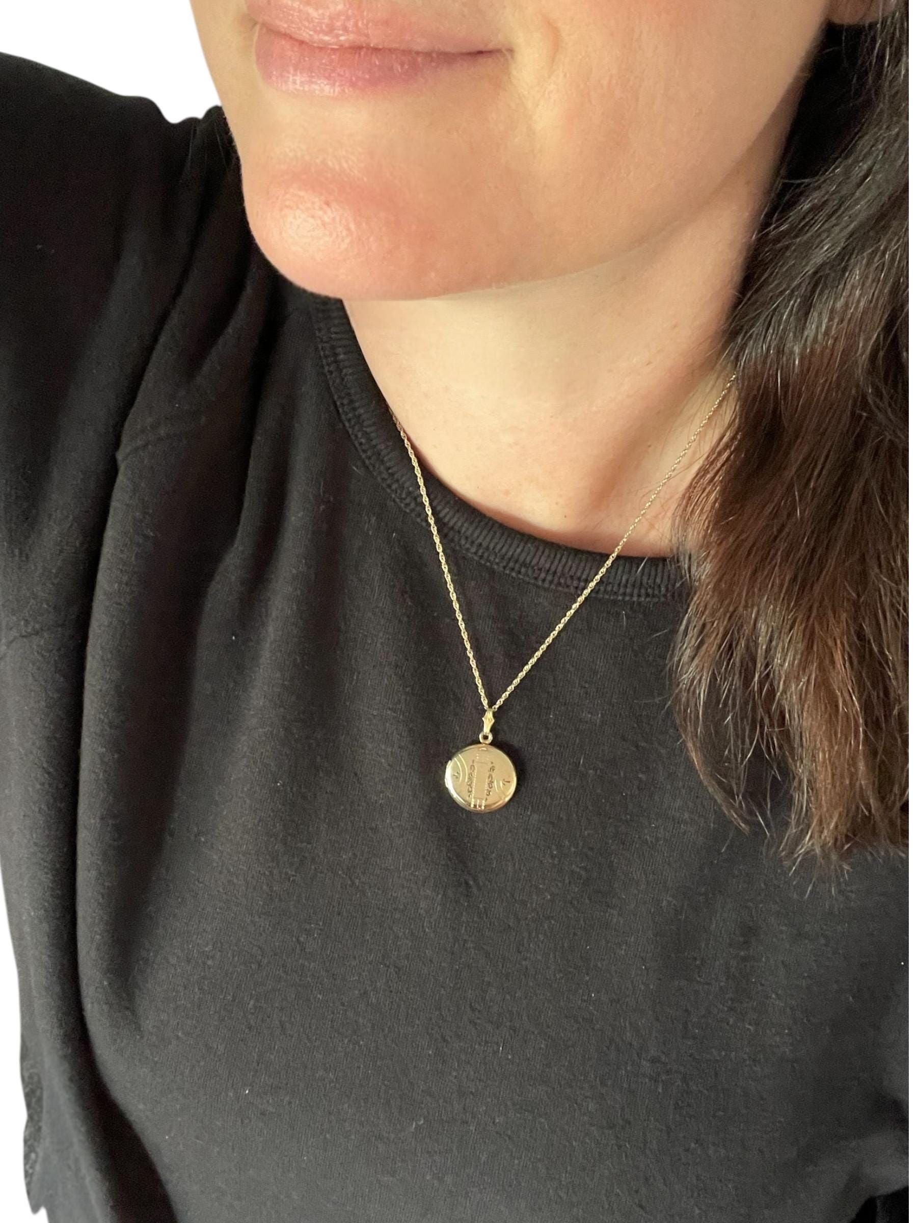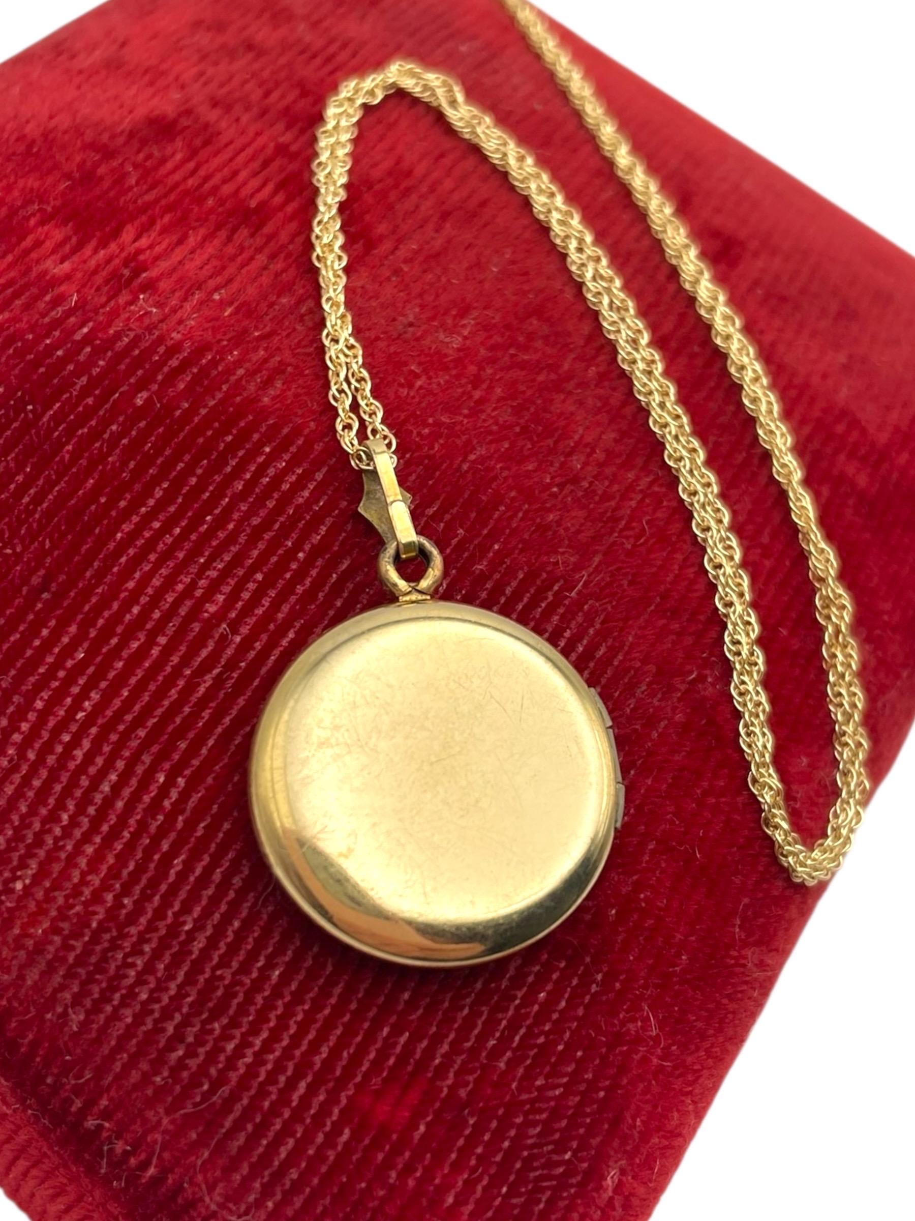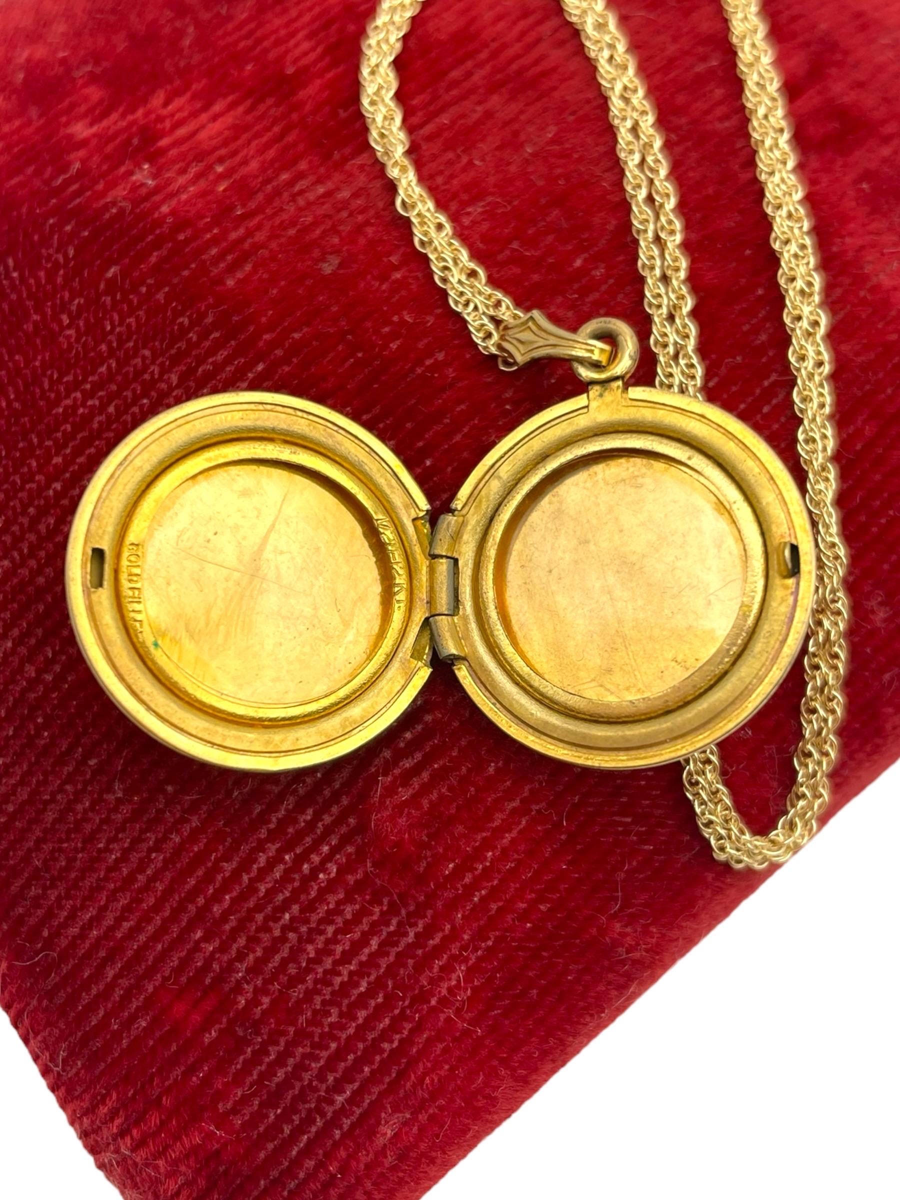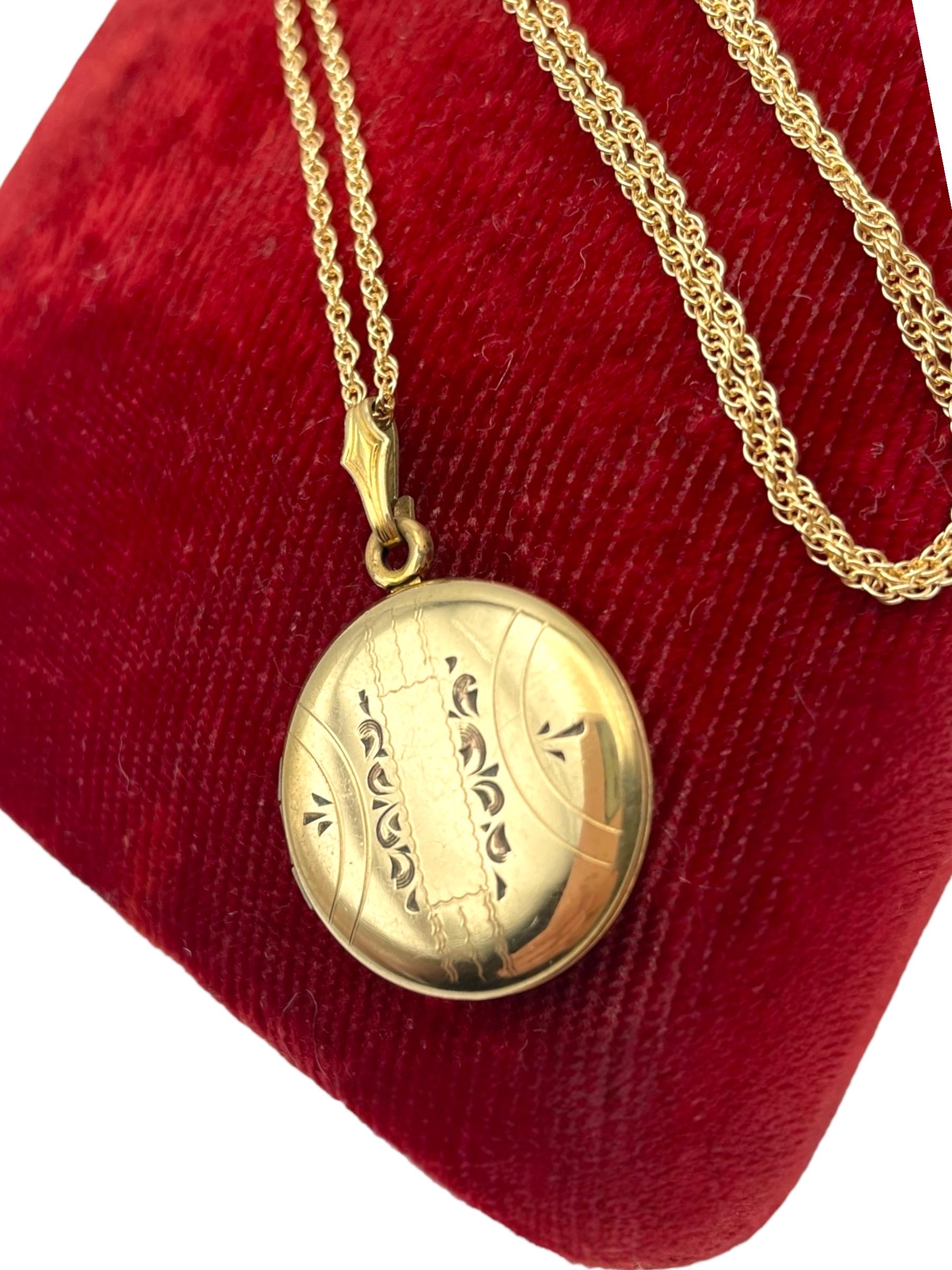 The locket hangs on a new 18” long 14K gold filled rope chain which secures with a spring clasp. Locket can be purchased with or without the chain.