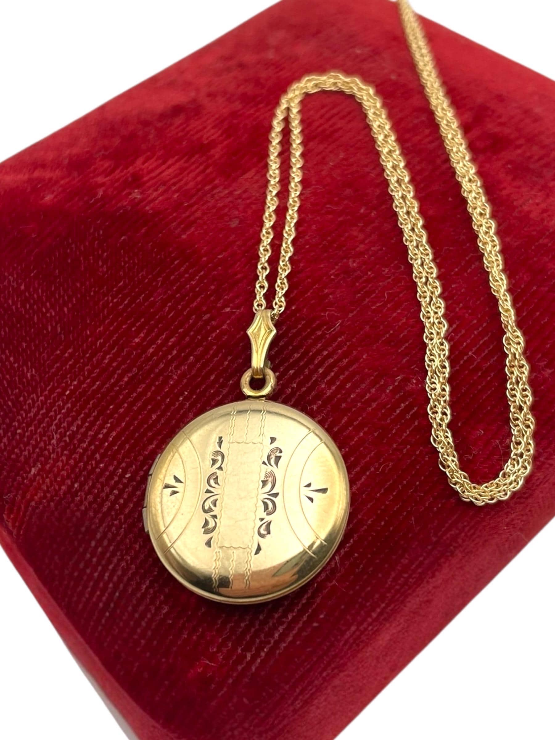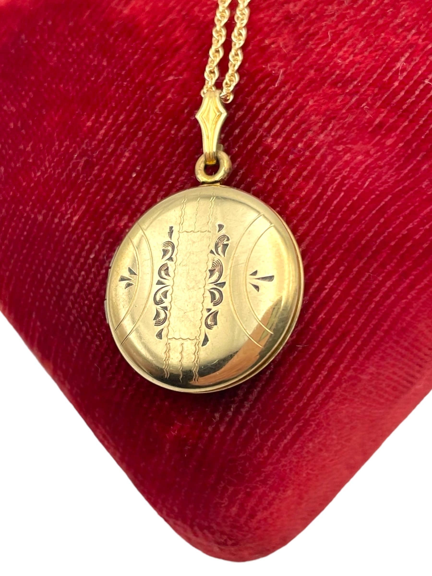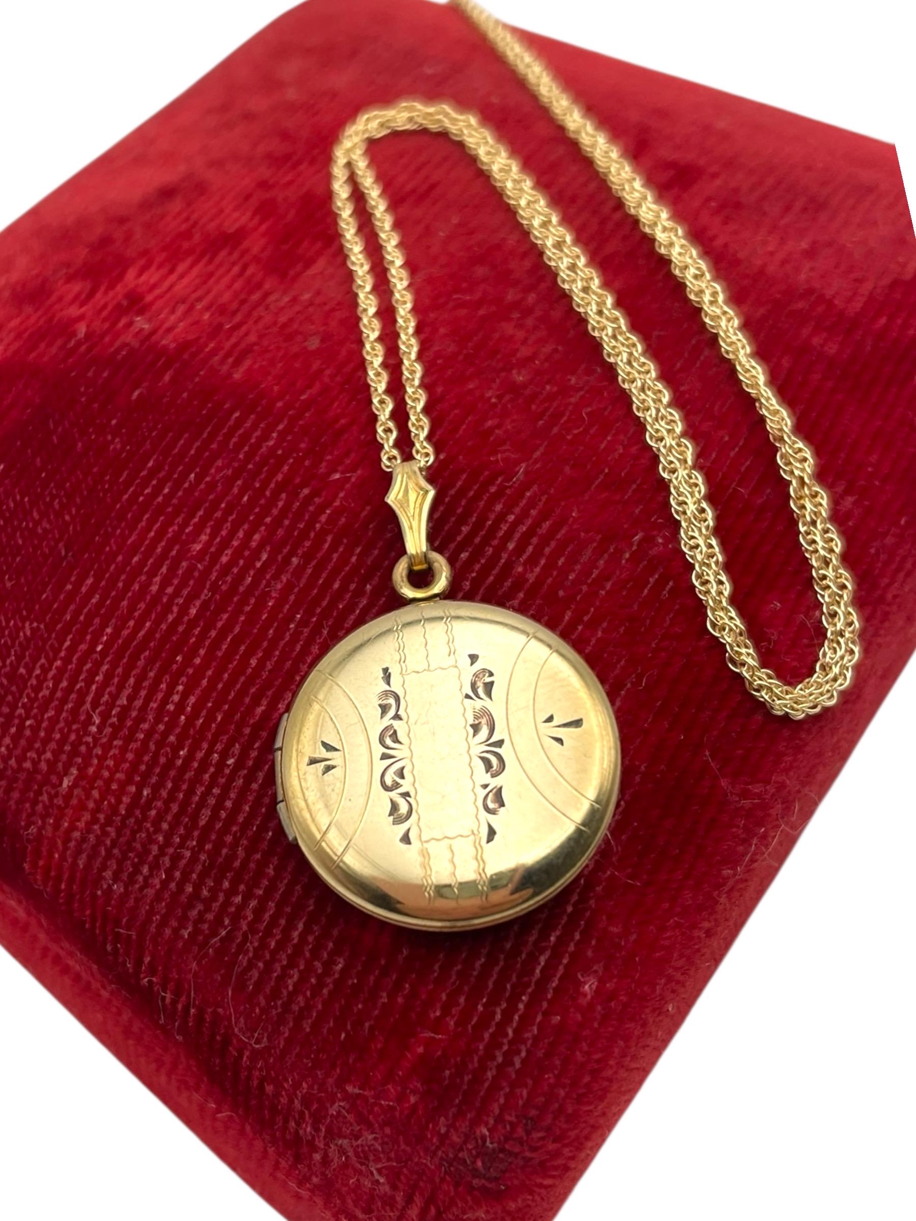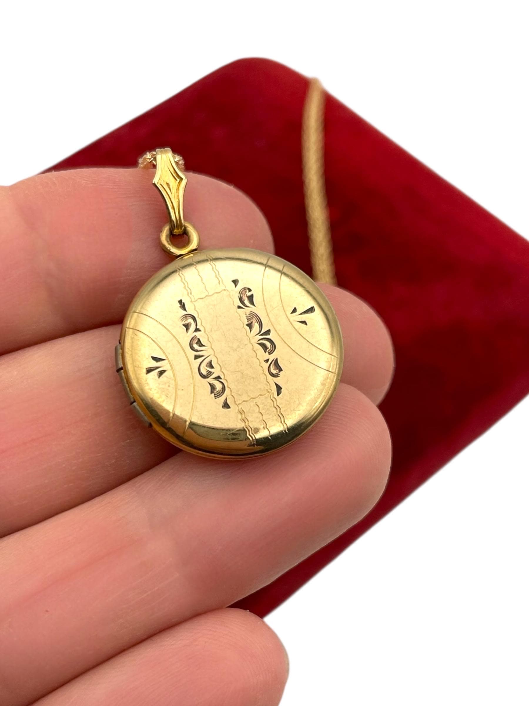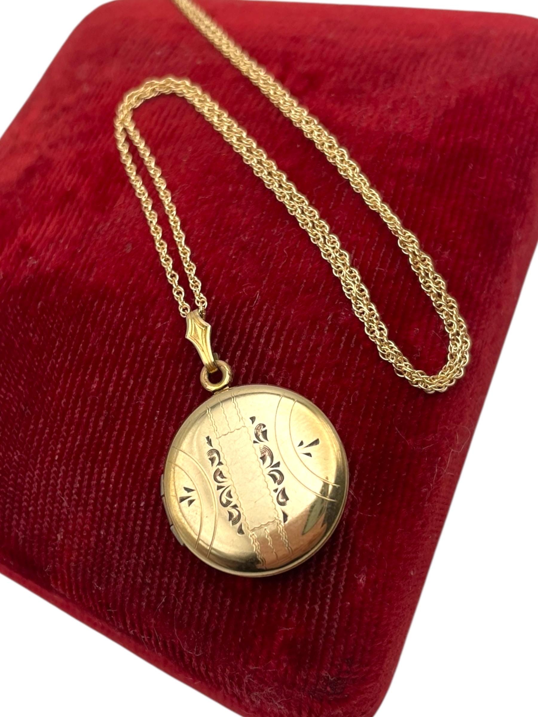 Vintage Floral Etched Locket: 12K Gold Filled Round Pendant Necklace, 14K GF Chain