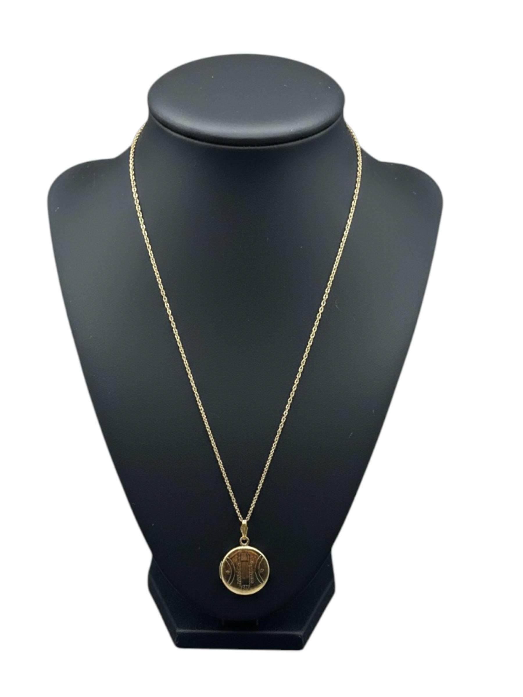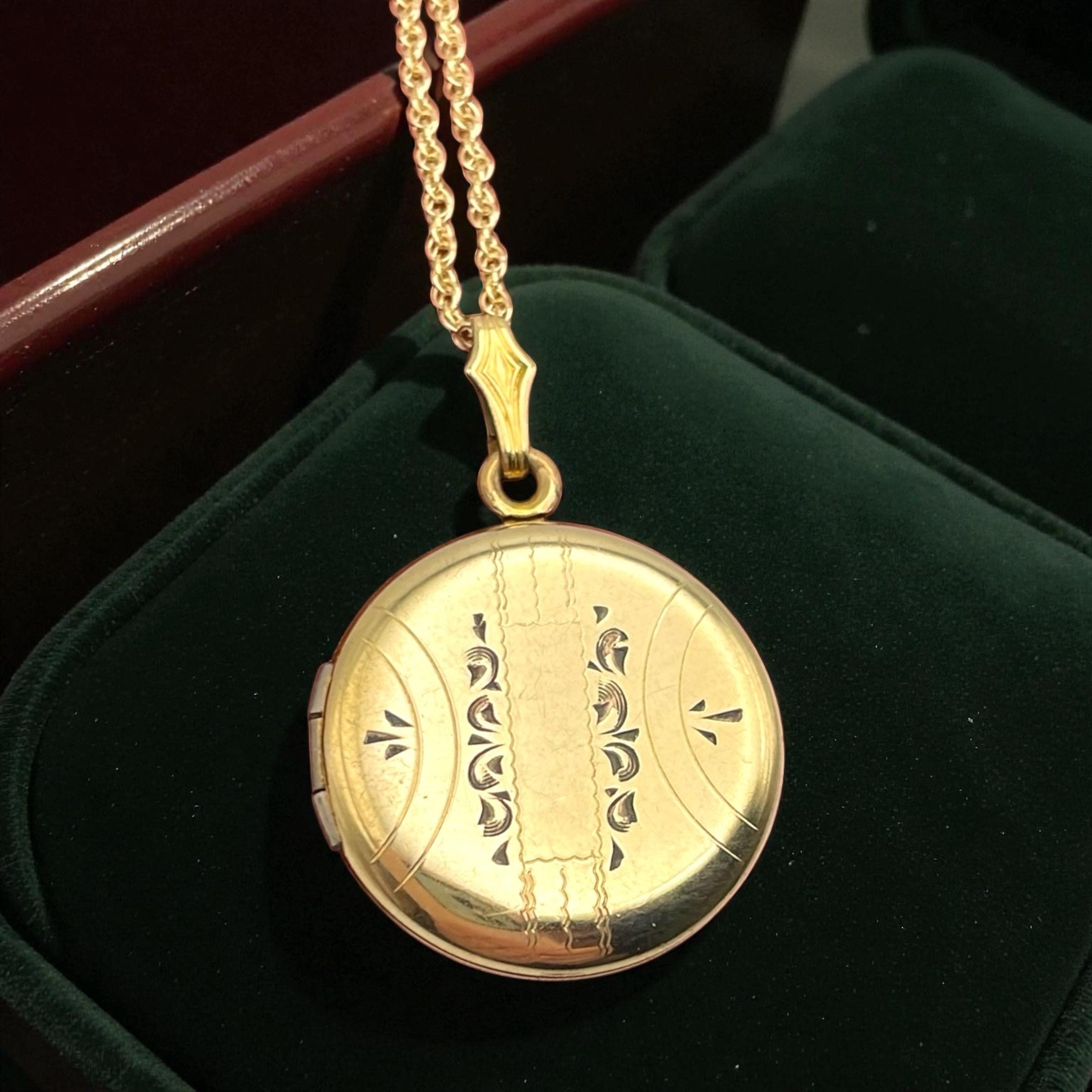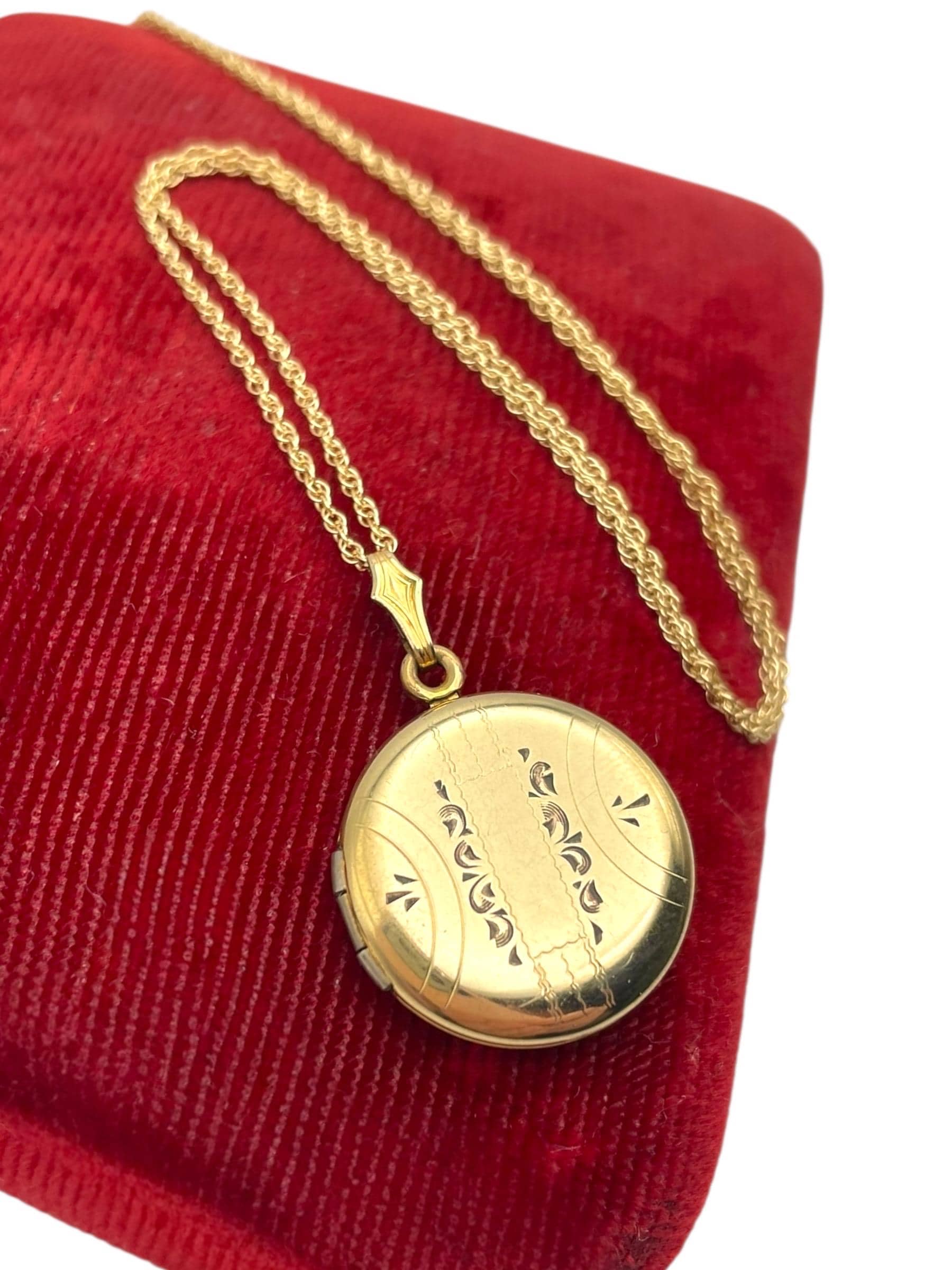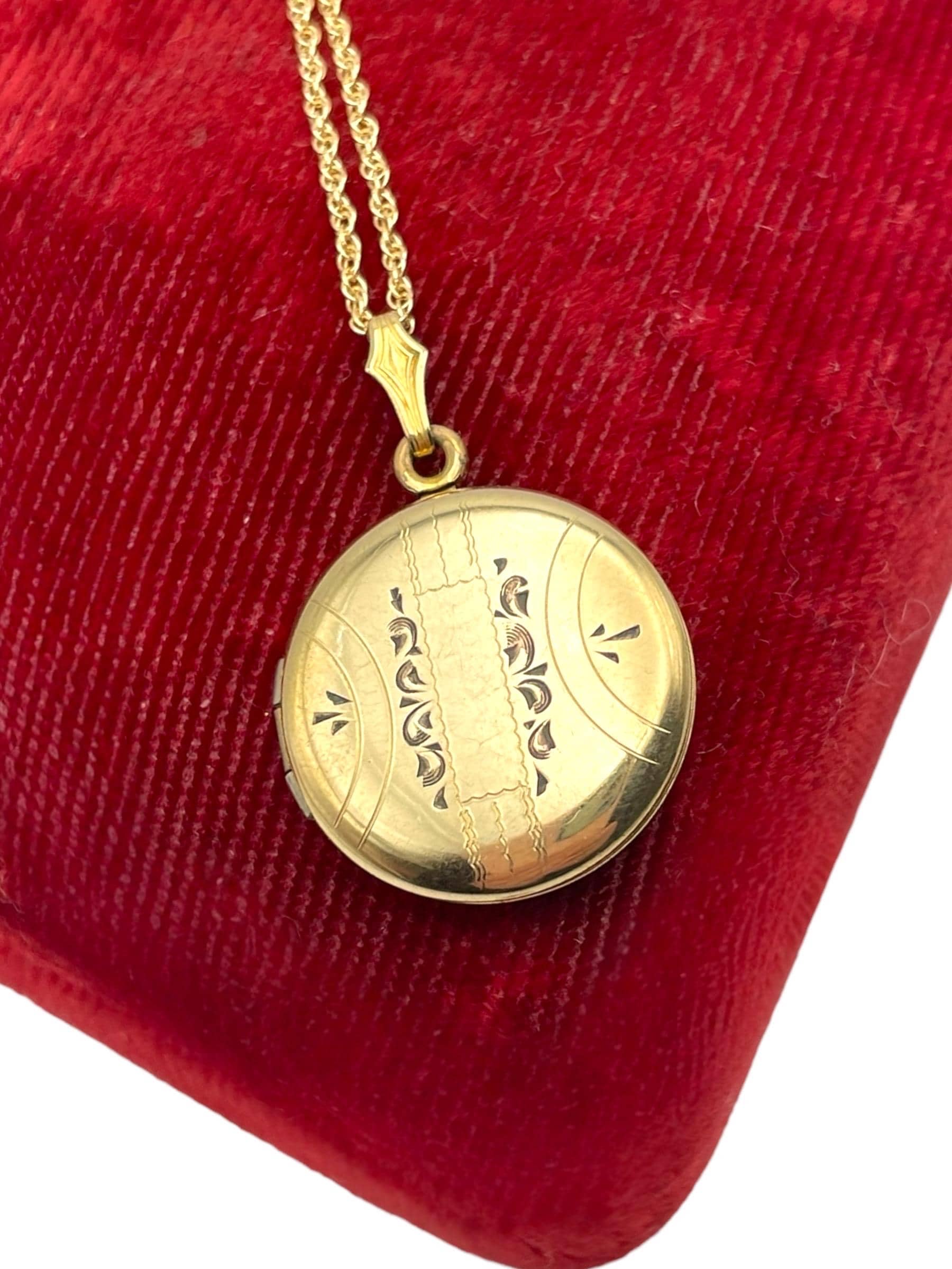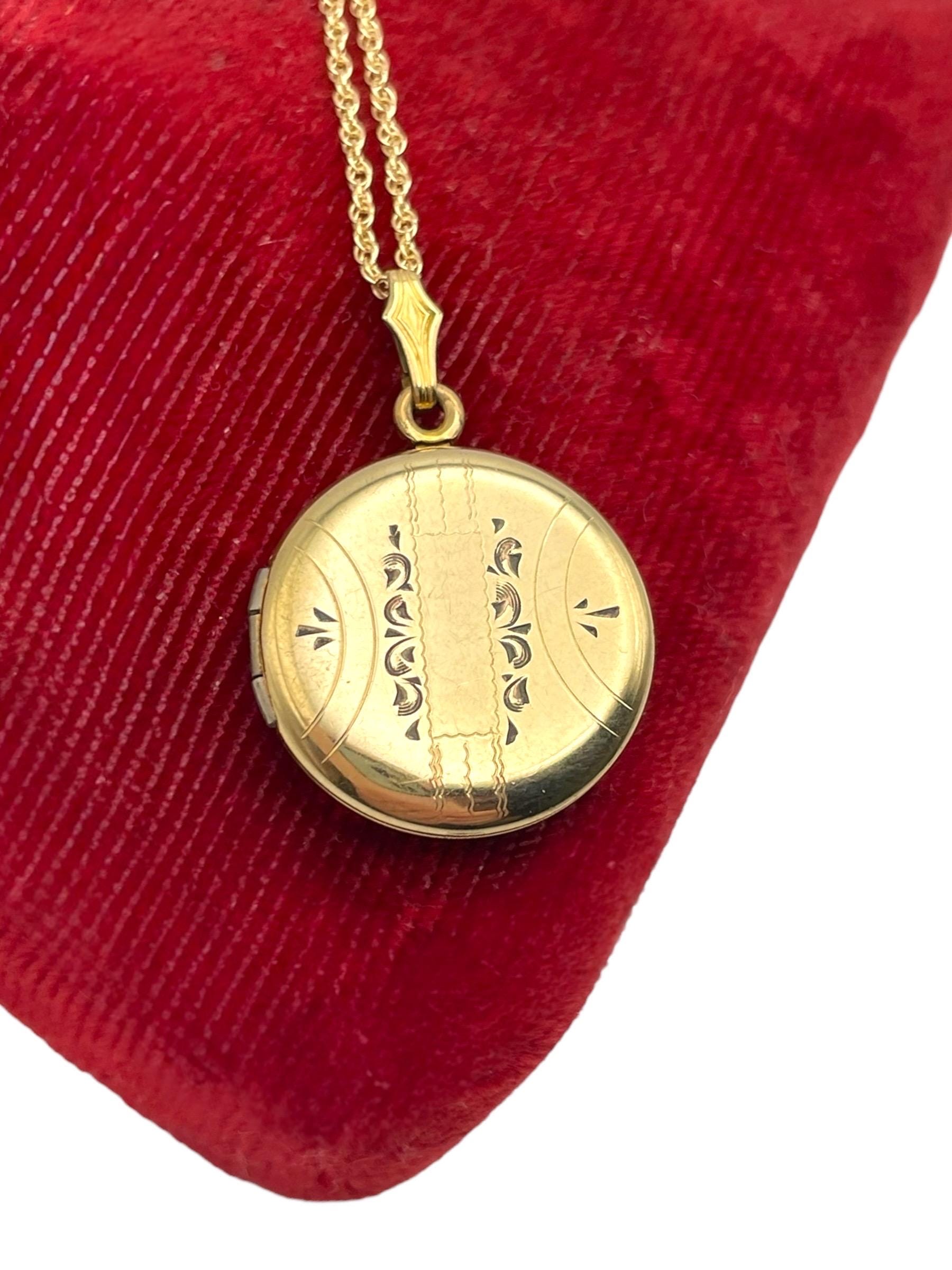 Vintage Floral Etched Locket: 12K Gold Filled Round Pendant Necklace, 14K GF Chain