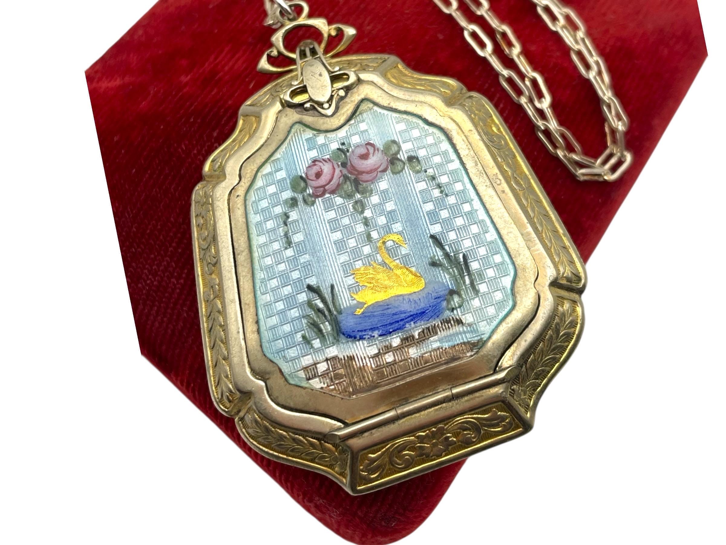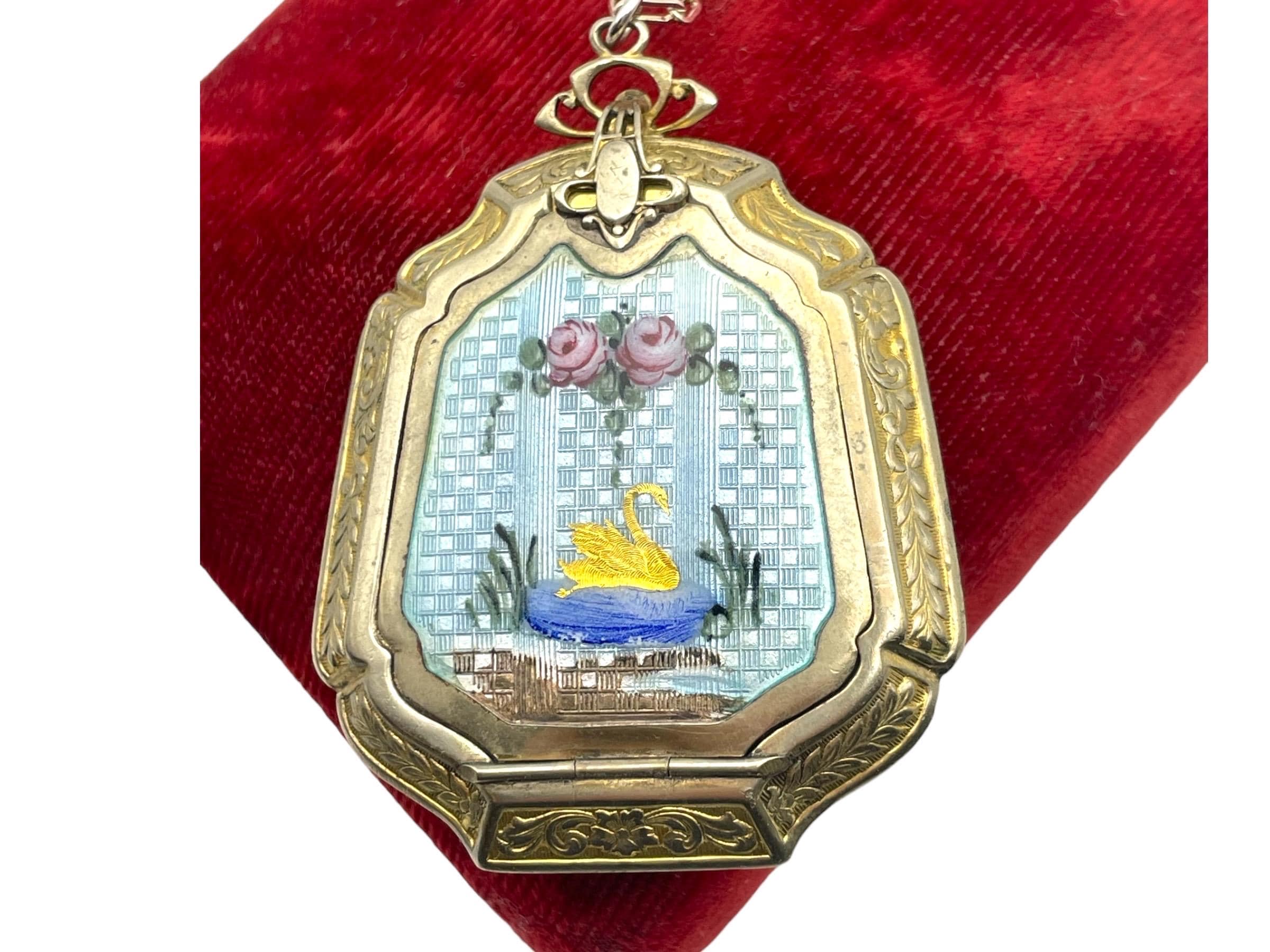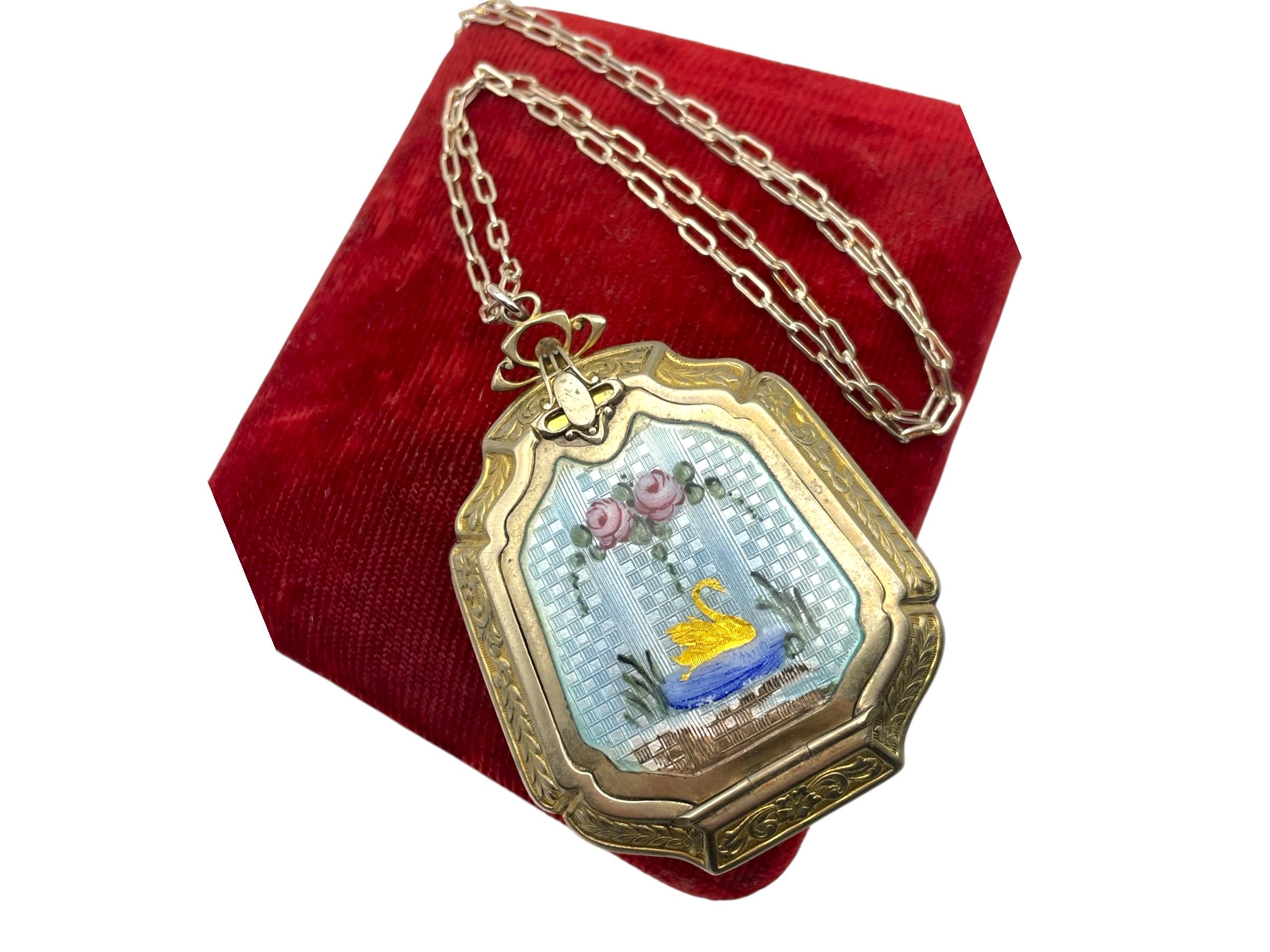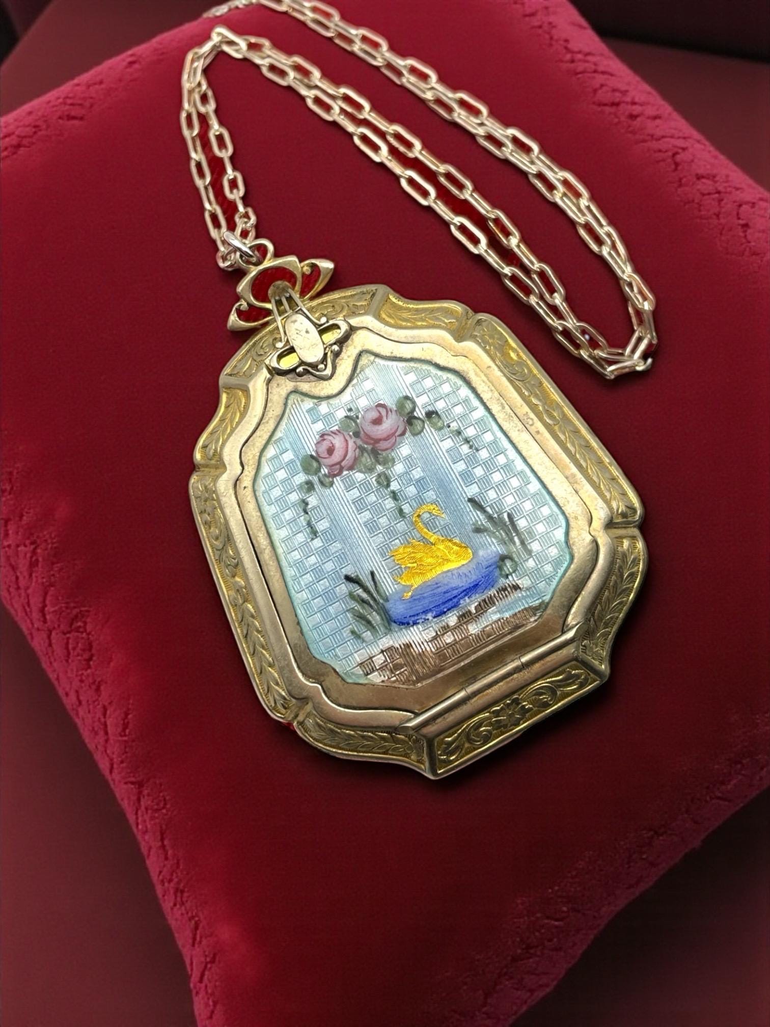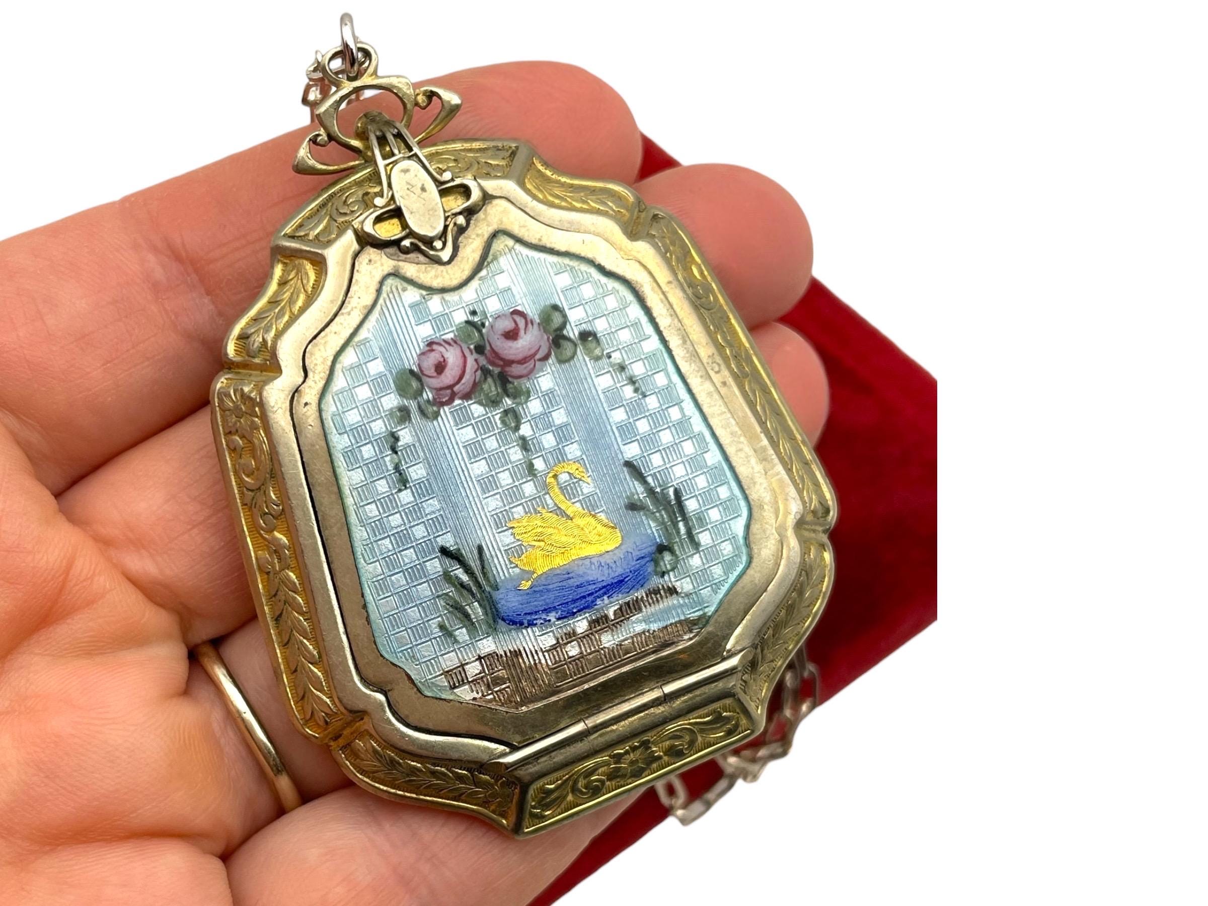 Beautiful (and very LARGE!) antique silver tone compact locket. This locket pendant is from the 1930s and made by R&G Co. (see note below). The front features a hand painted guilloche design (some wear to the bottom of the blue design). Blue checkered design, two pink flowers with green leaves along the top and a gold colored swan in water with greenery surrounding.