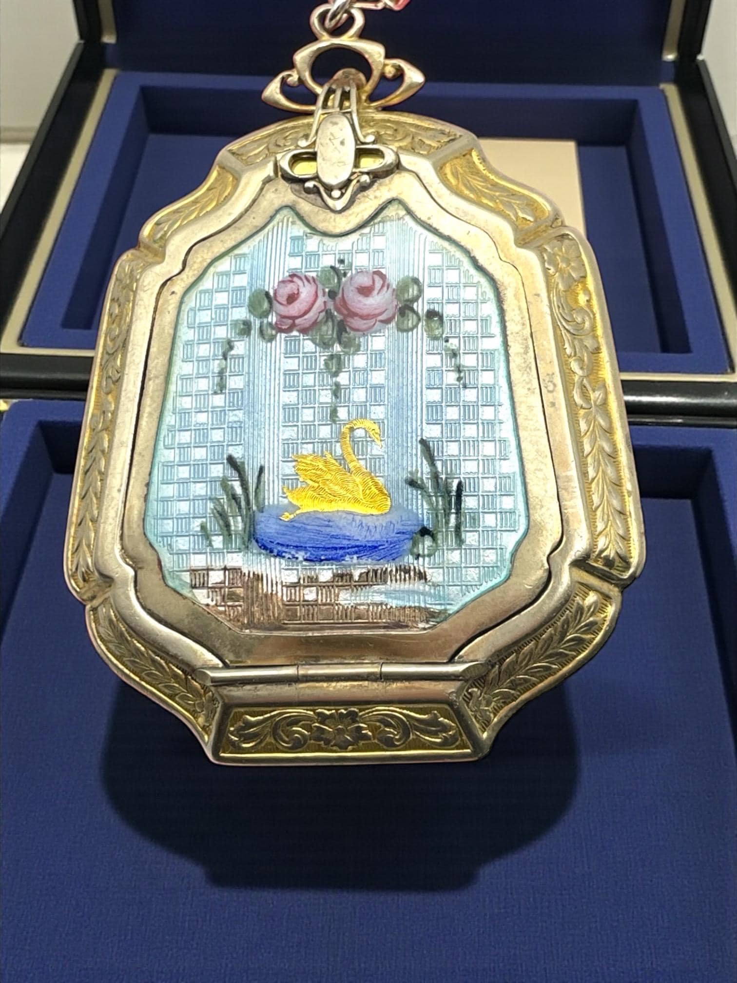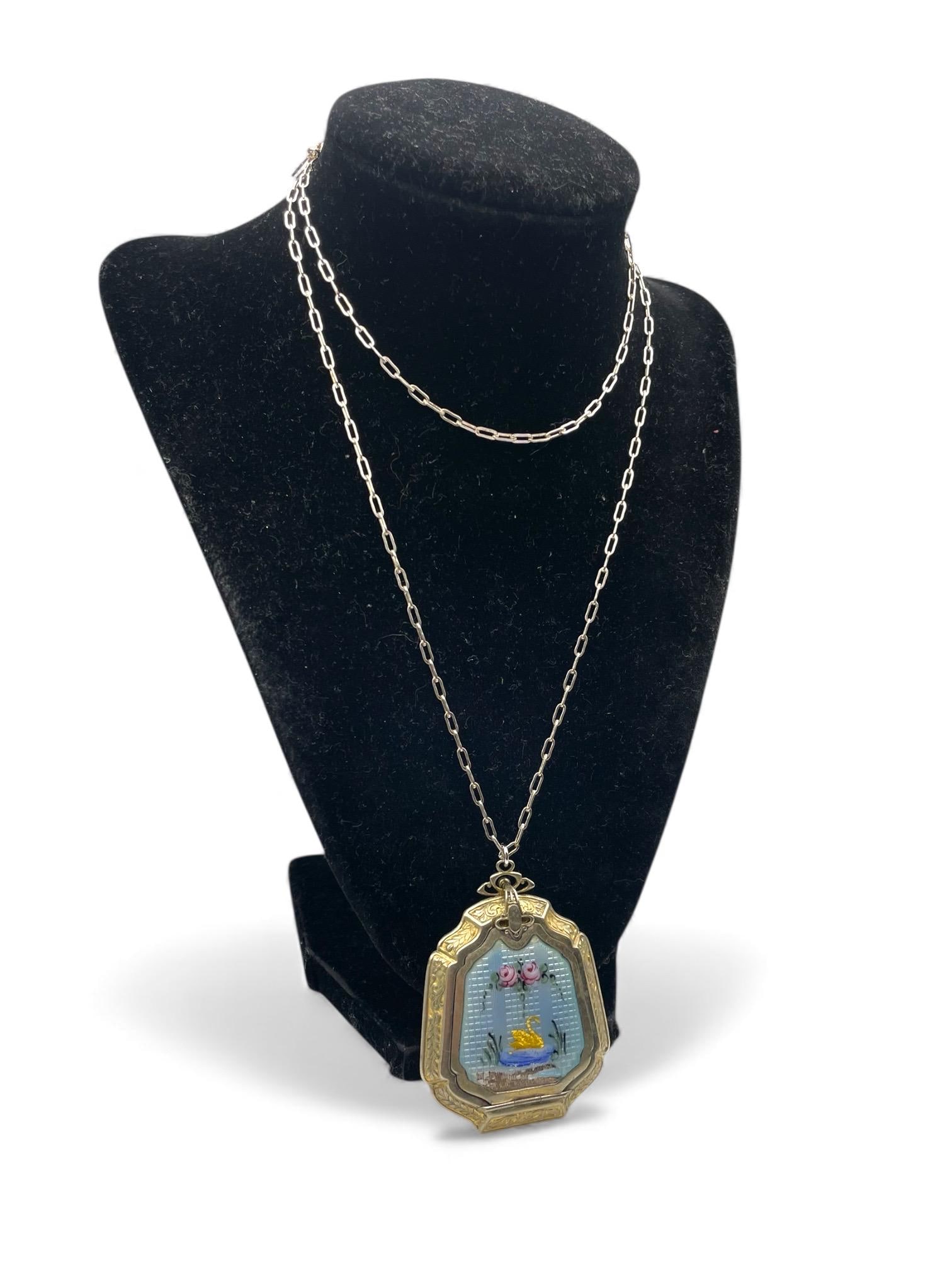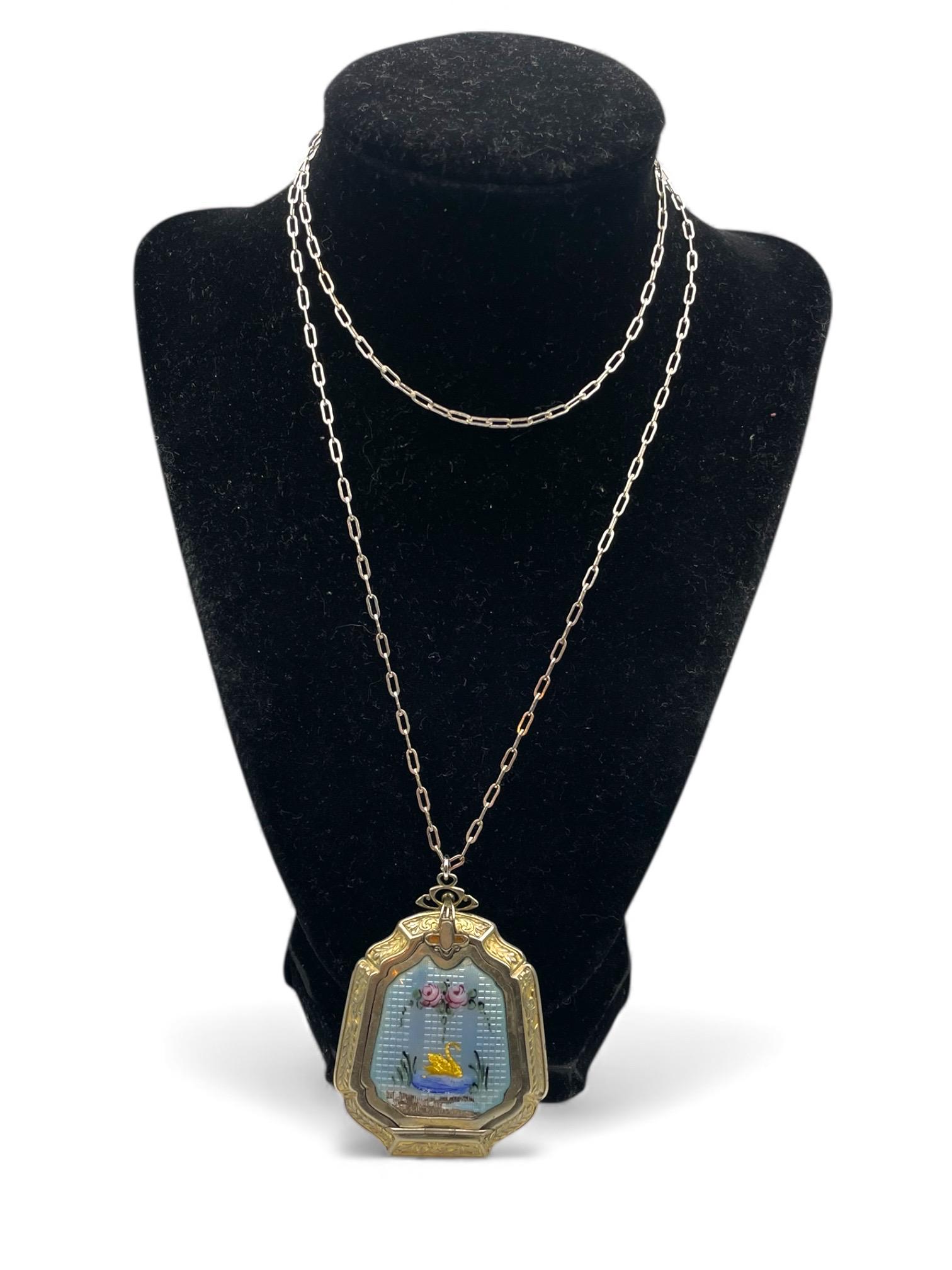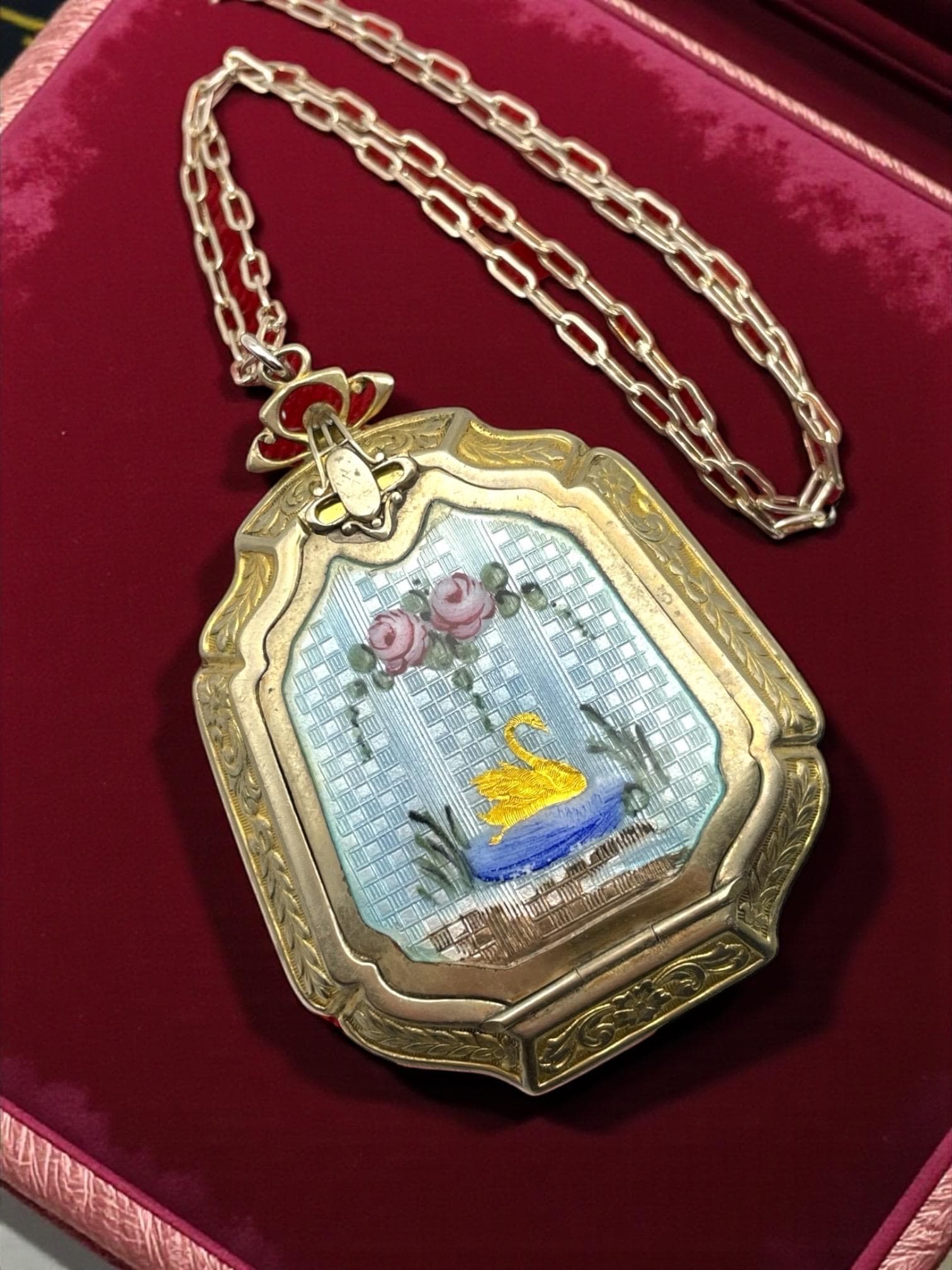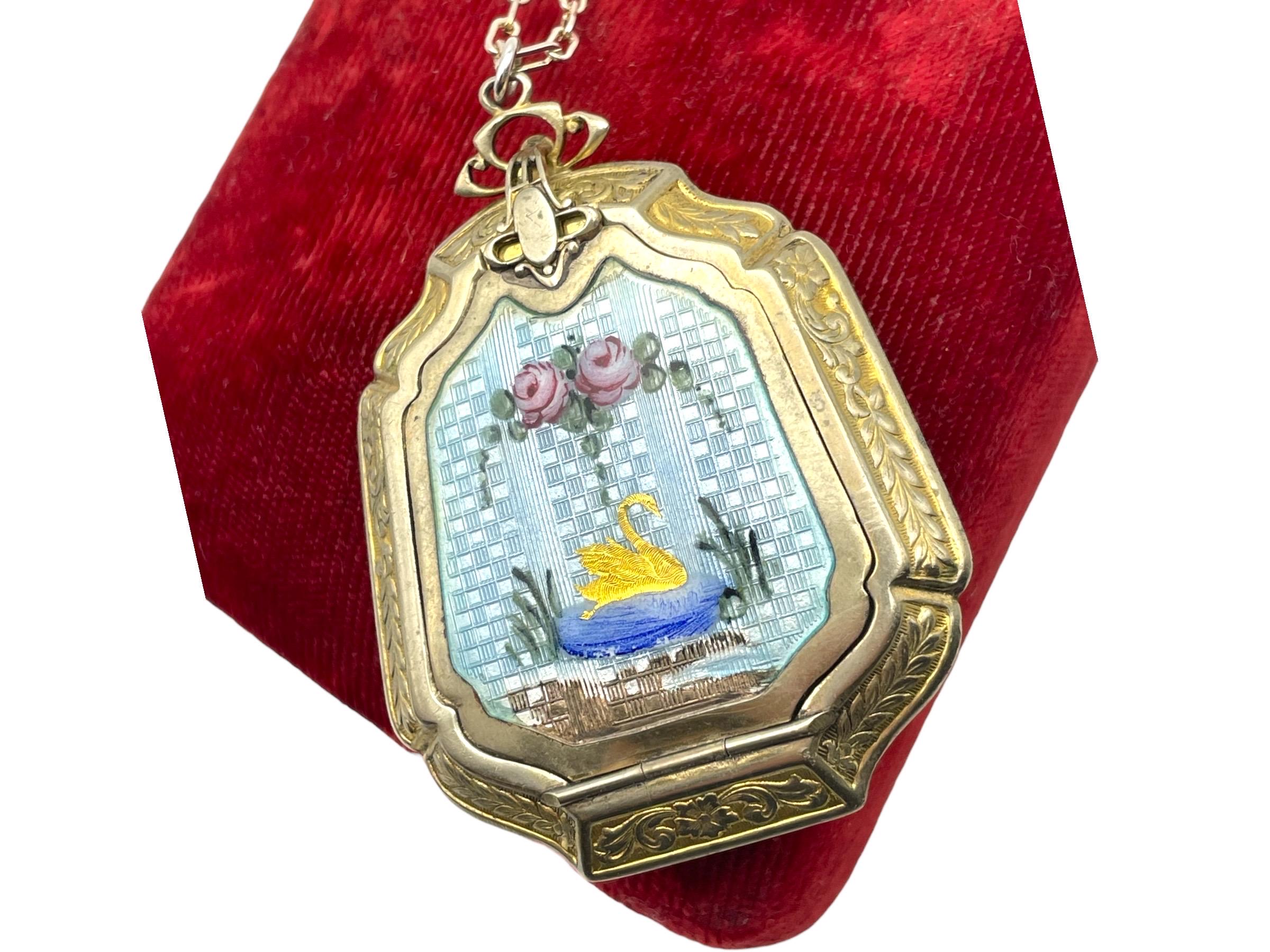 Beautiful (and very LARGE!) antique silver tone compact locket. This locket pendant is from the 1930s and made by R&G Co. (see note below). The front features a hand painted guilloche design (some wear to the bottom of the blue design). Blue checkered design, two pink flowers with green leaves along the top and a gold colored swan in water with greenery surrounding.