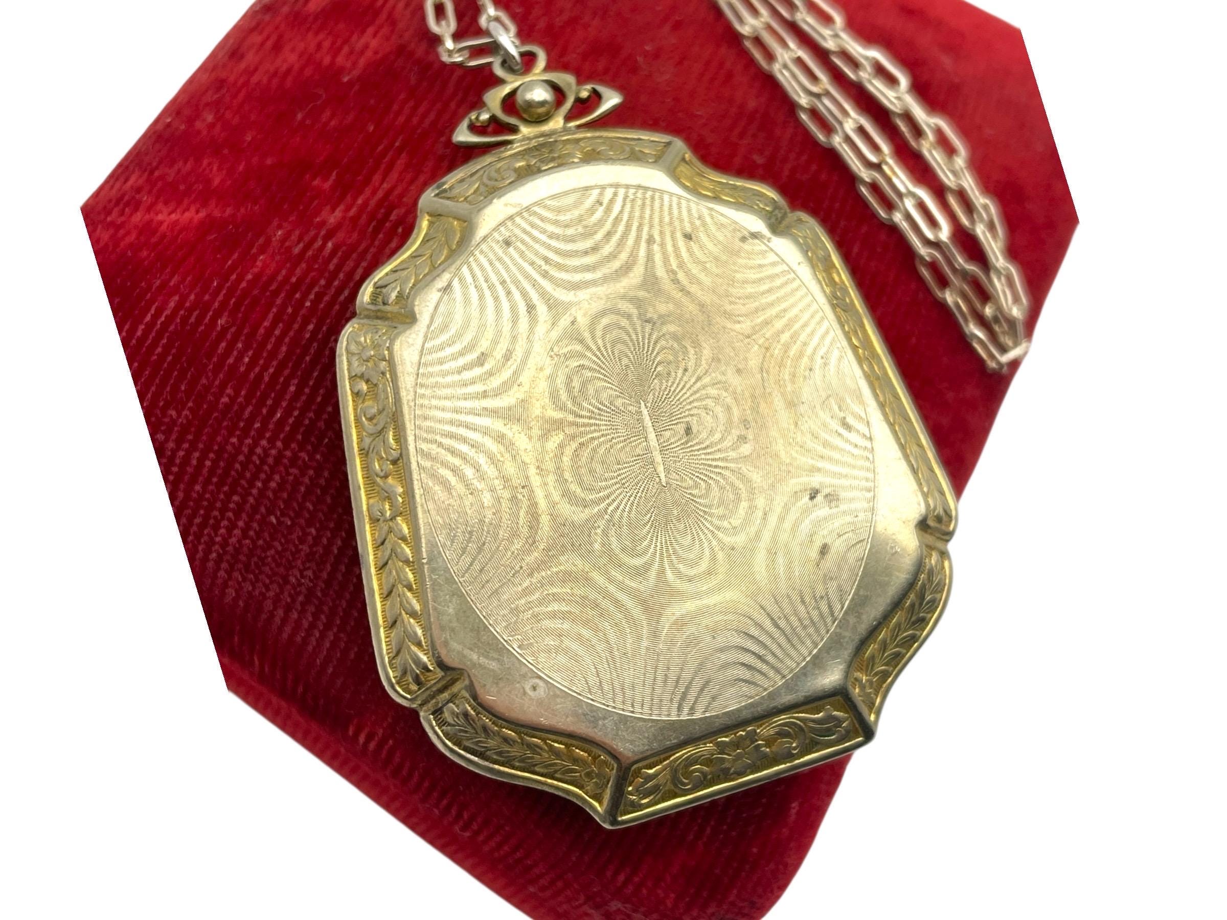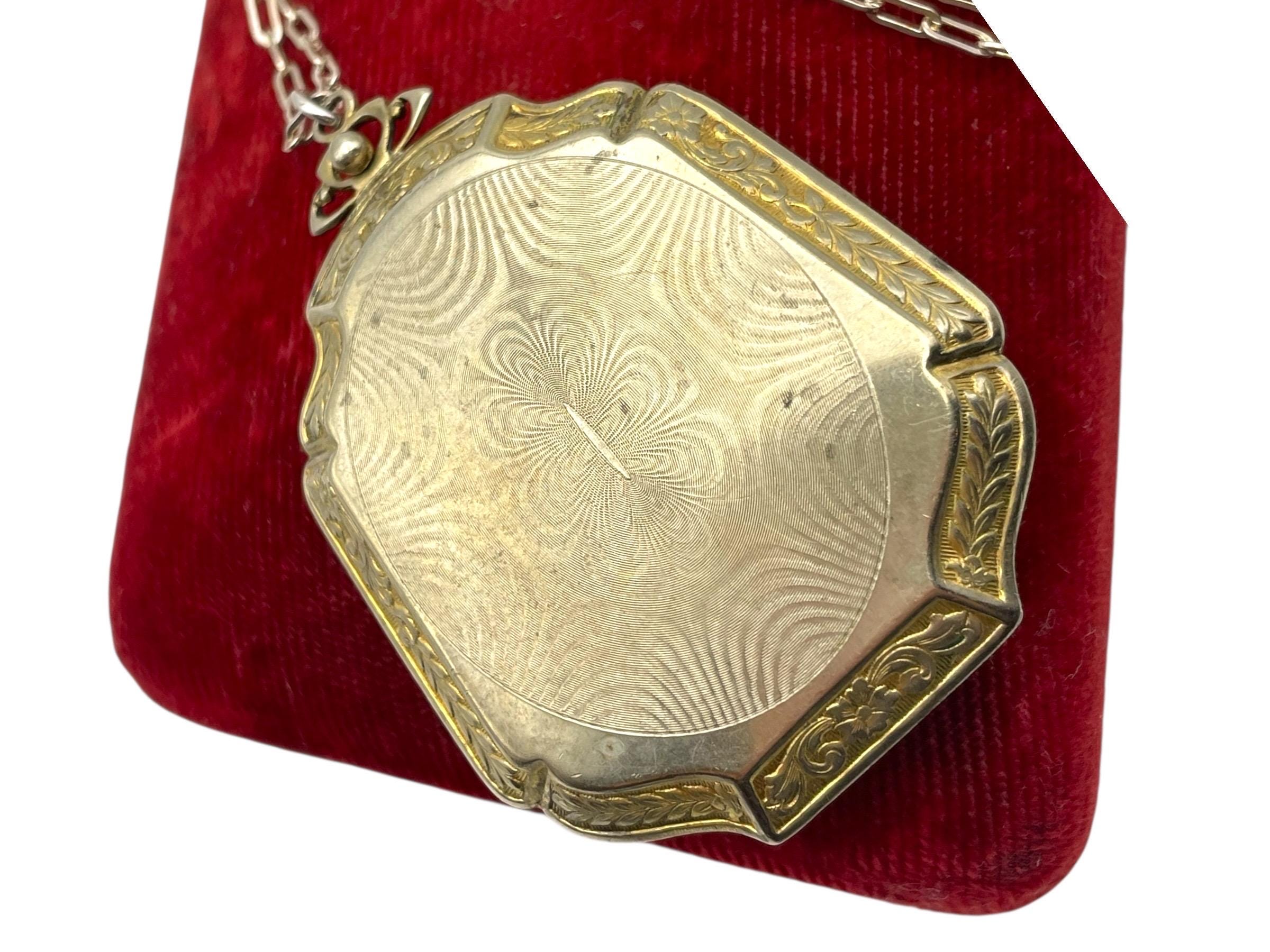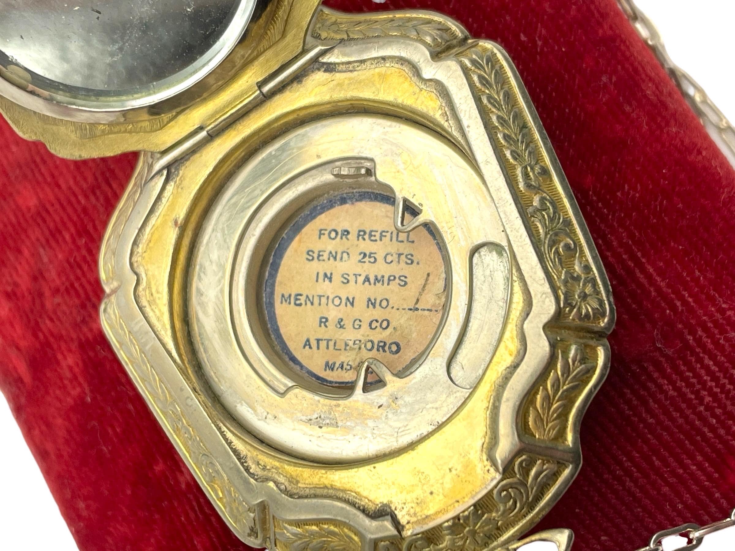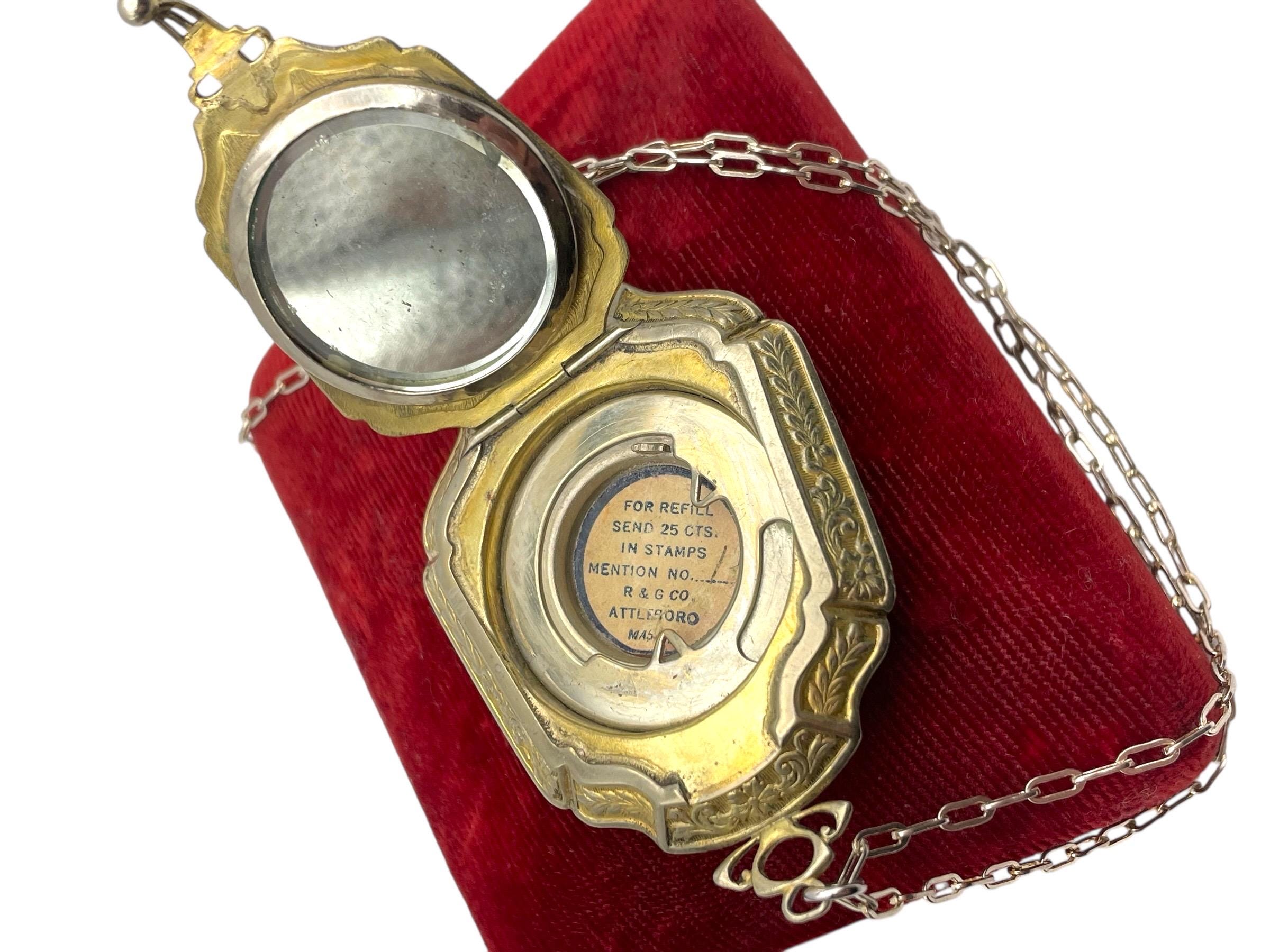 This large locket was once a makeup compact. When you open the compact, there is a mirror and a place for loose powder. The mirror in the interior top is in fair to good condition, no cracks, one or two flea bites on the edges. The bottom has a rotating dial loose powder well or rouge pot. It is marked for R&G Co.