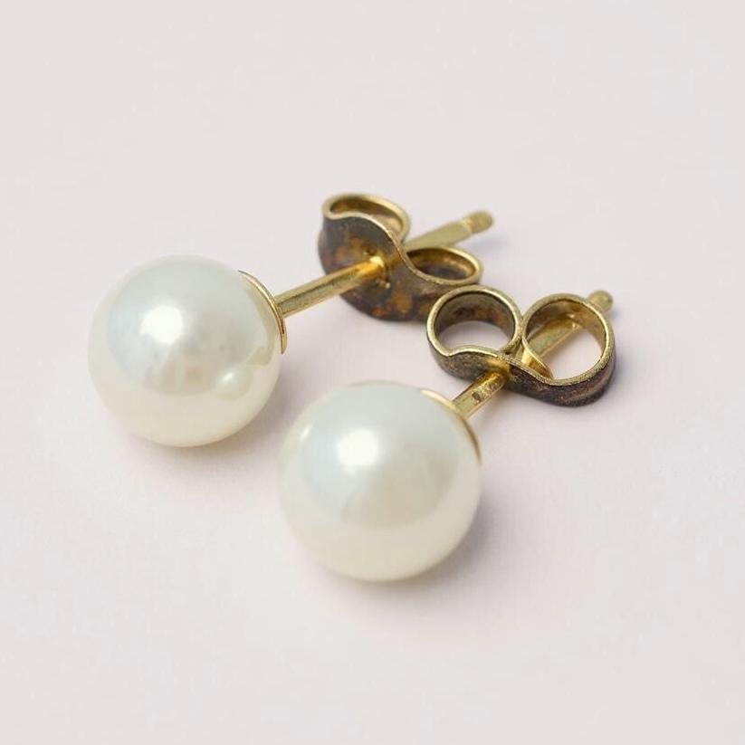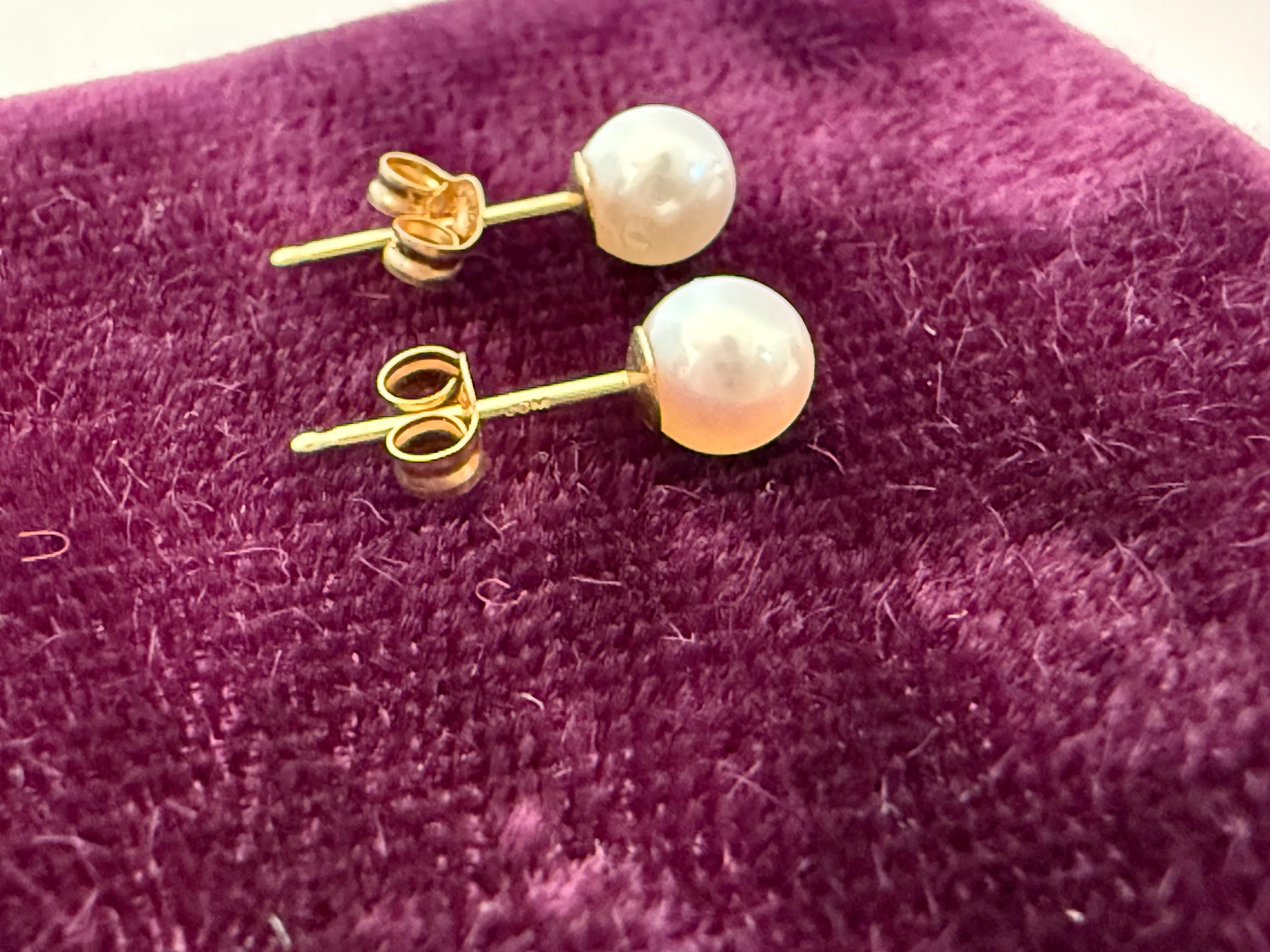 Vintage and dainty 14K yellow gold pearl earrings that are circa 1980s. The pair are hallmarked for 14K gold on the posts and on back of each earring clutch.