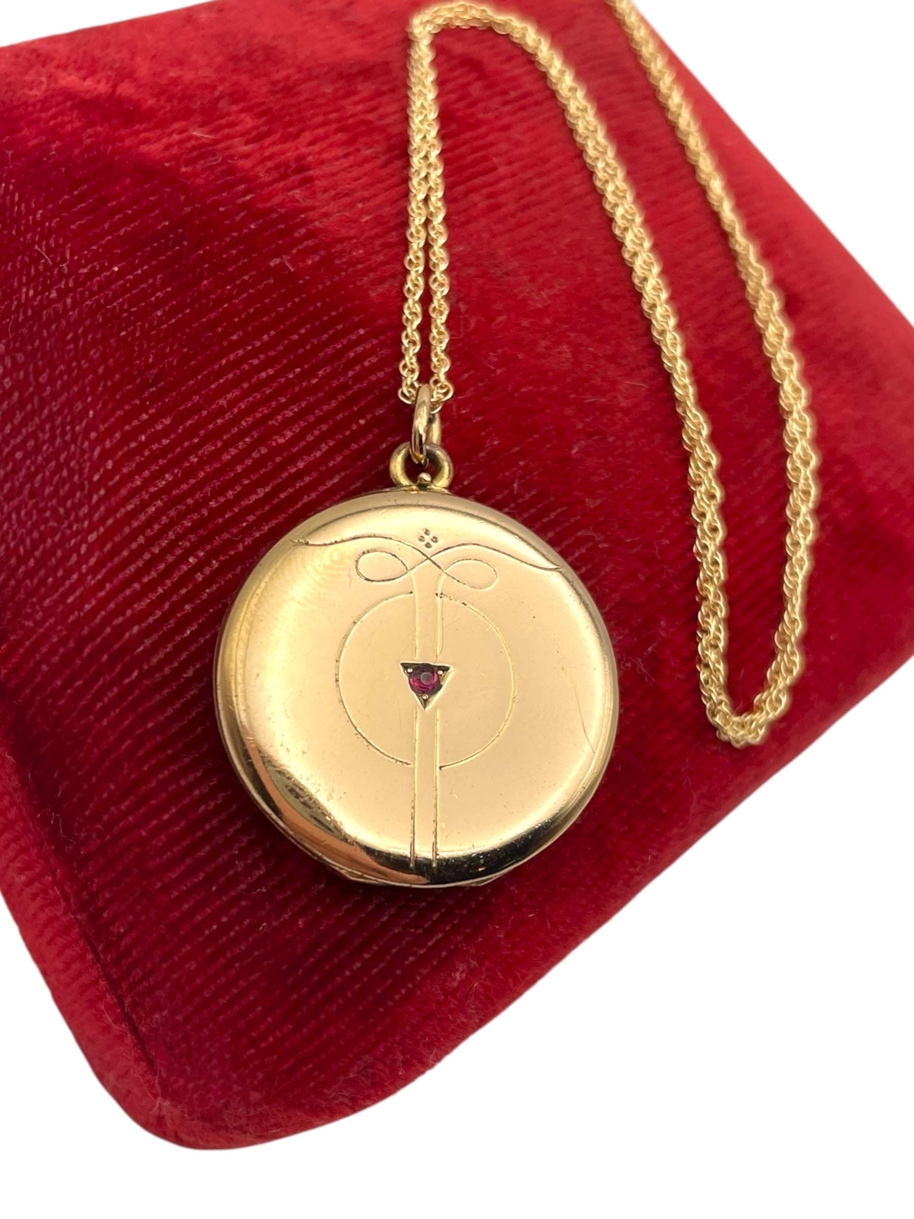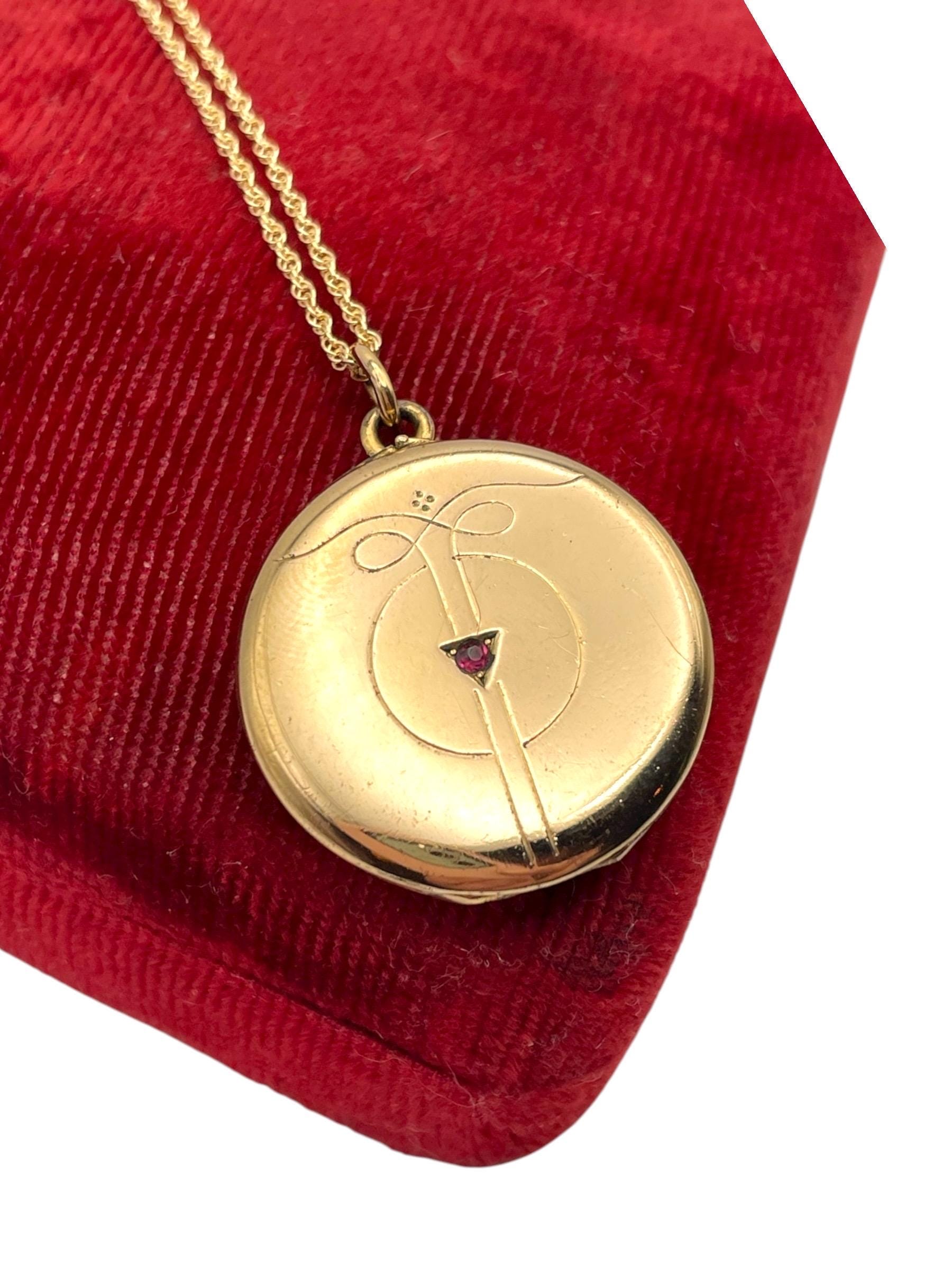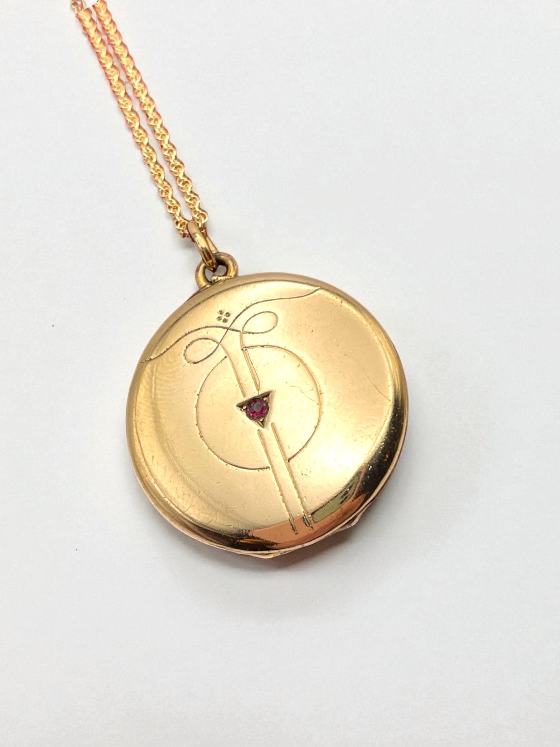 Antique and unique Edwardian gold filled round photo locket. This locket features an etched design with one pink rhinestone in the center. The back is plain with no design and a shiny finish.