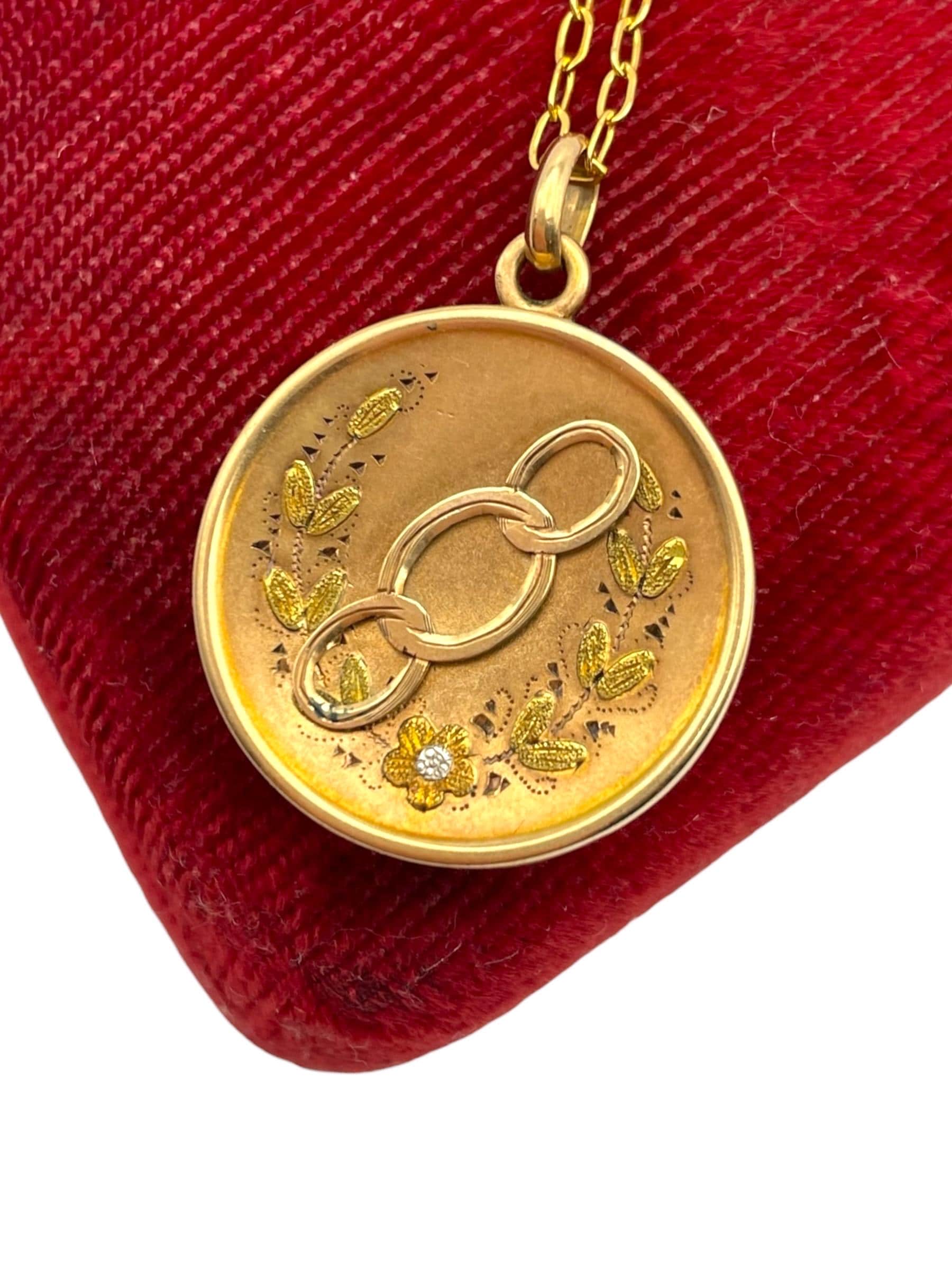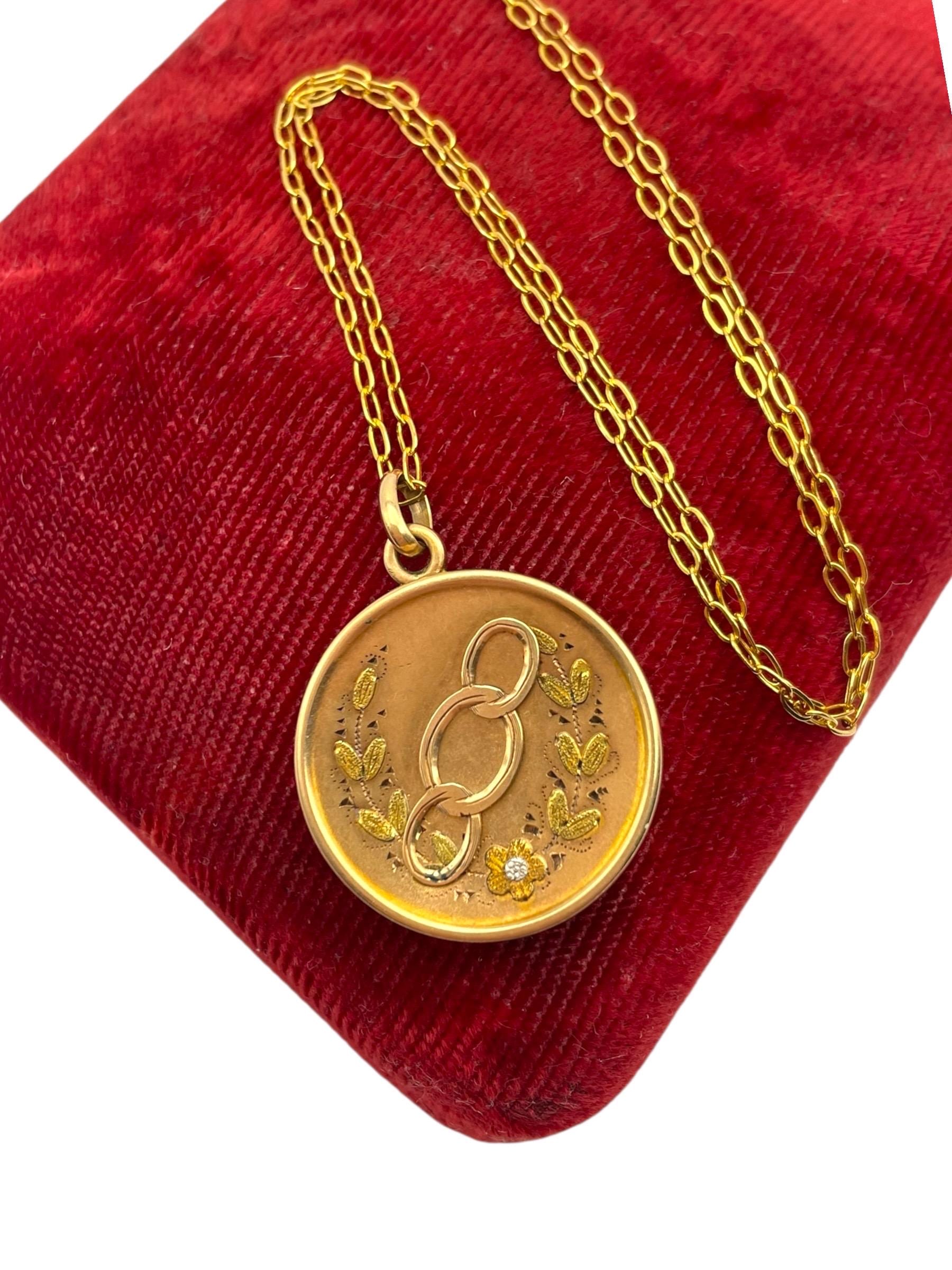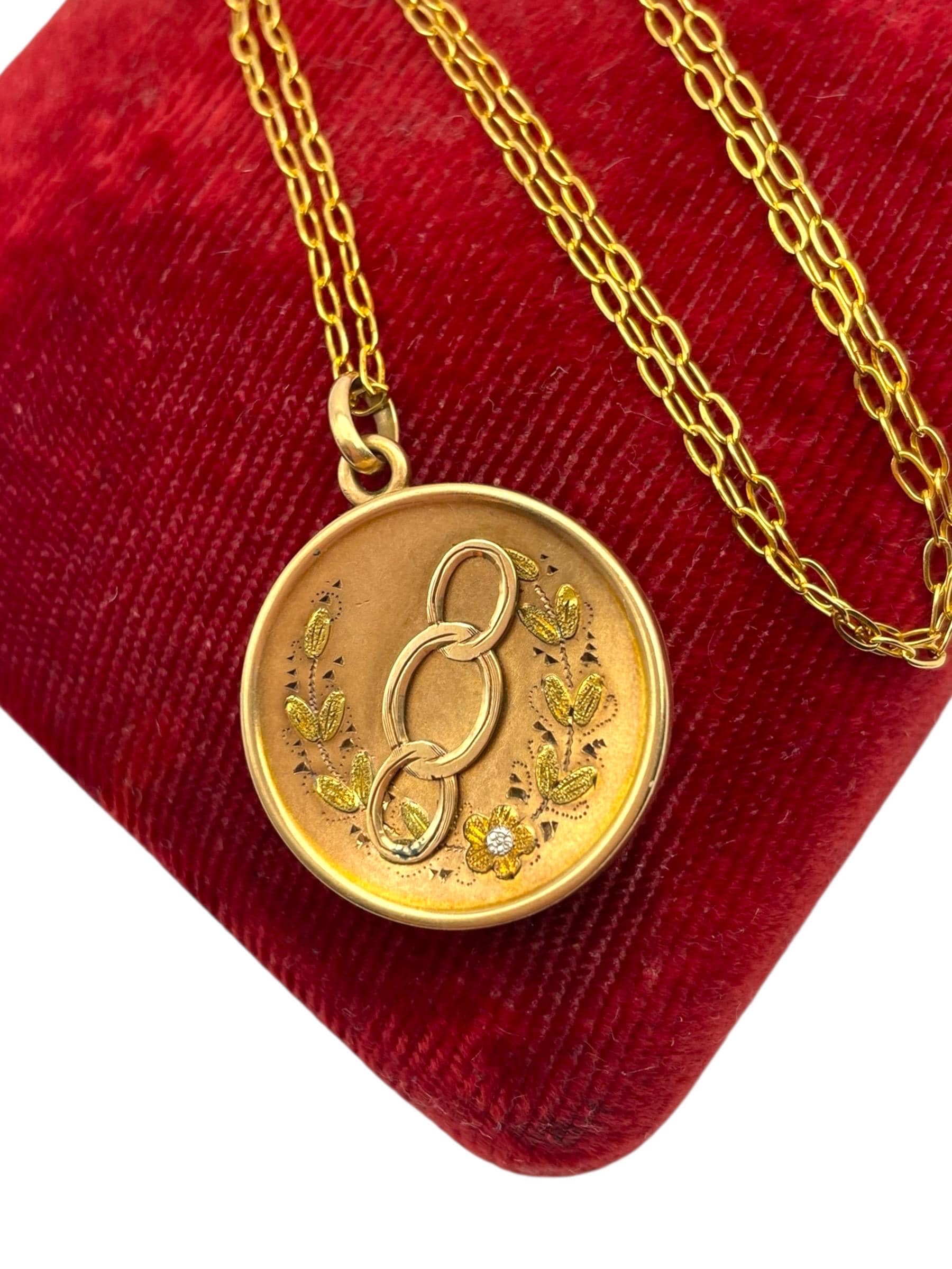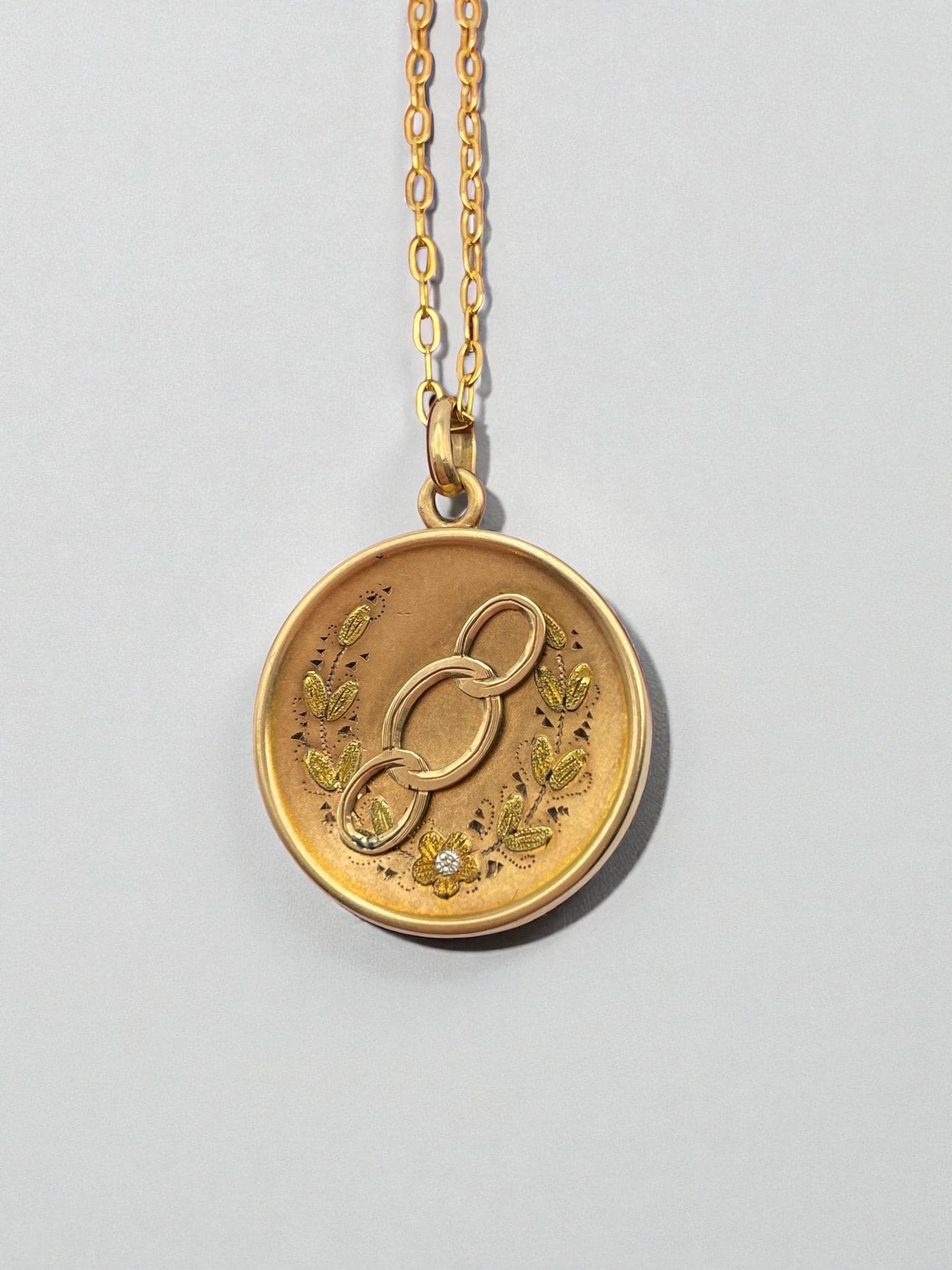 Beautiful round vintage gold filled locket necklace. The front features a raised design with three chain links intertwine. Flowers and leaves surround the edges. The back is plain with no design.