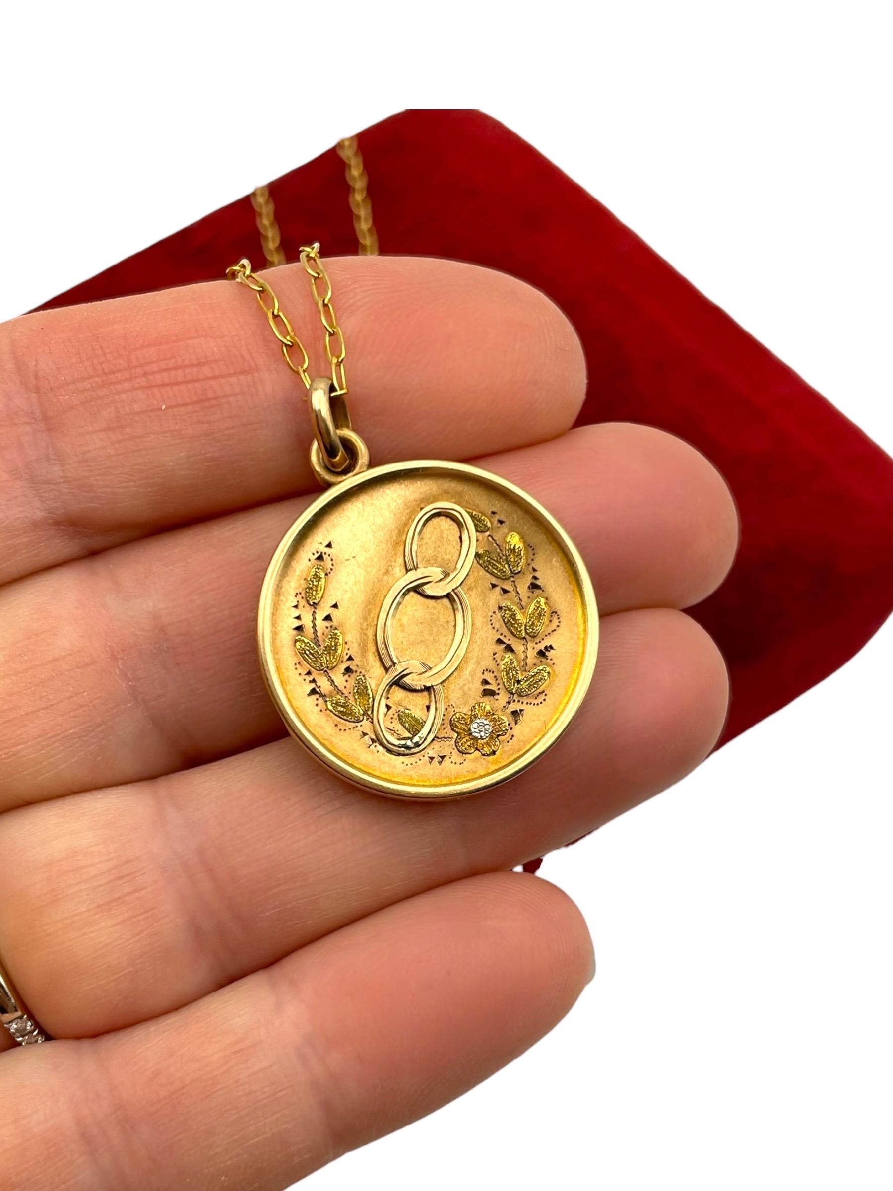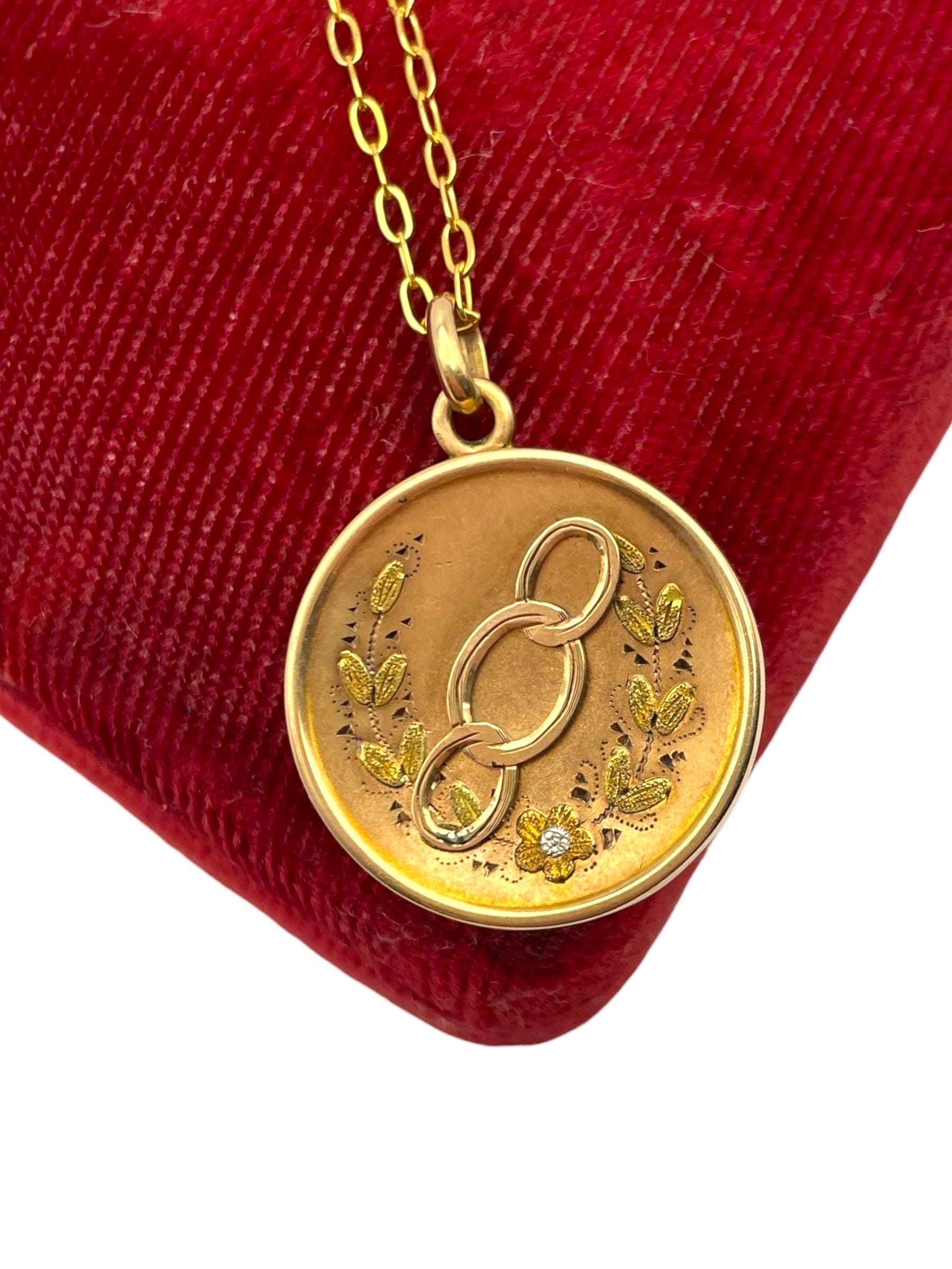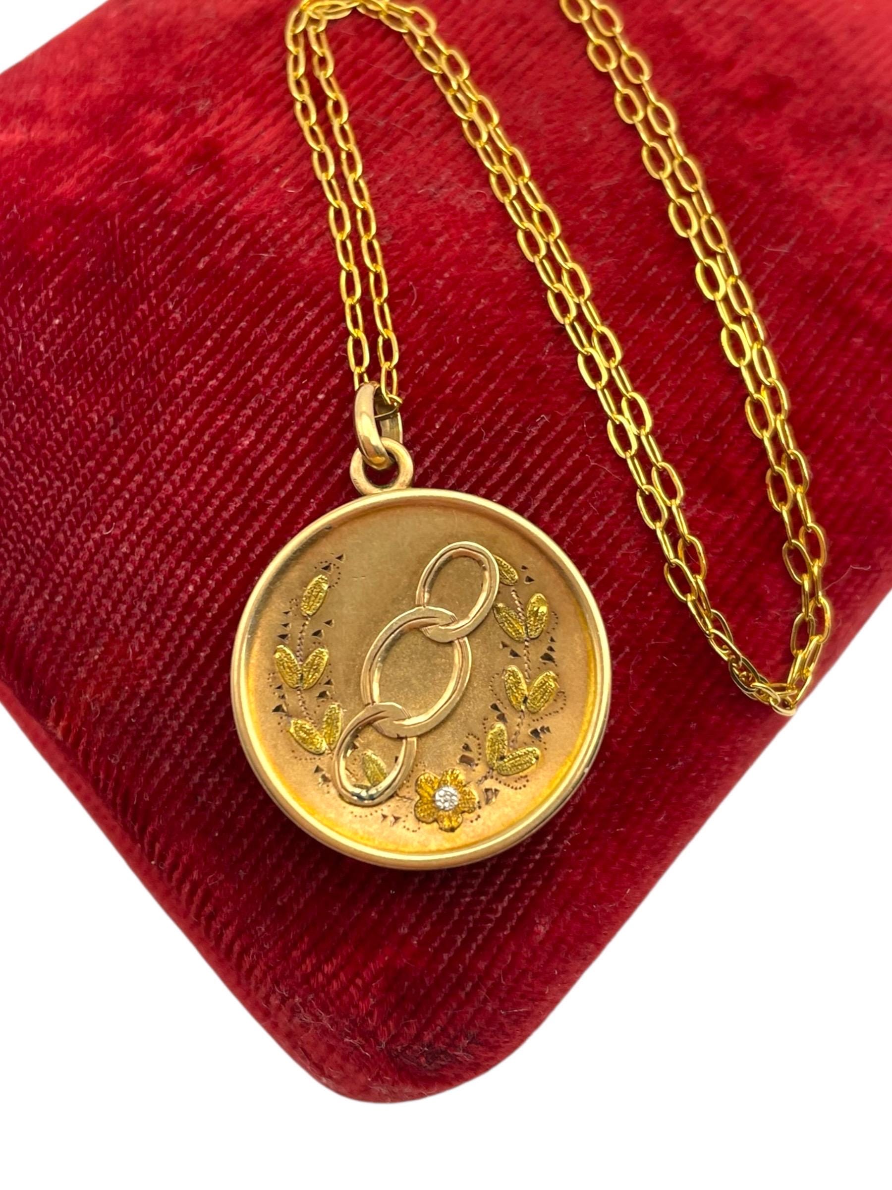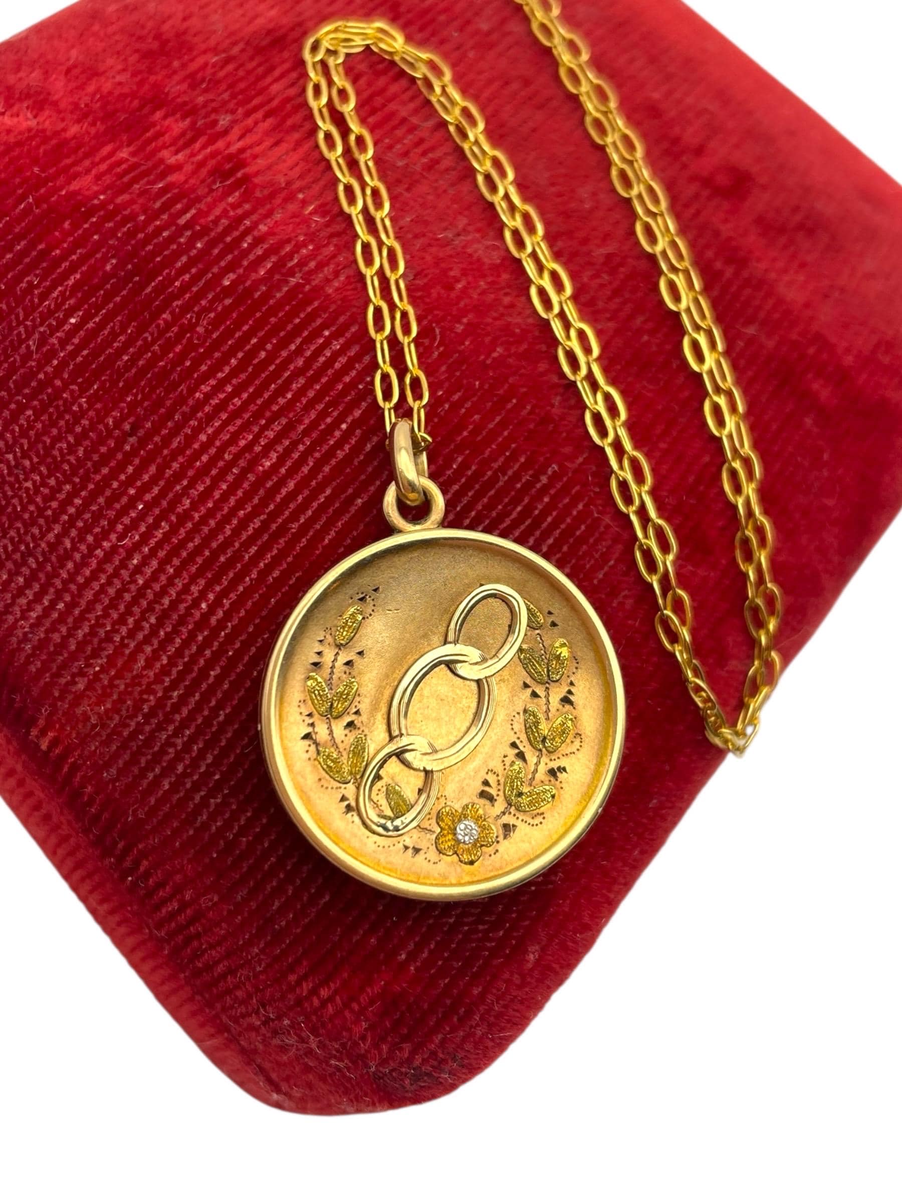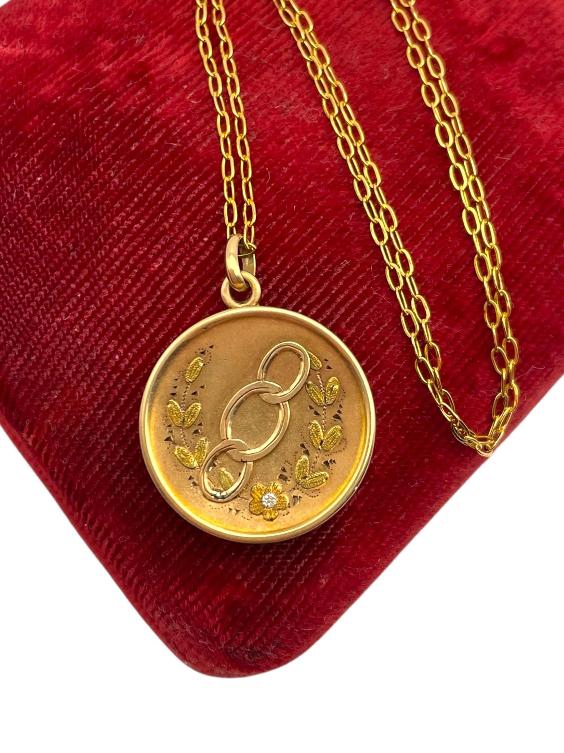 Beautiful round vintage gold filled locket necklace. The front features a raised design with three chain links intertwine. Flowers and leaves surround the edges. The back is plain with no design.