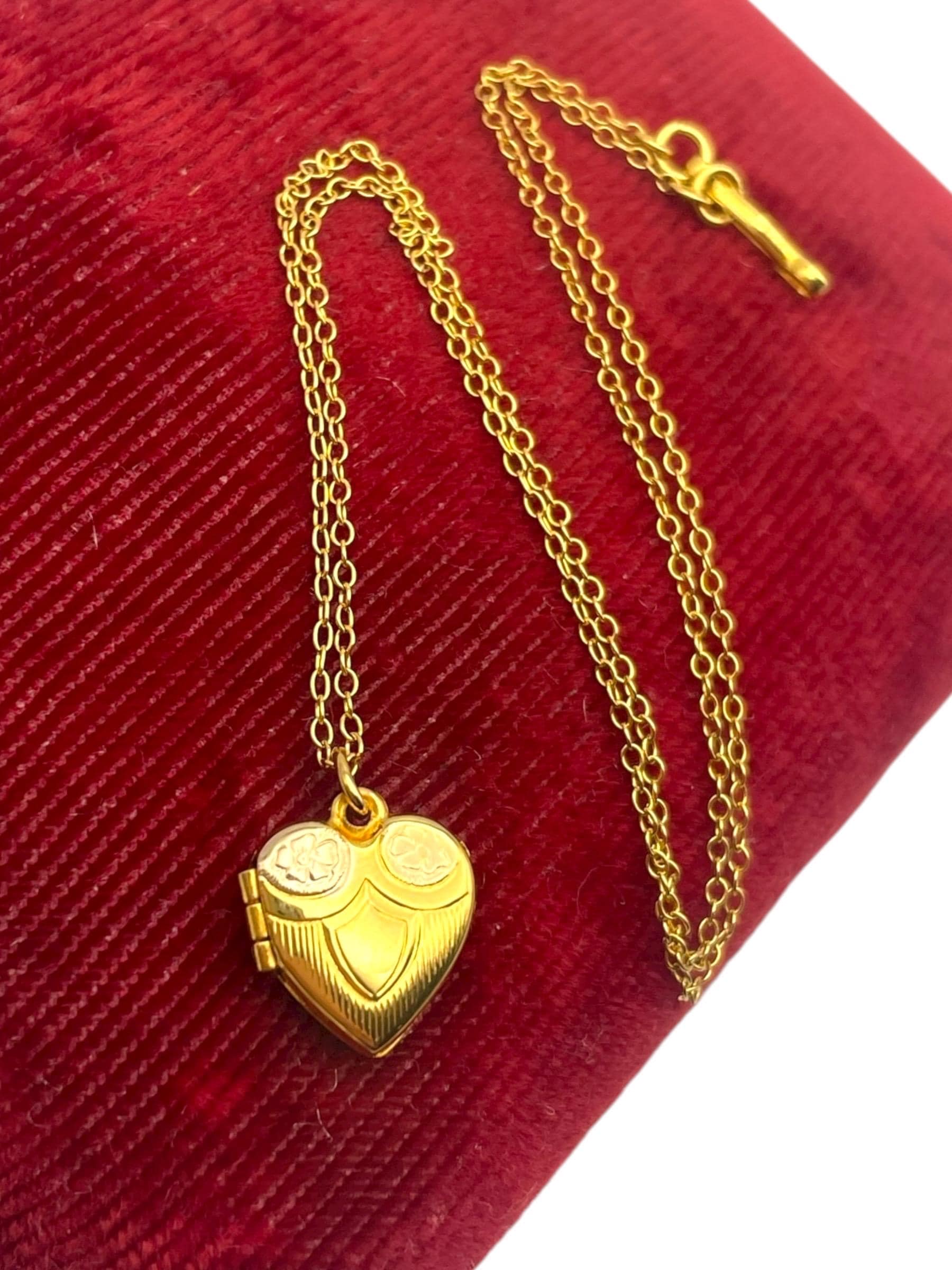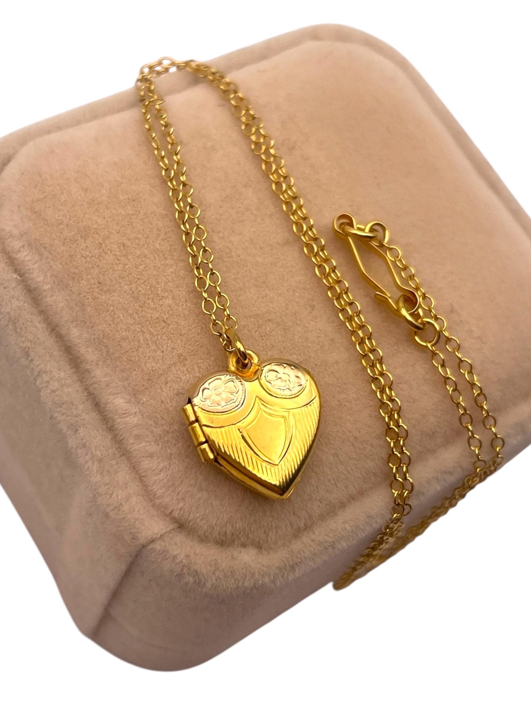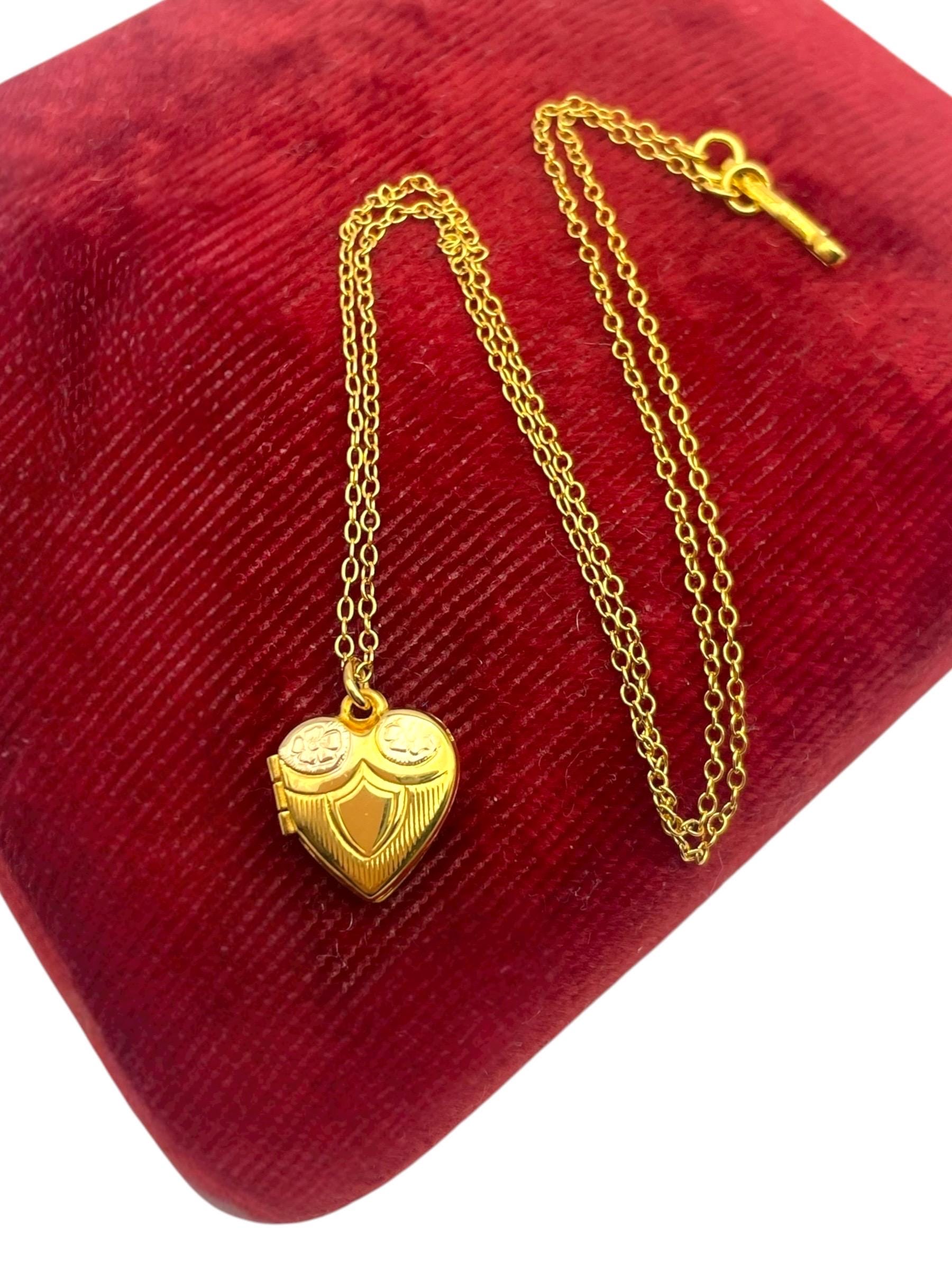 Vintage 12K Gold Filled Heart Locket - Girl’s Necklace GF Chain Etched Petite Tiny Pendant Charm Jewelry Children's Photo HFB H F Barrows