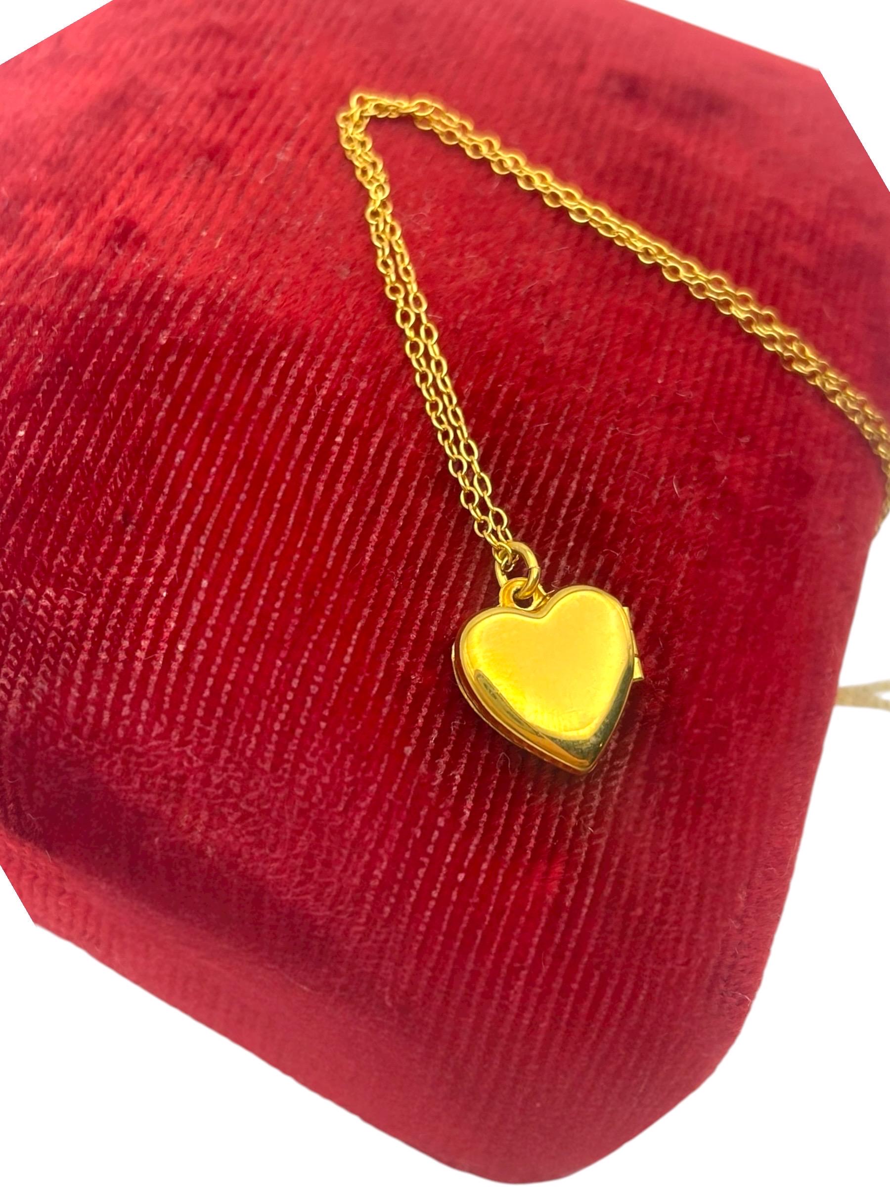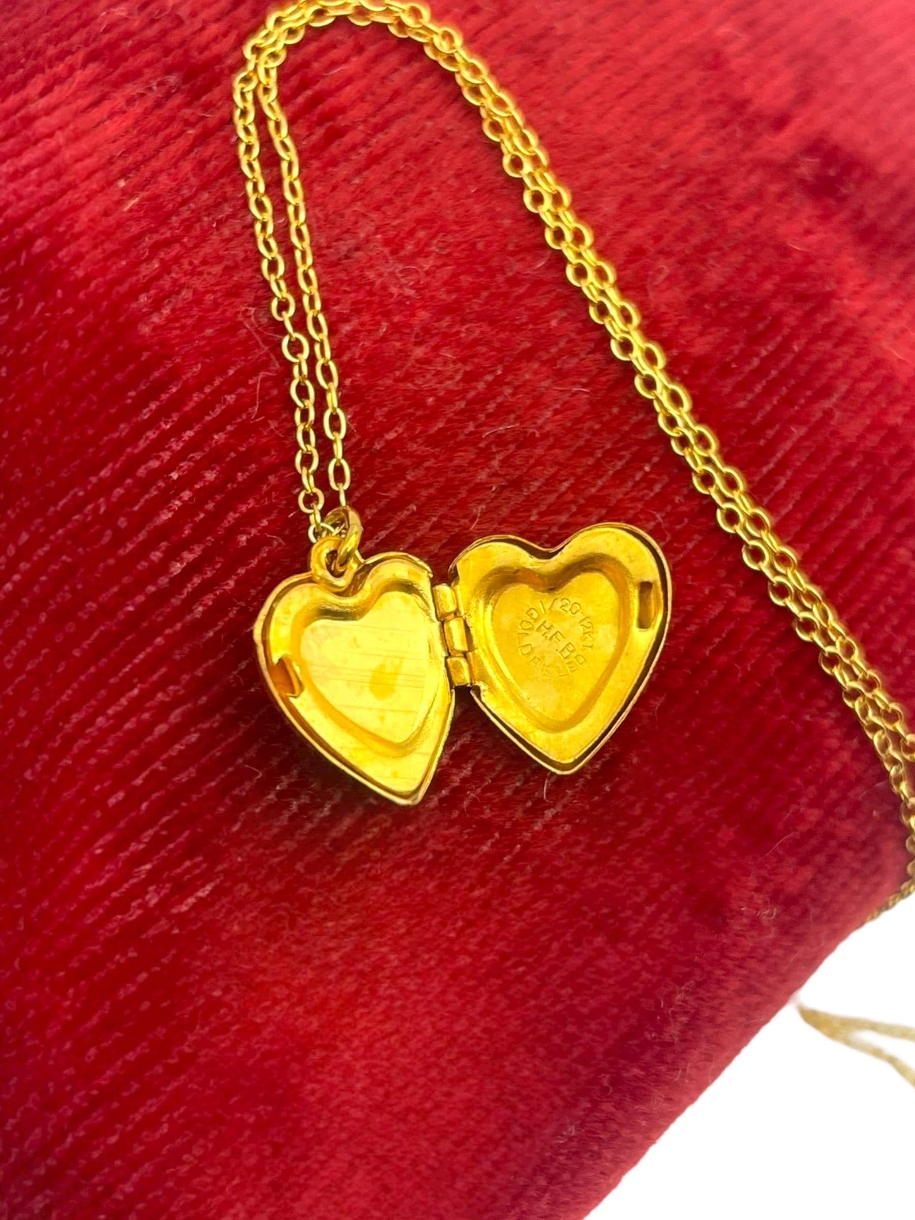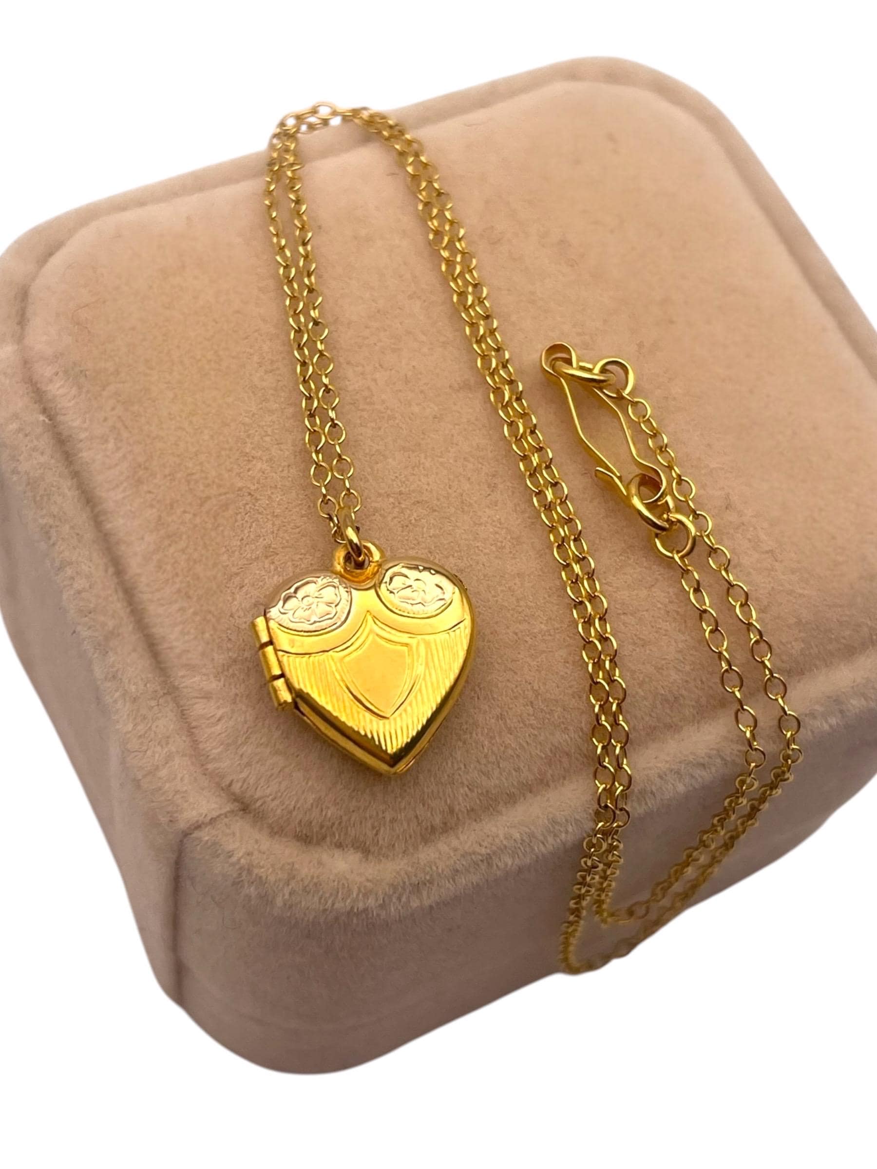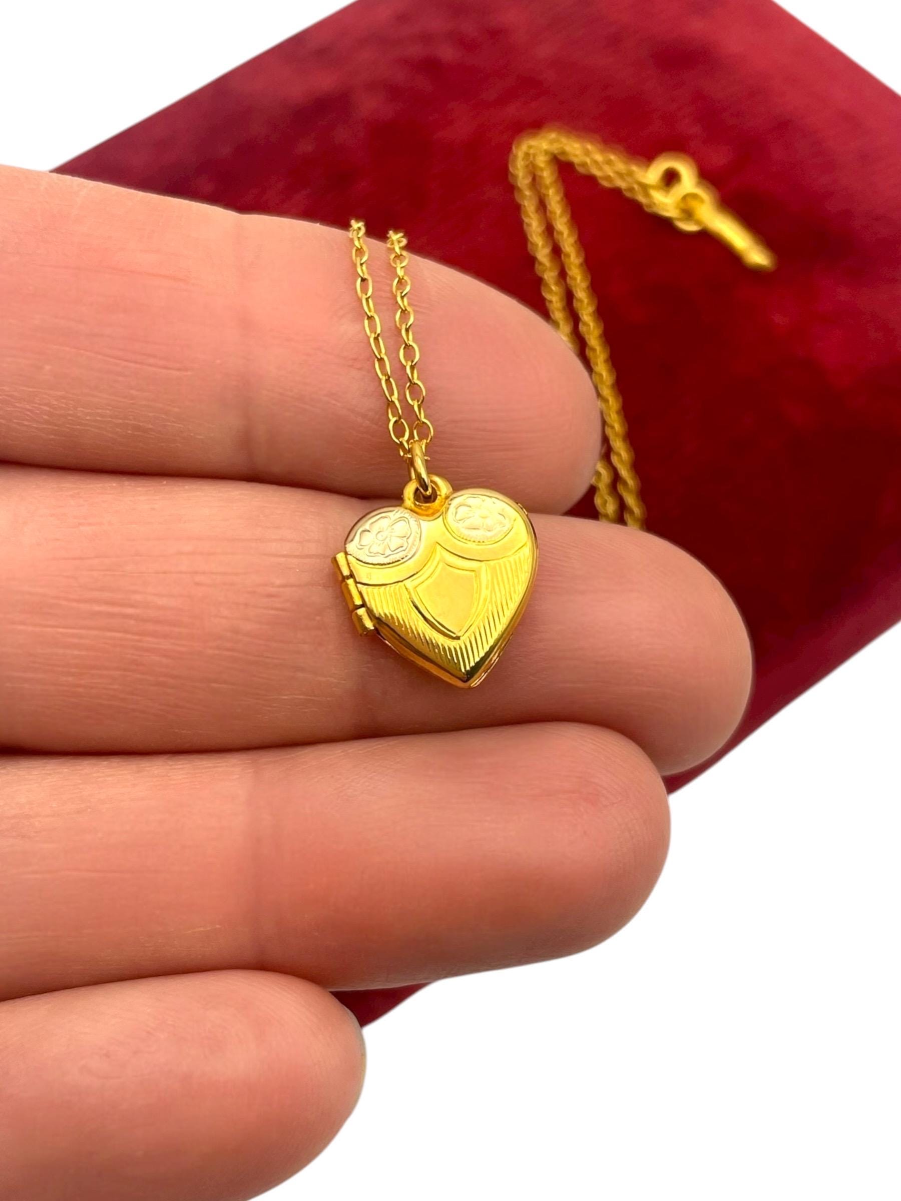 Vintage 12K Gold Filled Heart Locket - Girl’s Necklace GF Chain Etched Petite Tiny Pendant Charm Jewelry Children's Photo HFB H F Barrows