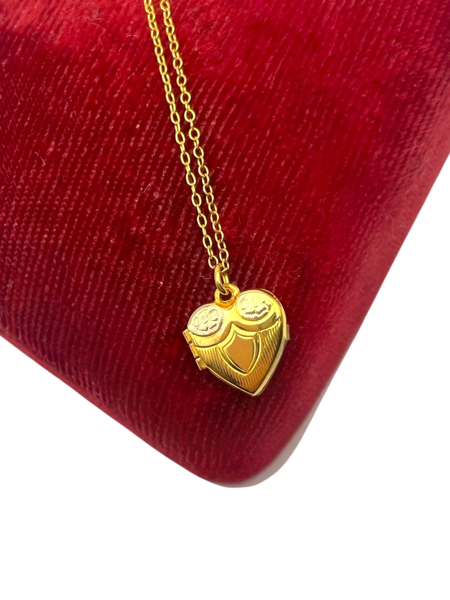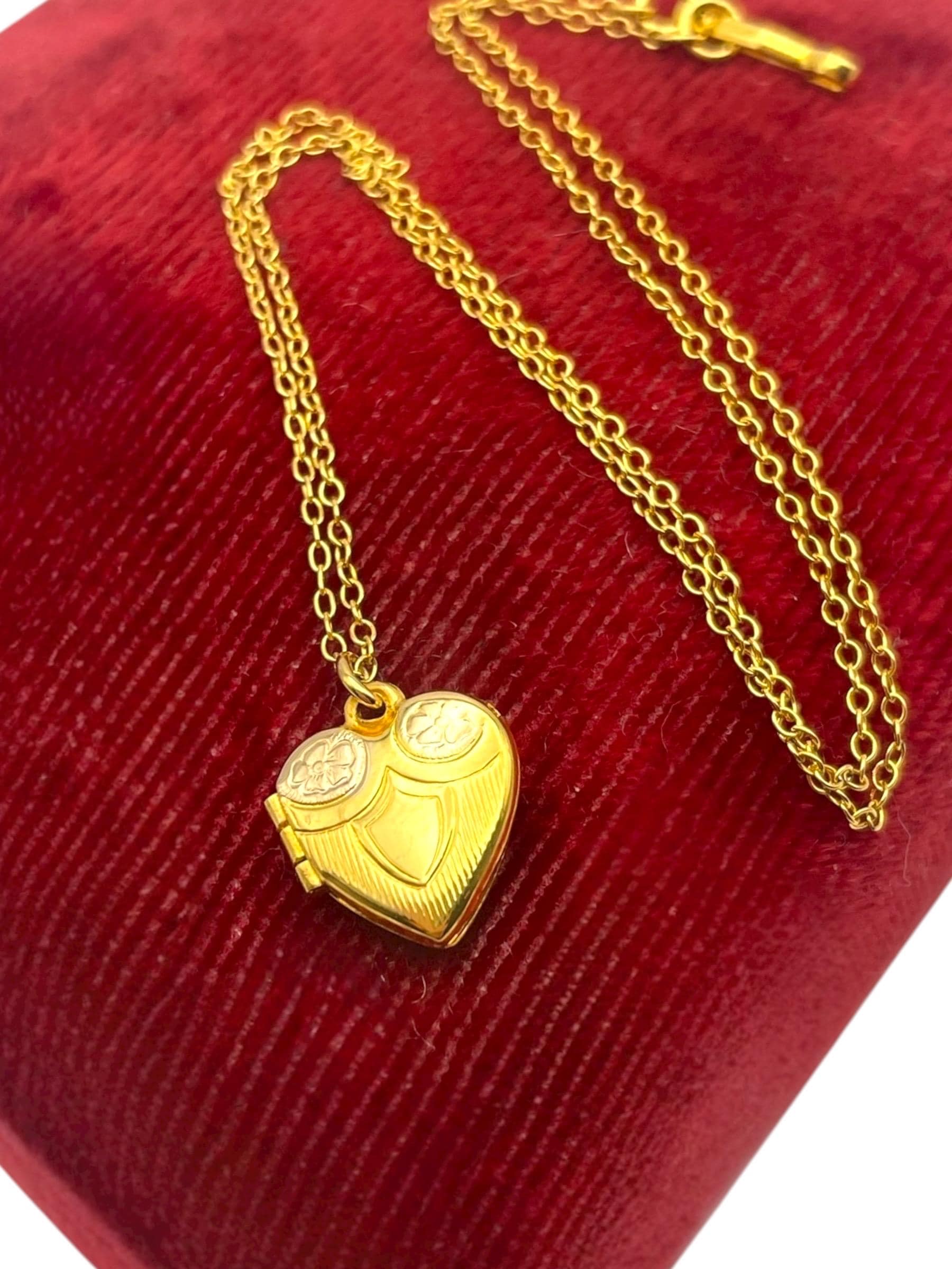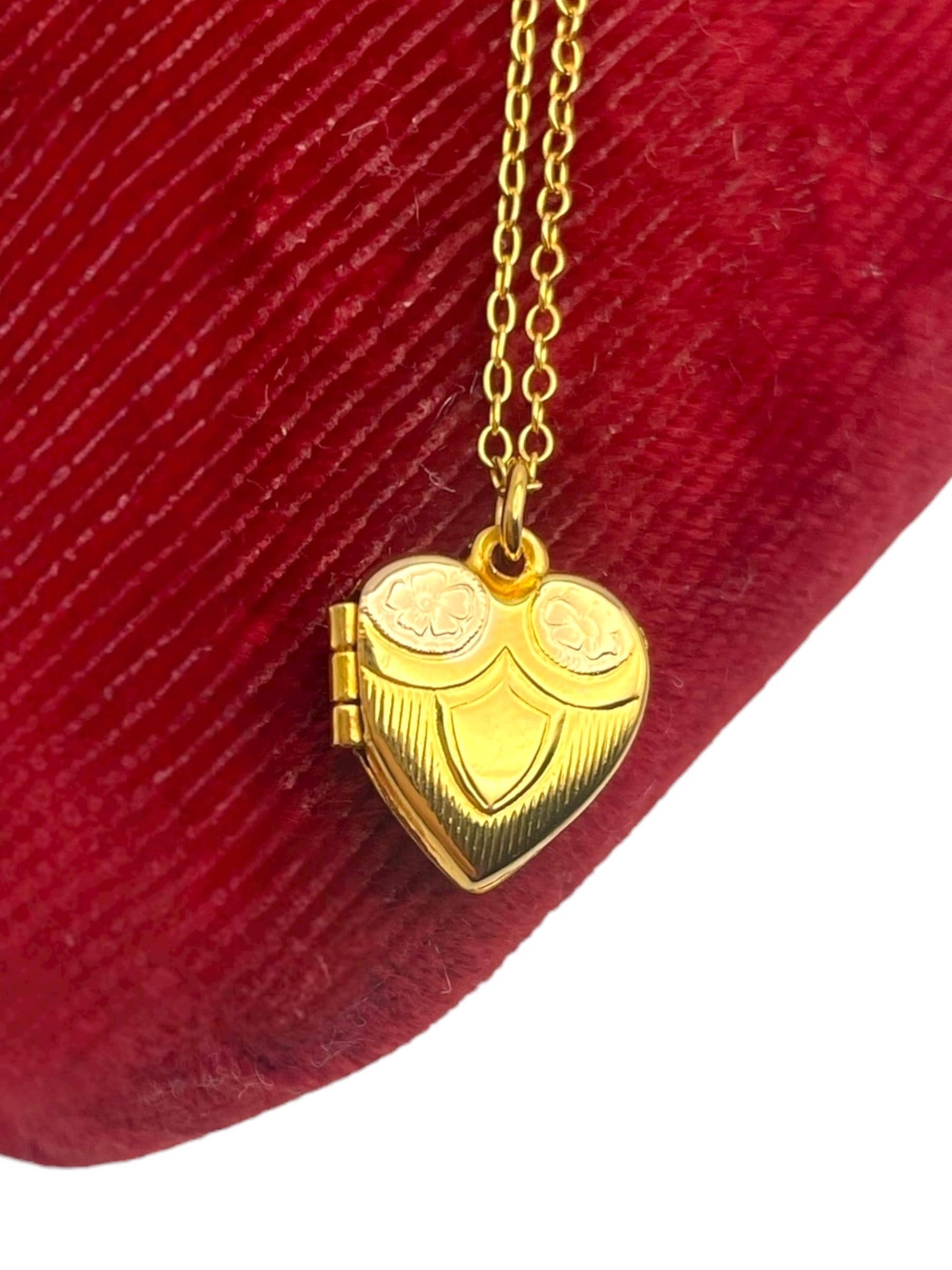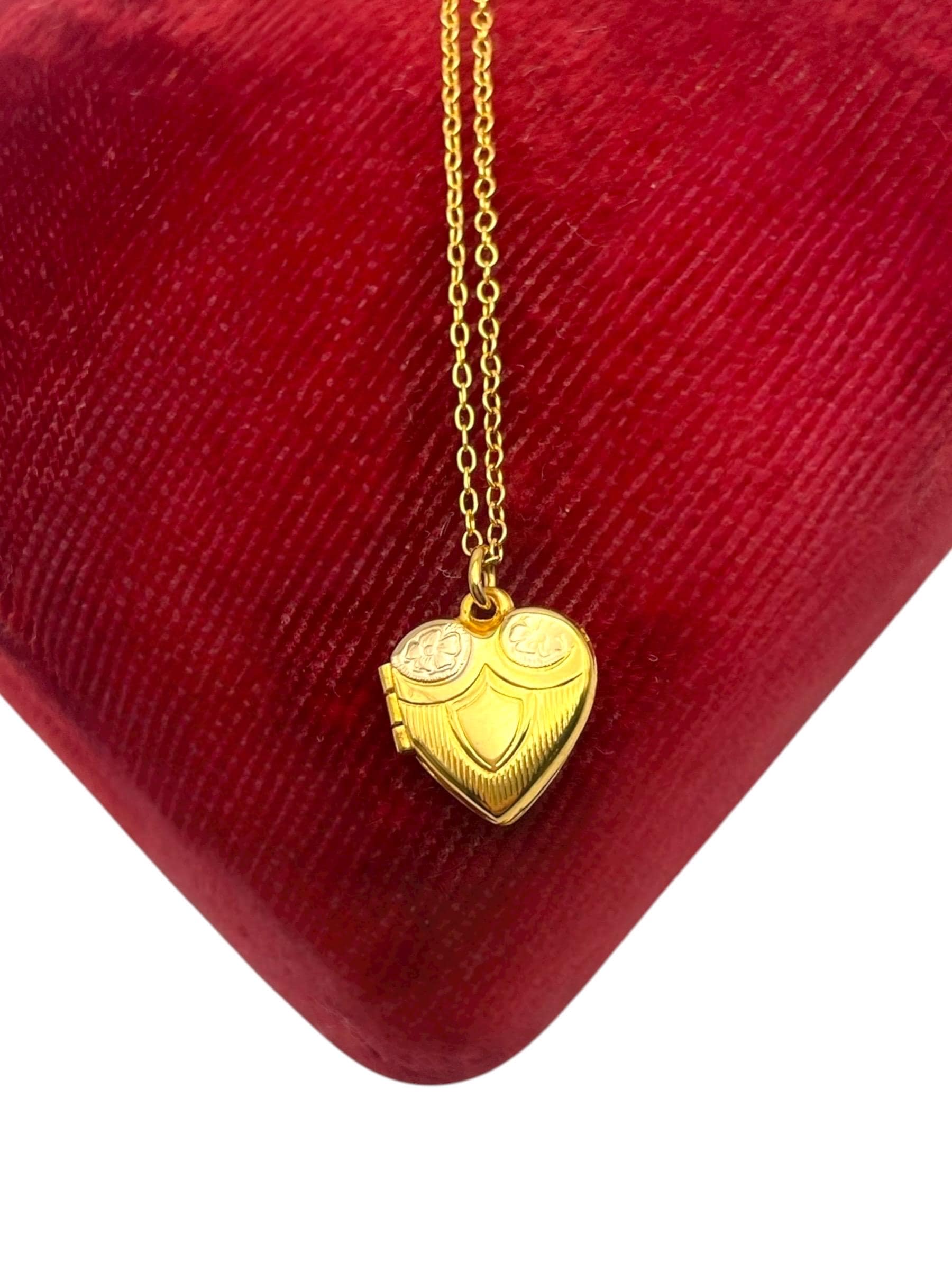 Adorable, tiny and dainty classic vintage gold filled heart shaped locket necklace for a child. The sweet and feminine piece has etched floral and striped designs on the front. The back of the locket is plain with no design.