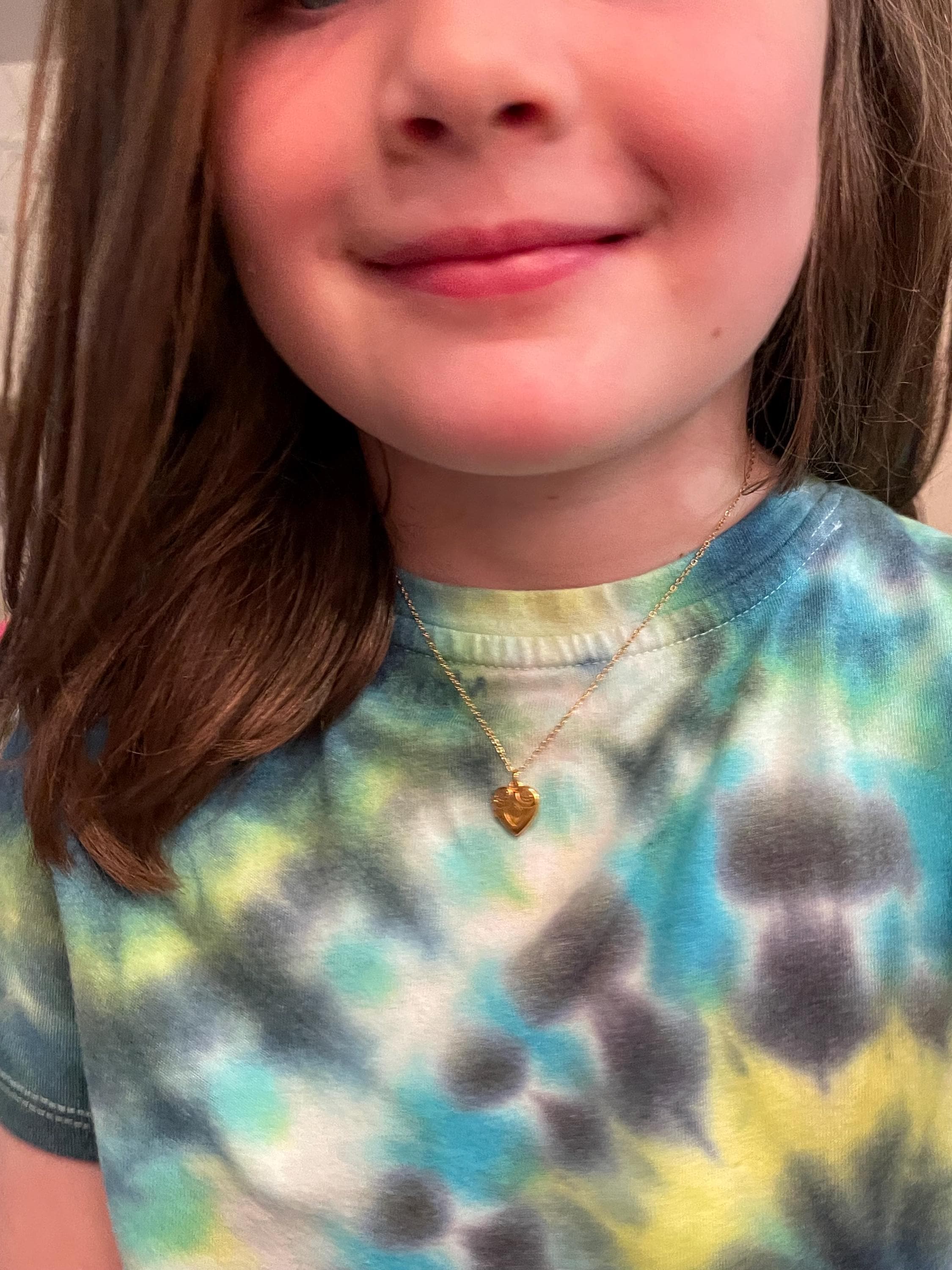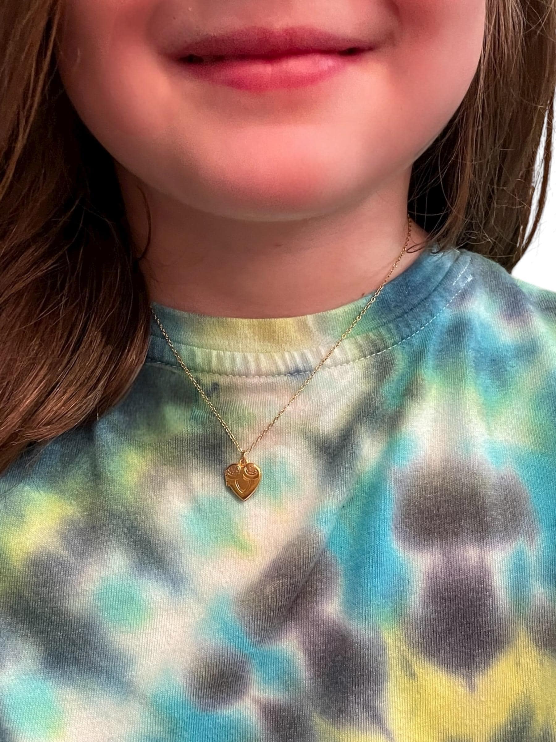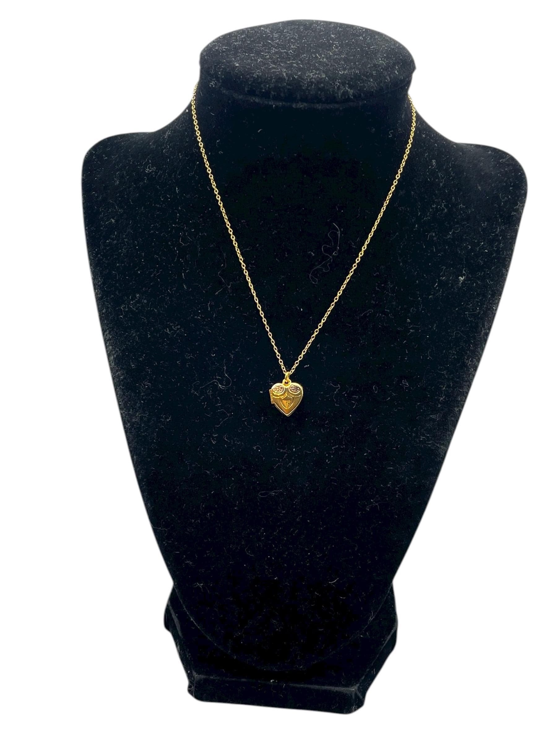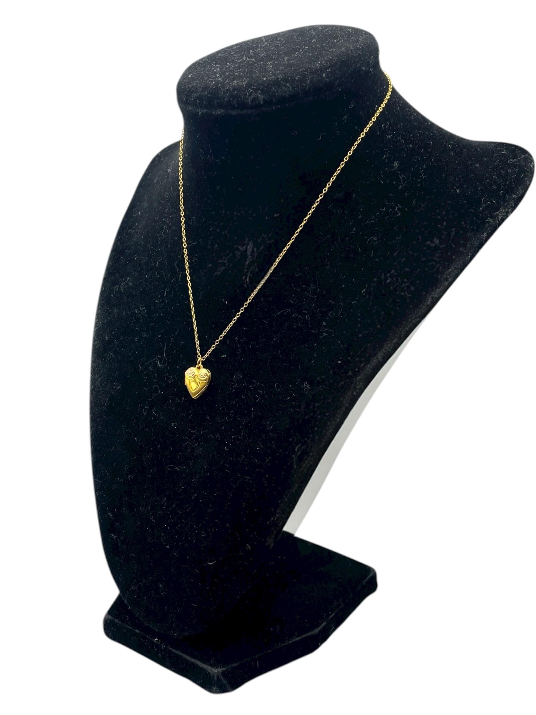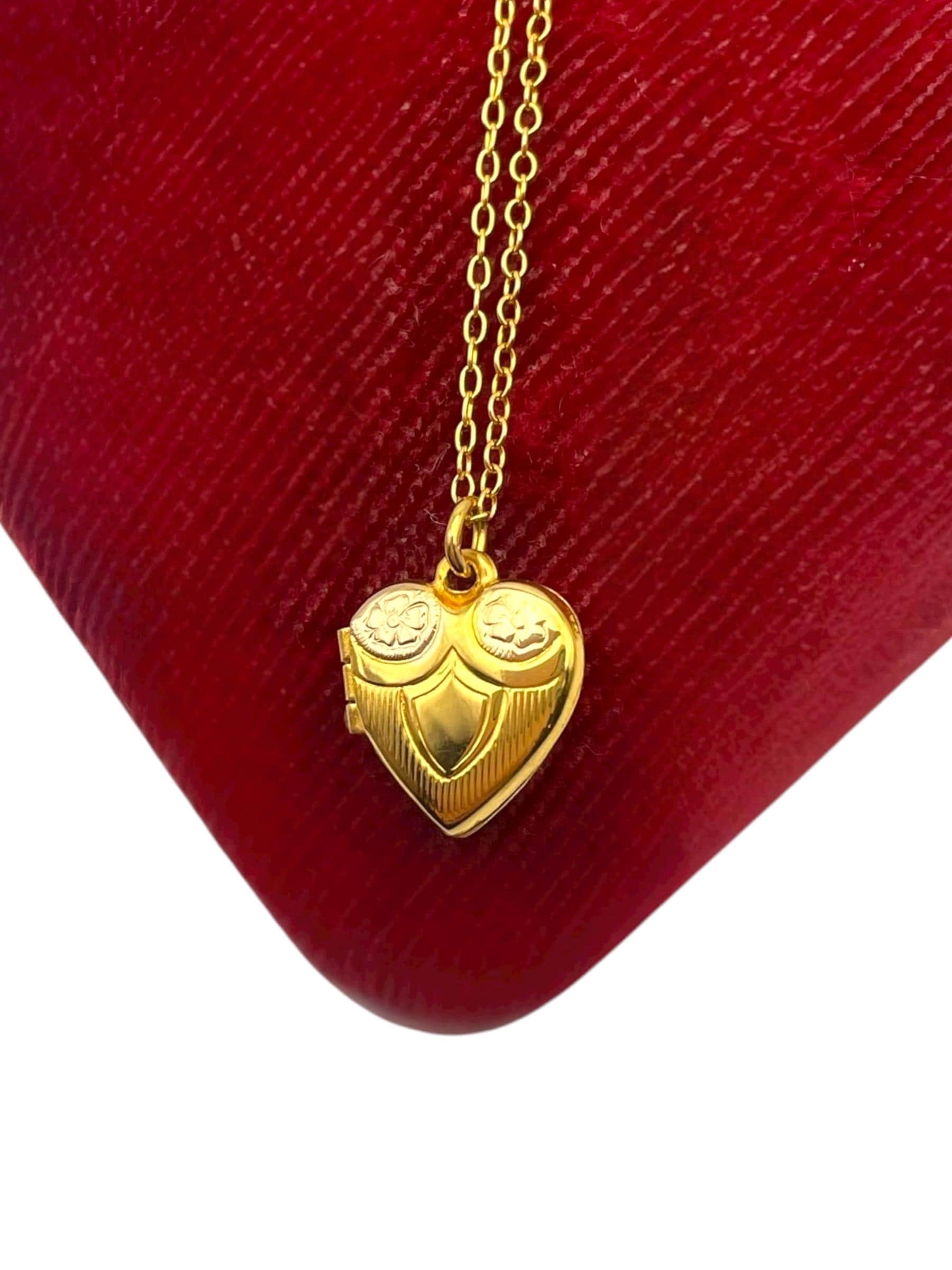Adorable, tiny and dainty classic vintage gold filled heart shaped locket necklace for a child. The sweet and feminine piece has etched floral and striped designs on the front. The back of the locket is plain with no design.