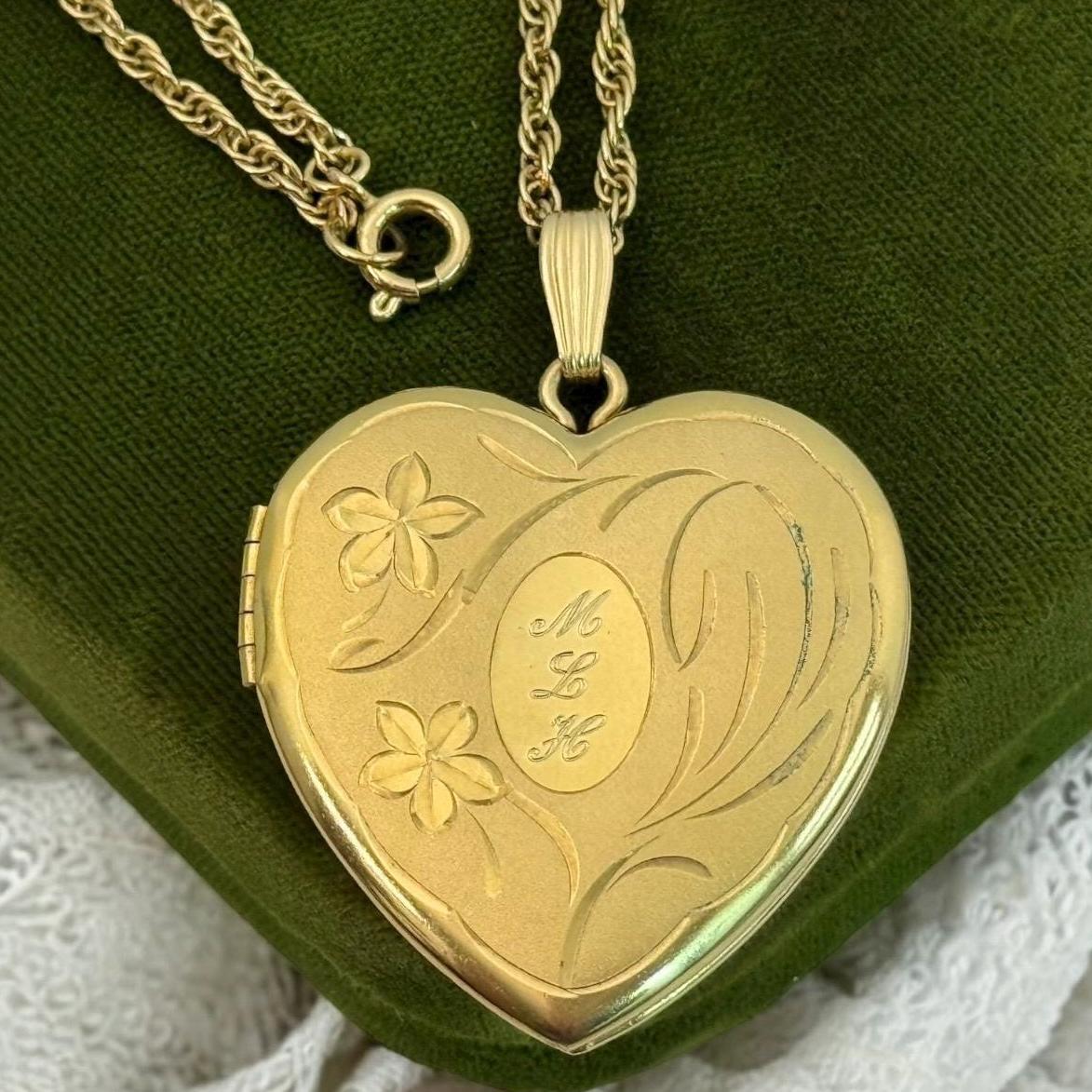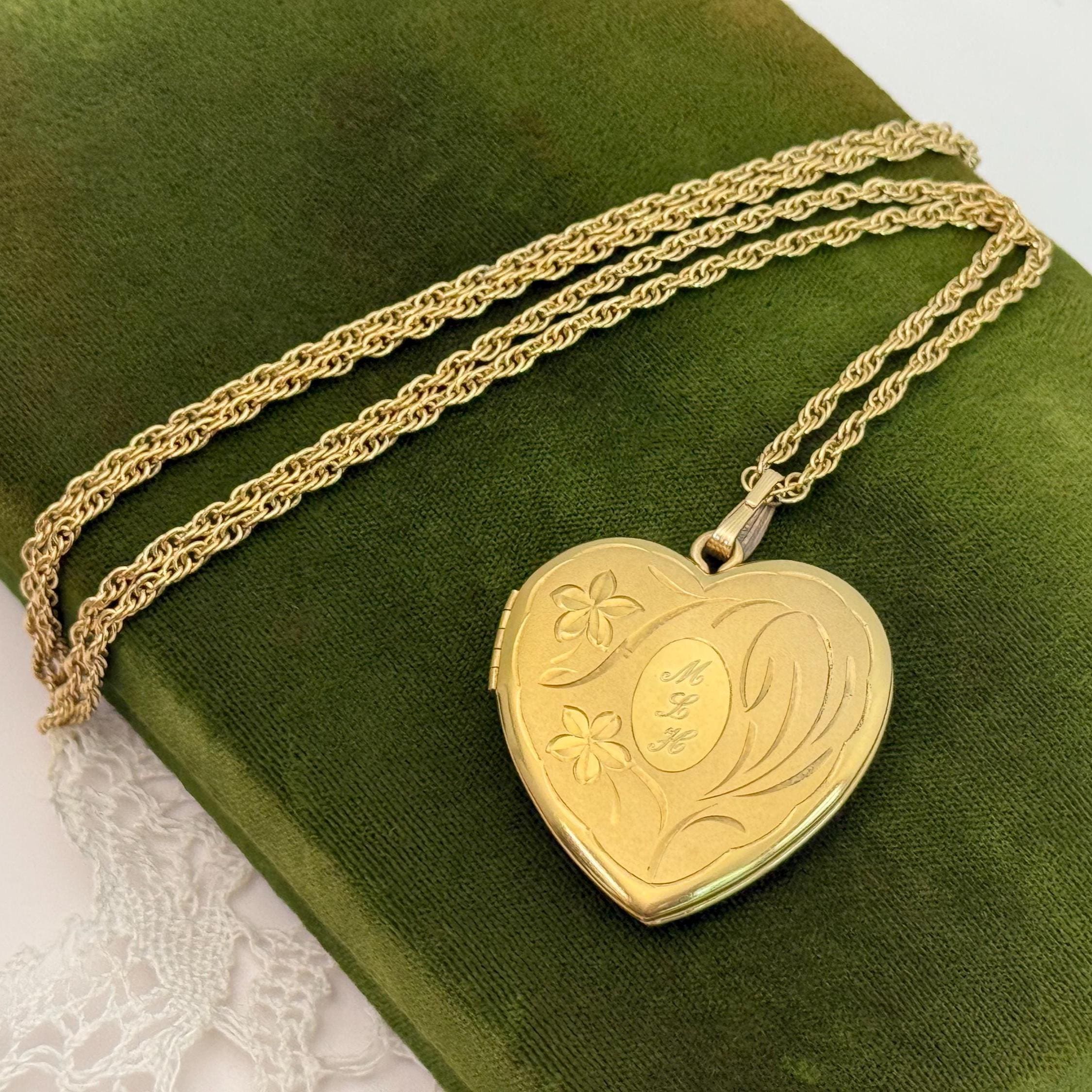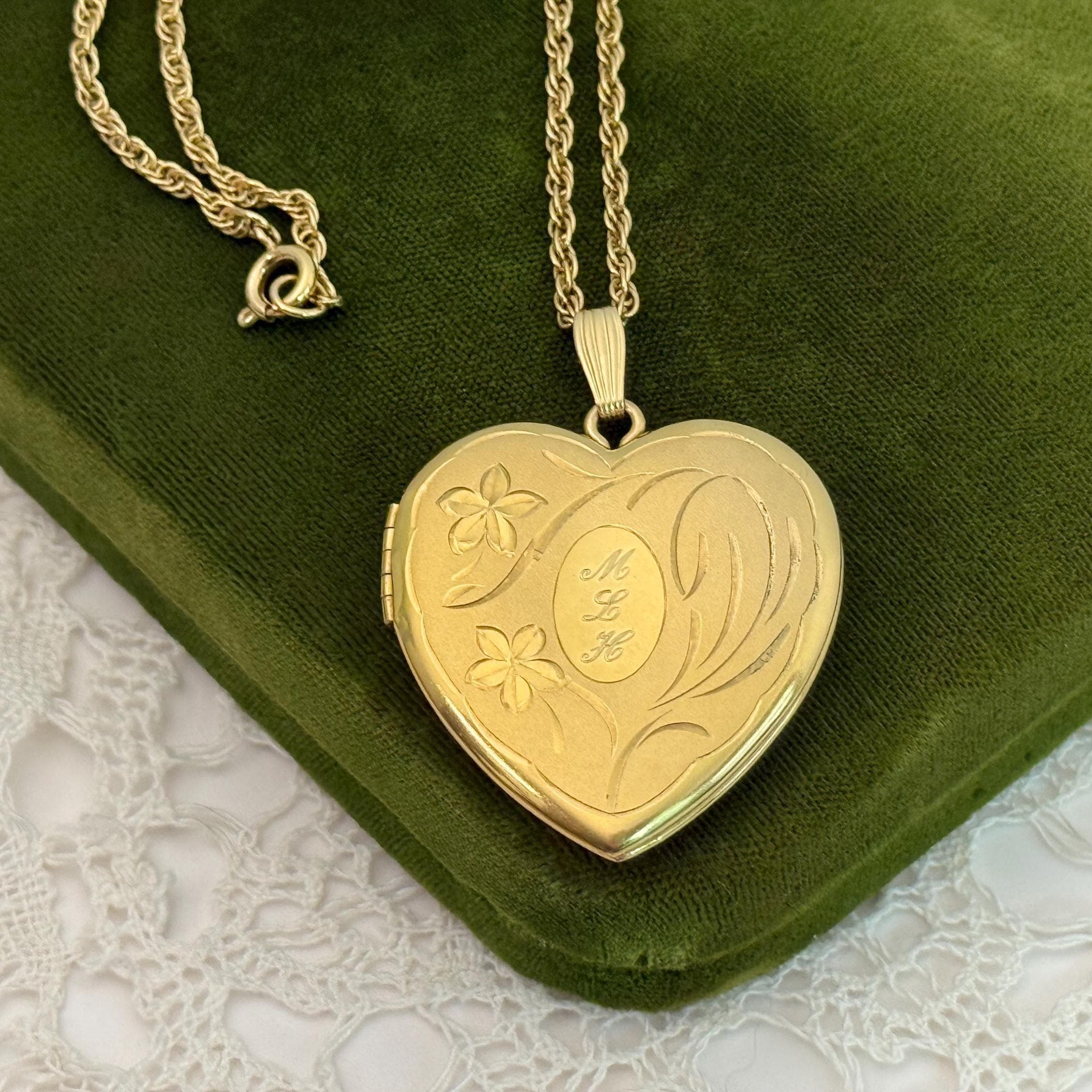 A vintage 12K gold filled large etched heart shaped locket that hangs from a long 12K gold filled rope chain. The front of this large heart locket features an etched design of a flower and slender leaves around the edges with the letters "MLH" written in cursive inside an oval cartouche in the very center. The back of the locket is plain with no design and has a shiny finish.