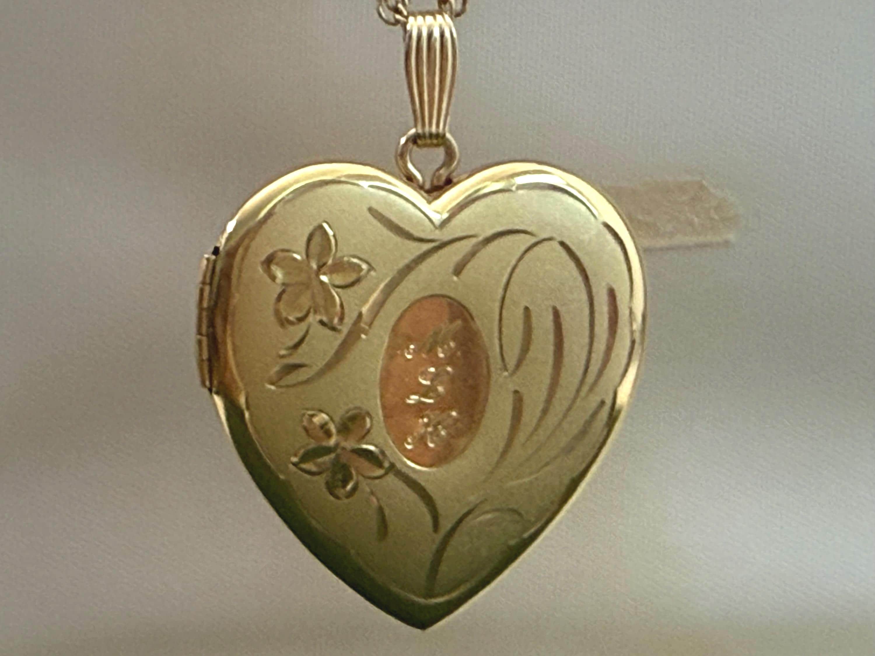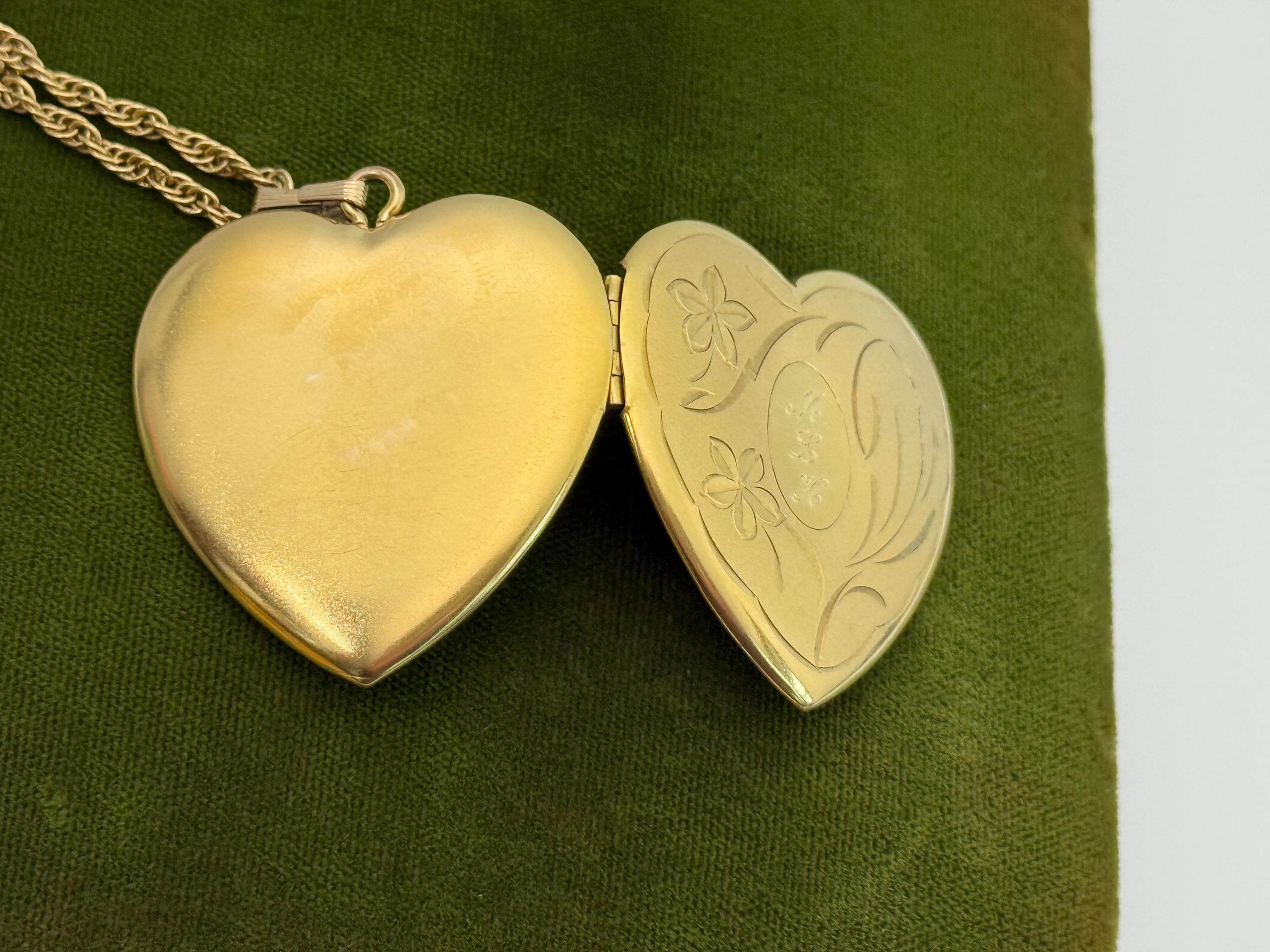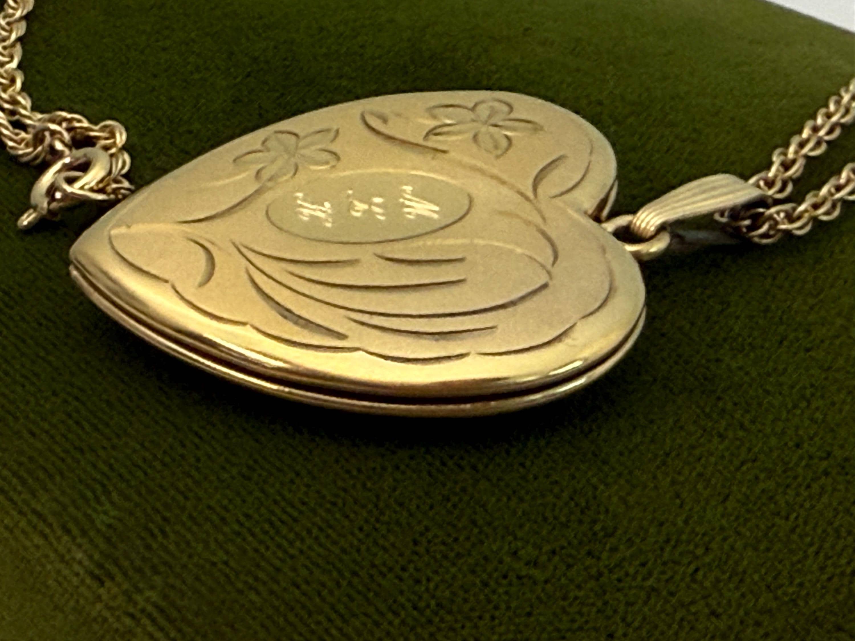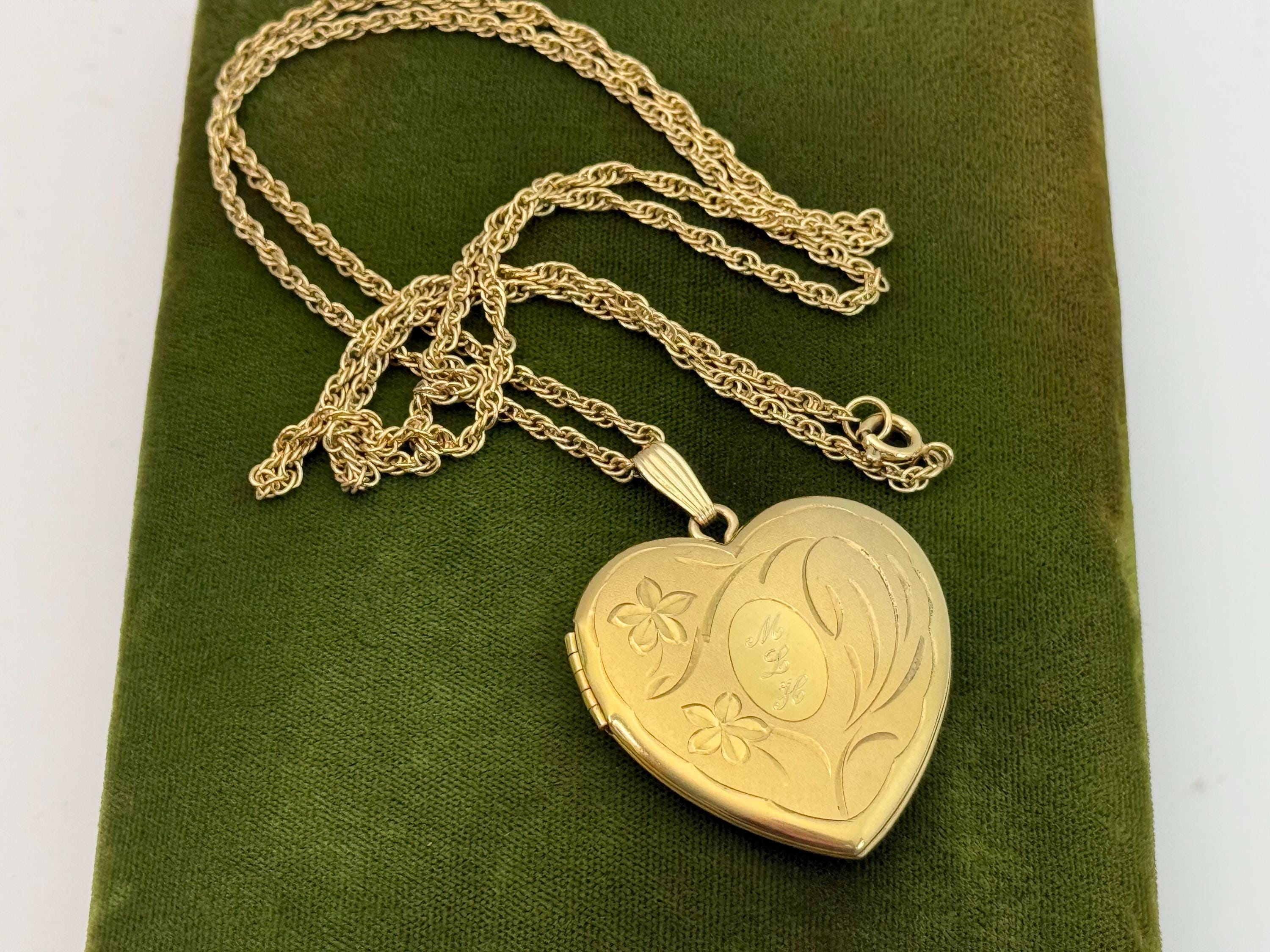 A vintage 12K gold filled large etched heart shaped locket that hangs from a long 12K gold filled rope chain. The front of this large heart locket features an etched design of a flower and slender leaves around the edges with the letters "MLH" written in cursive inside an oval cartouche in the very center. The back of the locket is plain with no design and has a shiny finish.