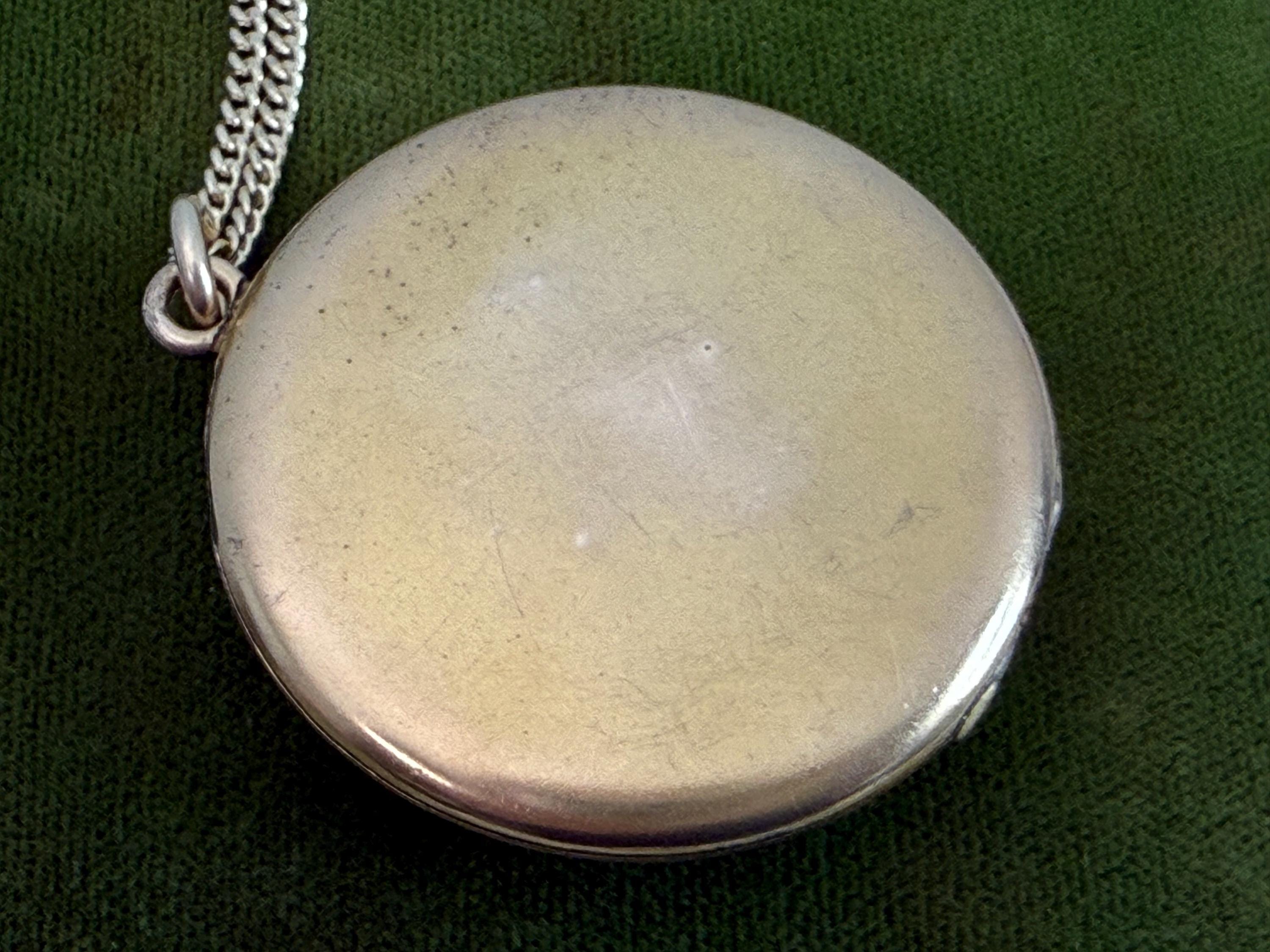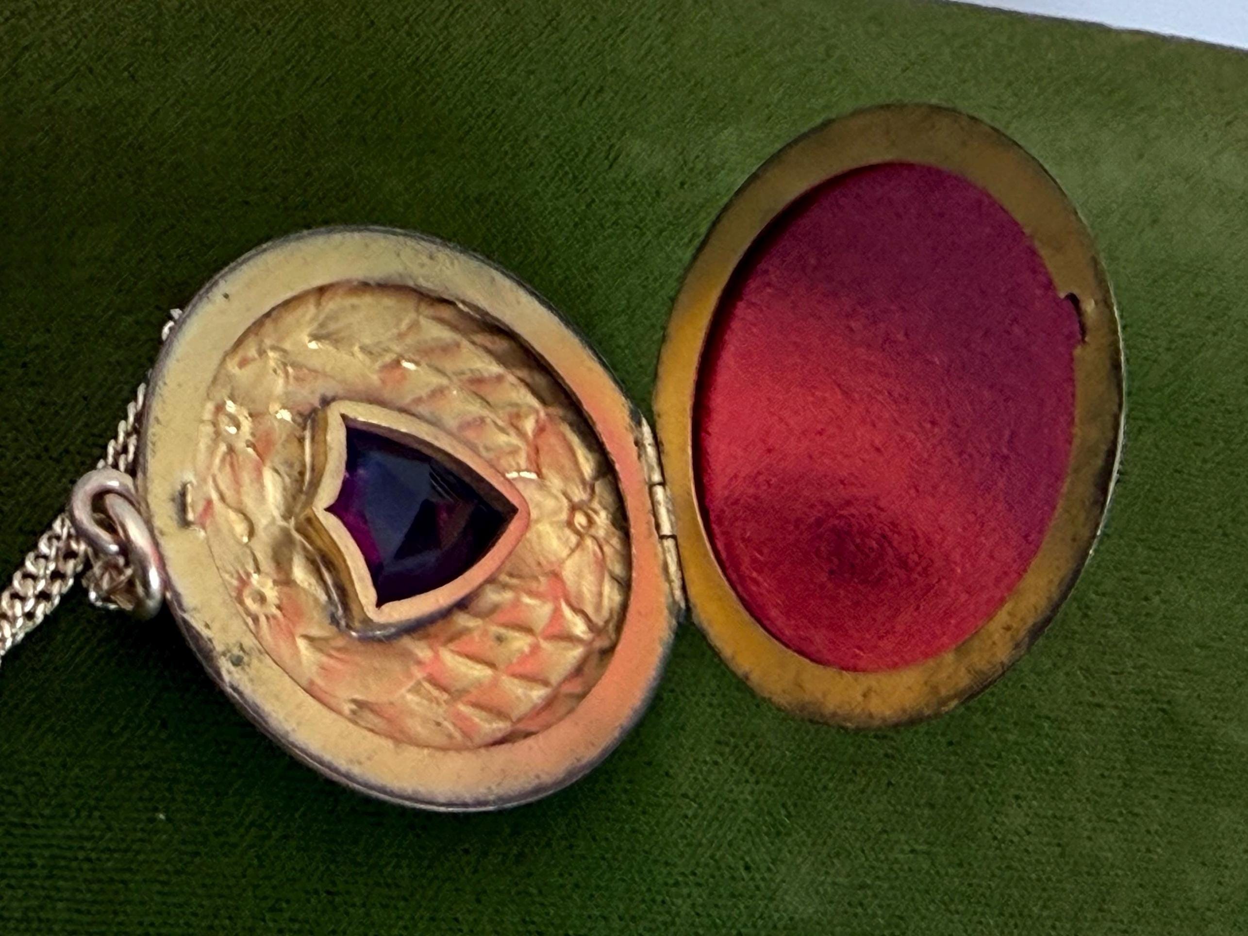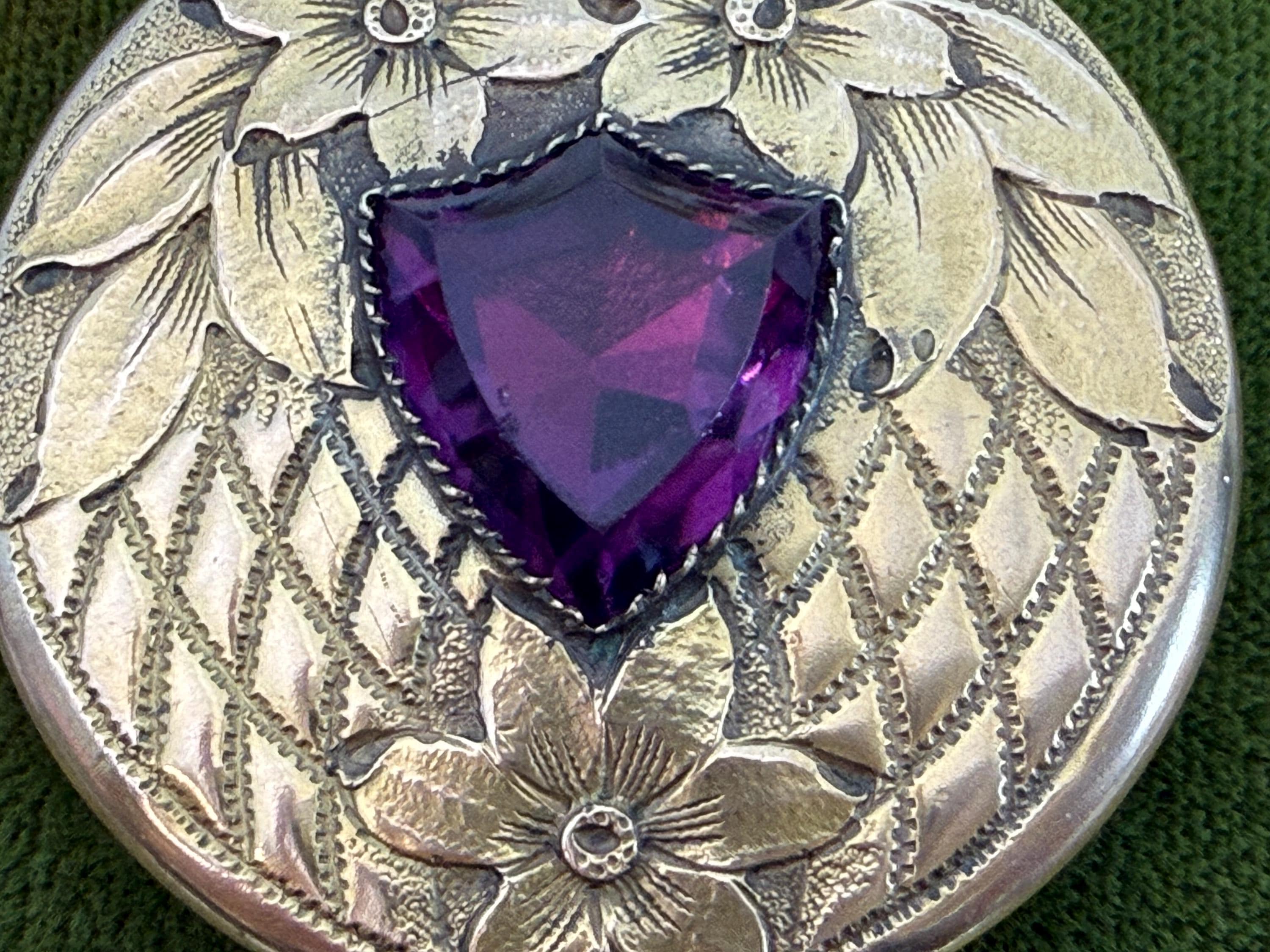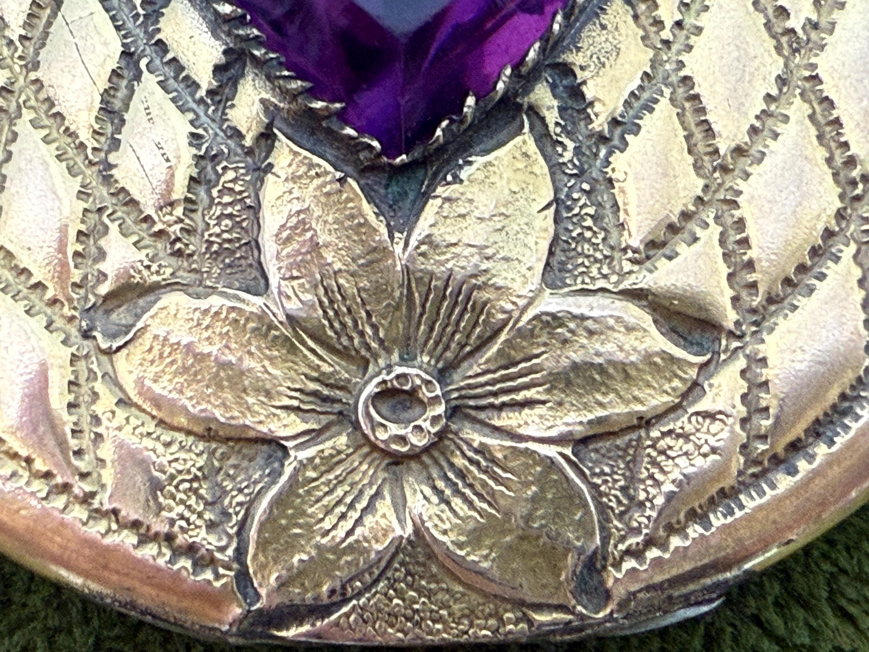 On the top of the locket, and below the purple glass stone are raised flowers. All around the outer edge on the locket front is a diamond shaped repousse design that frames the purple glass stone. The locket that has two wells inside. The bale is a plain round loop.