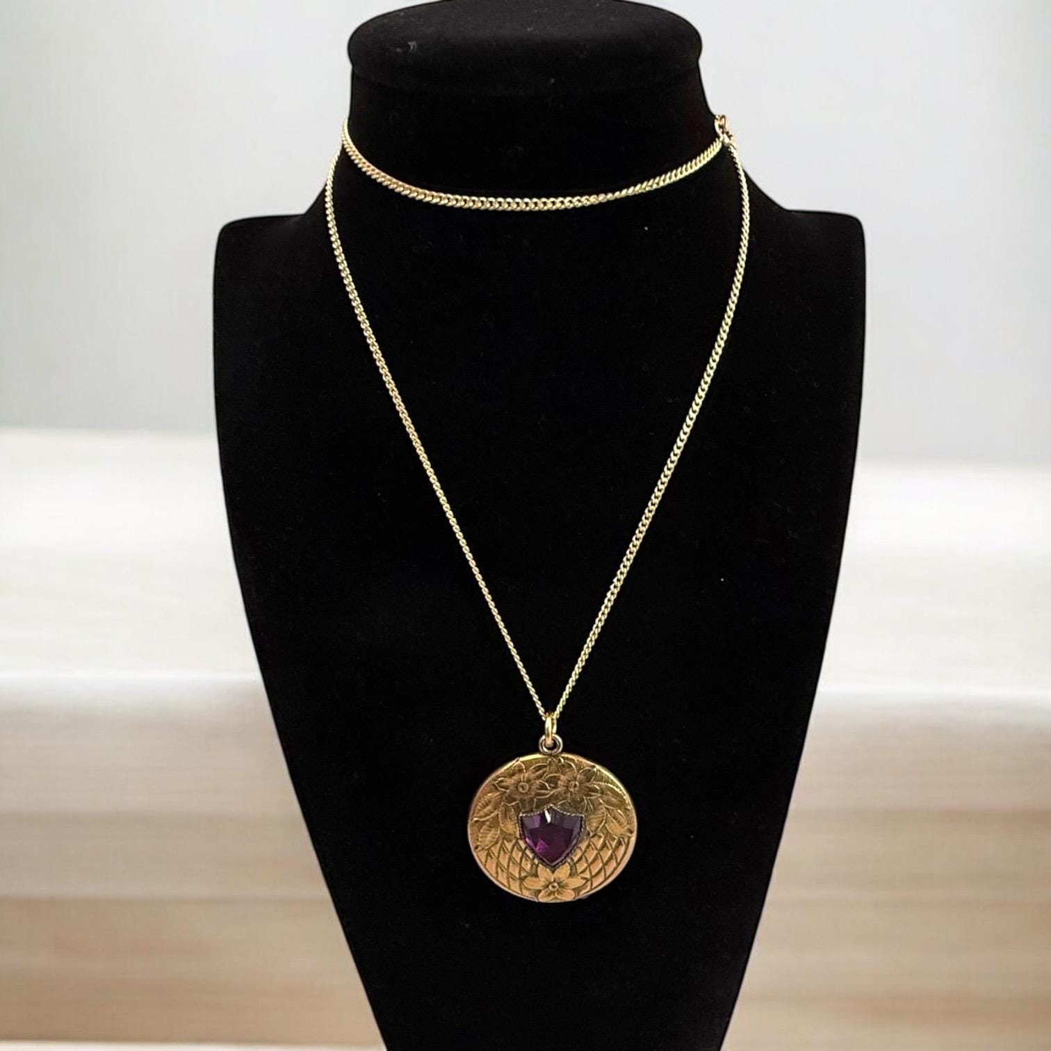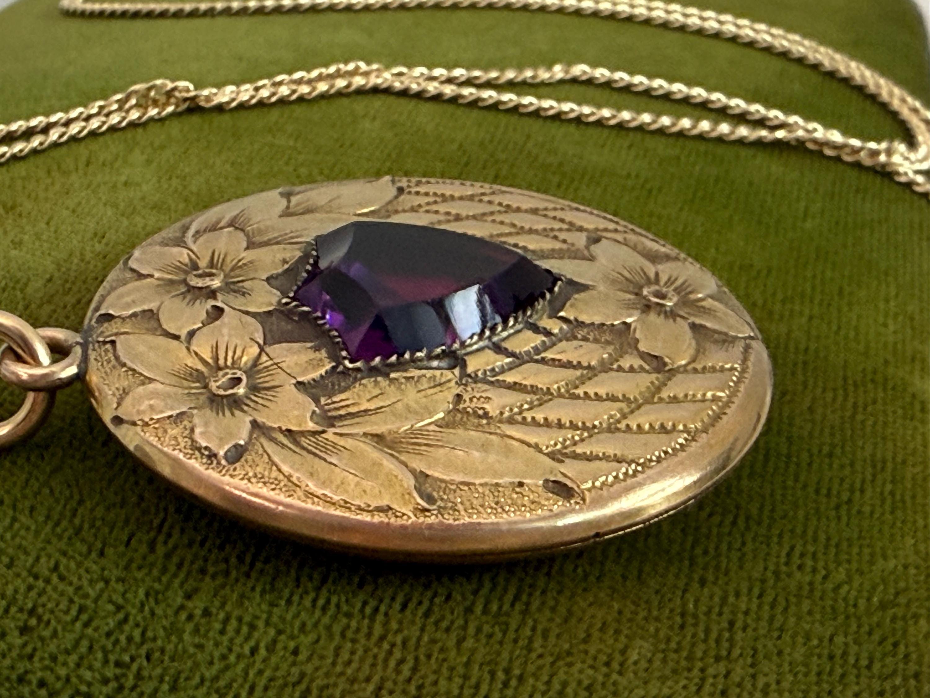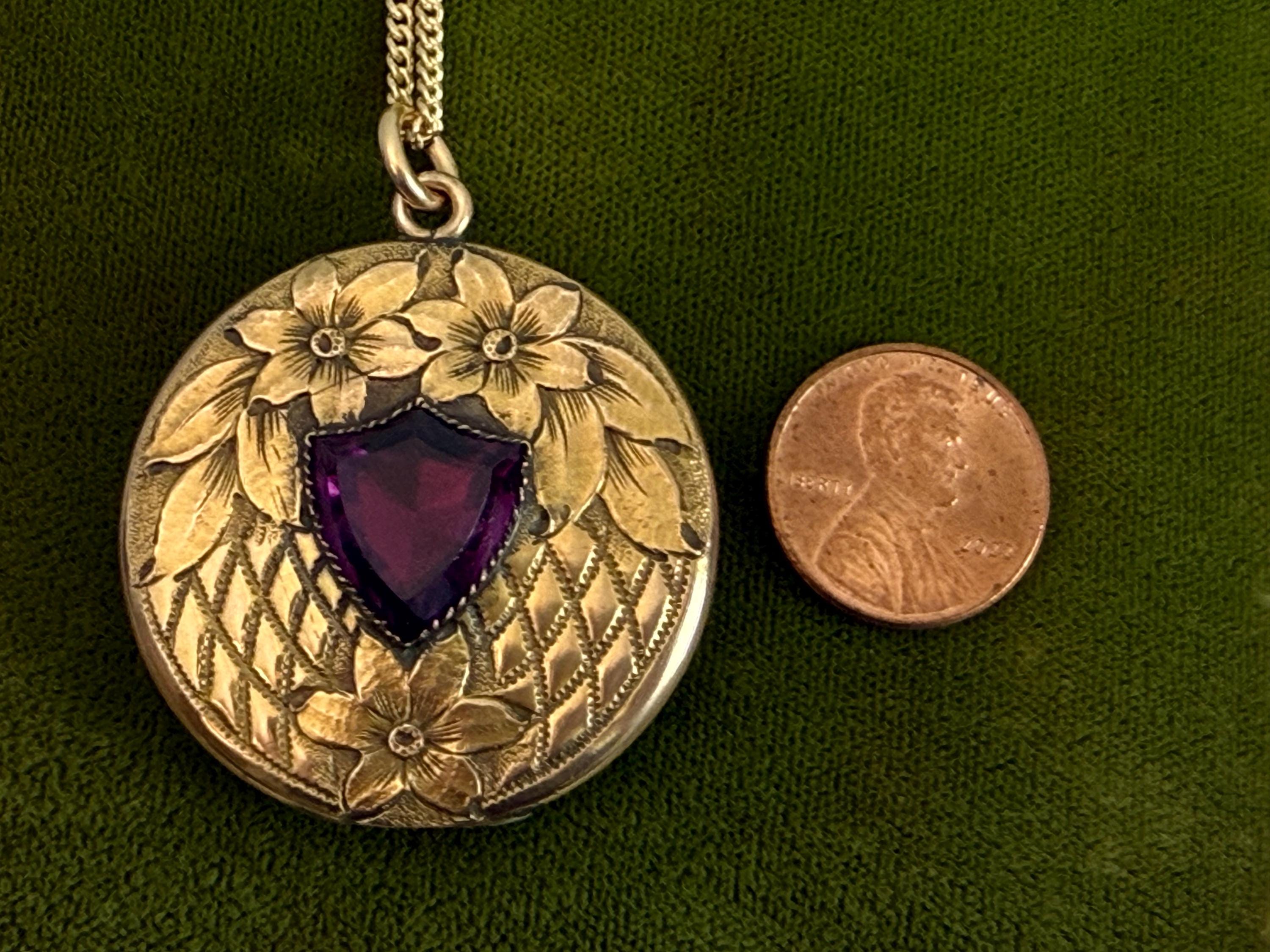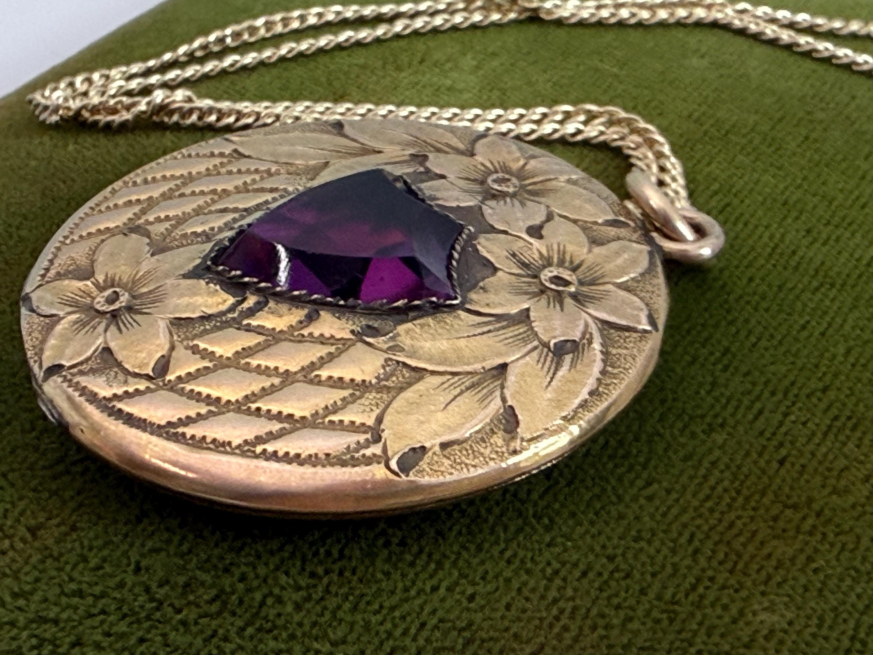 A large vintage gold plated round locket with an ornate design with lovely repousse flowers and a purple glass gem in the center. The glass gem is in a faceted shield shape. The locket hangs from a new 14K gold filled curb chain that is 24” long.