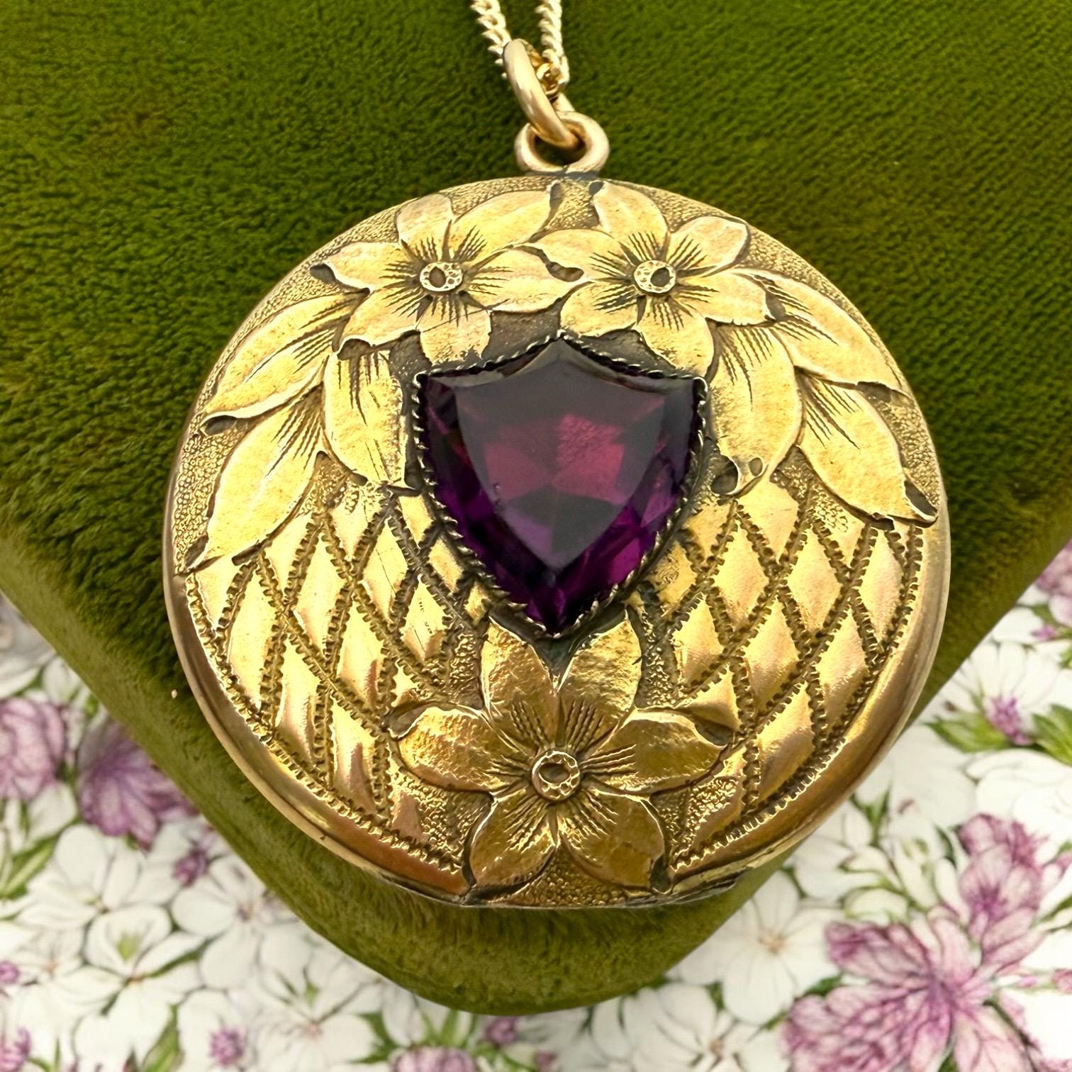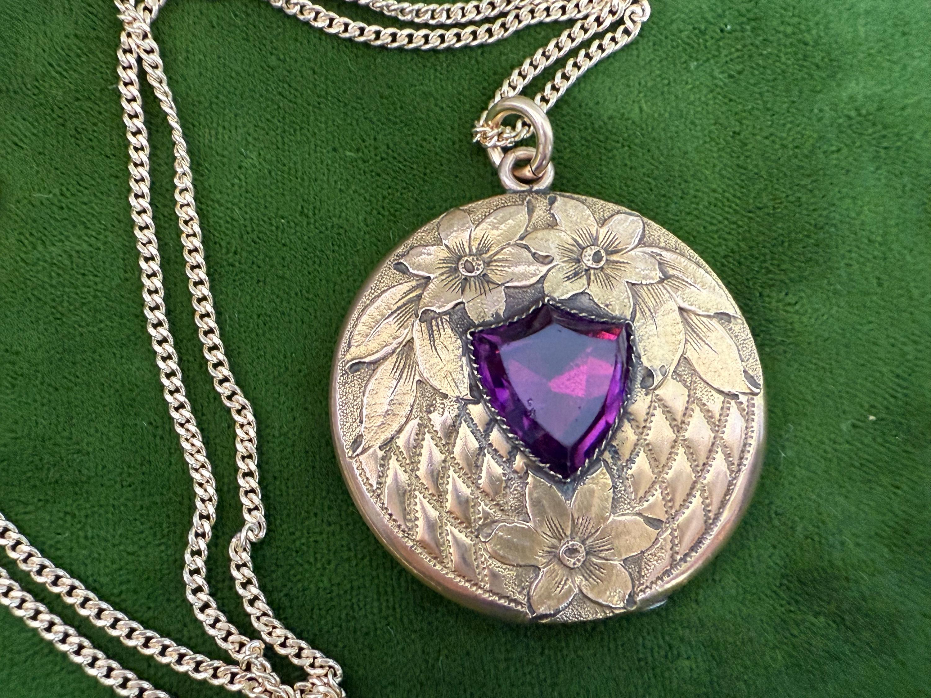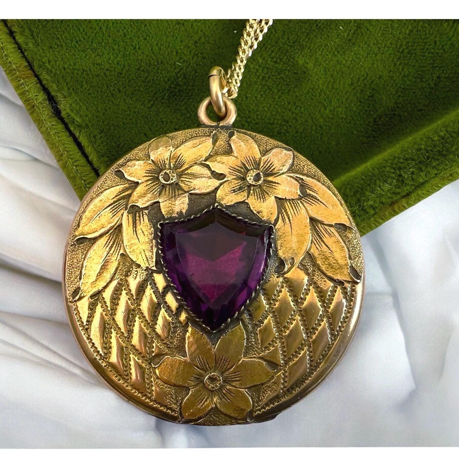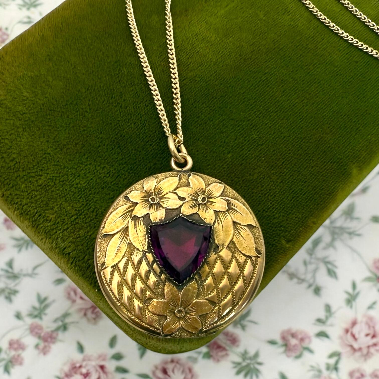 A large vintage gold plated round locket with an ornate design with lovely repousse flowers and a purple glass gem in the center. The glass gem is in a faceted shield shape. The locket hangs from a new 14K gold filled curb chain that is 24” long.