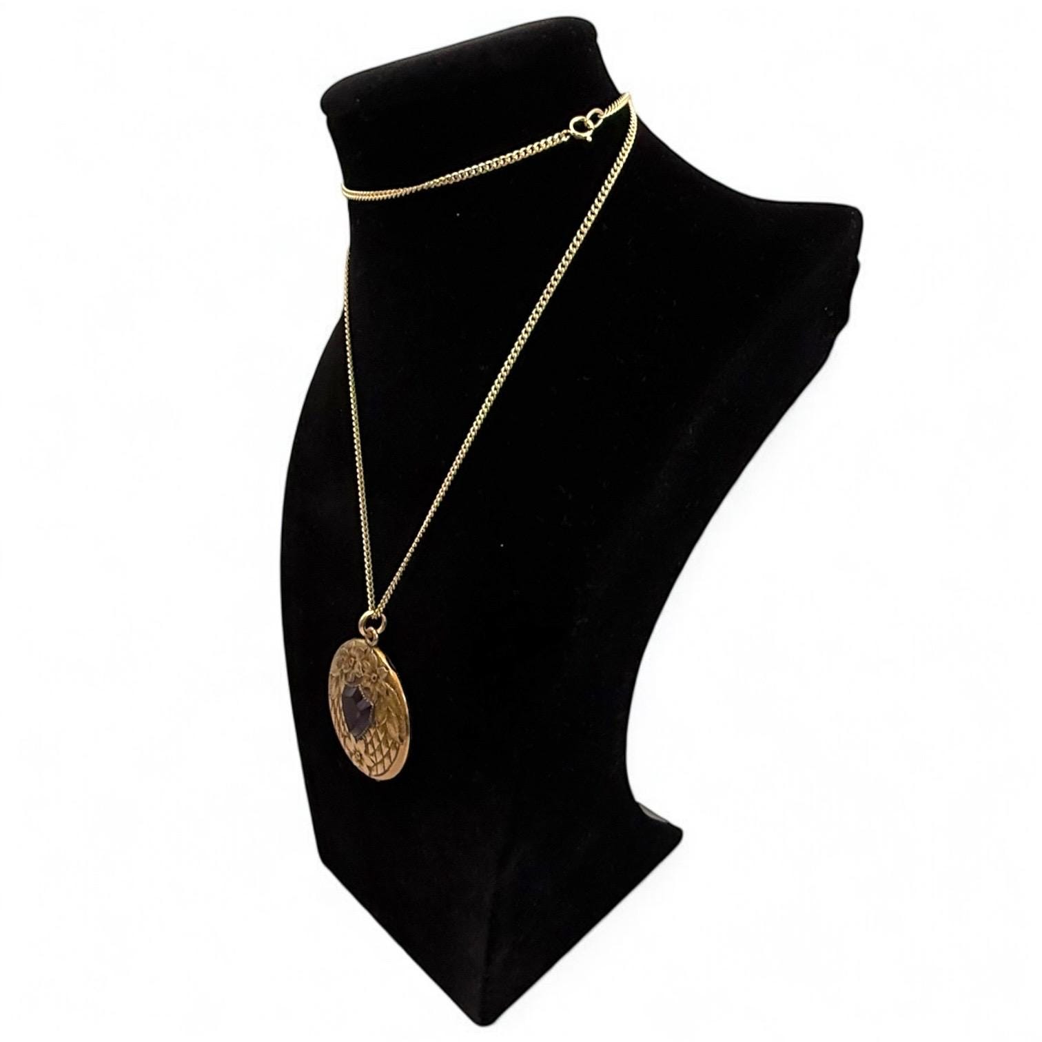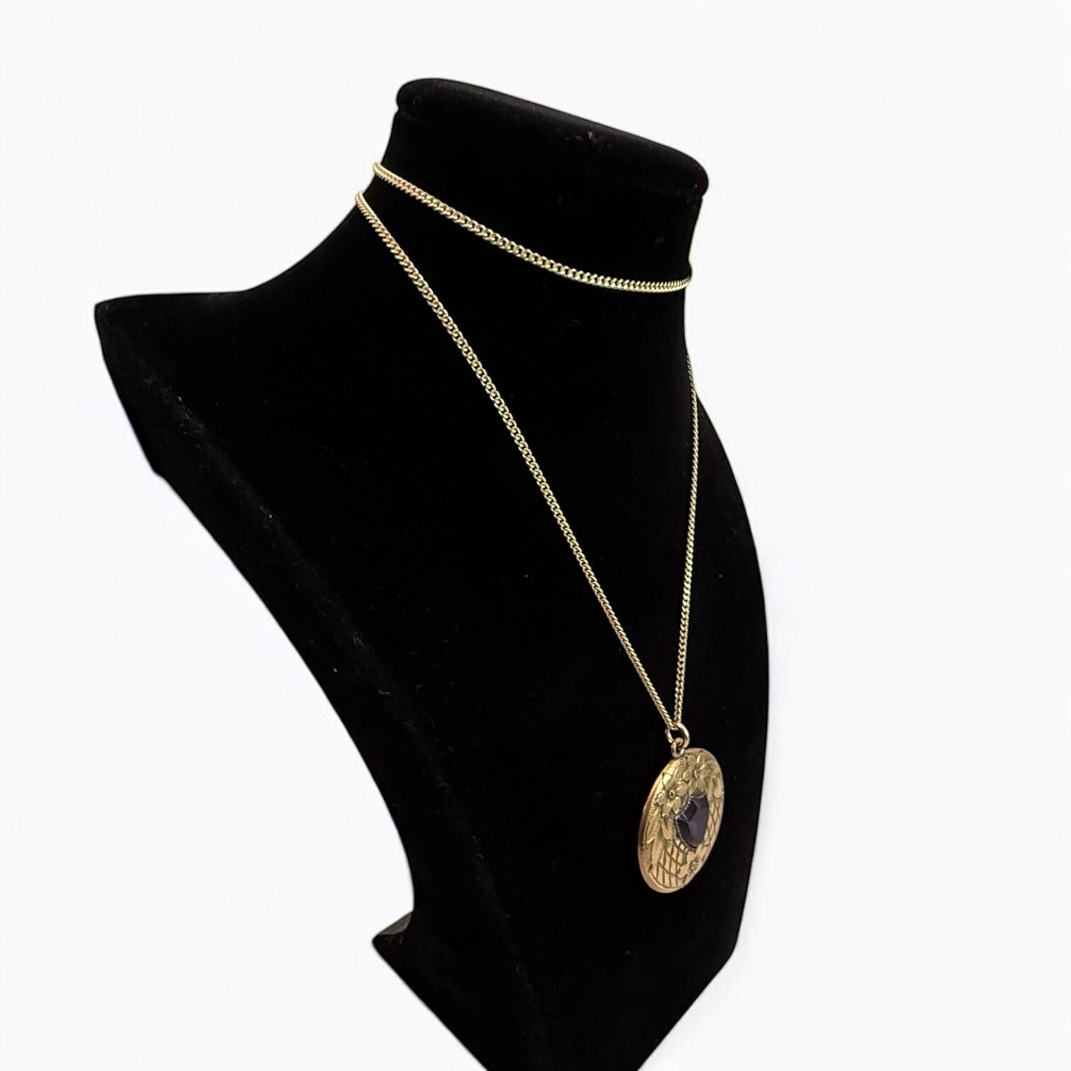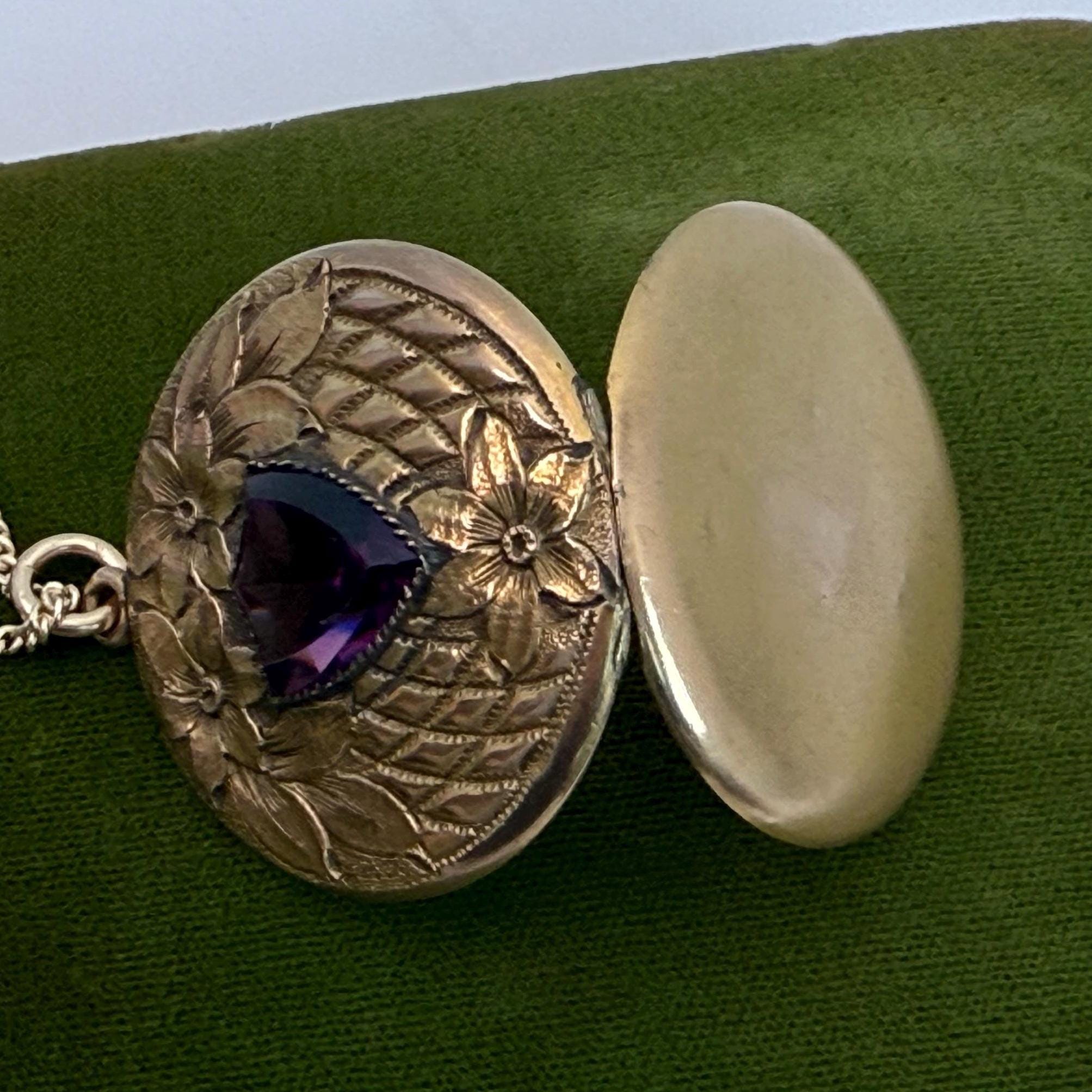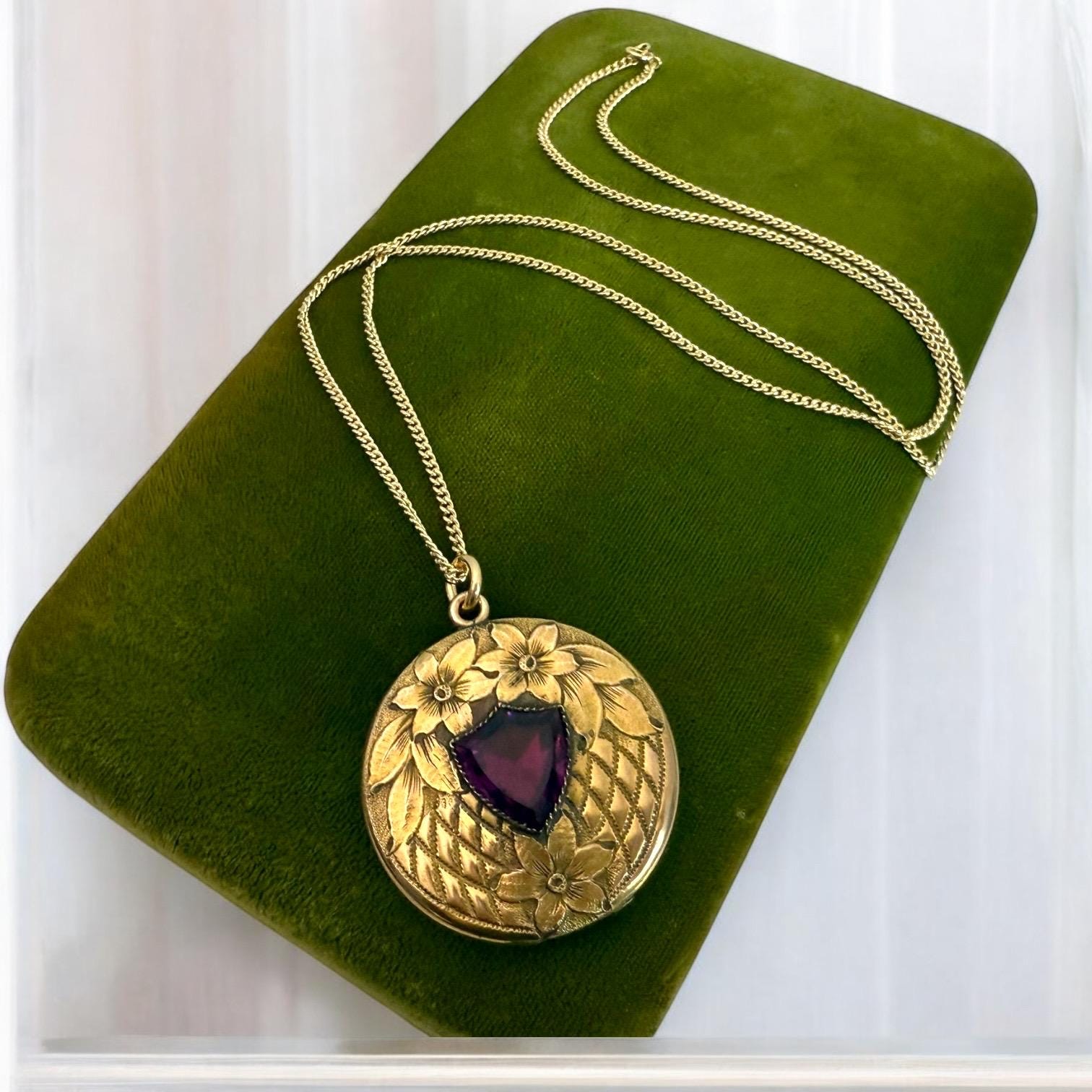 A large vintage gold plated round locket with an ornate design with lovely repousse flowers and a purple glass gem in the center. The glass gem is in a faceted shield shape. The locket hangs from a new 14K gold filled curb chain that is 24” long.