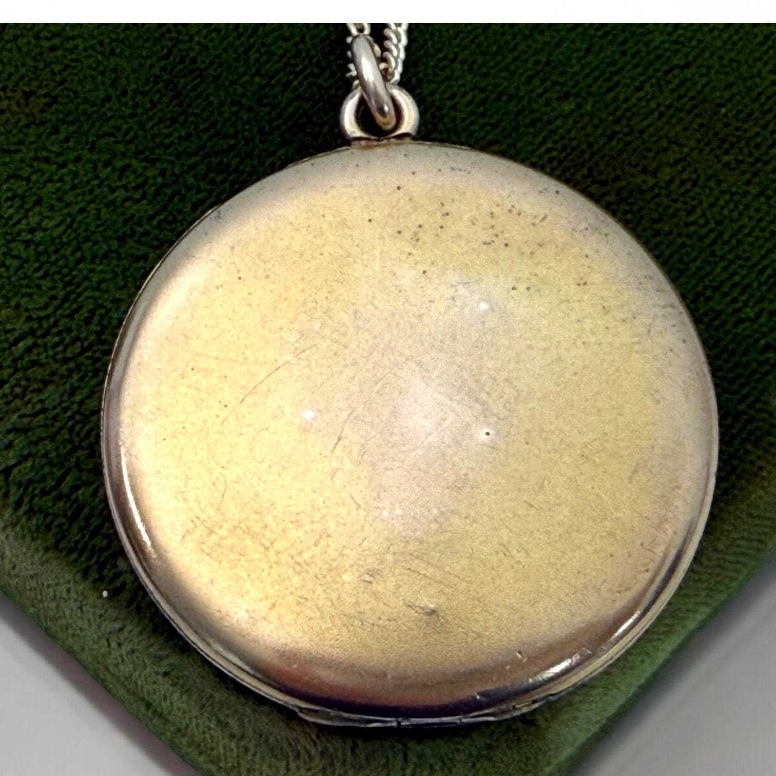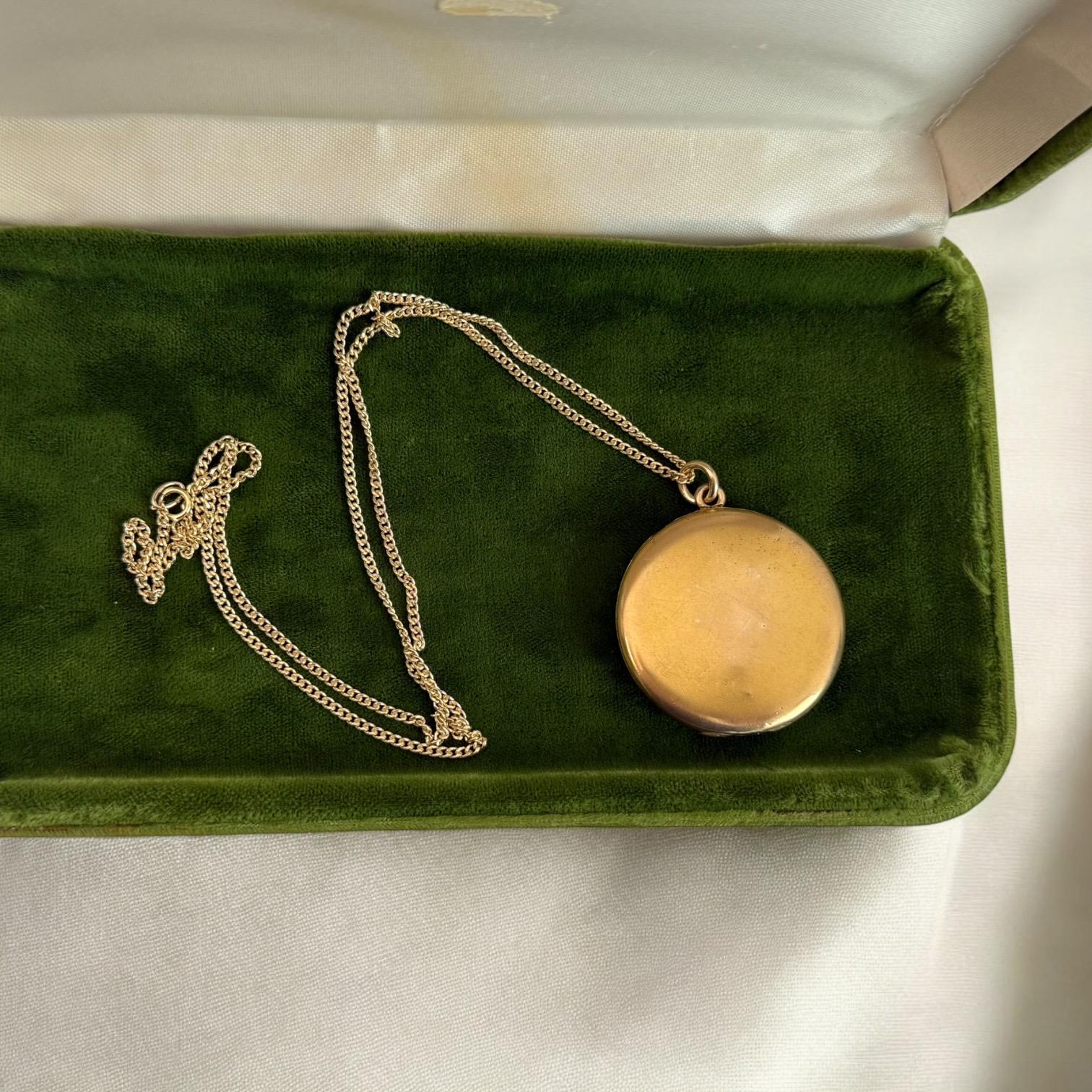 The vintage gold plated locket hangs from a new and 24" long 14K gold filled curb chain that secures with a spring clasp.