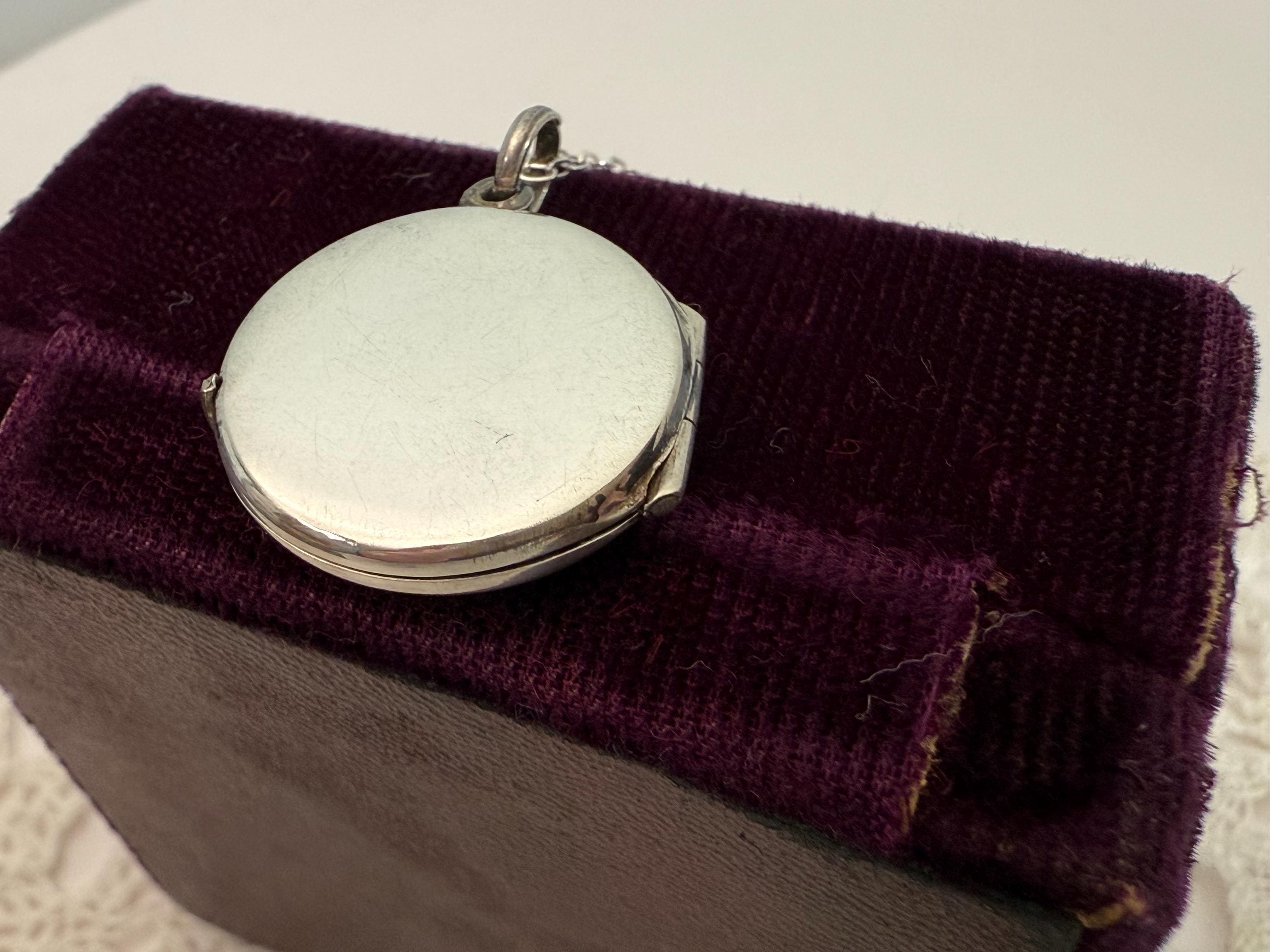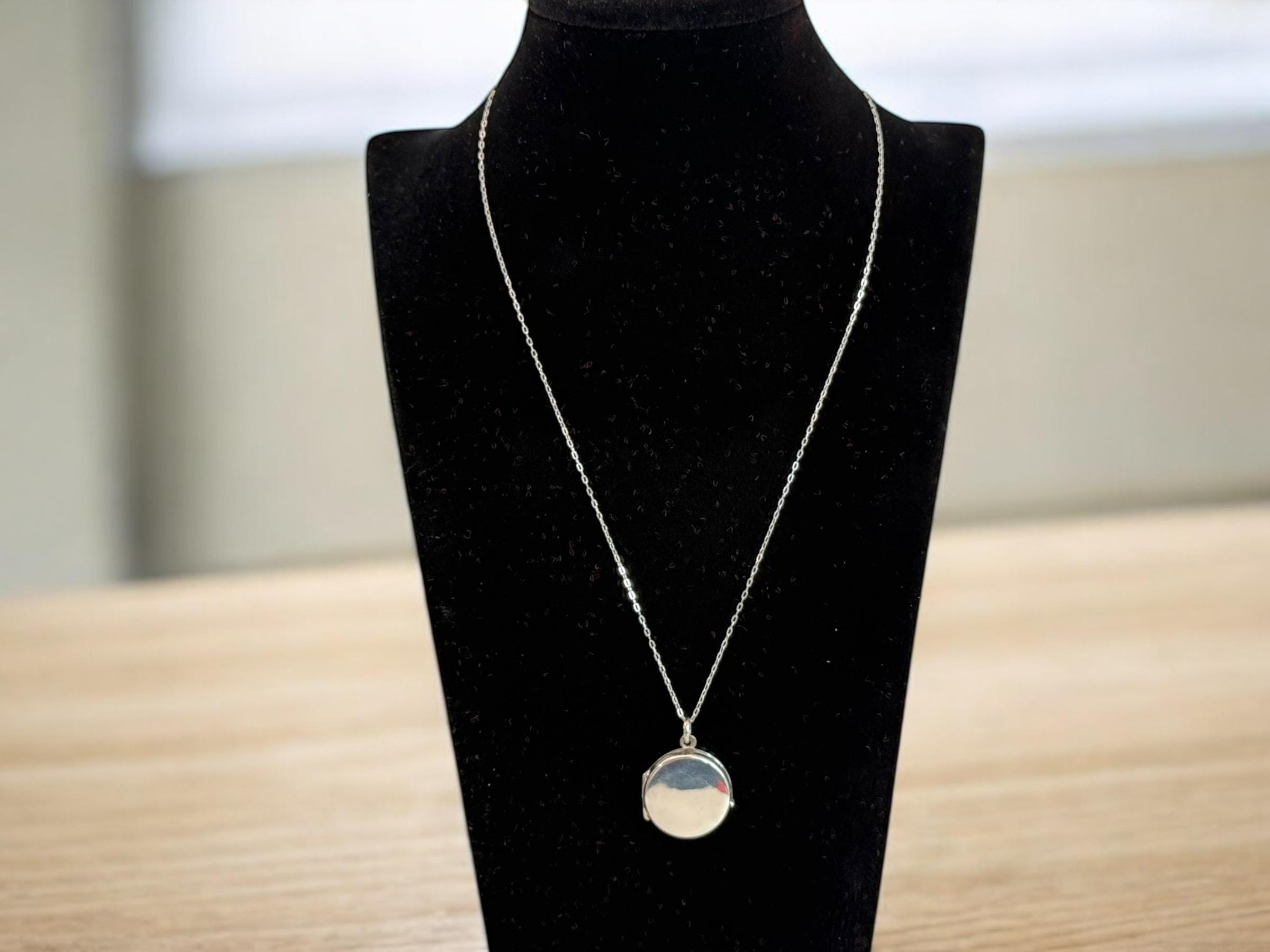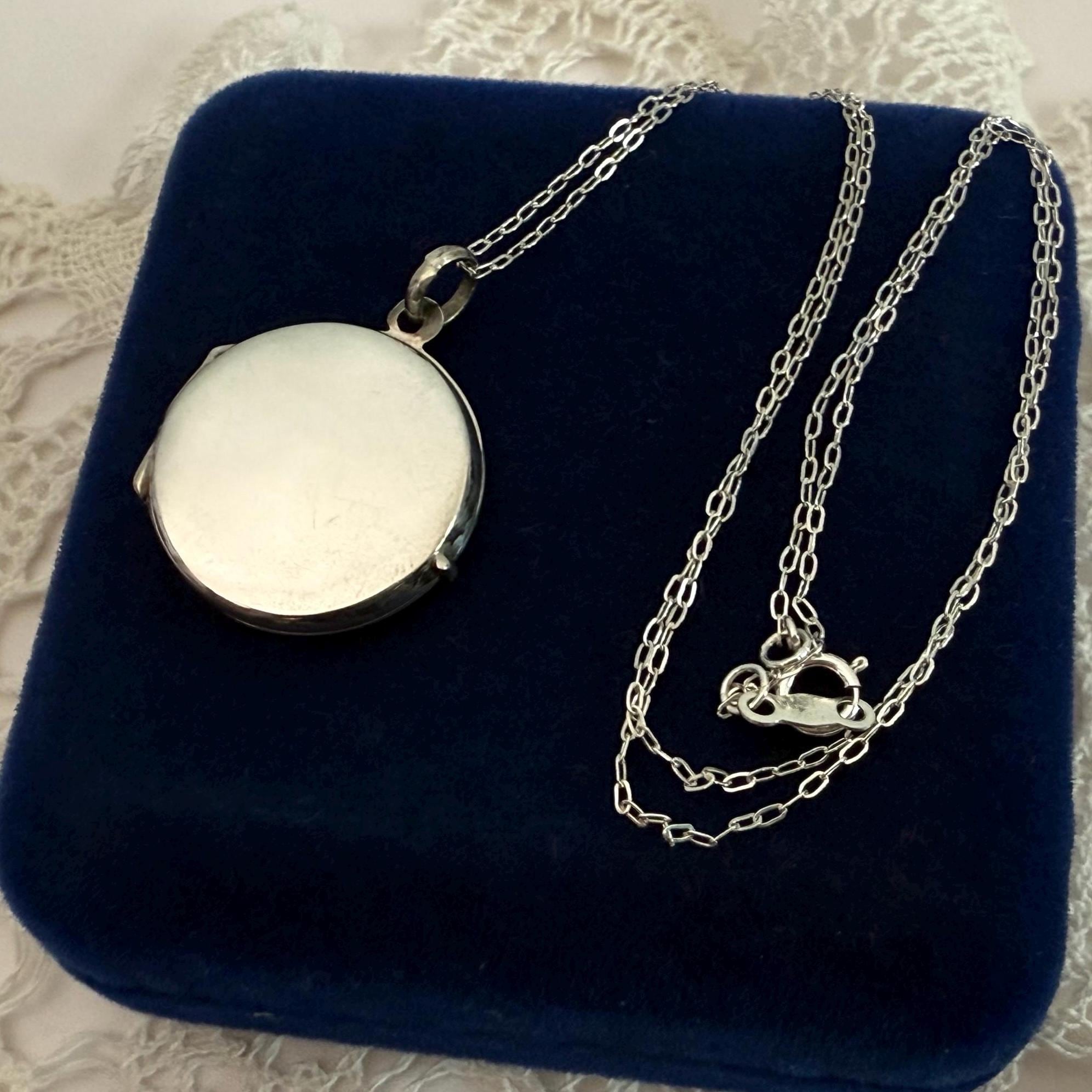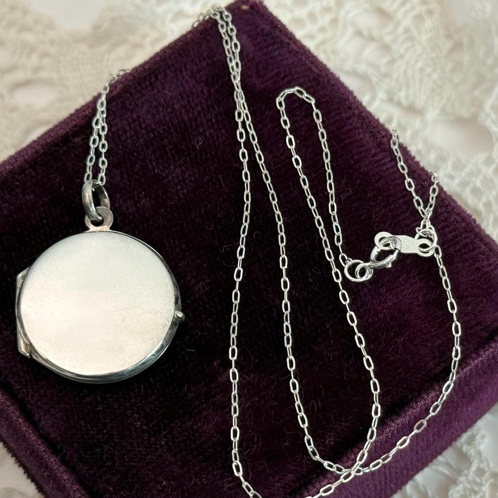 A vintage round Sterling Silver locket hanging on a fine new Sterling Silver 18” long chain. The front and the back of this locket are plain with no design. The closure for the locket is a small fold over clasp.