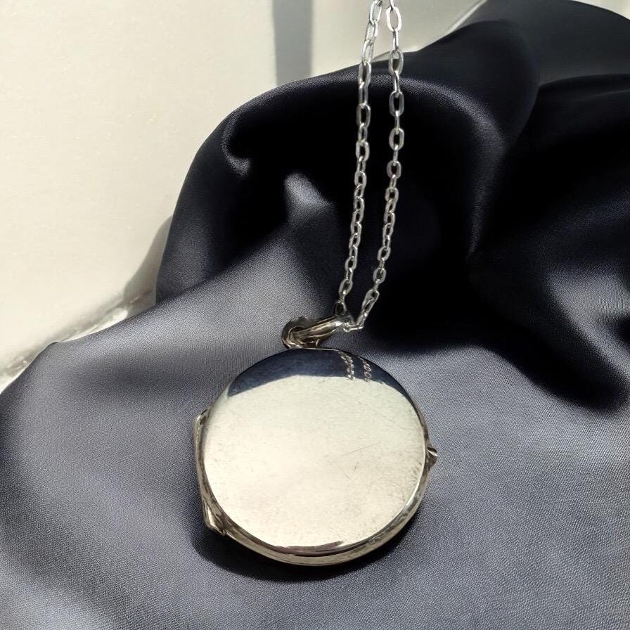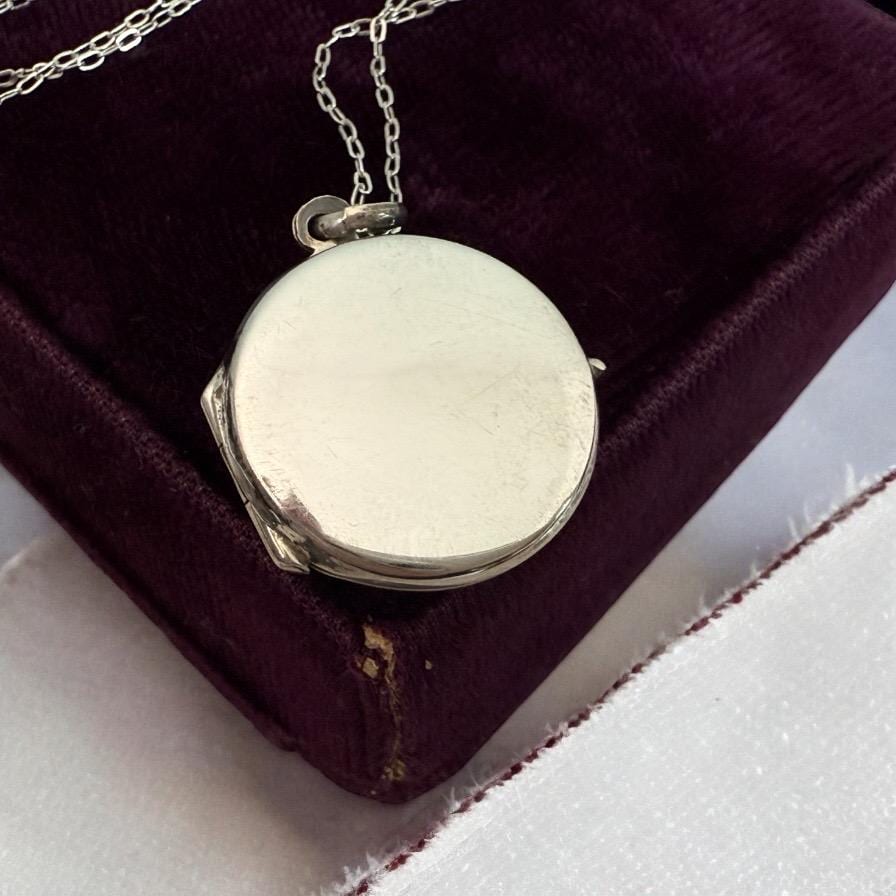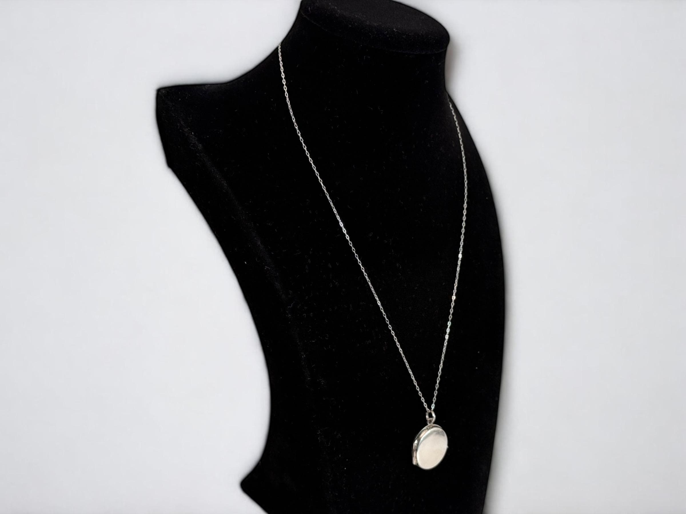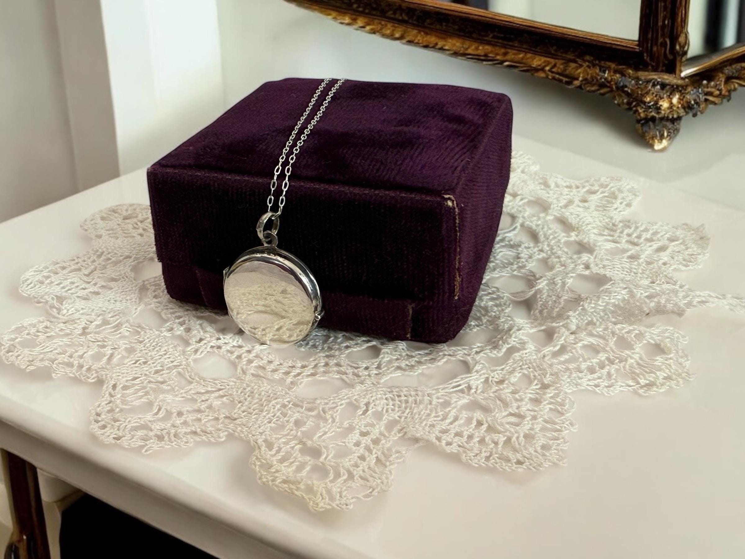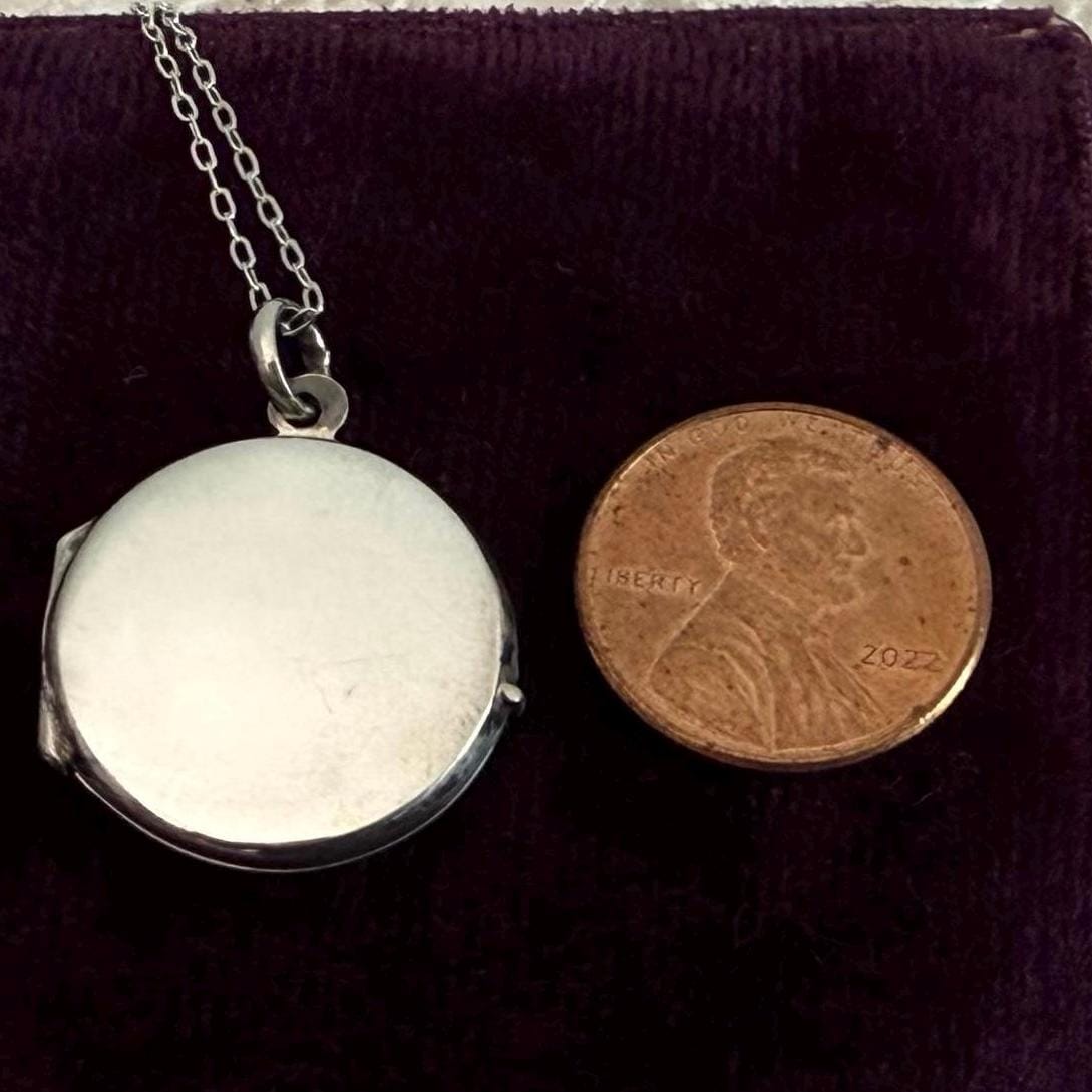 A vintage round Sterling Silver locket hanging on a fine new Sterling Silver 18” long chain. The front and the back of this locket are plain with no design. The closure for the locket is a small fold over clasp.