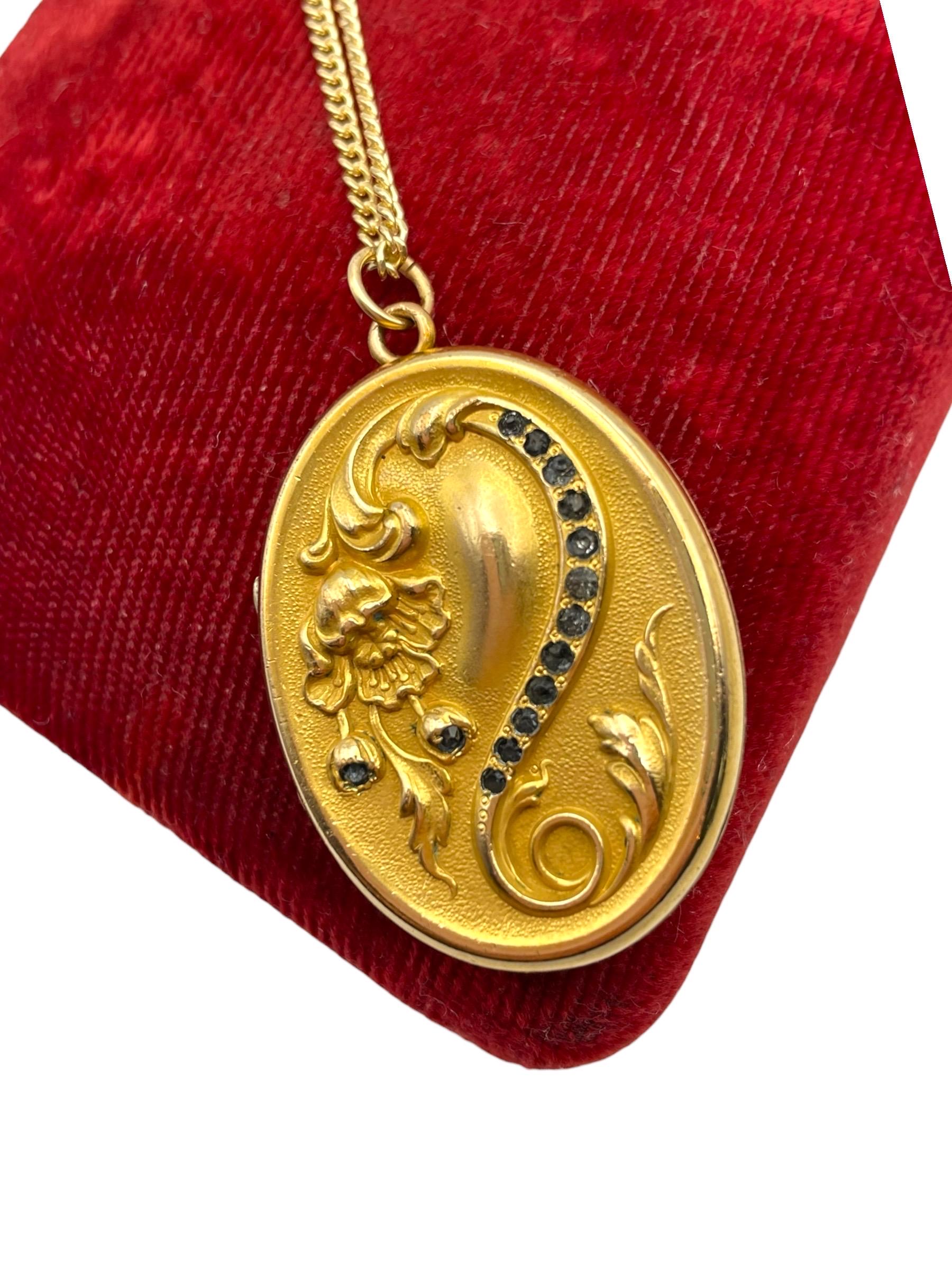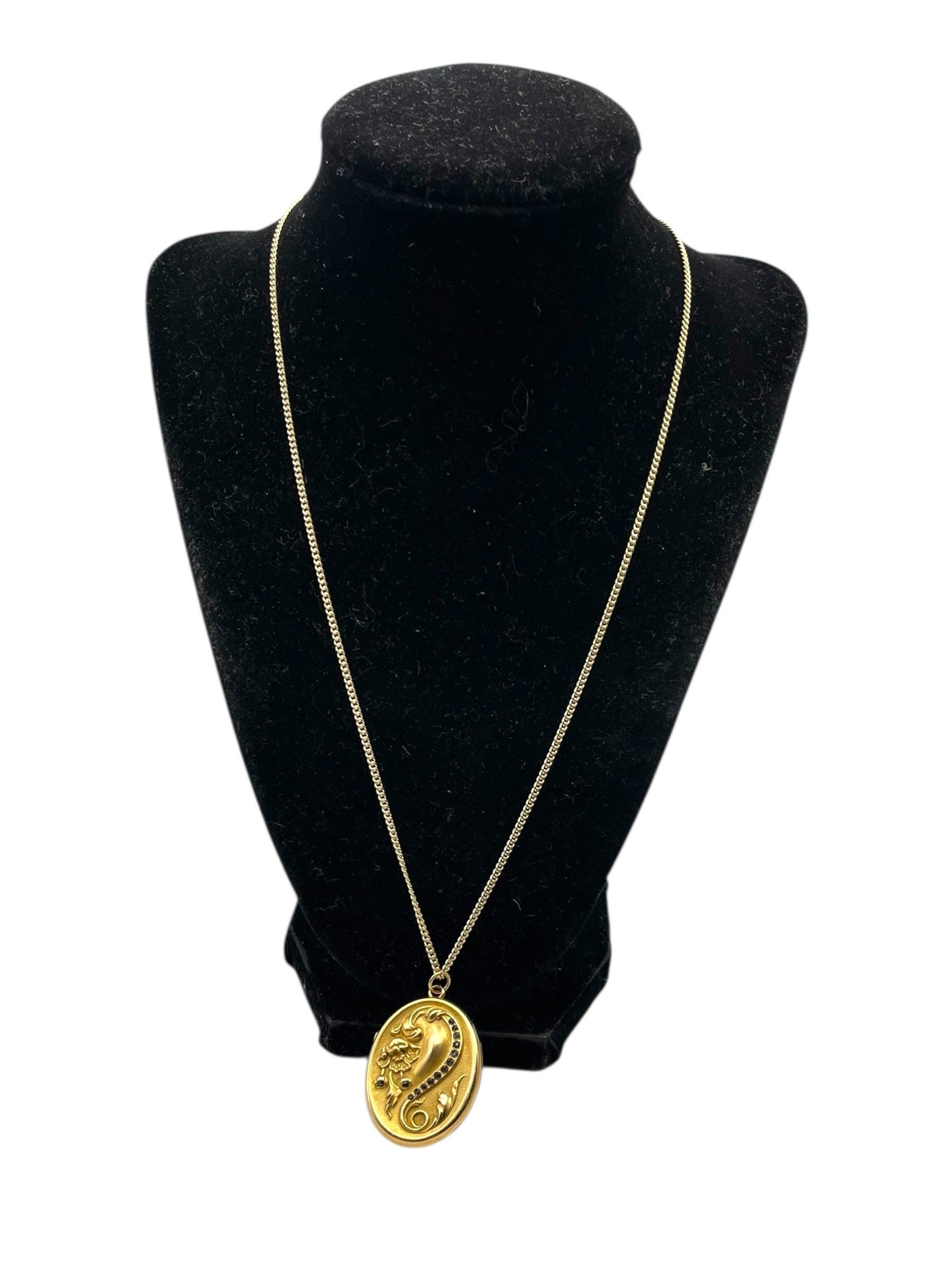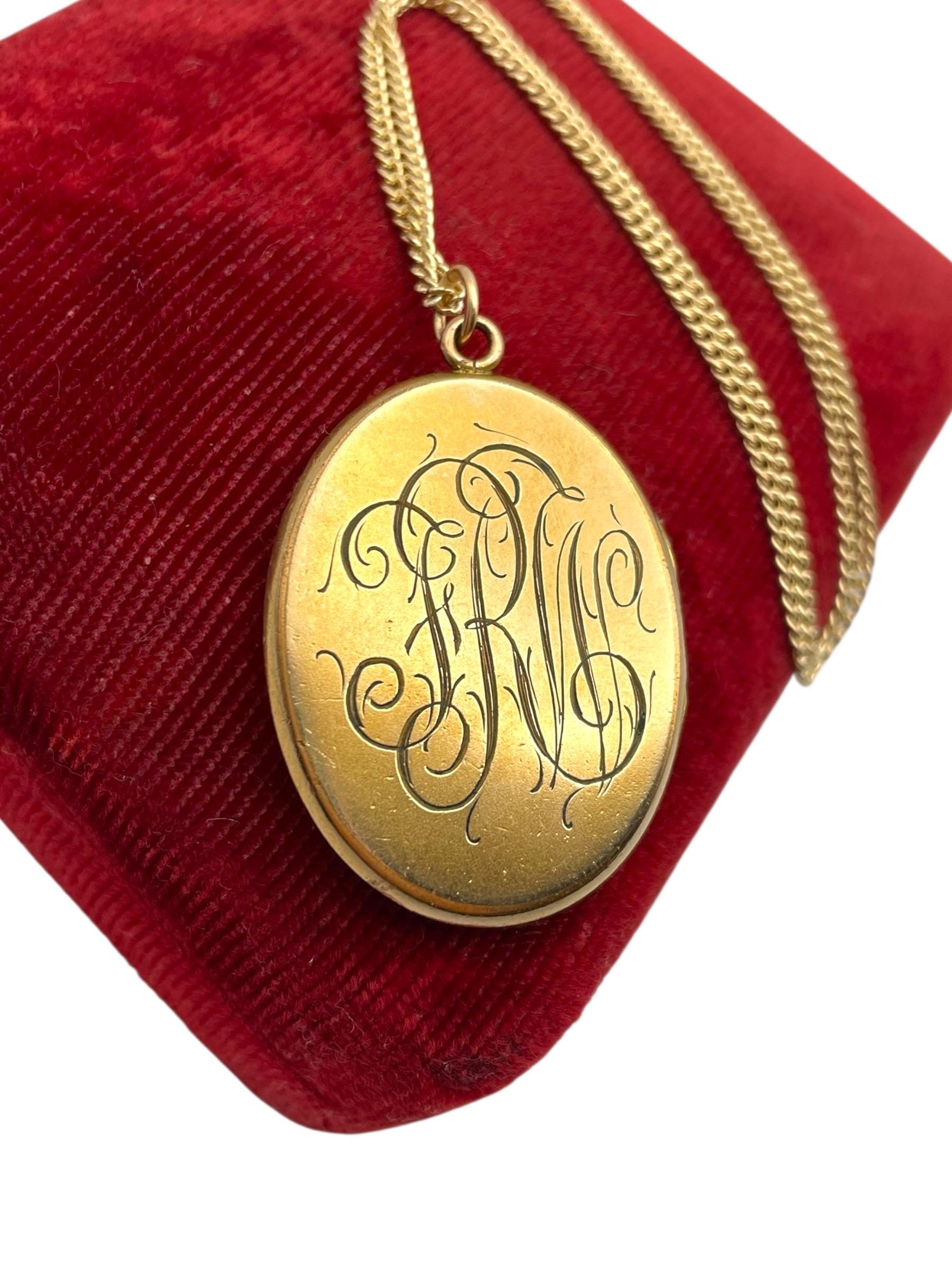 The vintage locket hangs on a new curb chain, 22” long that is 14K gold filled. This locket can be purchased with or without the chain.