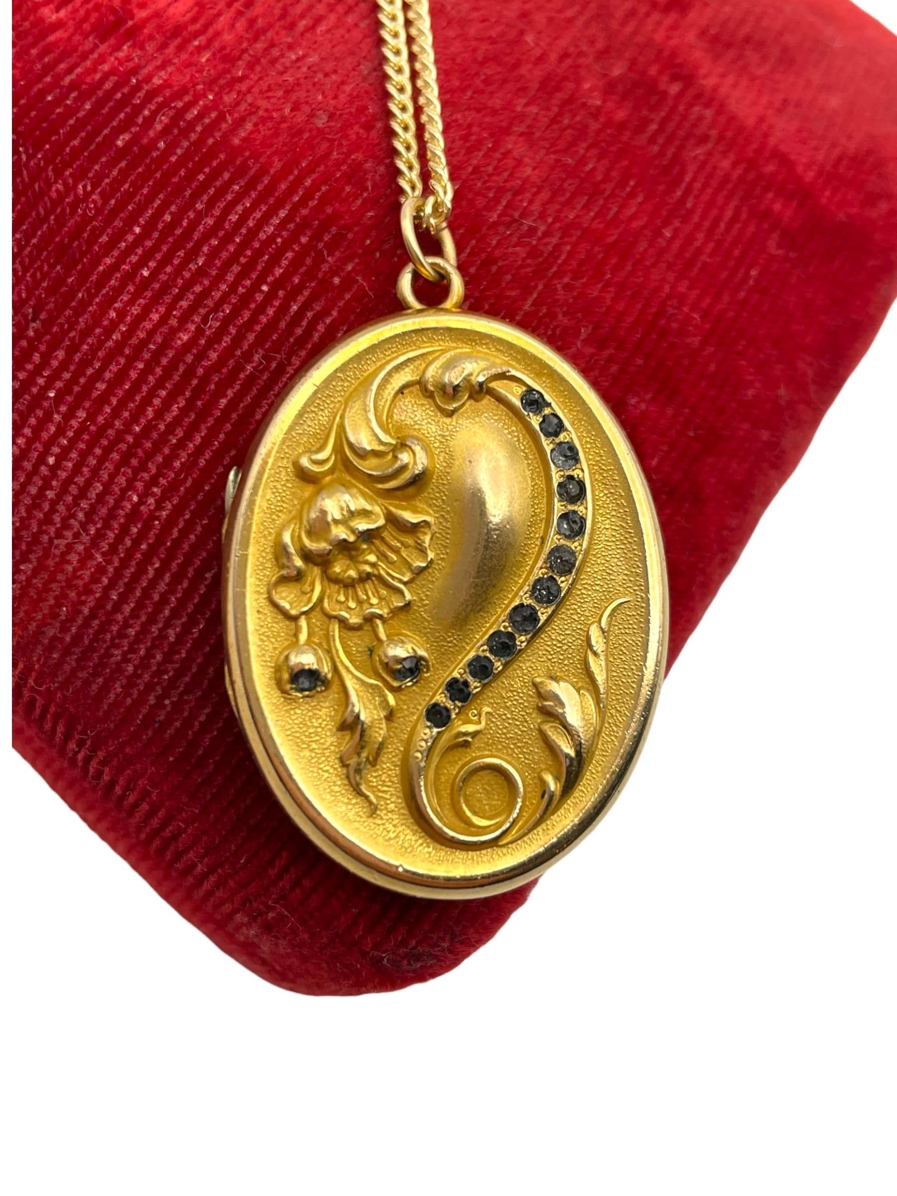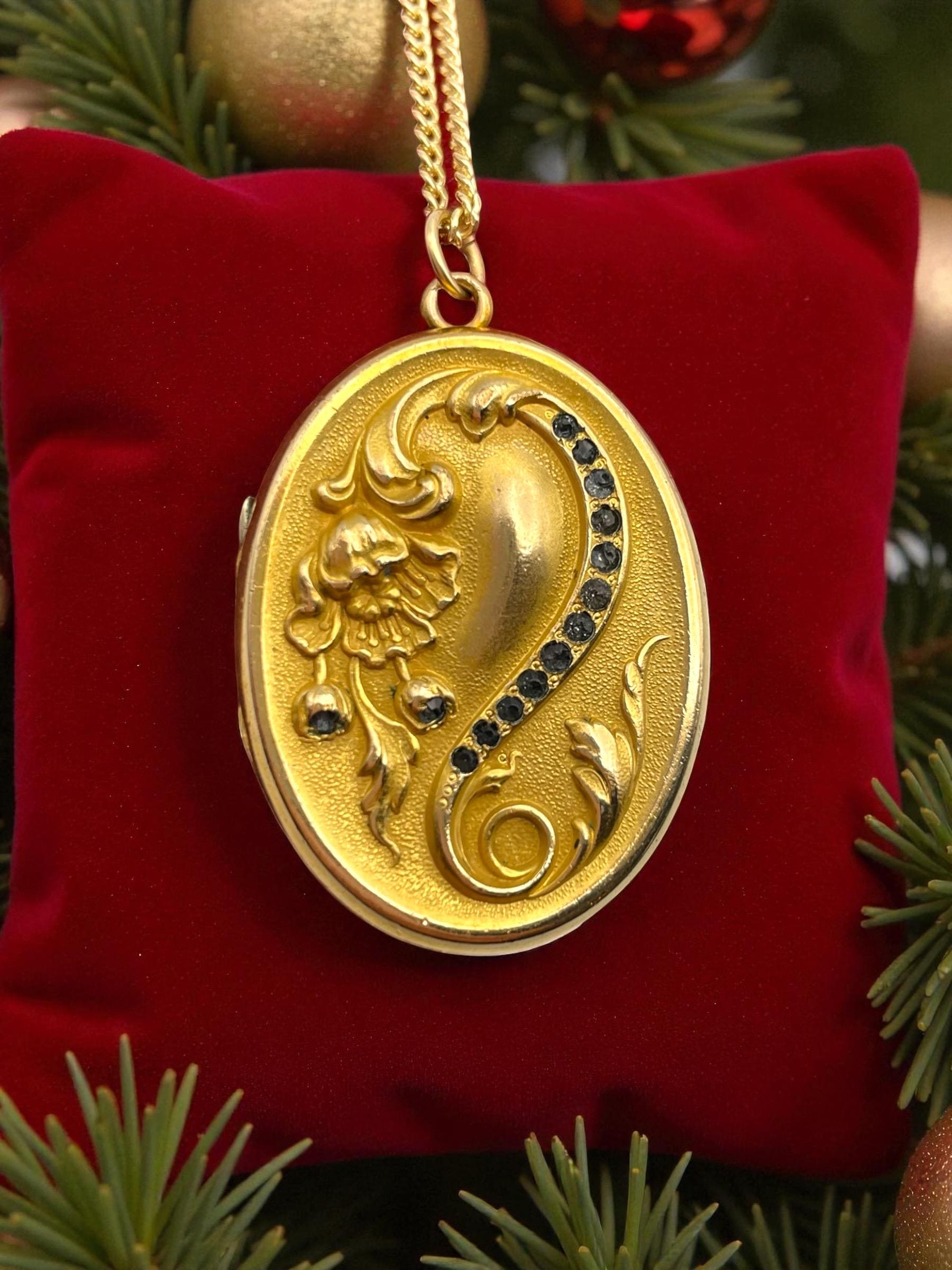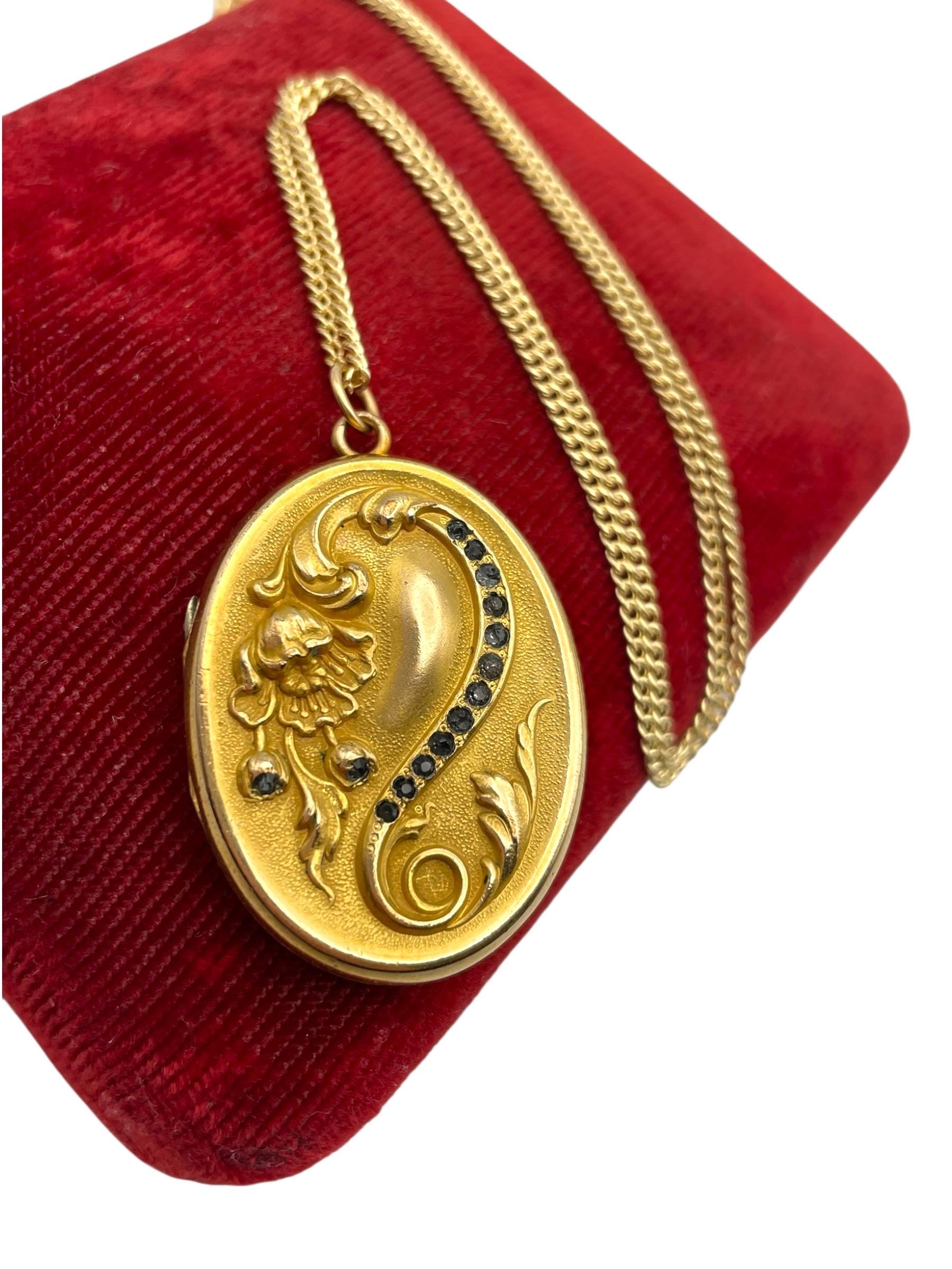 The vintage locket hangs on a new curb chain, 22” long that is 14K gold filled. This locket can be purchased with or without the chain.