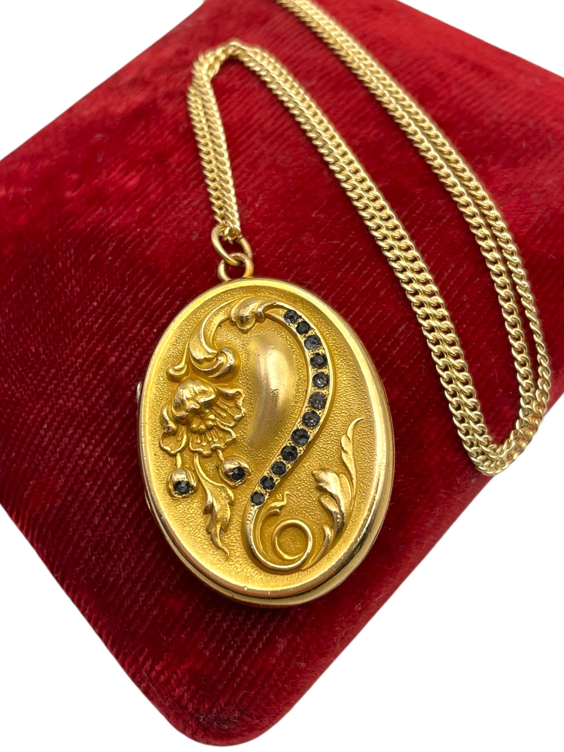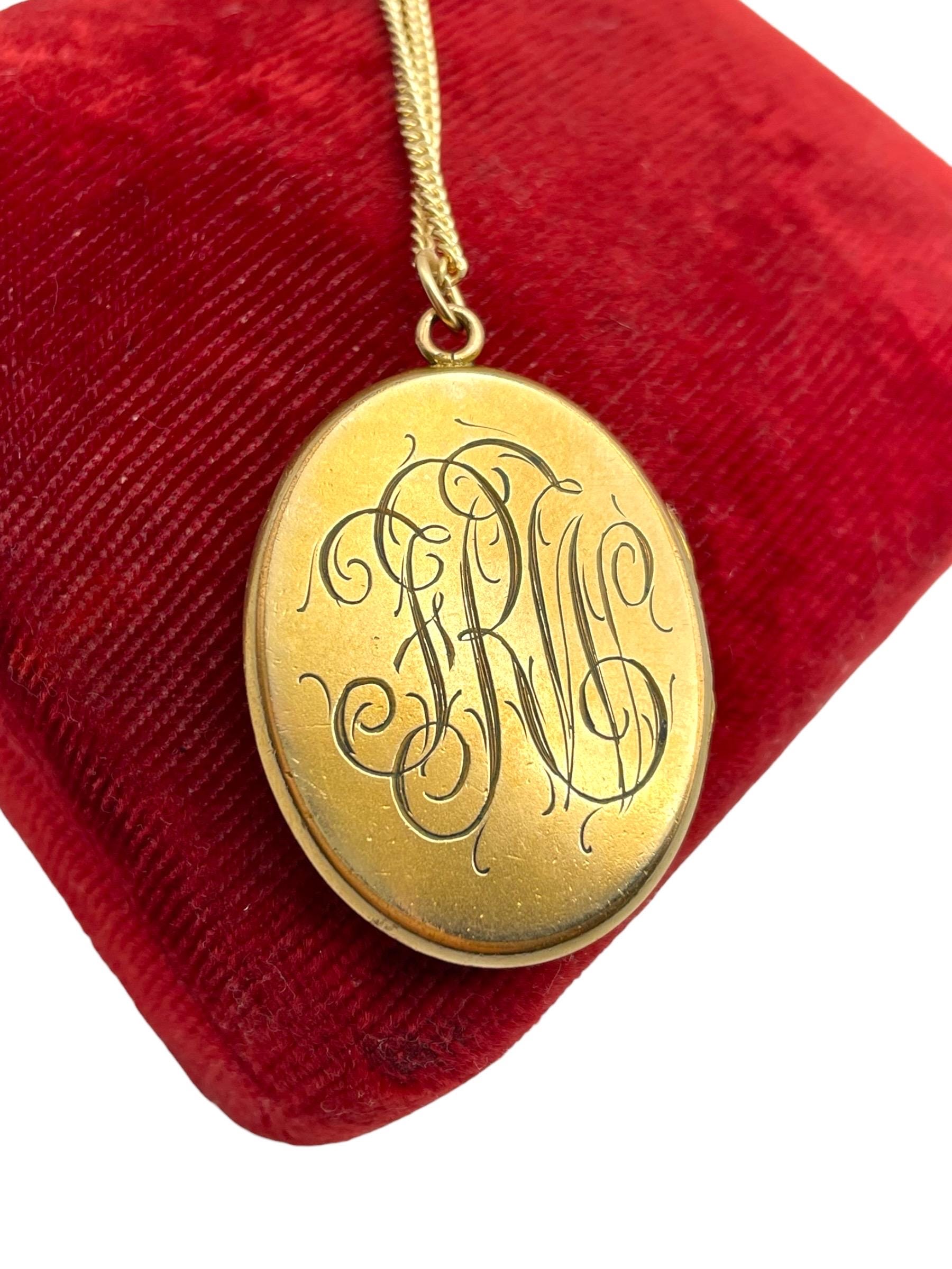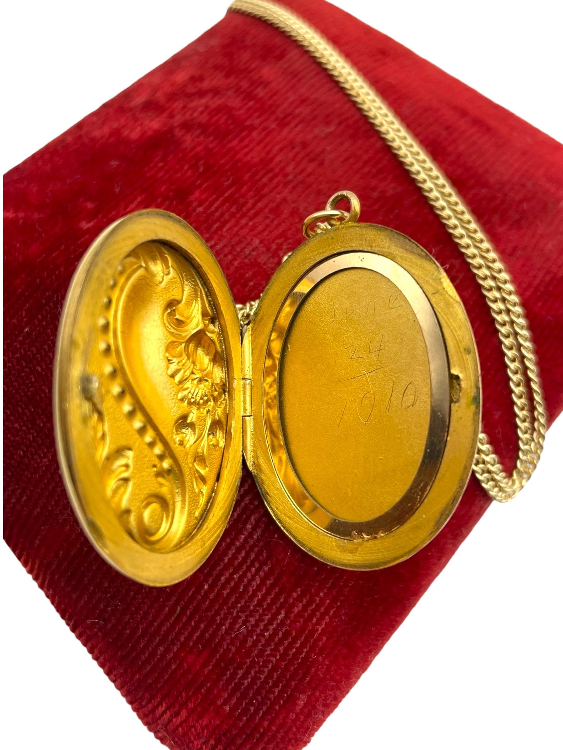 In nice antique condition with wear commensurate with vintage age which is circa 1910. (the inside has a hand etched date of June 24 1910. See photos for details. Chain is new and in great condition. Large, beautiful and very ornate gold locket!