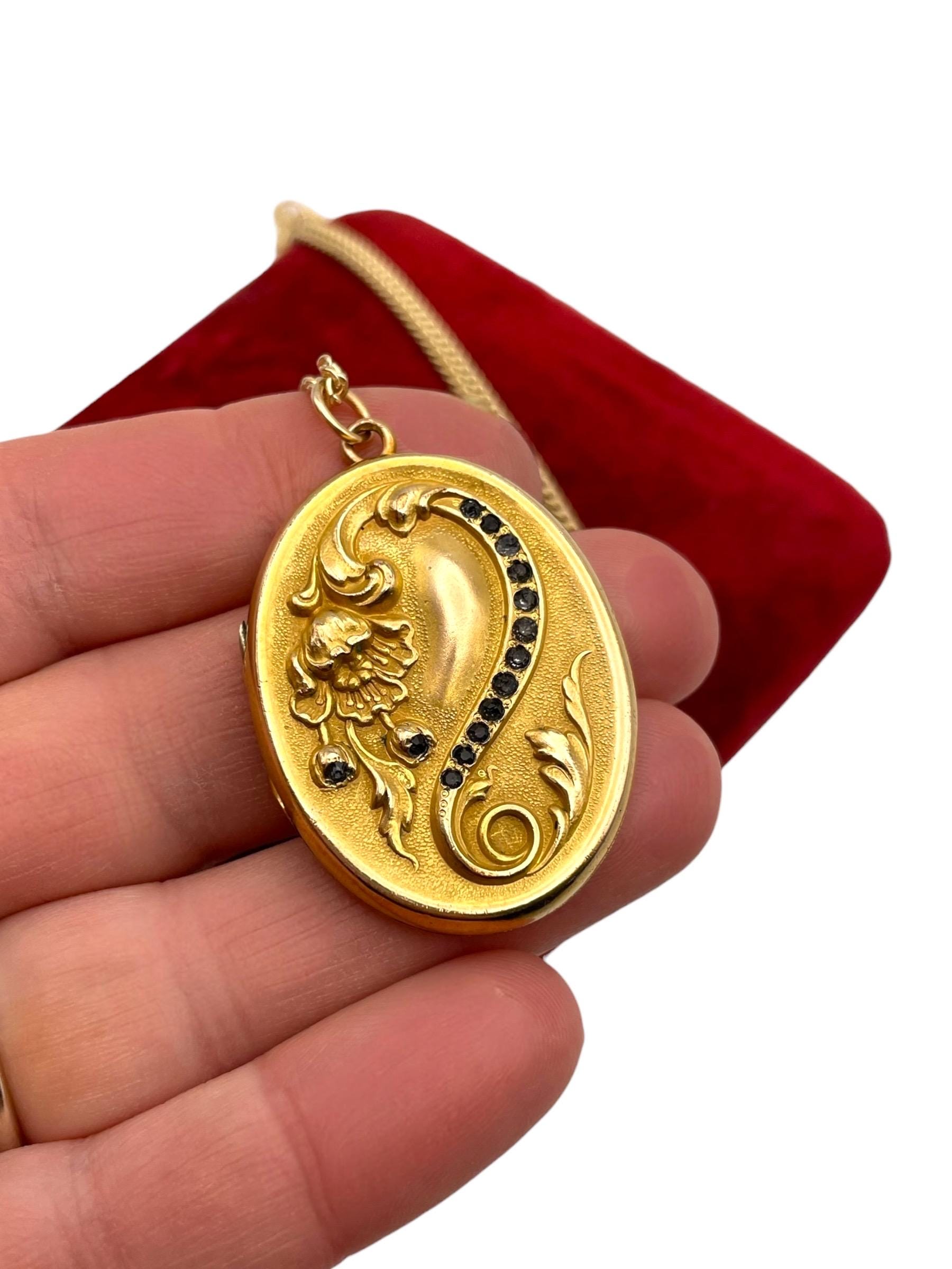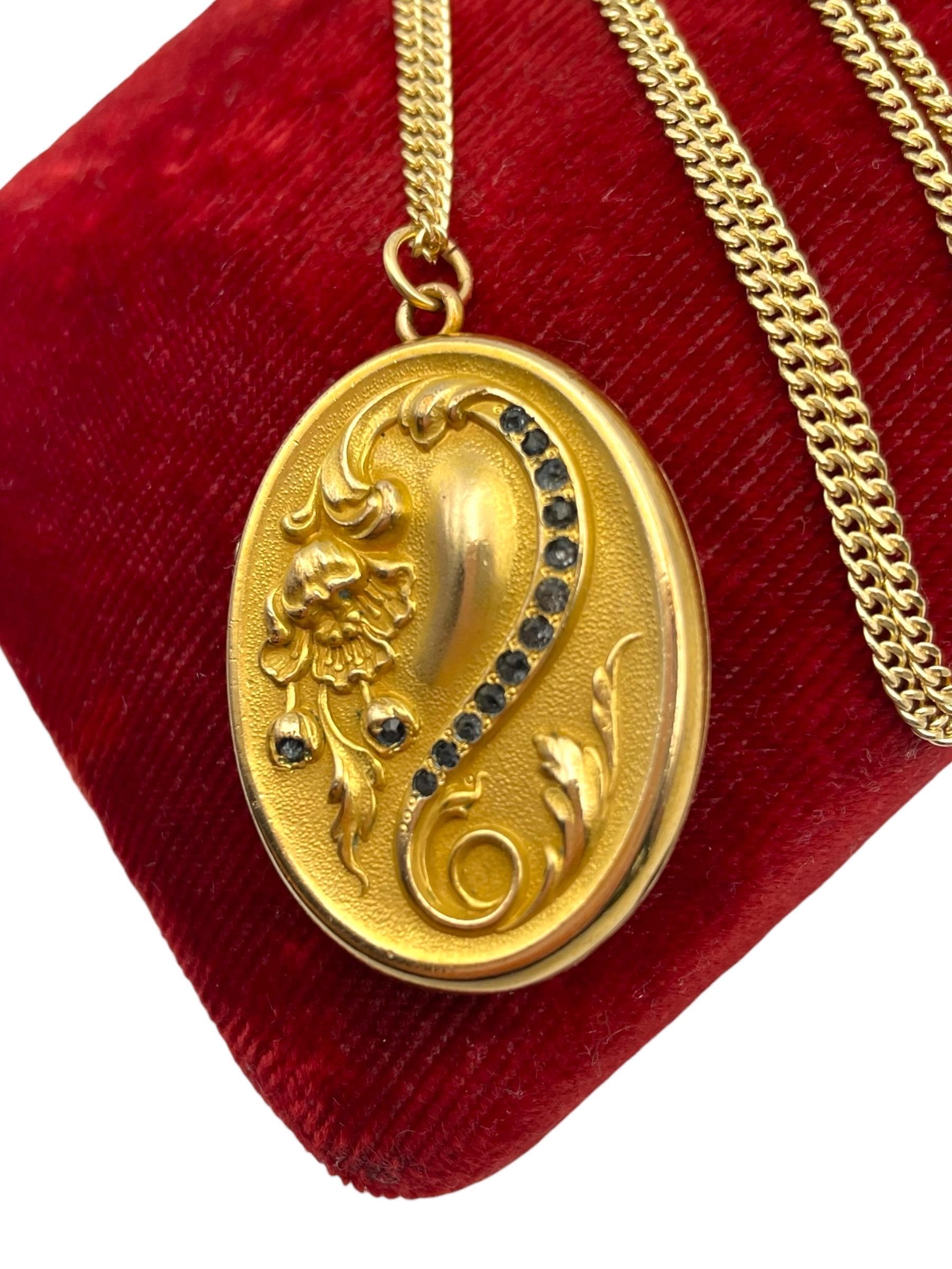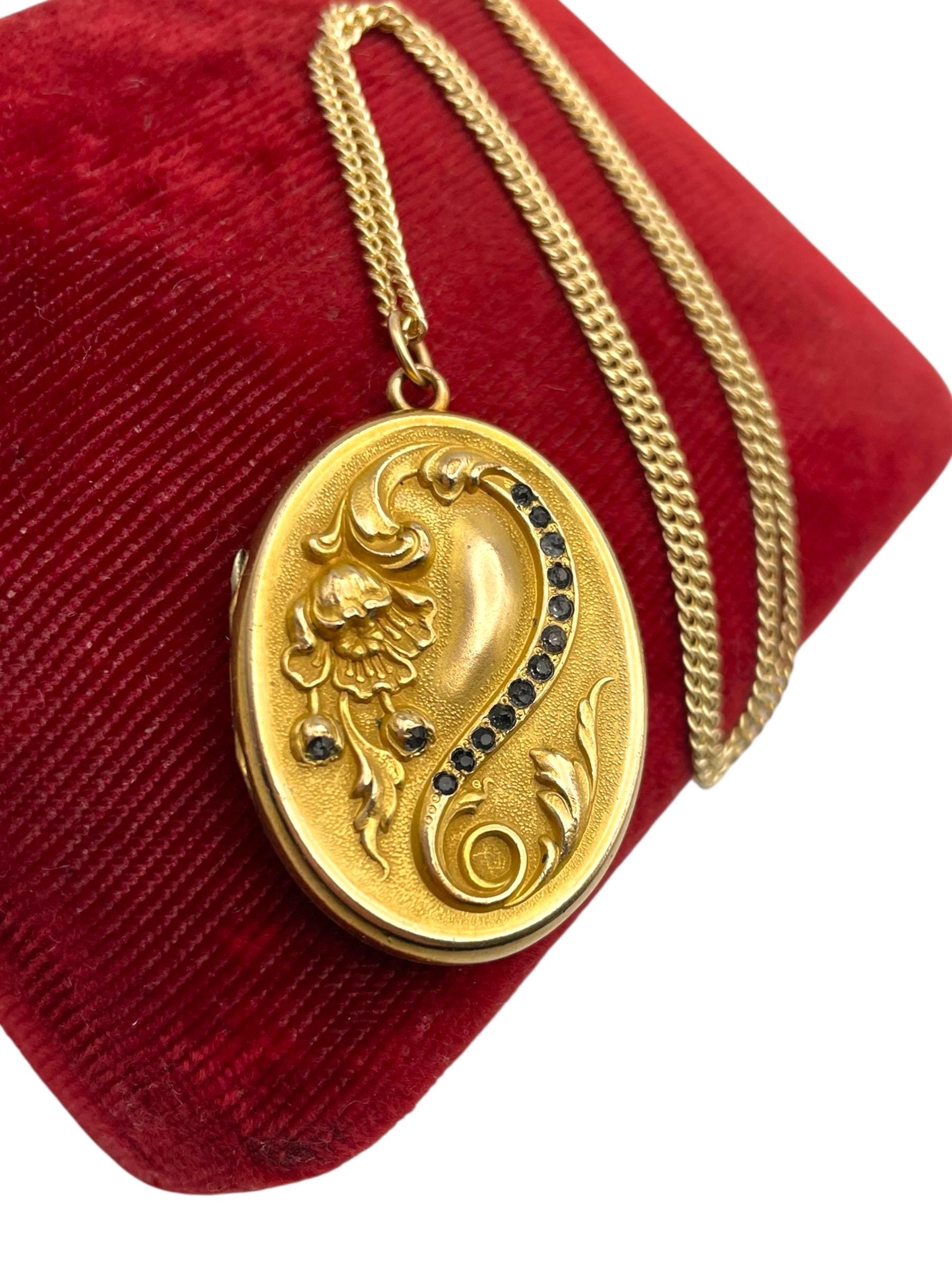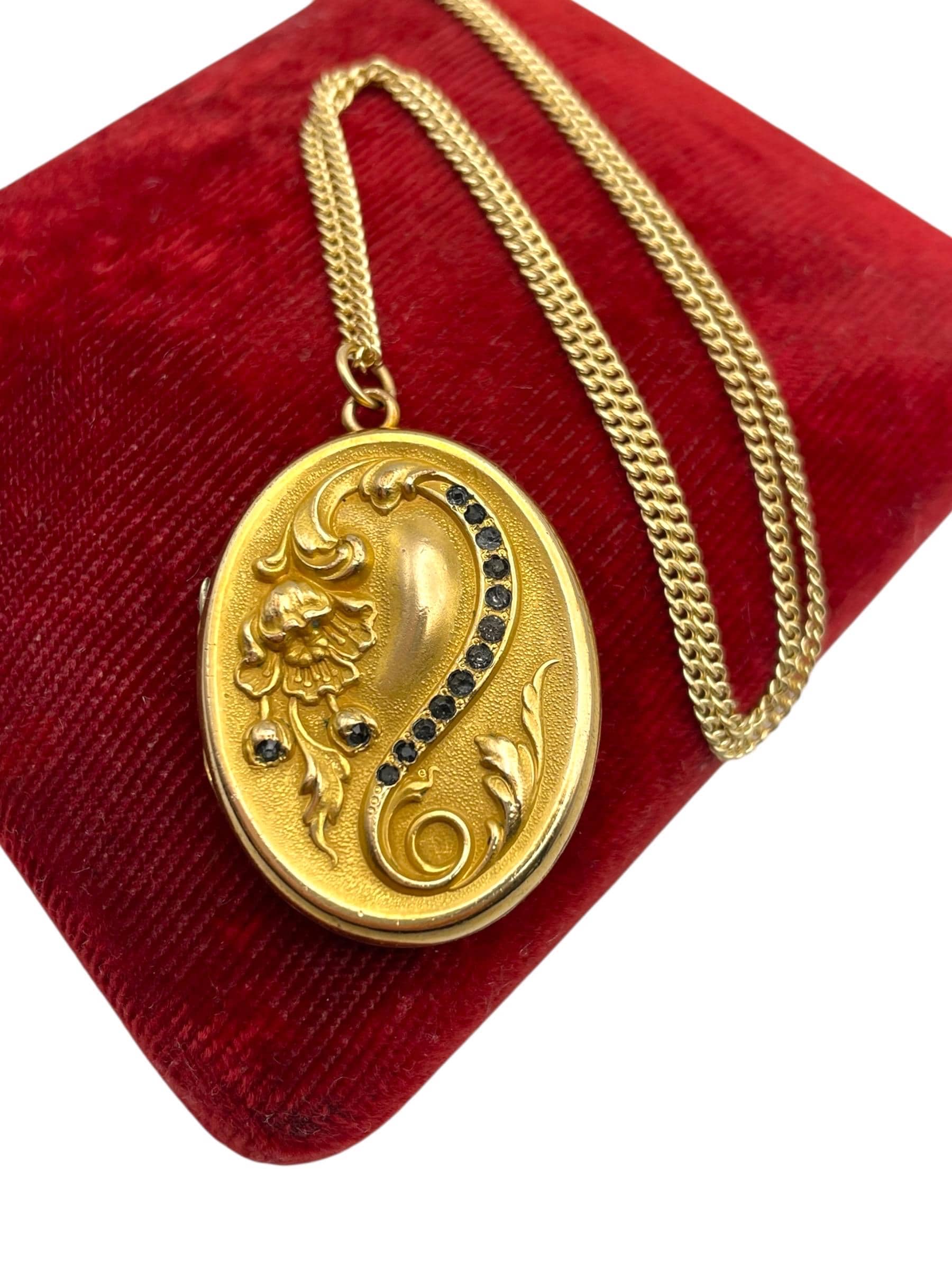 In nice antique condition with wear commensurate with vintage age which is circa 1910. (the inside has a hand etched date of June 24 1910. See photos for details. Chain is new and in great condition. Large, beautiful and very ornate gold locket!