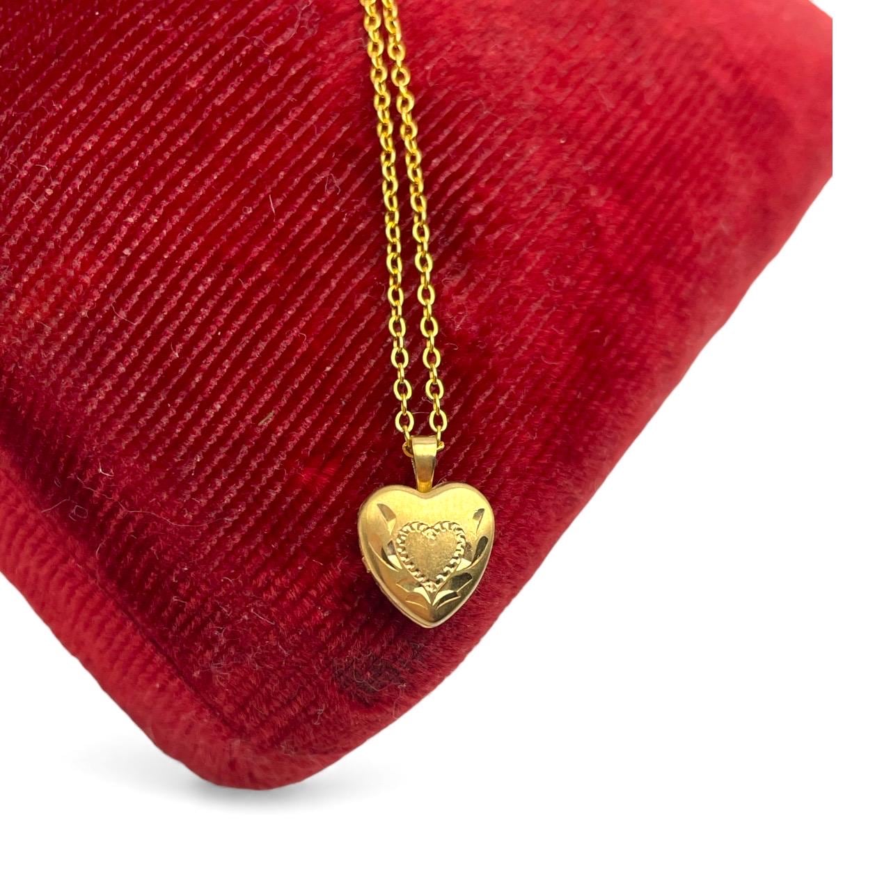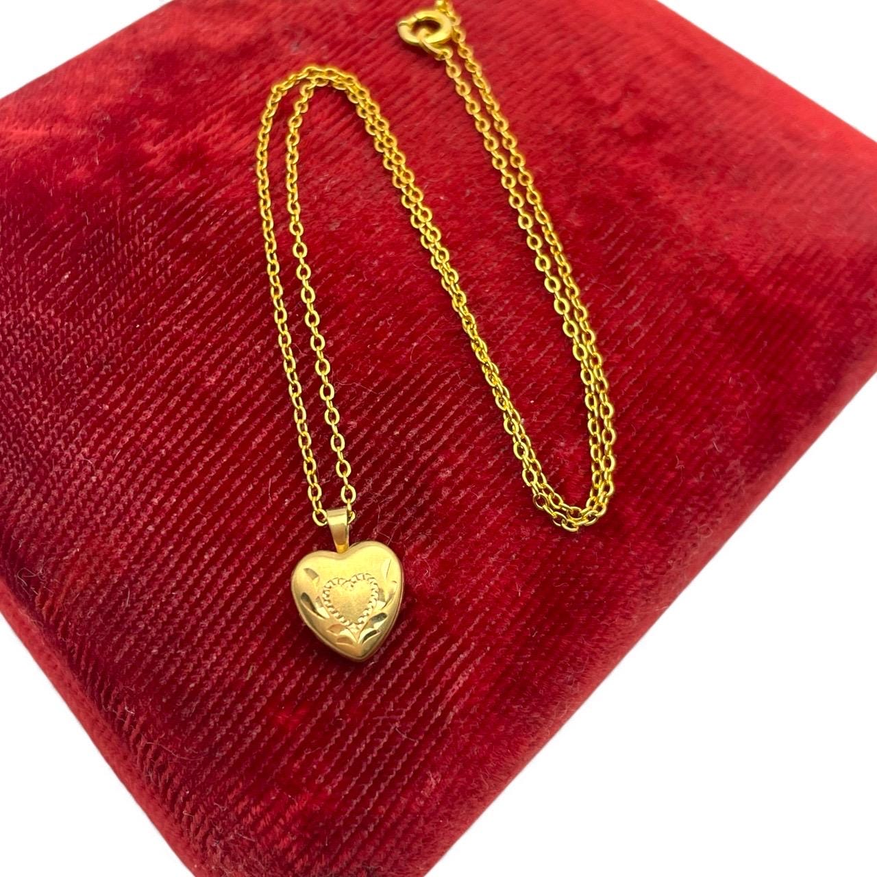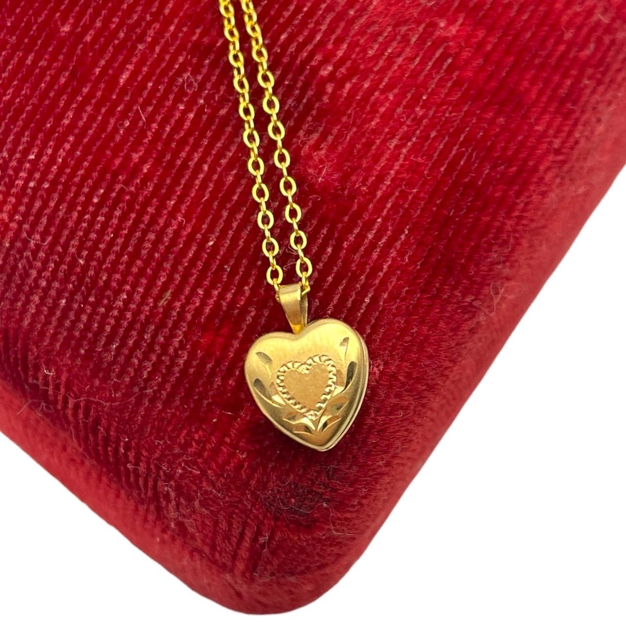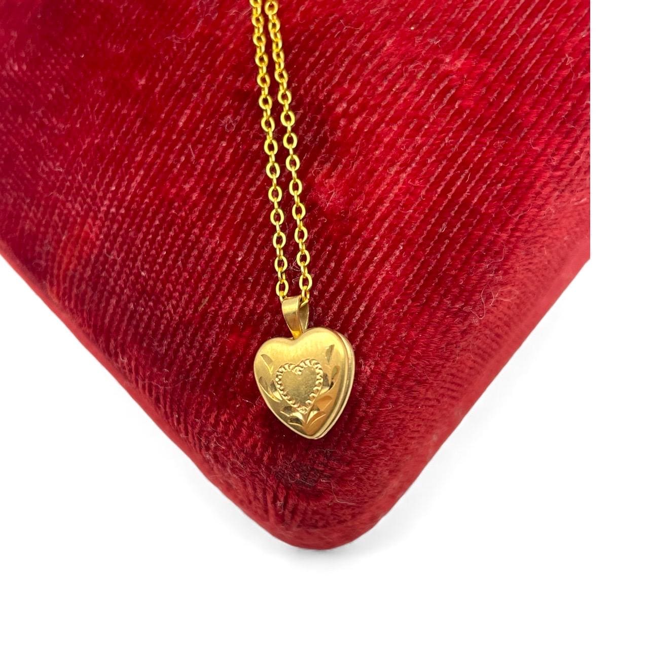 A wonderful petite vintage 14K yellow gold filled heart shaped locket necklace with a front that features an even smaller etched heart in the center and etched designs surrounding. The back is plain with no design.