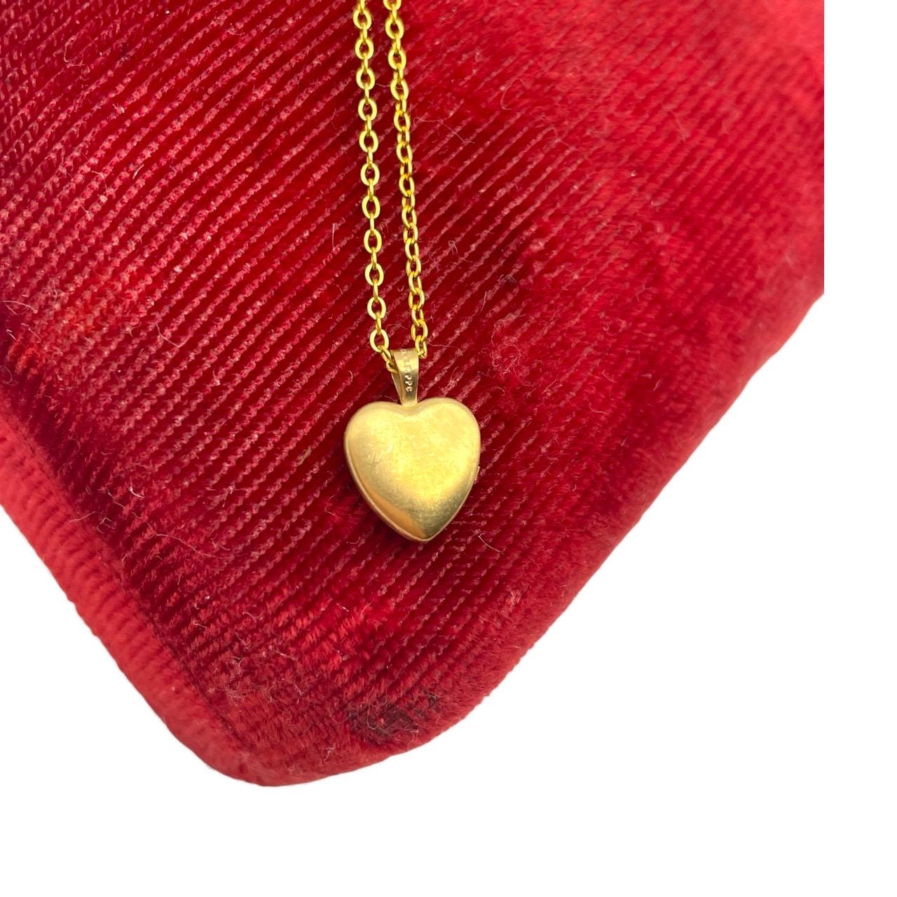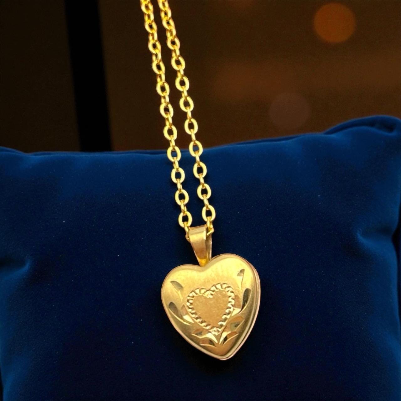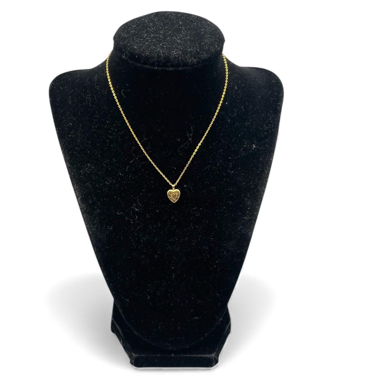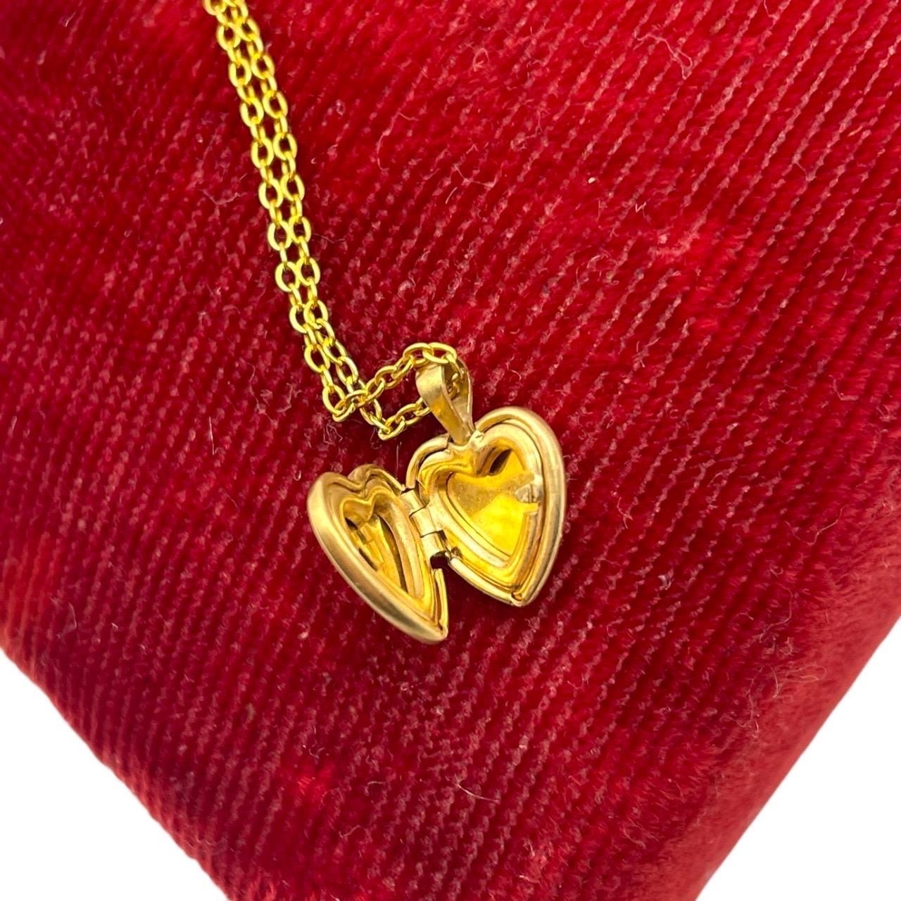 A wonderful petite vintage 14K yellow gold filled heart shaped locket necklace with a front that features an even smaller etched heart in the center and etched designs surrounding. The back is plain with no design.